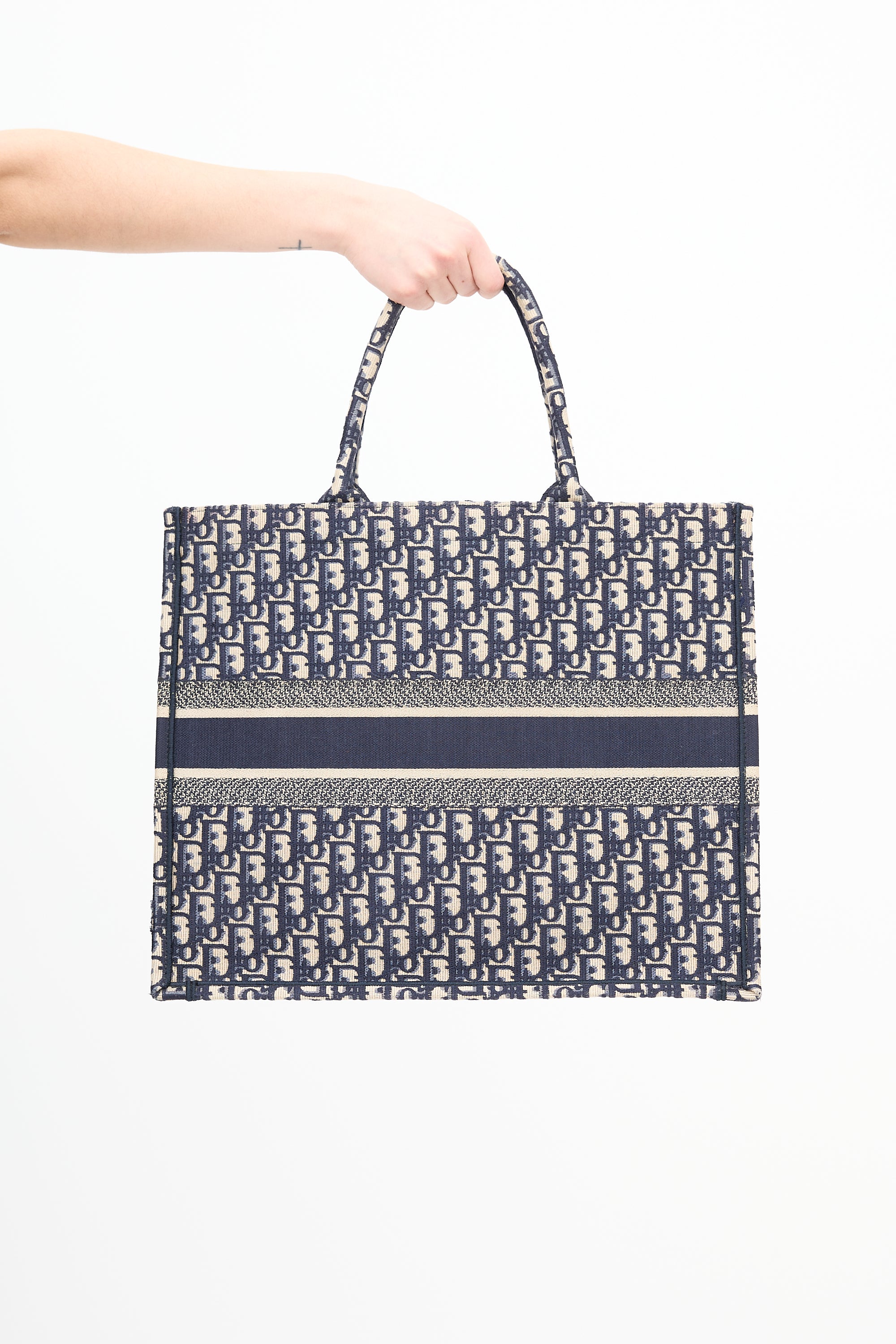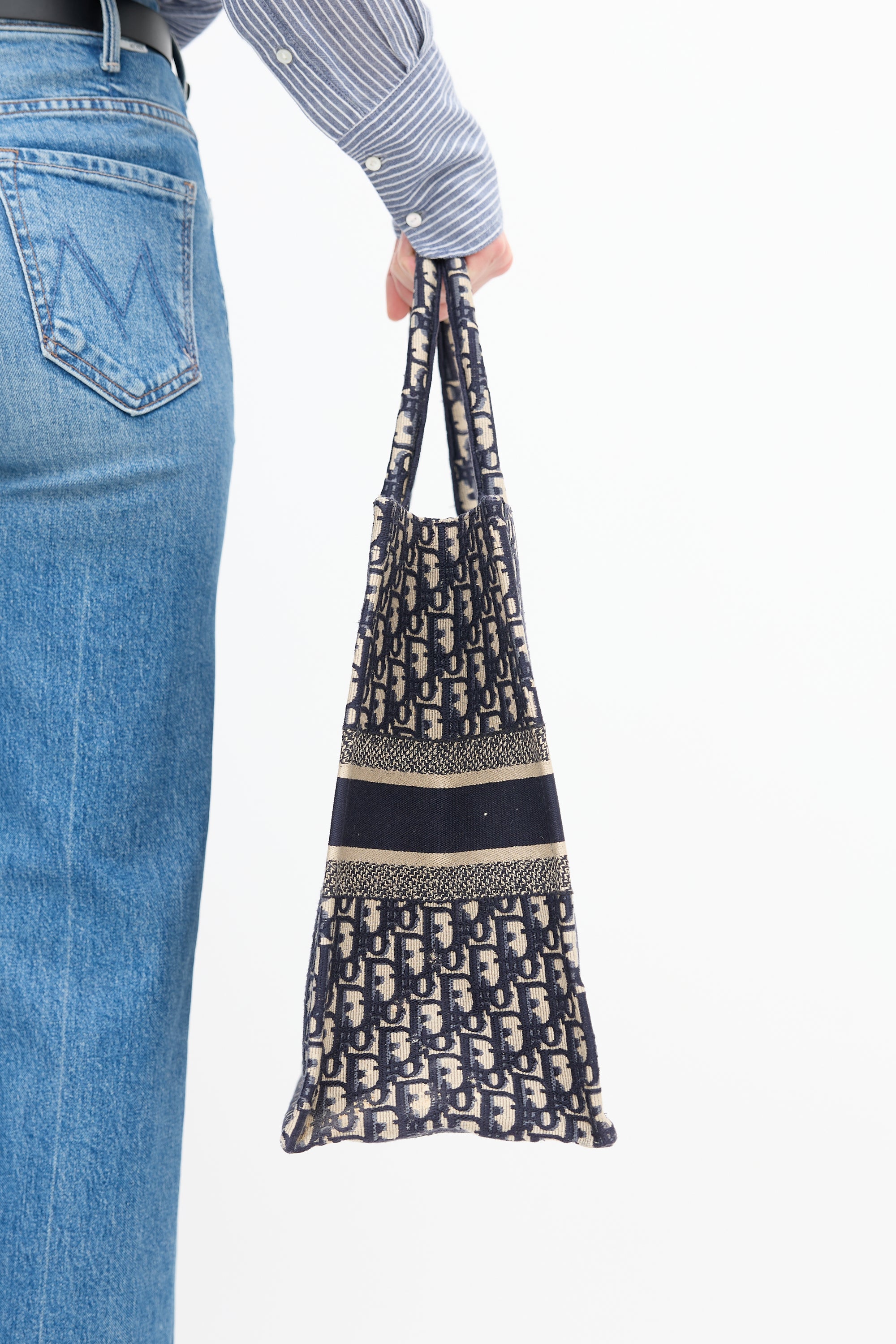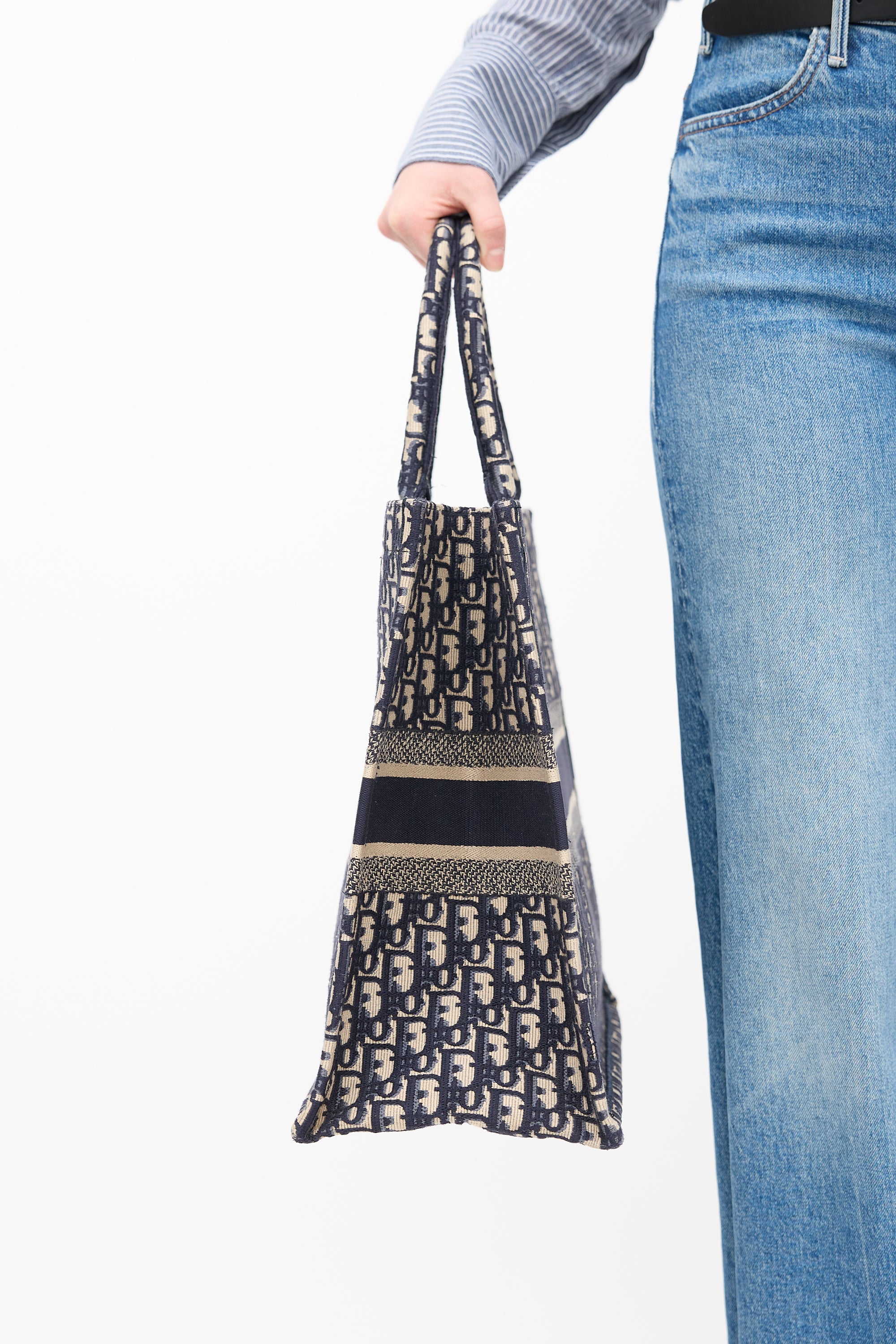 Pre-owned Dior 2019 navy and beige large Book tote featuring signature Oblique jacquard, woven stripe panel throughout middle, front logo, dual rolled top handles, open top, and one main compartment. Comes with original box, dust bag care guide, and certificate of authenticity card.