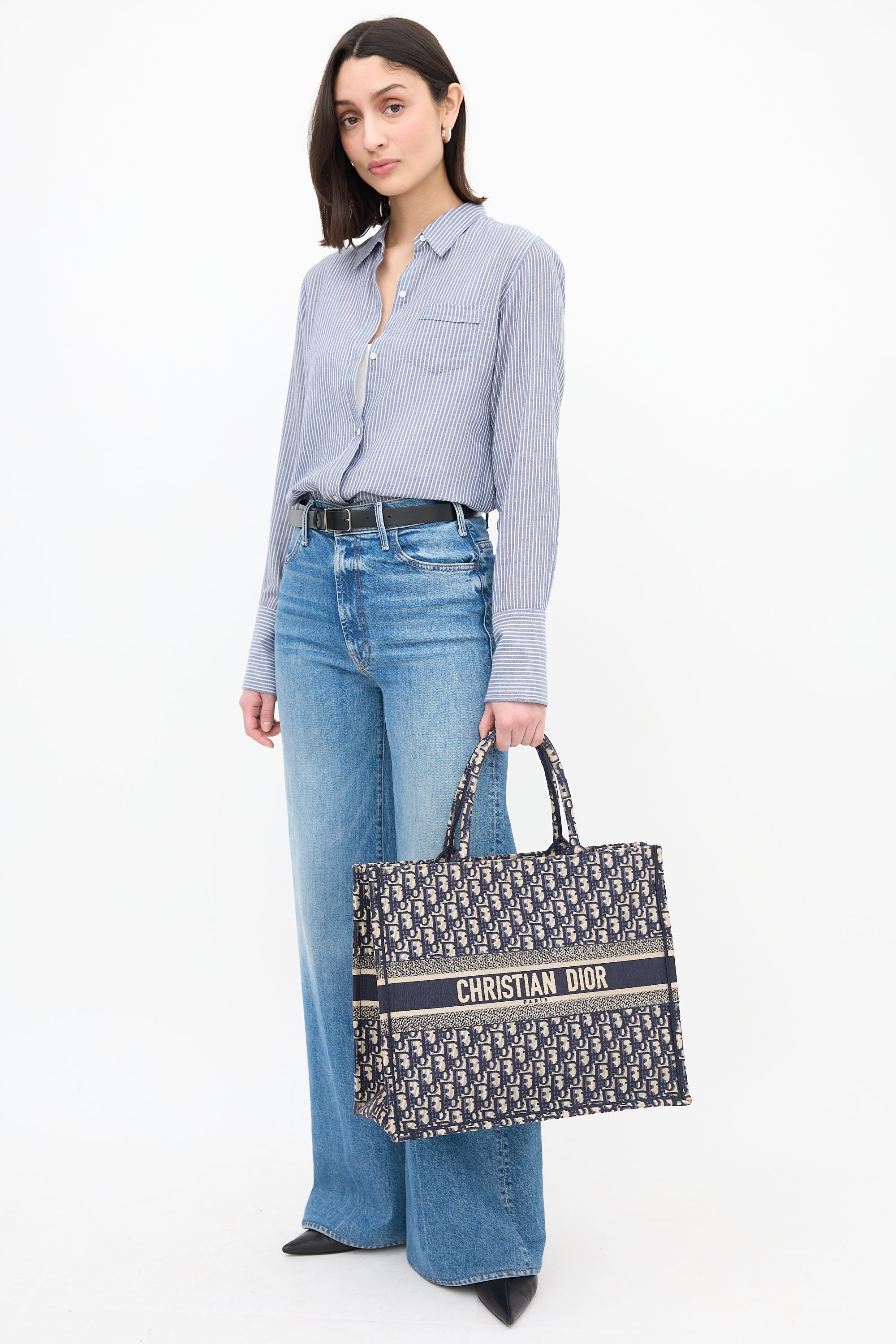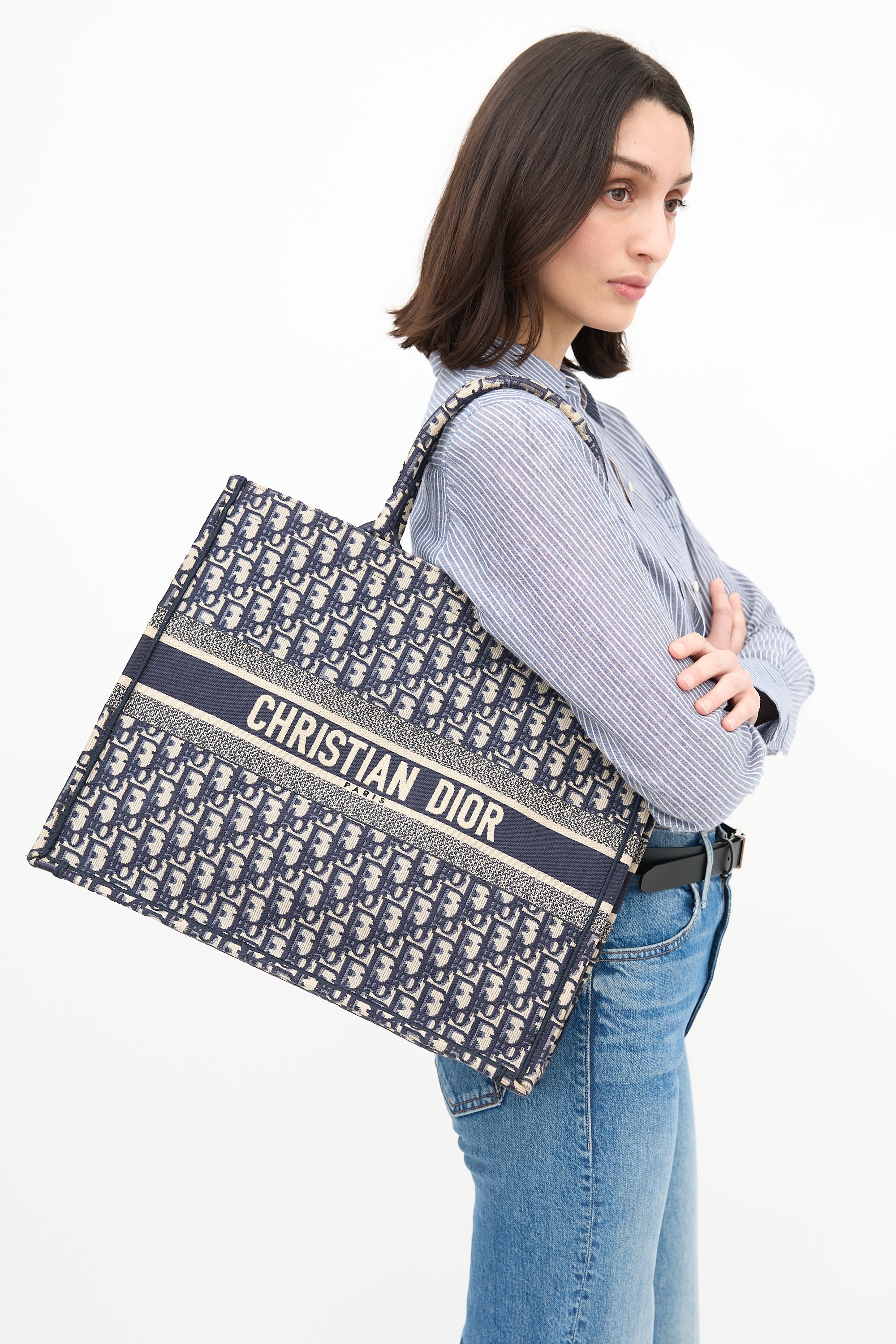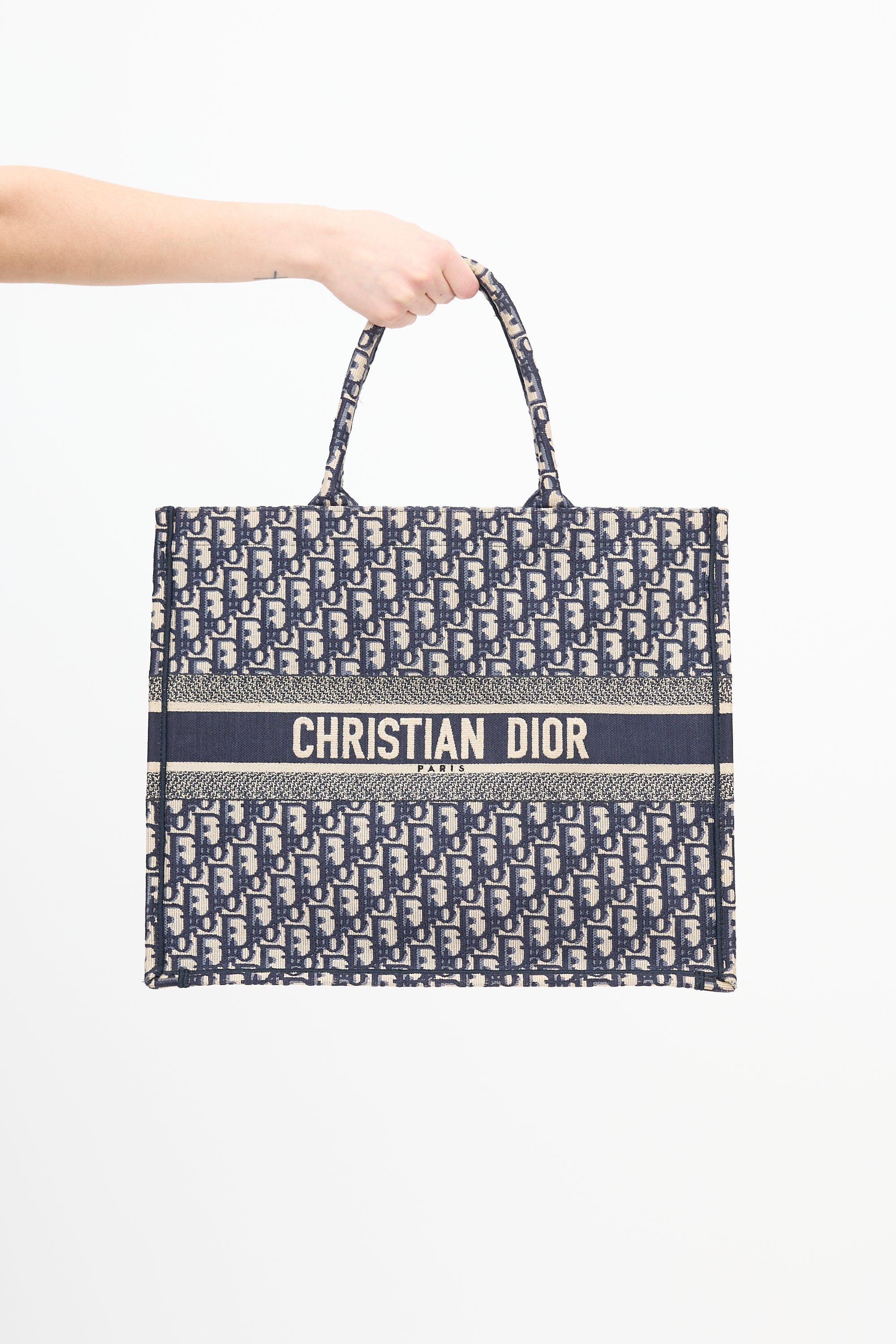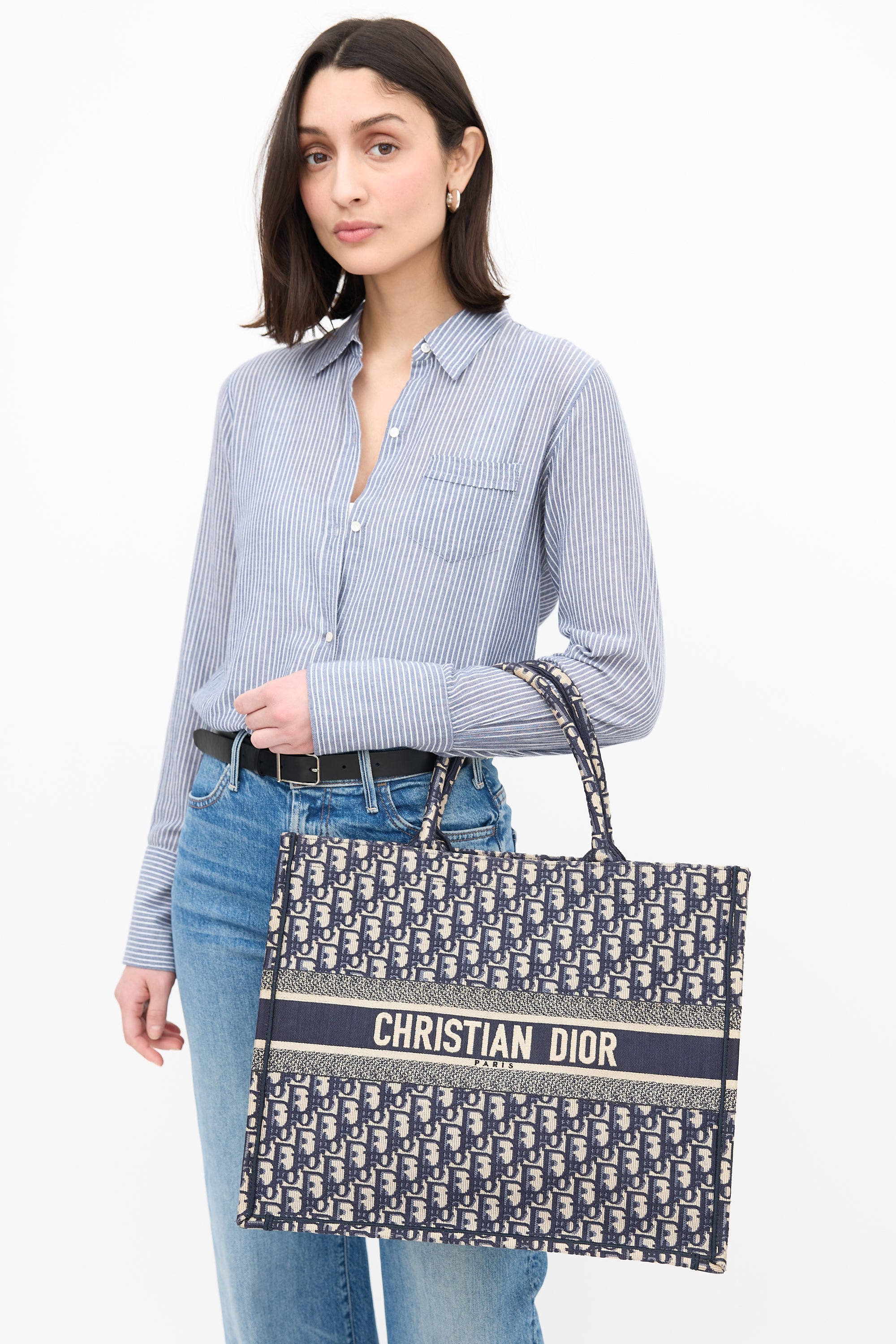 Pre-owned Dior 2019 navy and beige large Book tote featuring signature Oblique jacquard, woven stripe panel throughout middle, front logo, dual rolled top handles, open top, and one main compartment. Comes with original box, dust bag care guide, and certificate of authenticity card.