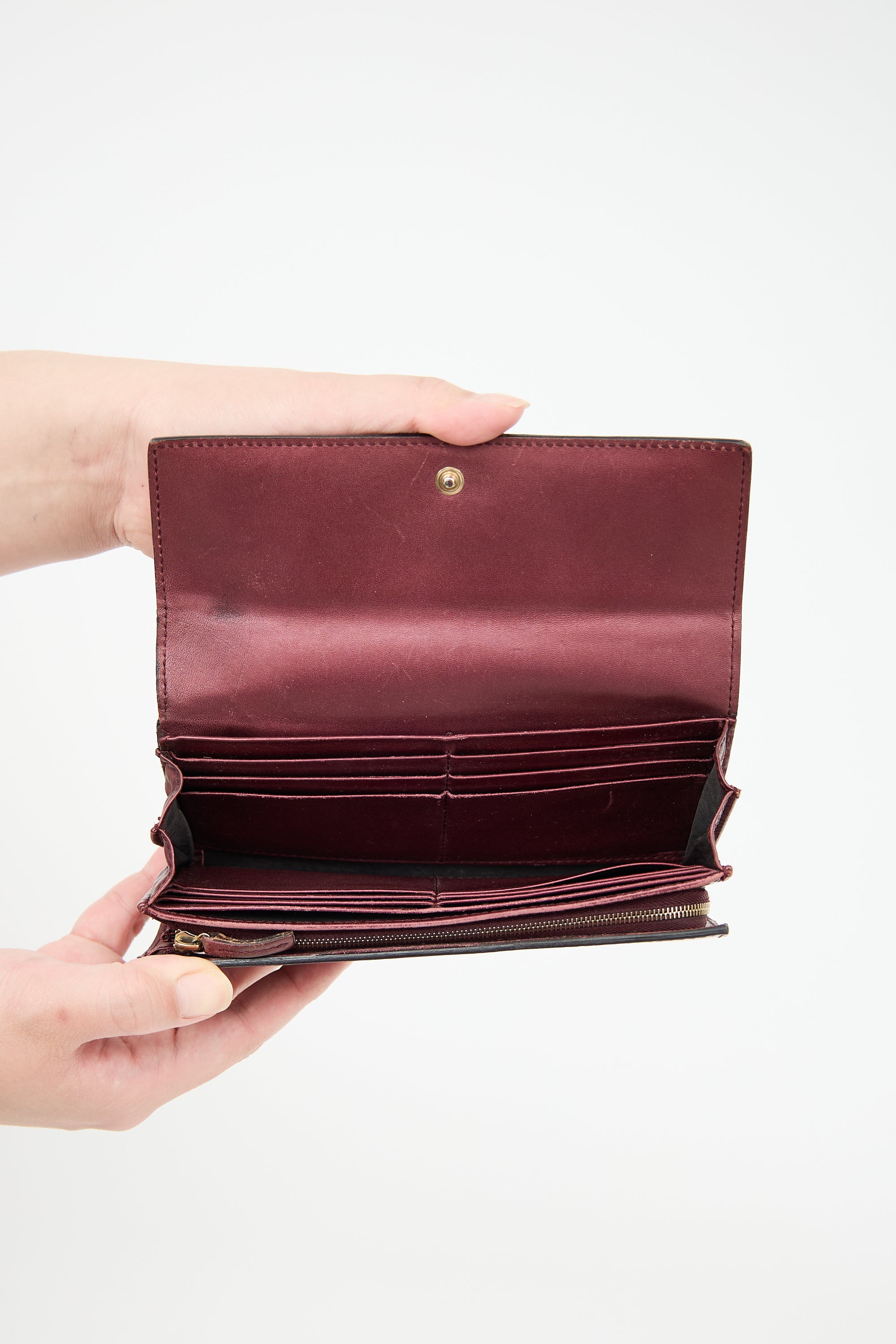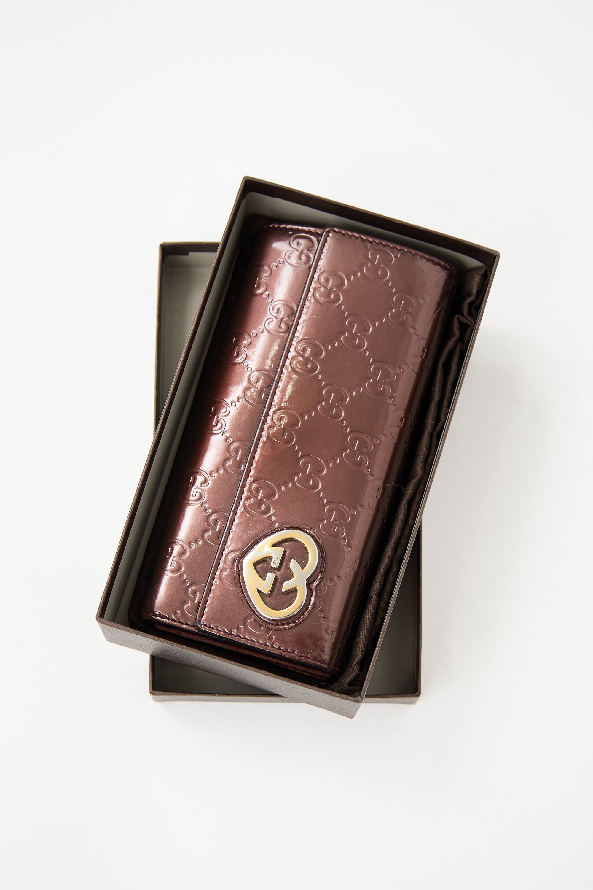 Pre-owned Gucci brown patent Lovely Heart wallet featuring Guccissima monogram, gold tone GG heart logo at front, snap button closure, and interior pockets include zip pocket with two compartments, two slip pockets, two bill compartments, and 12 card slots. Comes with original box and dust bag.