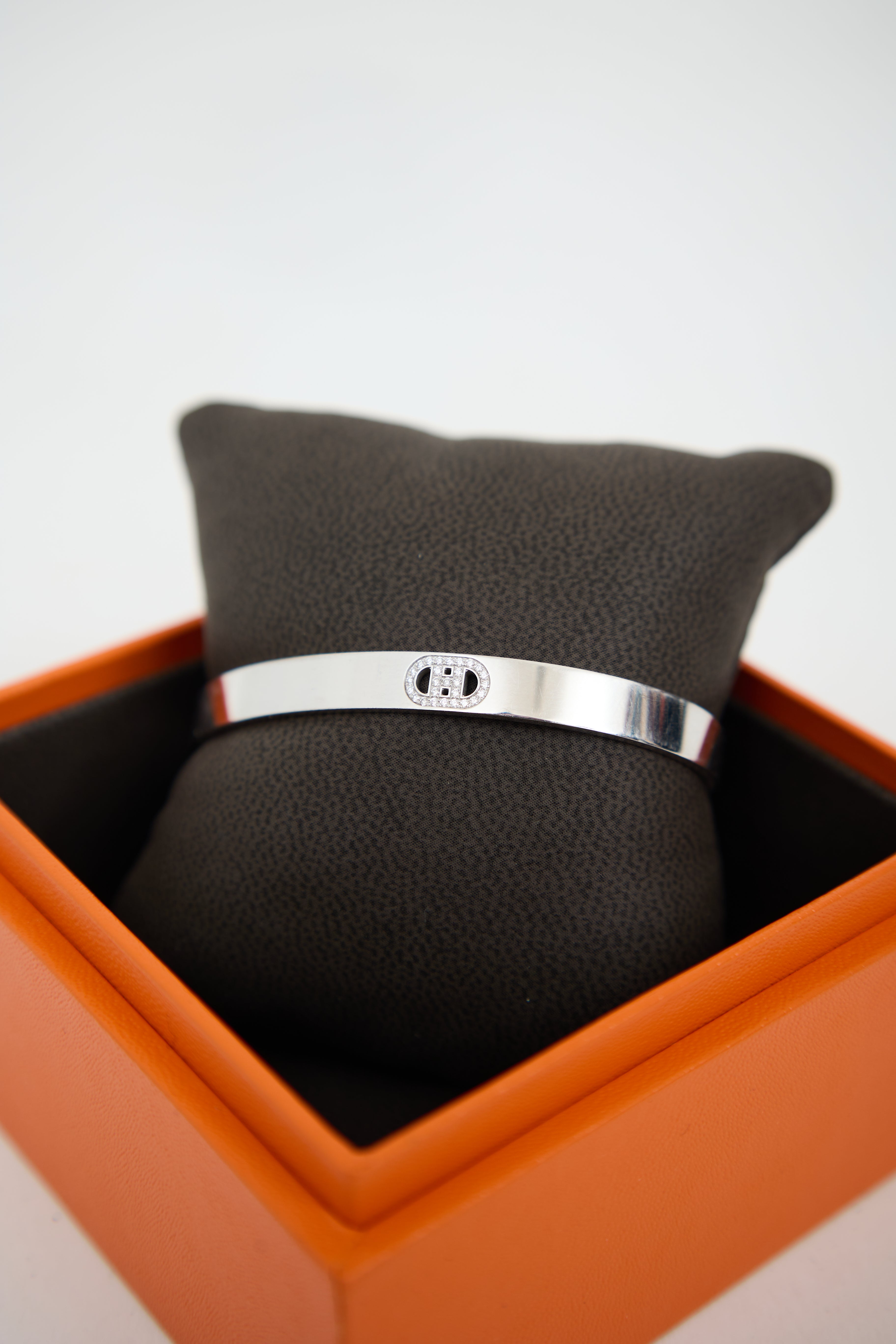 Pre-owned Hermès H d'Ancre bangle bracelet featuring 18K white gold, 60mm x 50mm in diameter and 5.5mm wide, pave set style diamonds, hinge clasp closure and stamped logo.