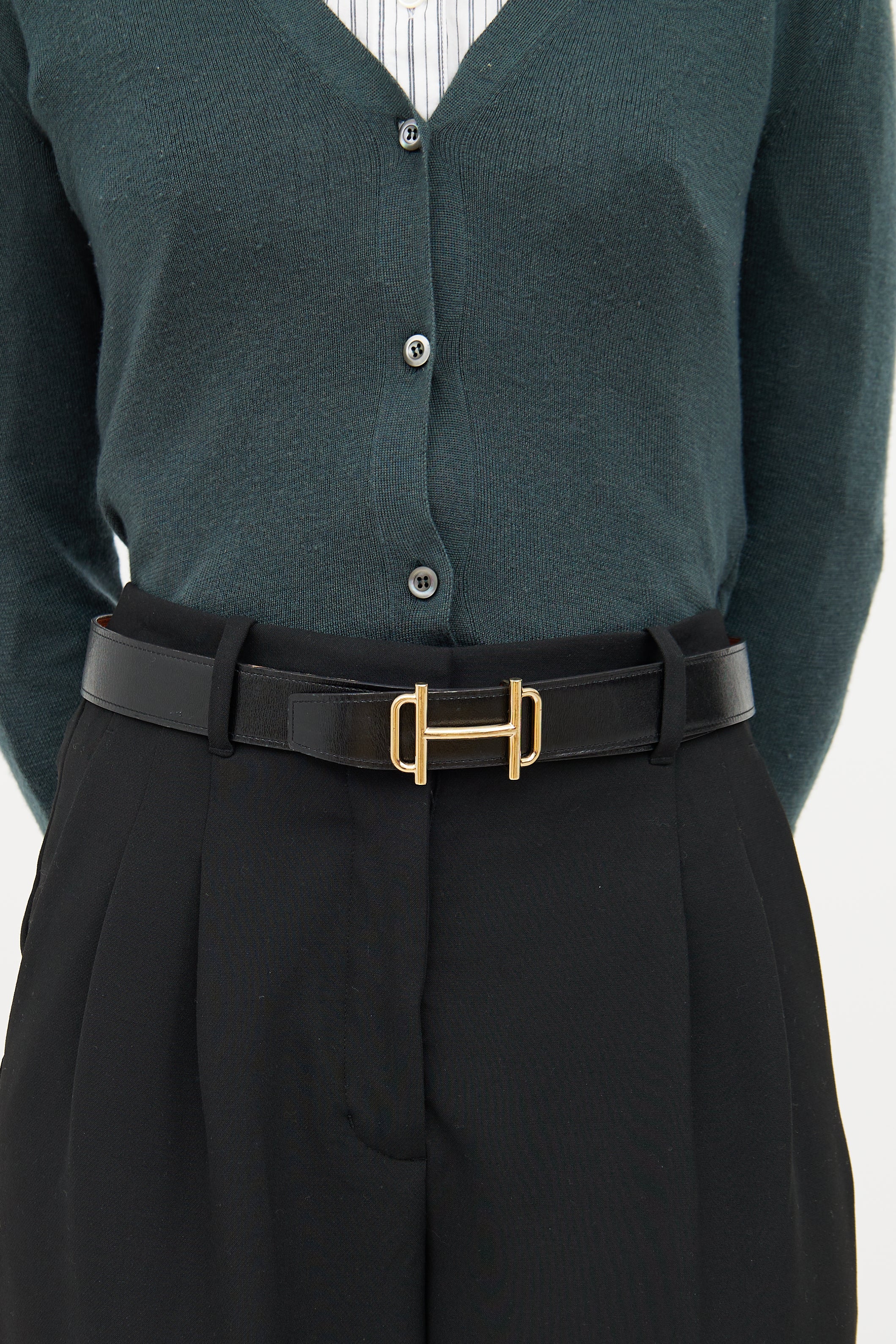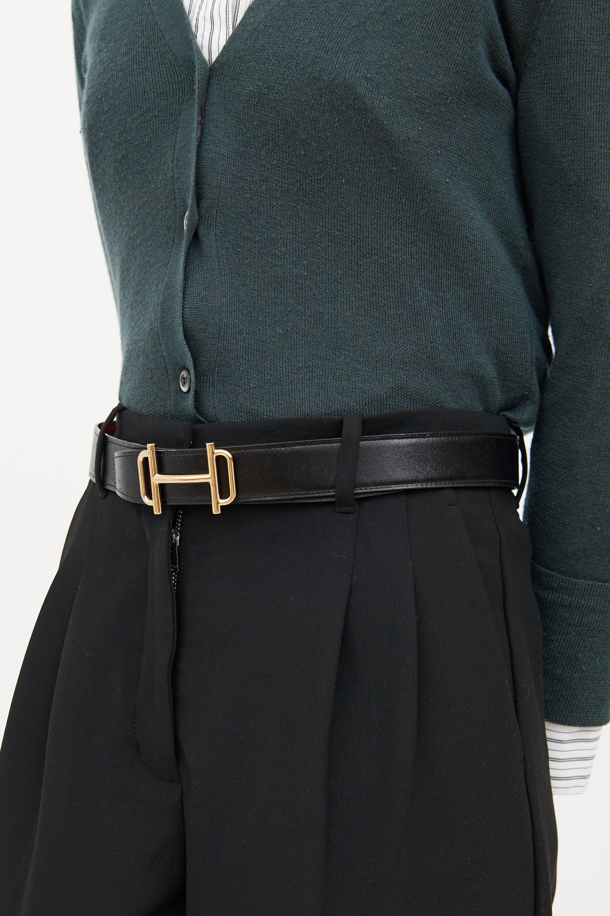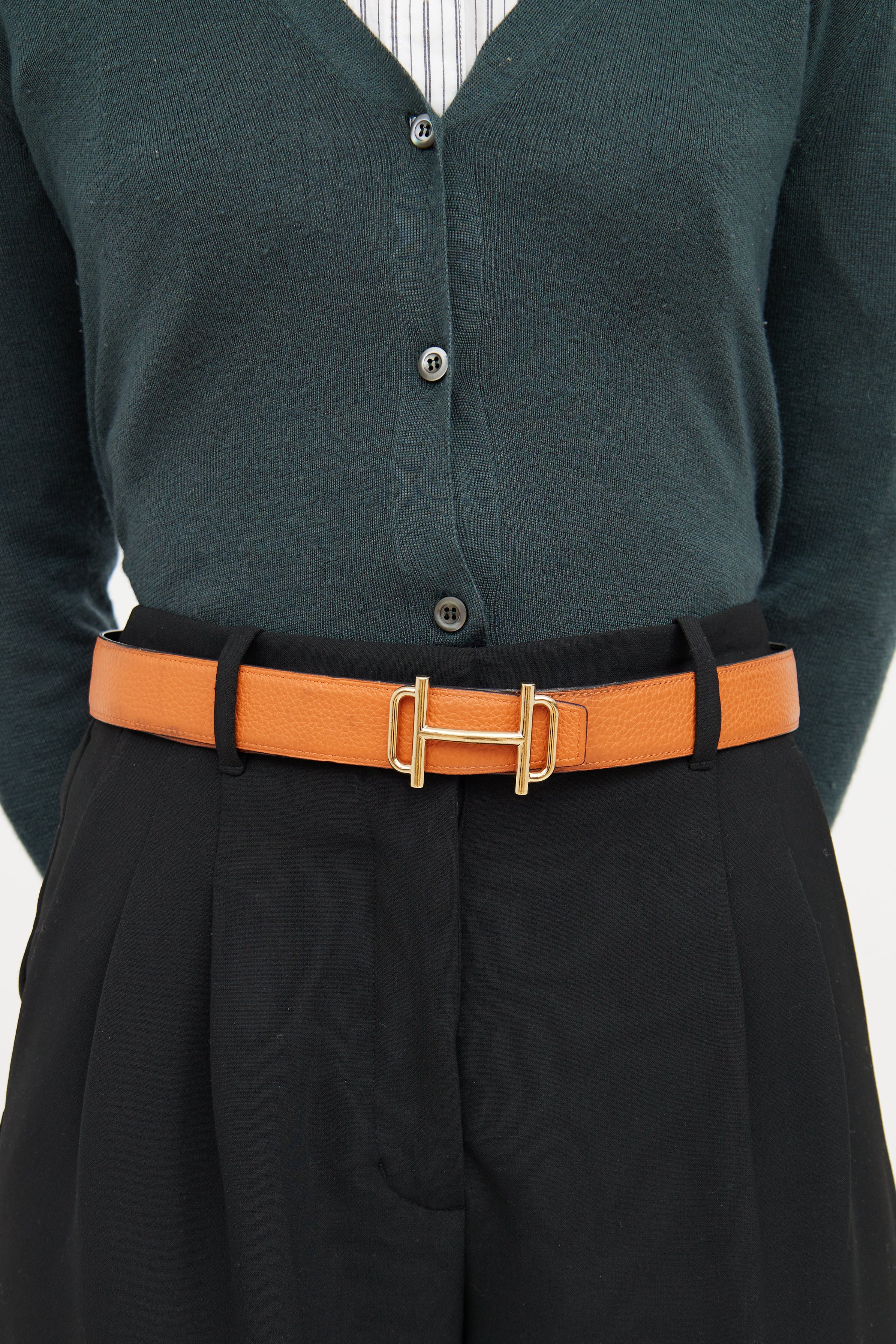 Pre-owned Hermès Gamma belt featuring a reversible leather strap in Noir Box and orange Togo calfskin, gold tone H belt buckle and three hole adjustment.