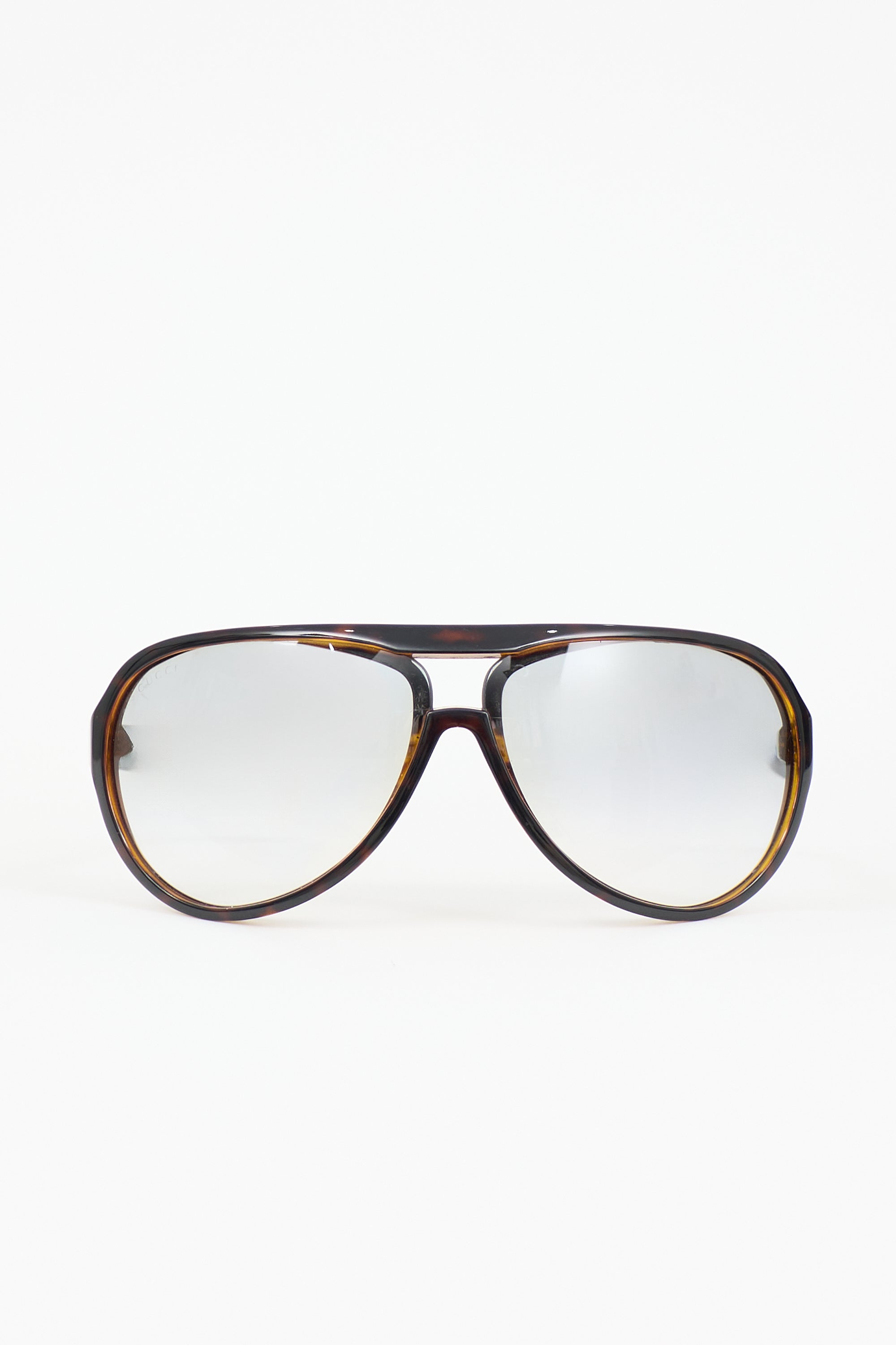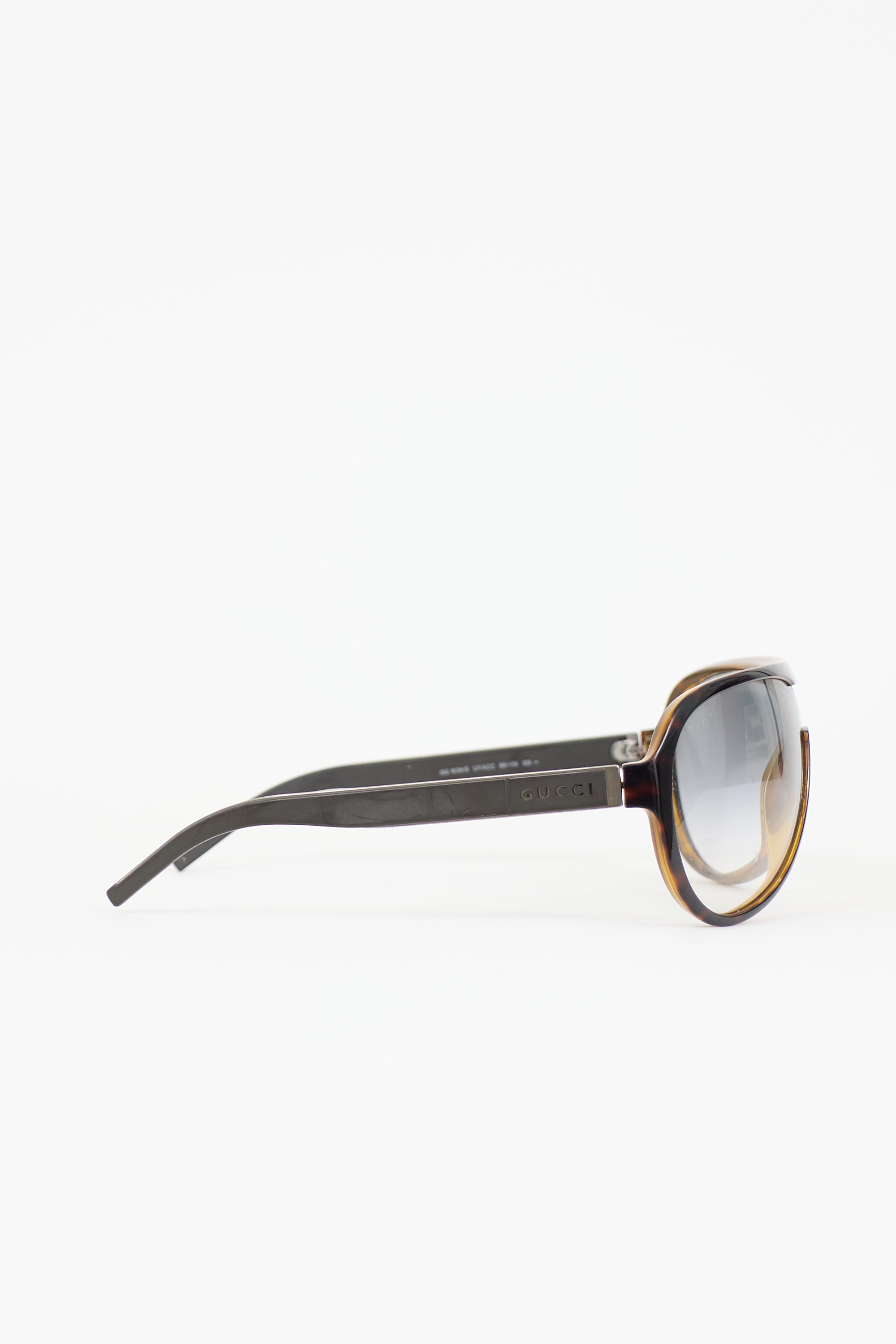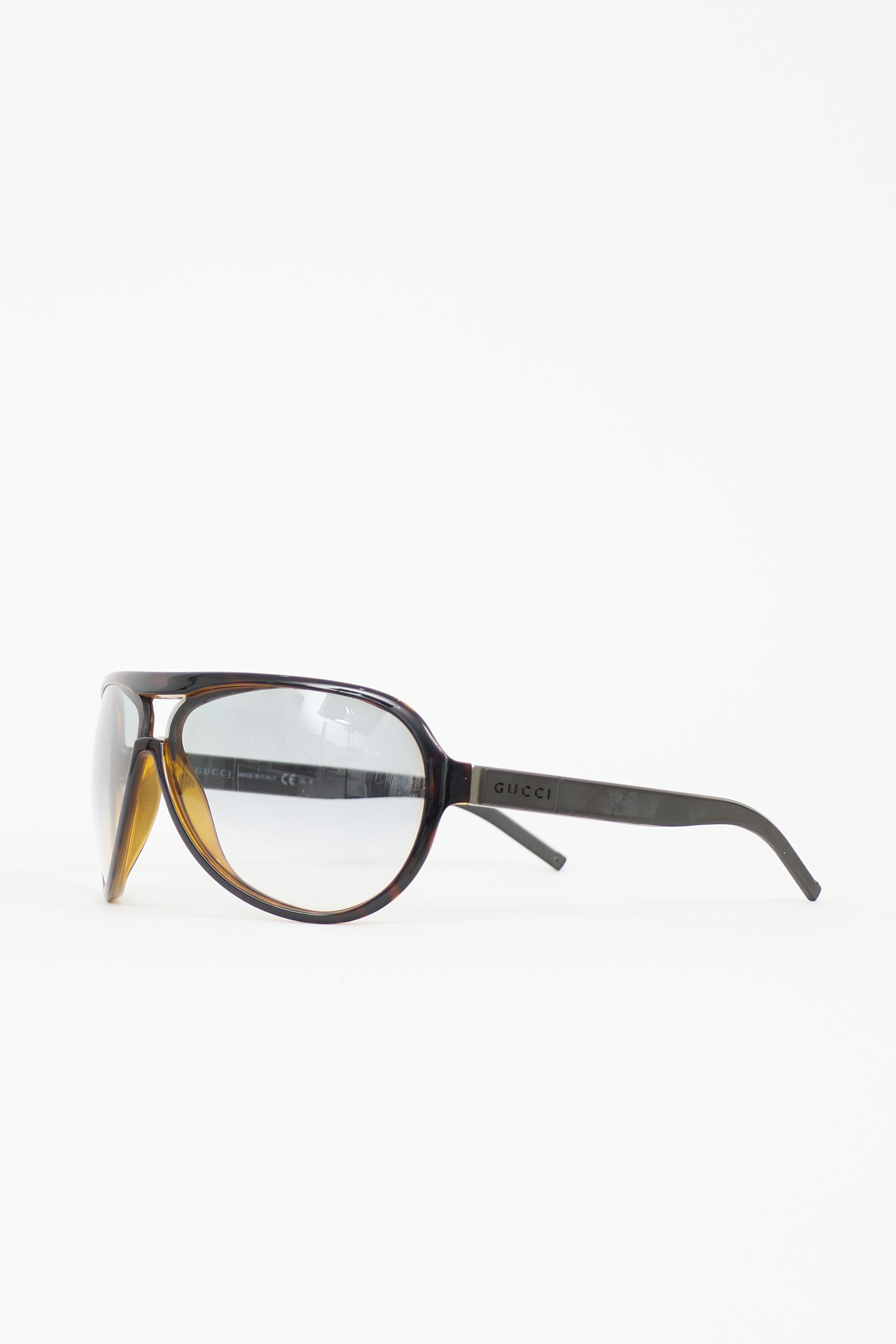 Pre-owned Gucci black and brown GG1639S sunglasses featuring tortoiseshell aviator frame, blue gradient lens, and embossed logo at arm. Includes original case and pouch.