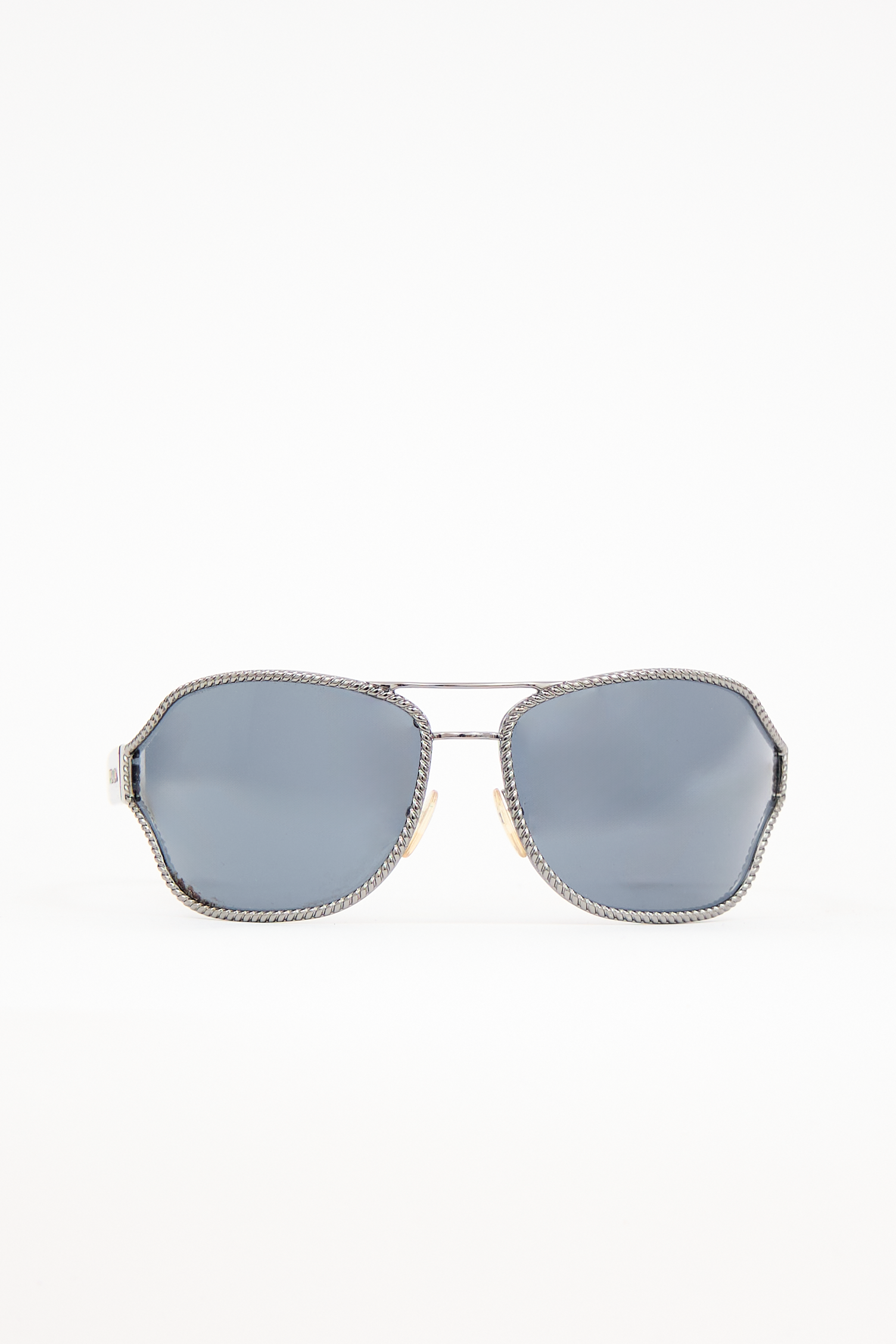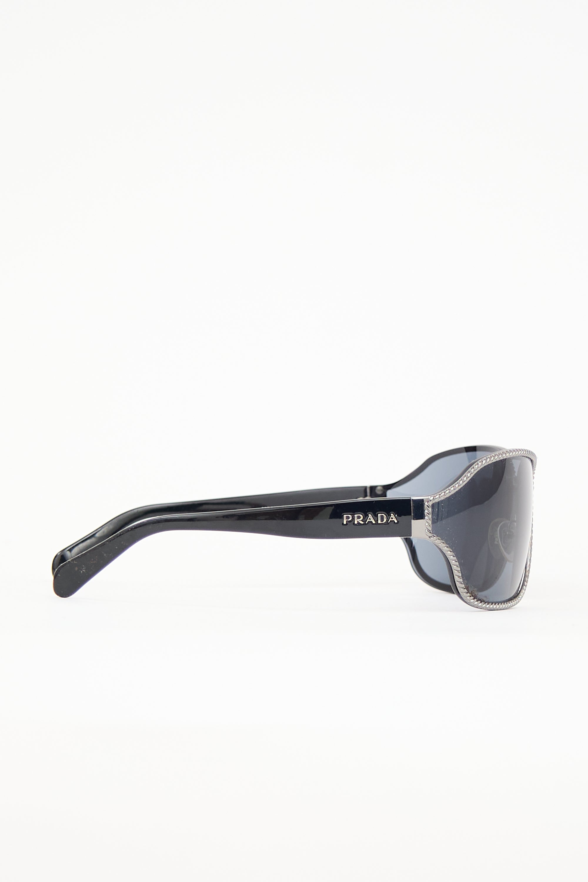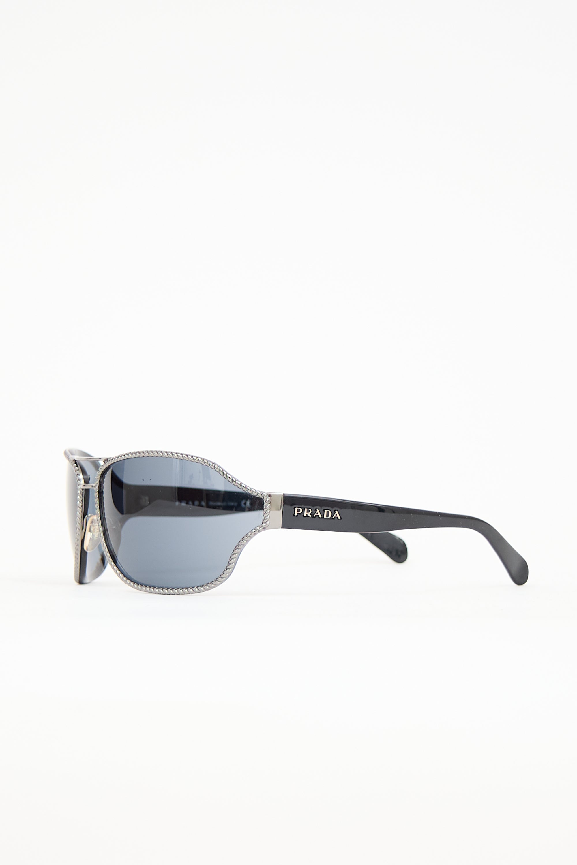 Pre-owned Prada black SPR16H sunglasses featuring tinted lens, gunmetal tone hardware, braided metal trim, nose pads, and logo at side. Includes original case.