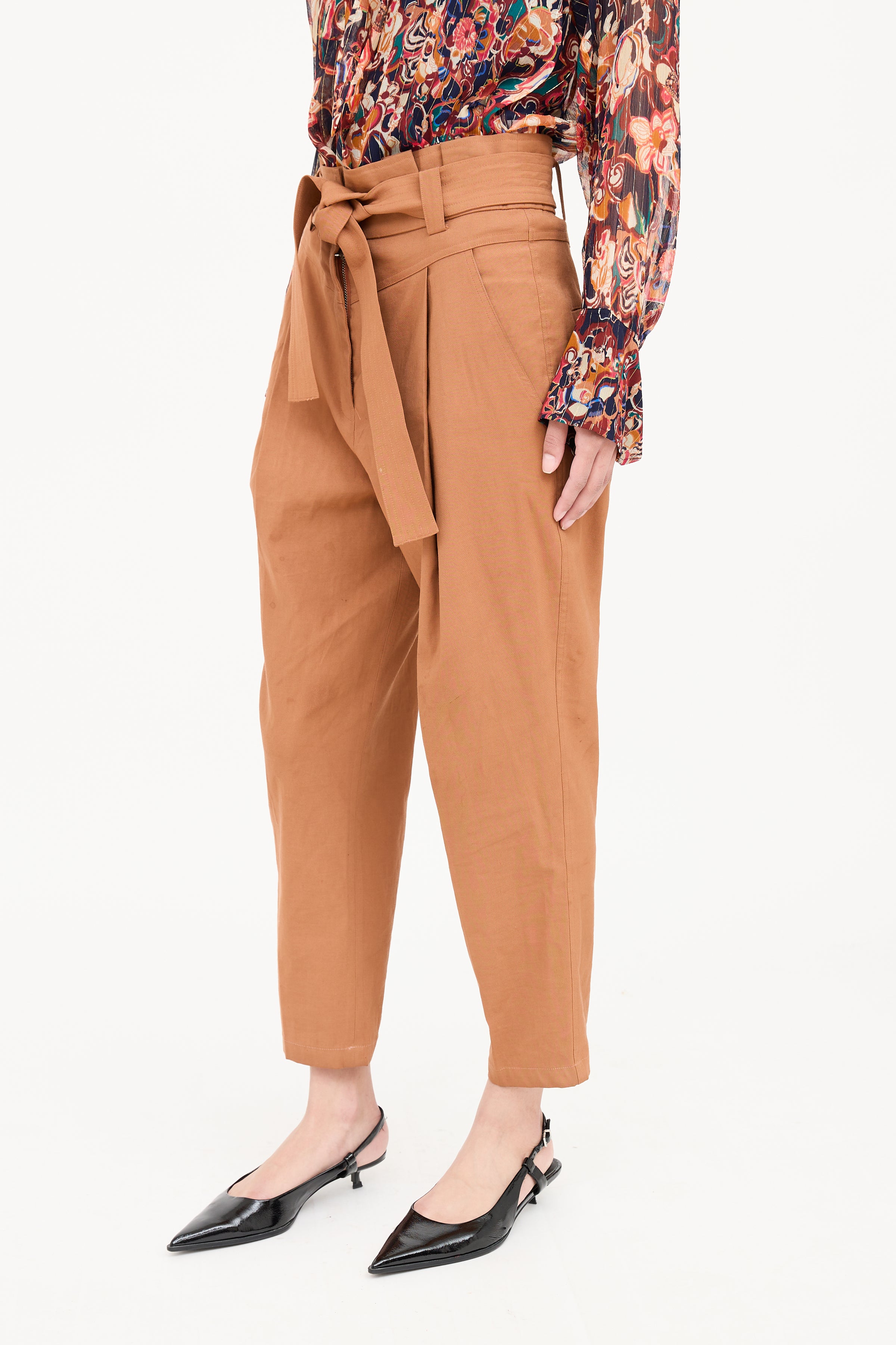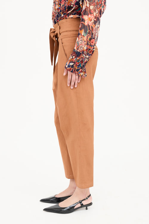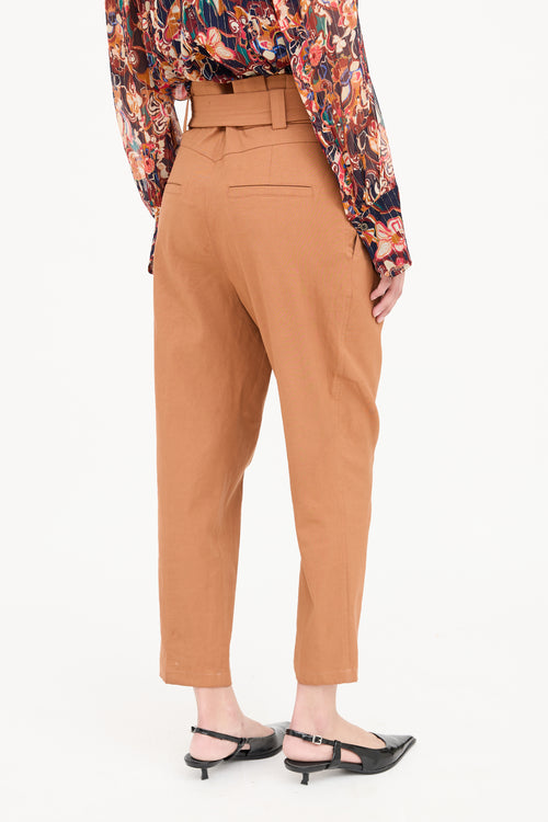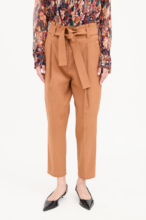 Pre-owned A.L.C. brown pants featuring paper bag waist, zip and clasp closure, belt loops on waist, dual slip pockets on hip, pleated and dual stitch pockets on back.