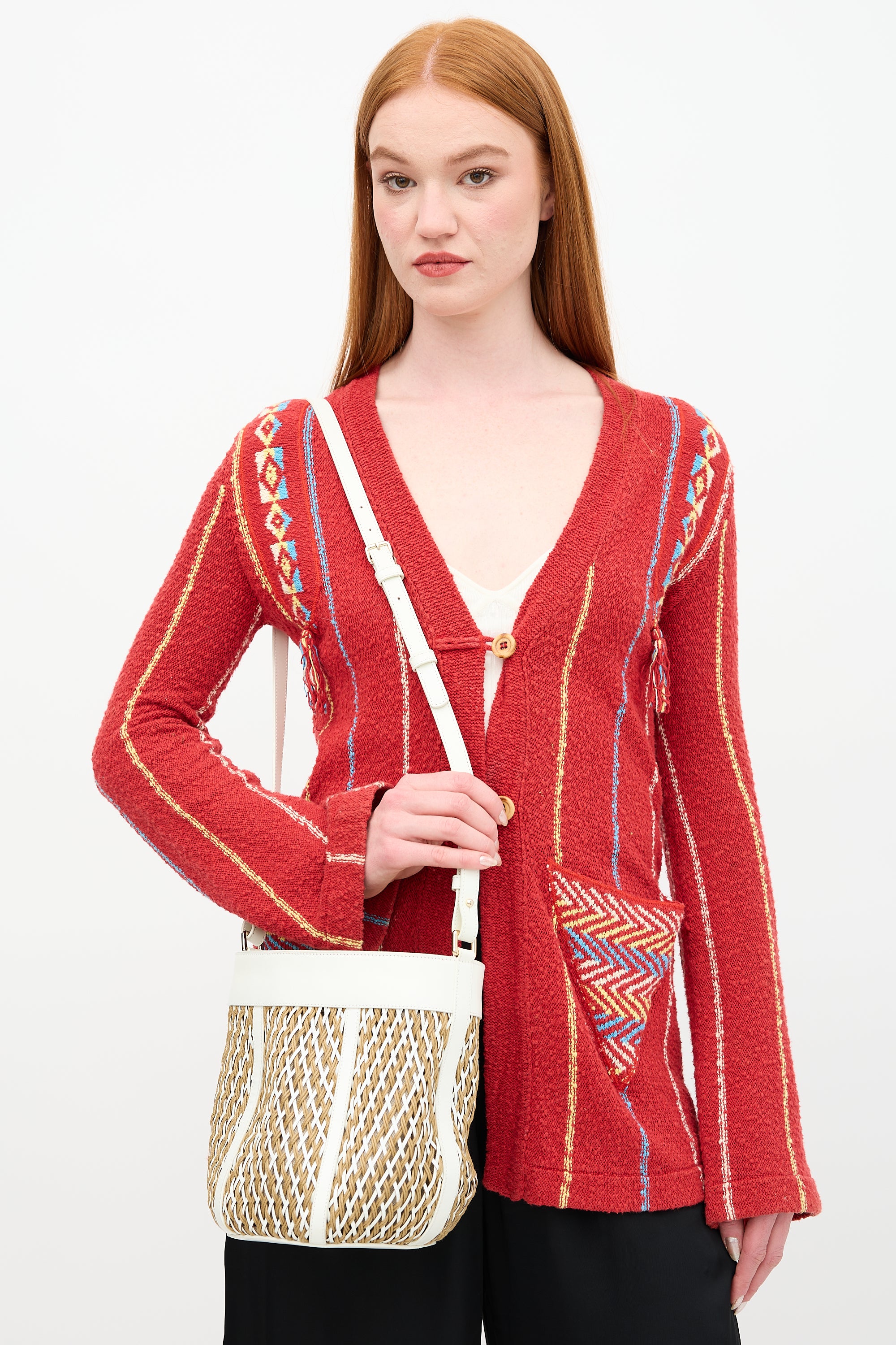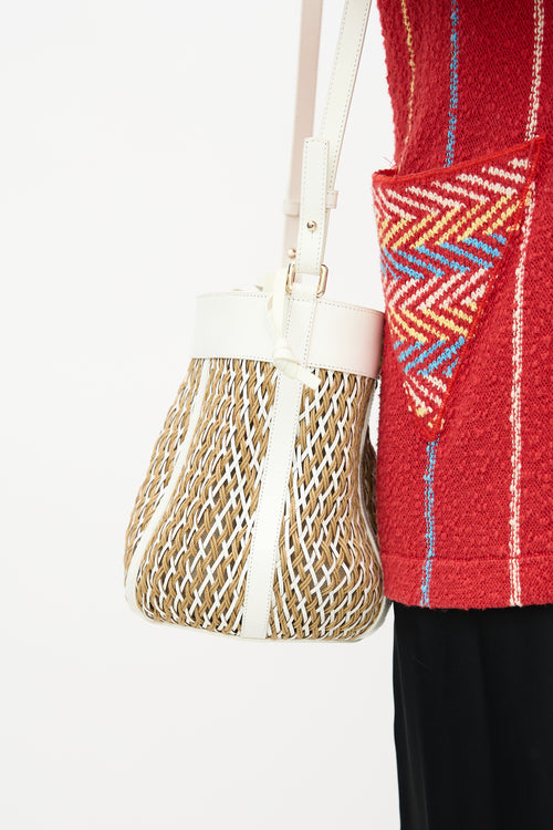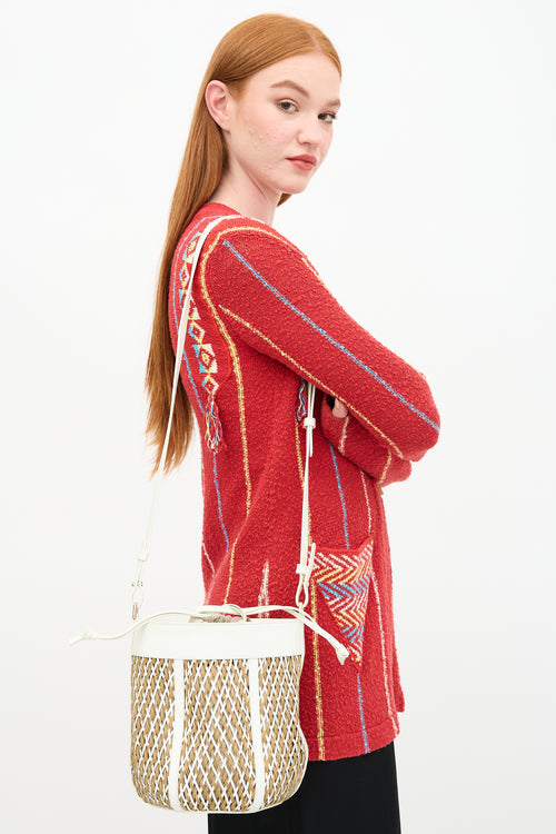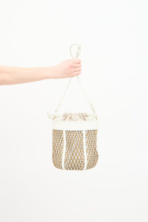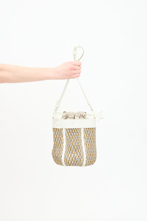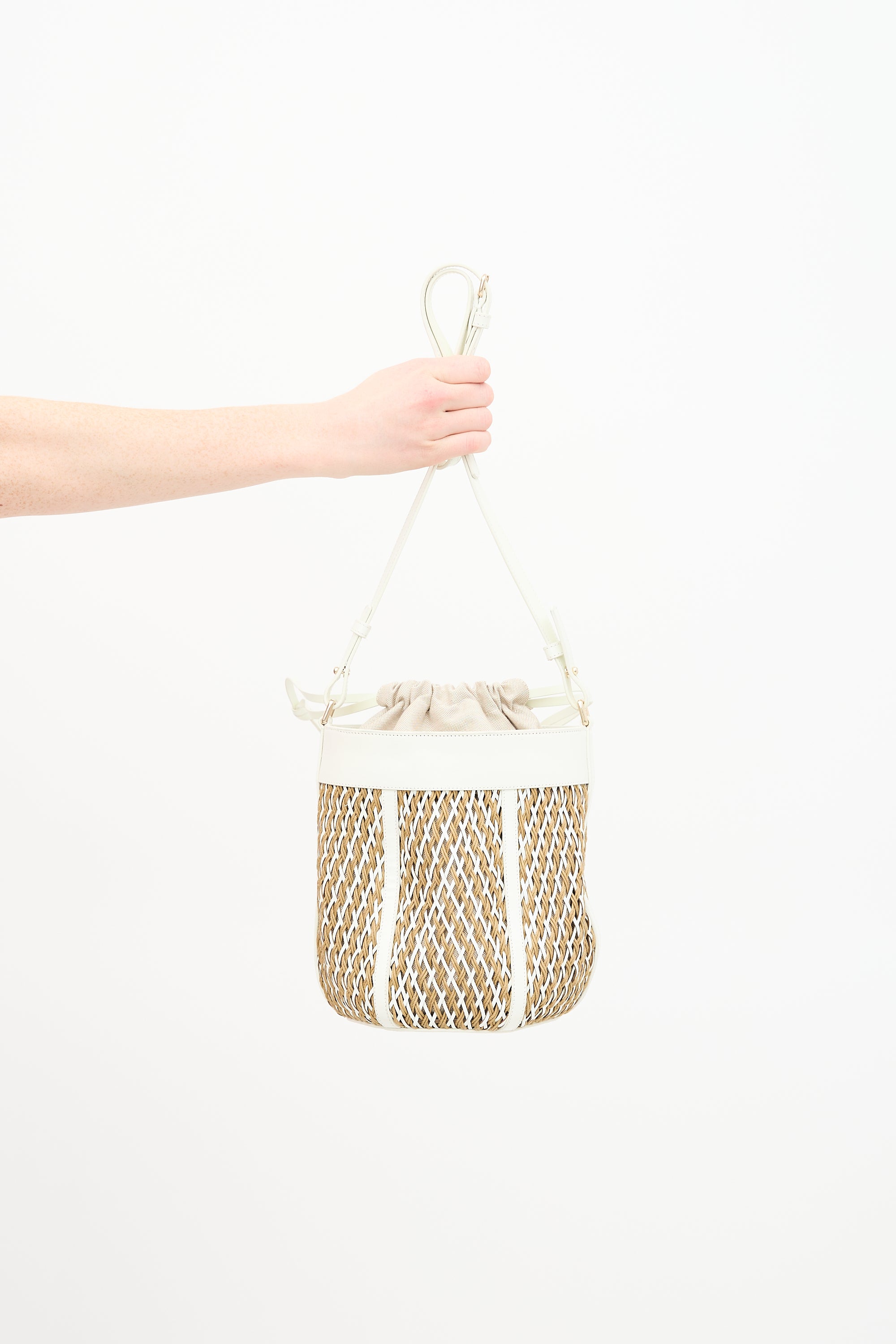 Pre-owned A.P.C. Garance bucket bag featuring woven white leather and brown rope panels, tonal stitching, pale gold tone hardware, front stamped logo, adjustable shoulder strap, inset drawstring top closure, and one lined main compartment with one slip pocket.