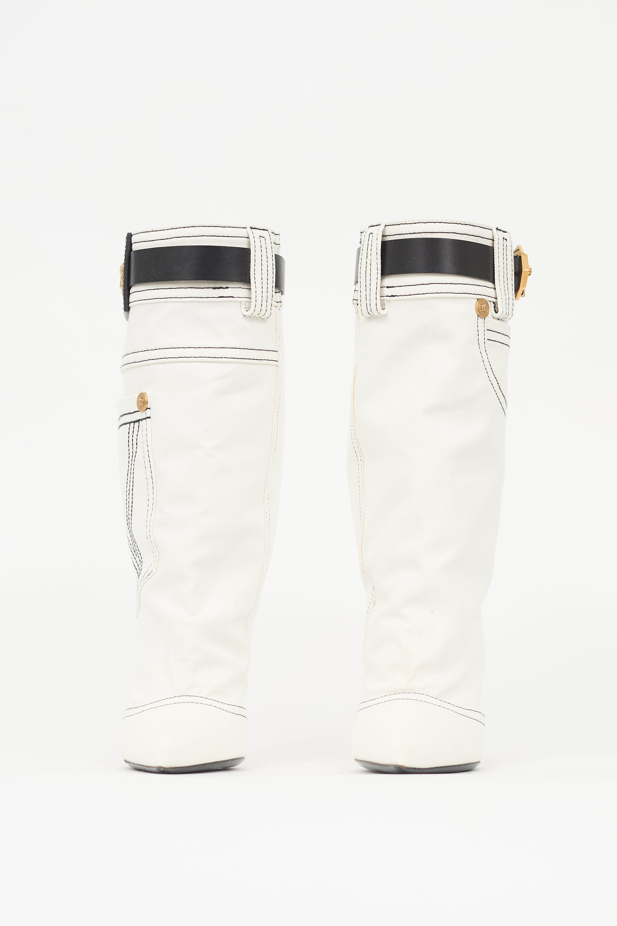 Pre-owned Versace white denim boots featuring pointed toe, contrast stitch, belt loops at top with decorative belt, gold tone medusa logo at right pair, and stiletto heel. Includes original dust bag.
