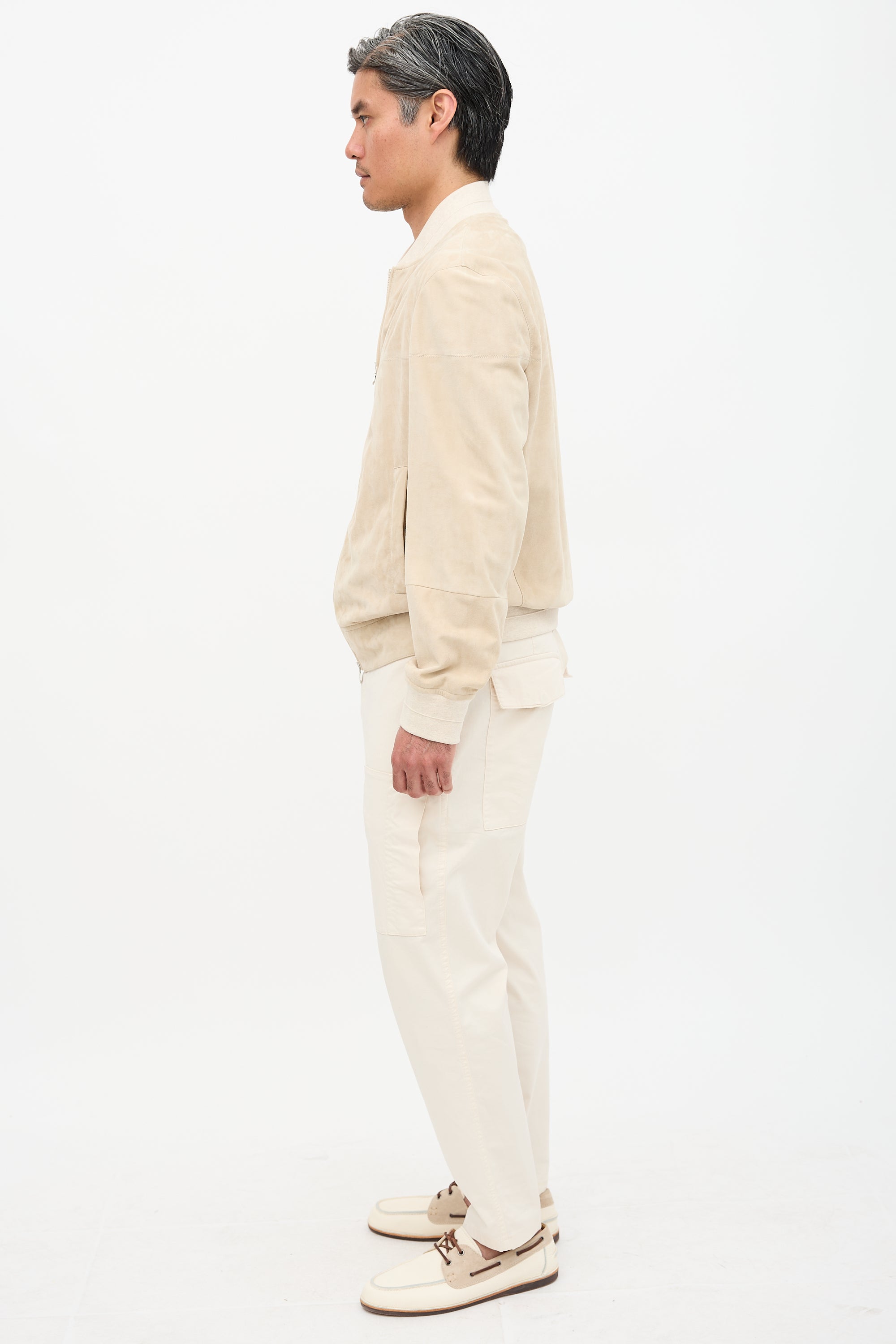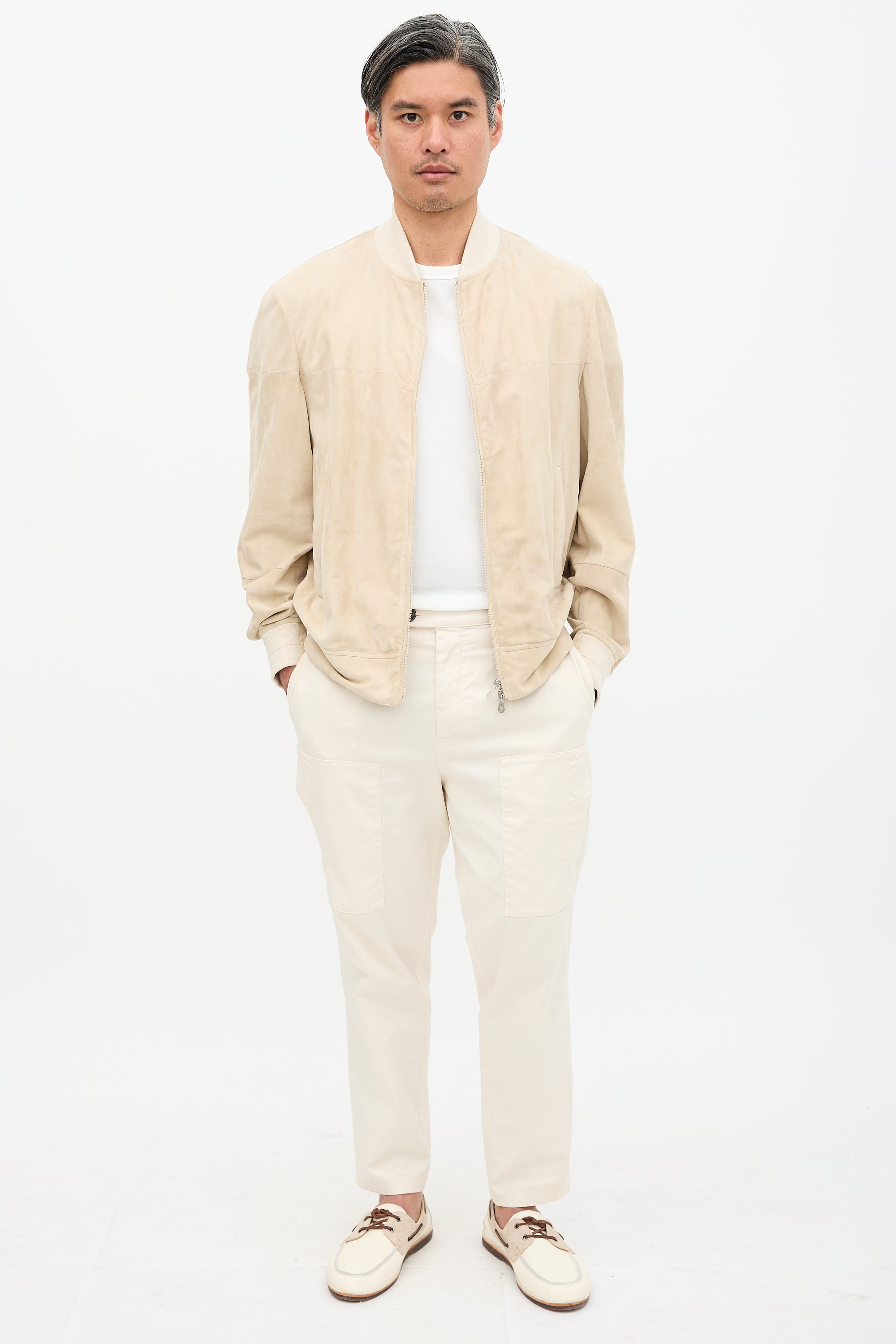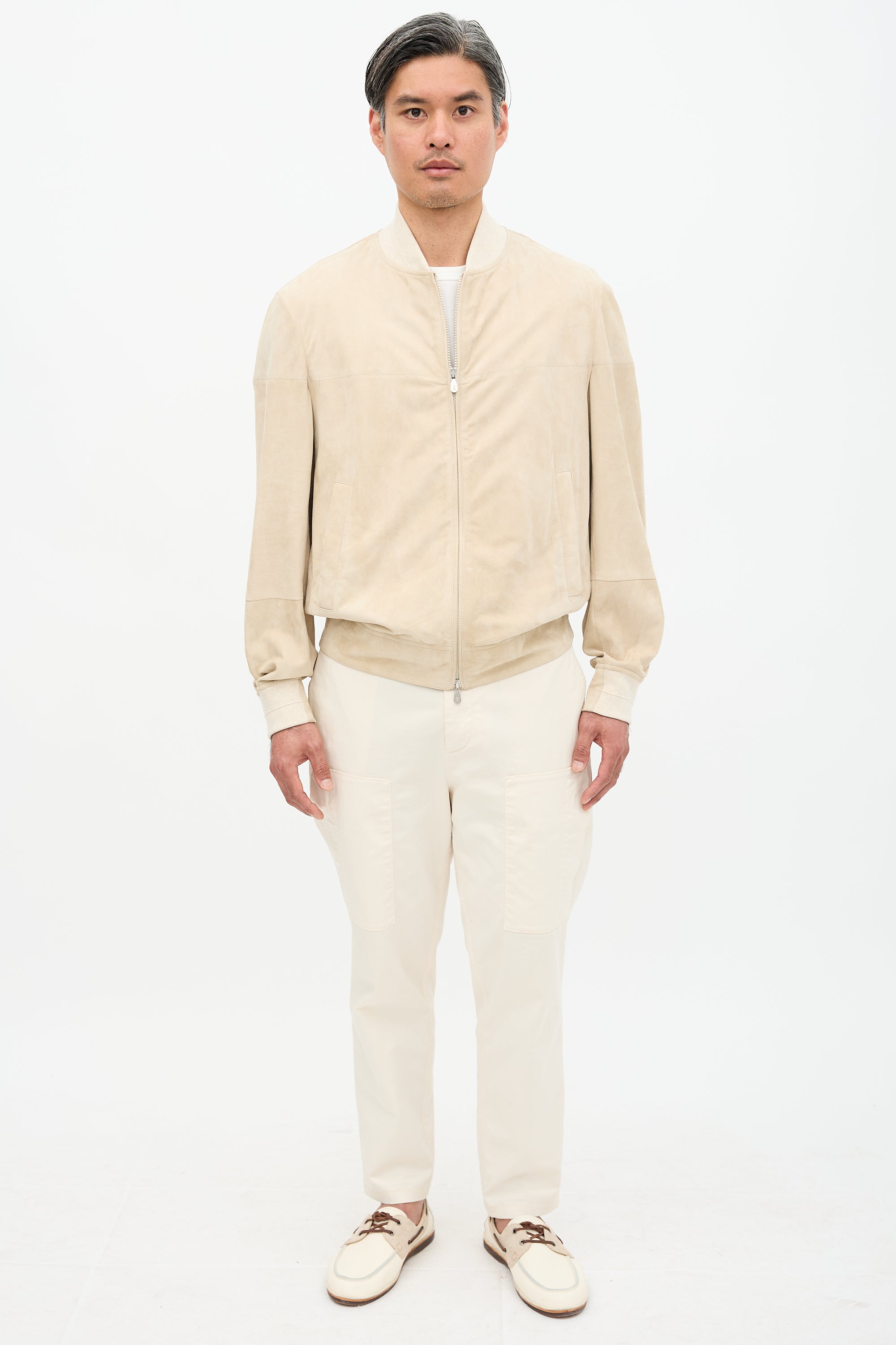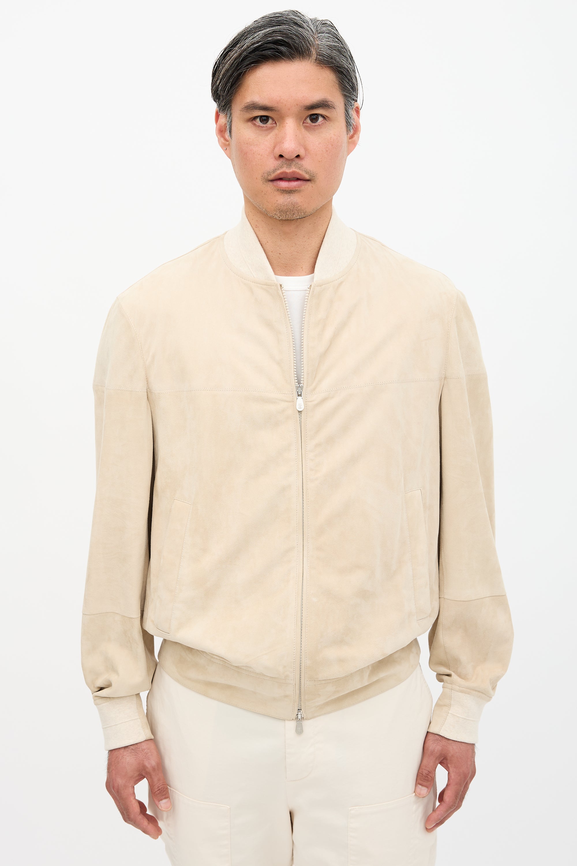 Pre-owned Brunello Cucinelli beige suede bomber jacket featuring double zip front, two front pockets, and ribbed collar and cuffs. Lined interior yoke.