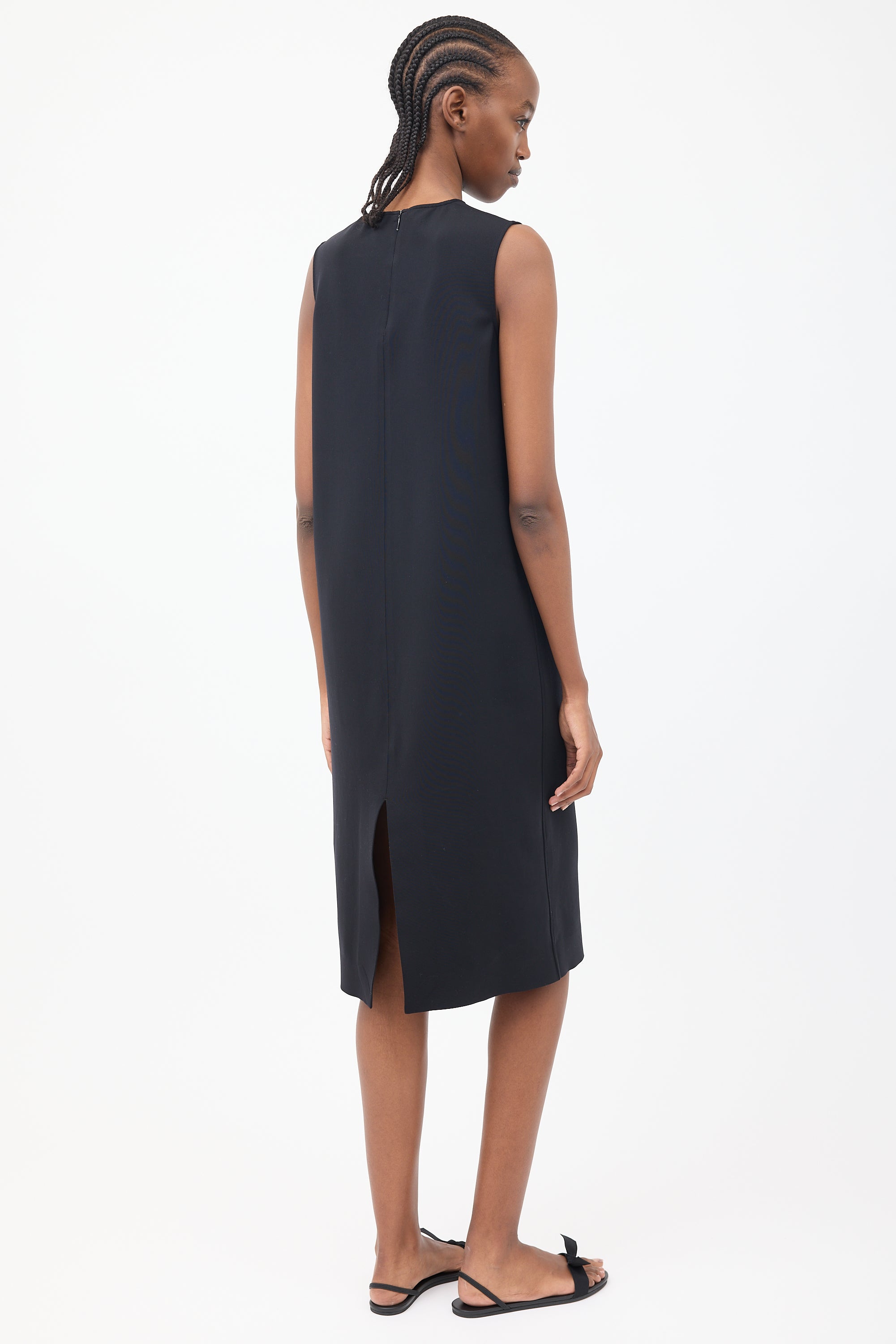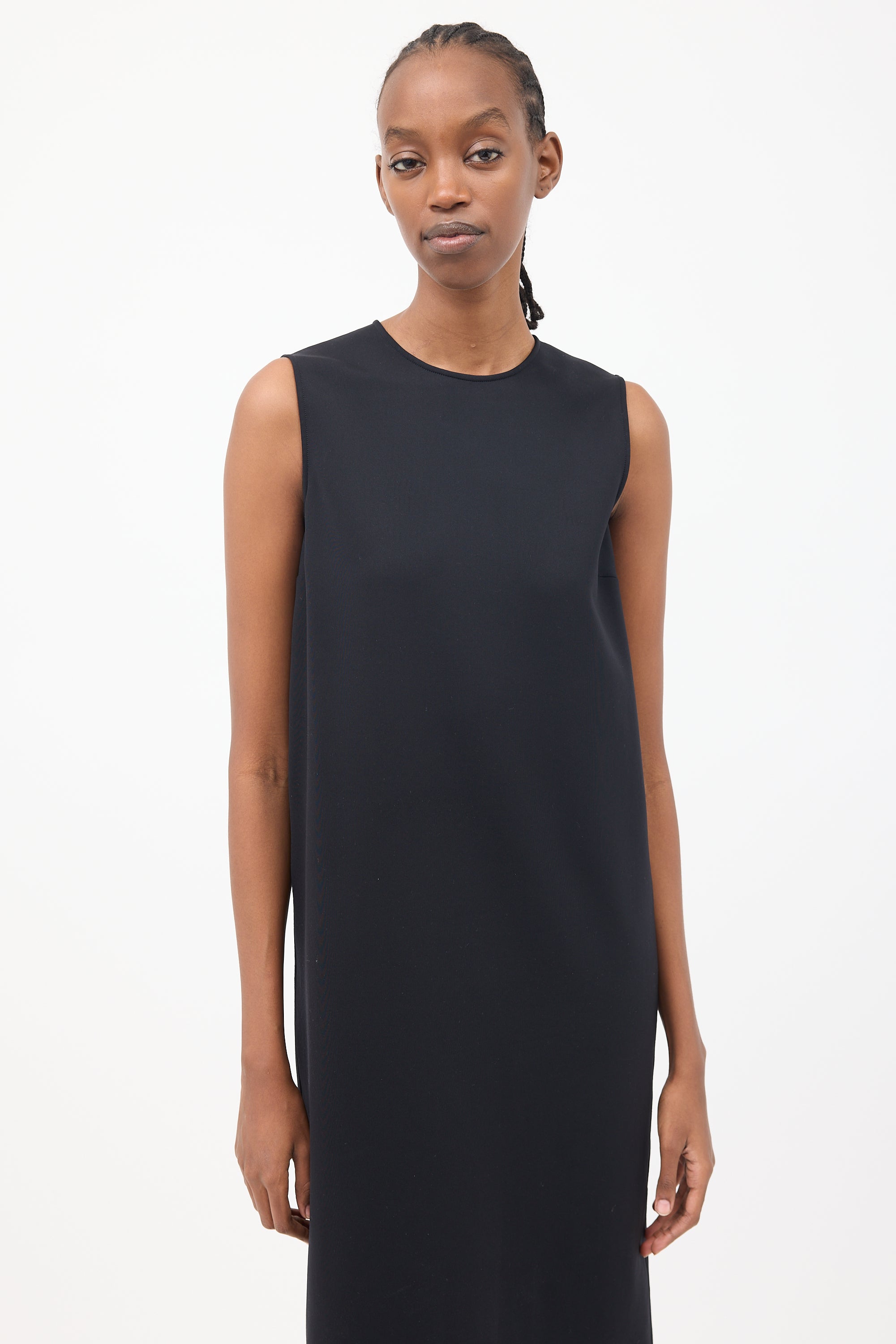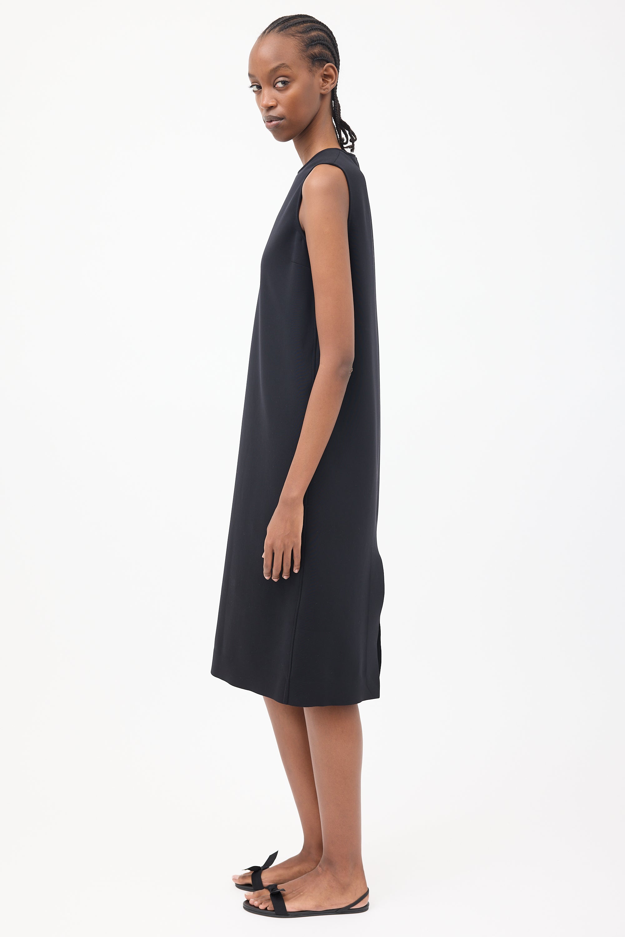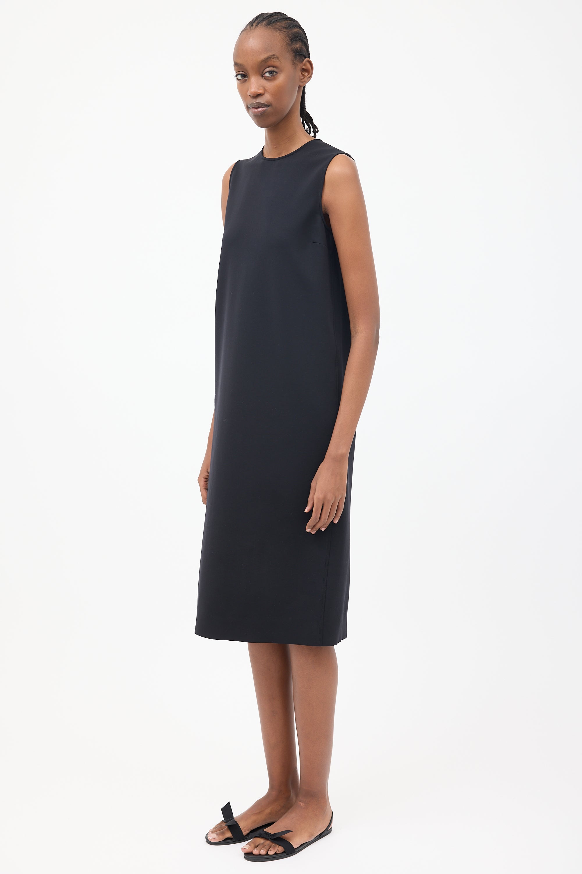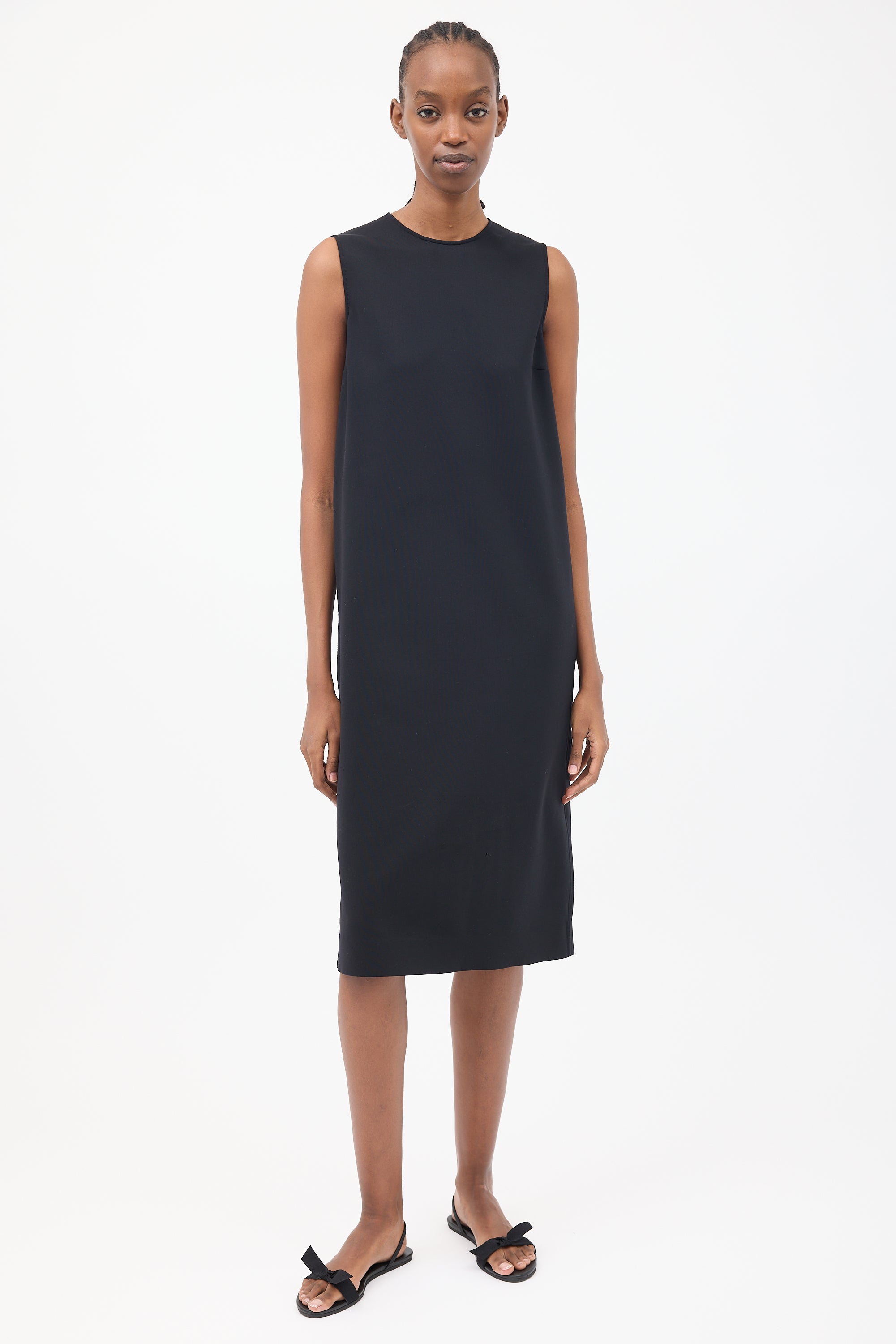Pre-owned The Row black neoprene sheath dress featuring round neckline, zip closure at back, and back vent. Unlined.