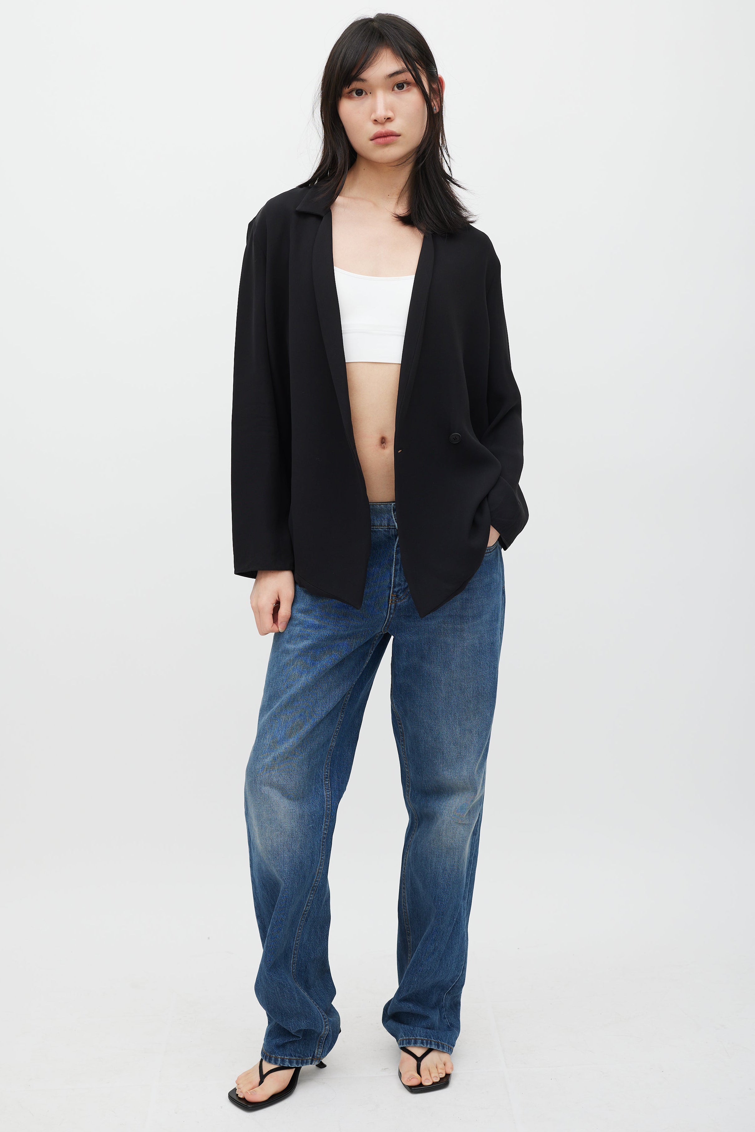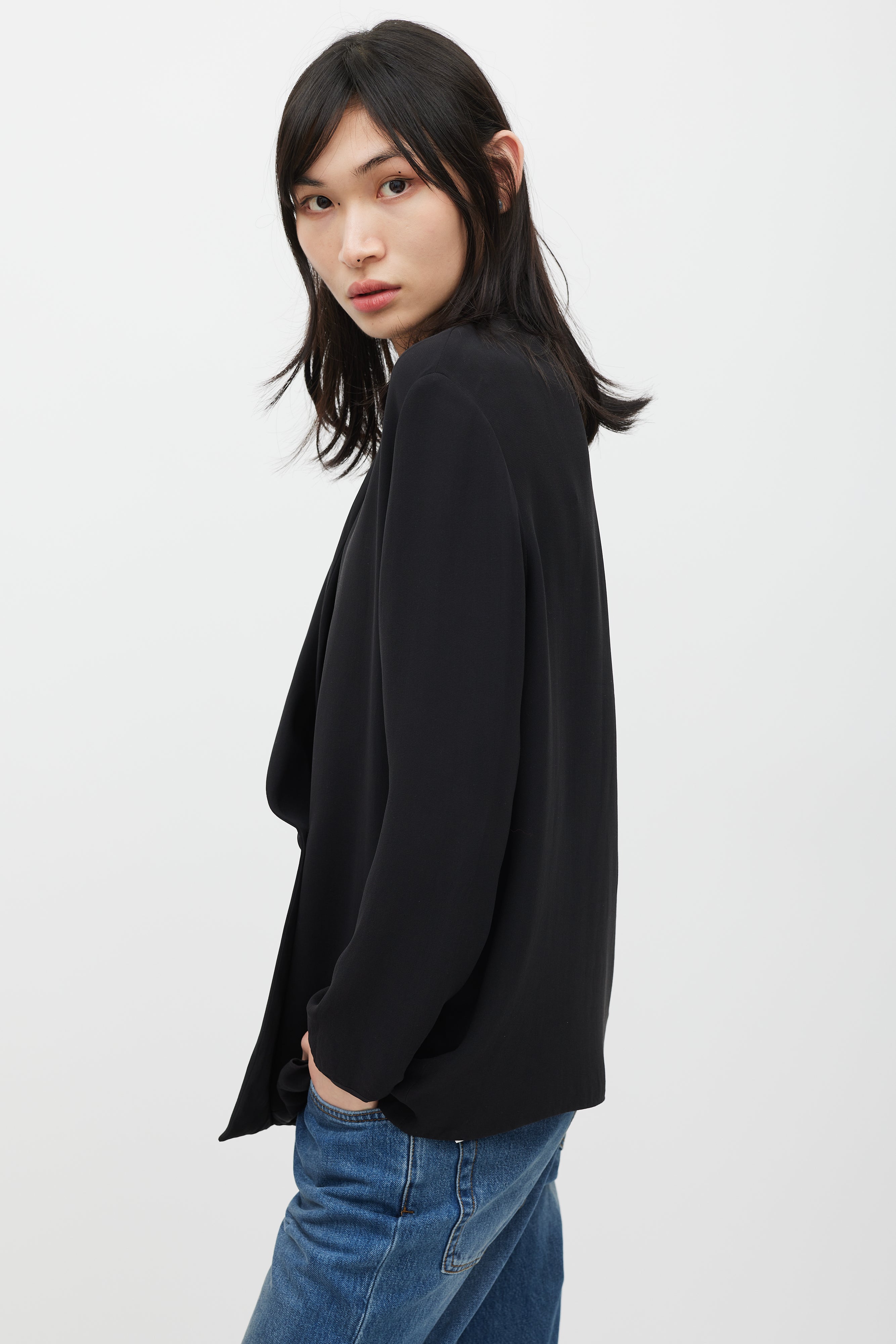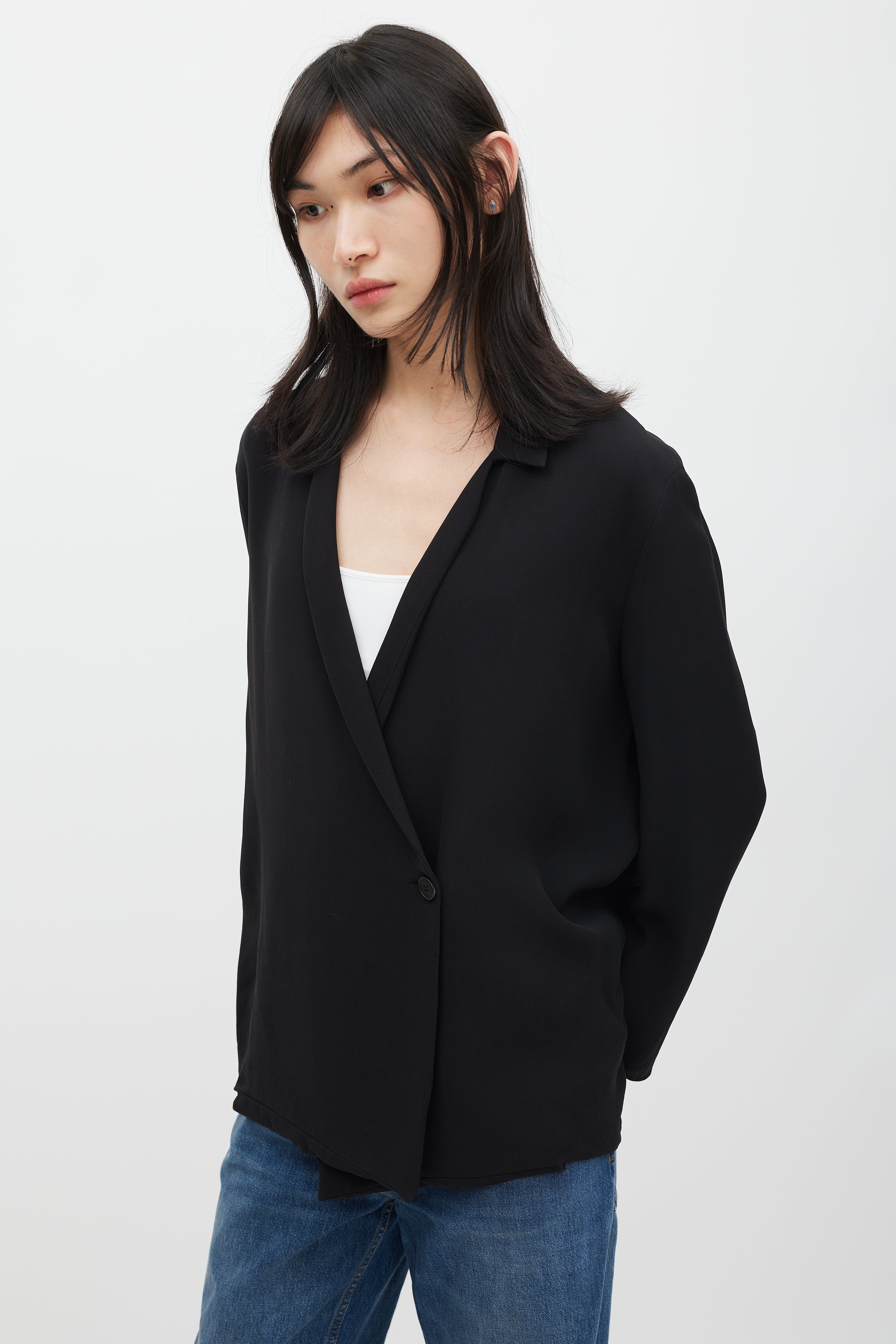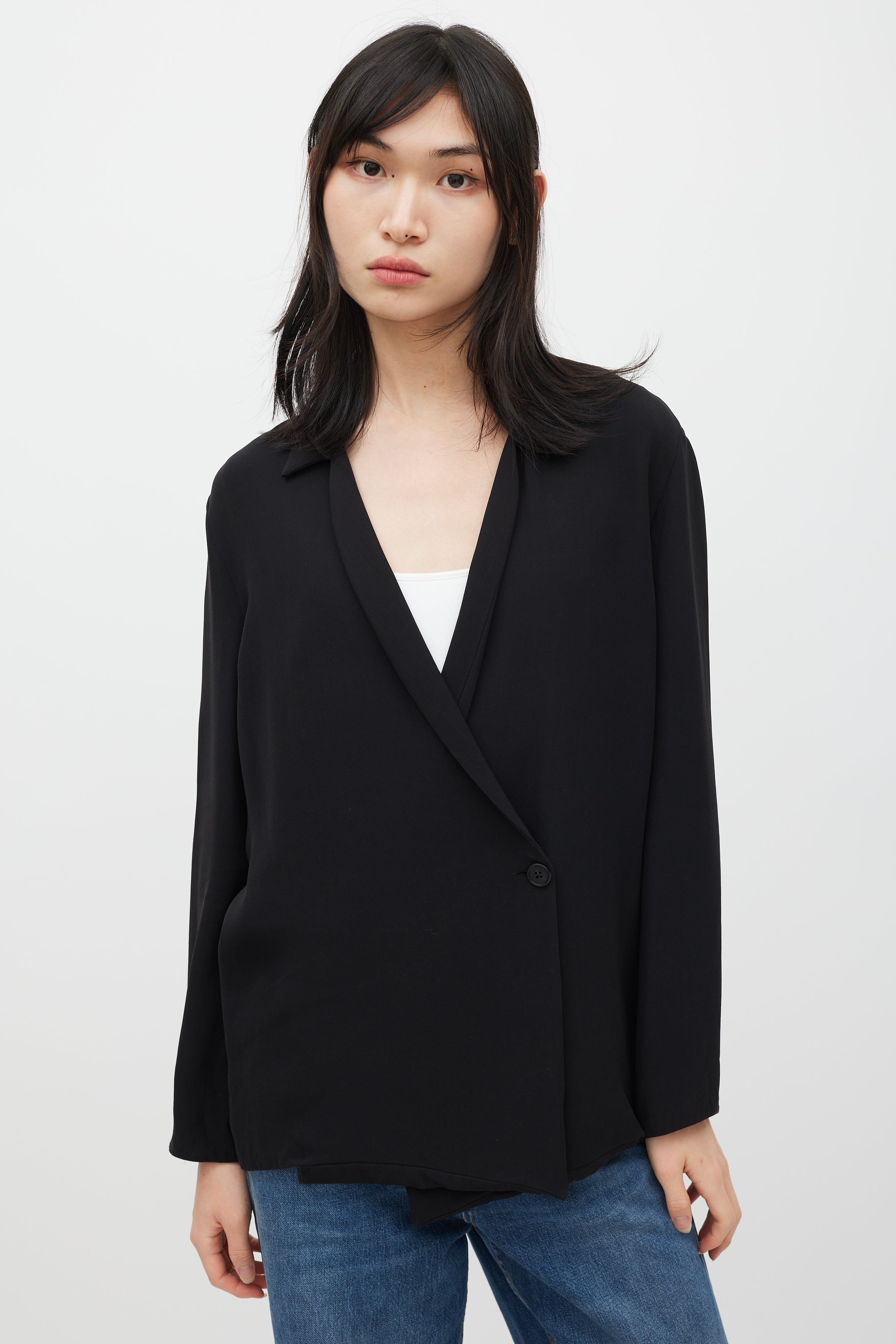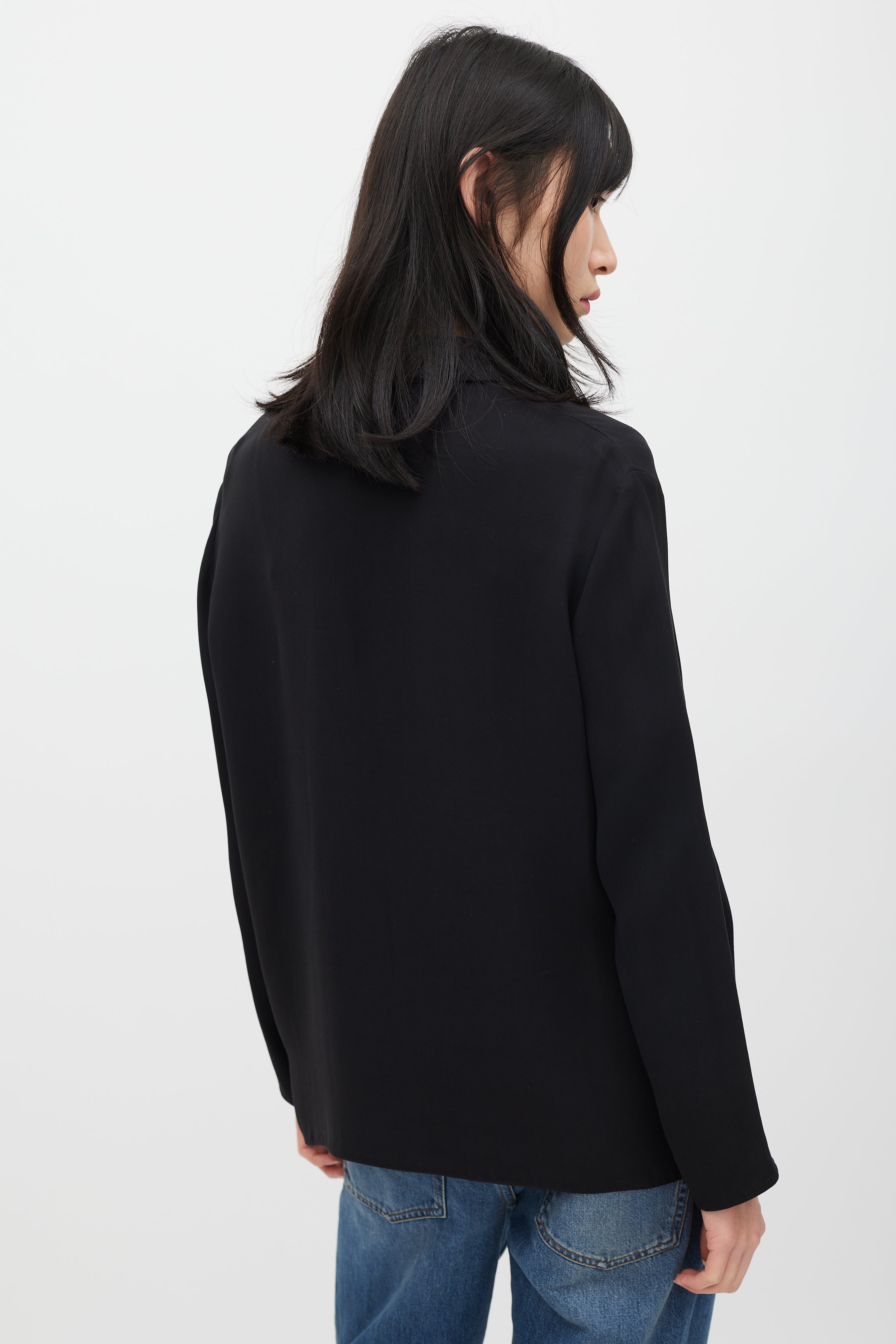 Pre-owned The Row black silk oversized blazer featuring classic collar, shawl lapel, and single button closure. Unlined.
