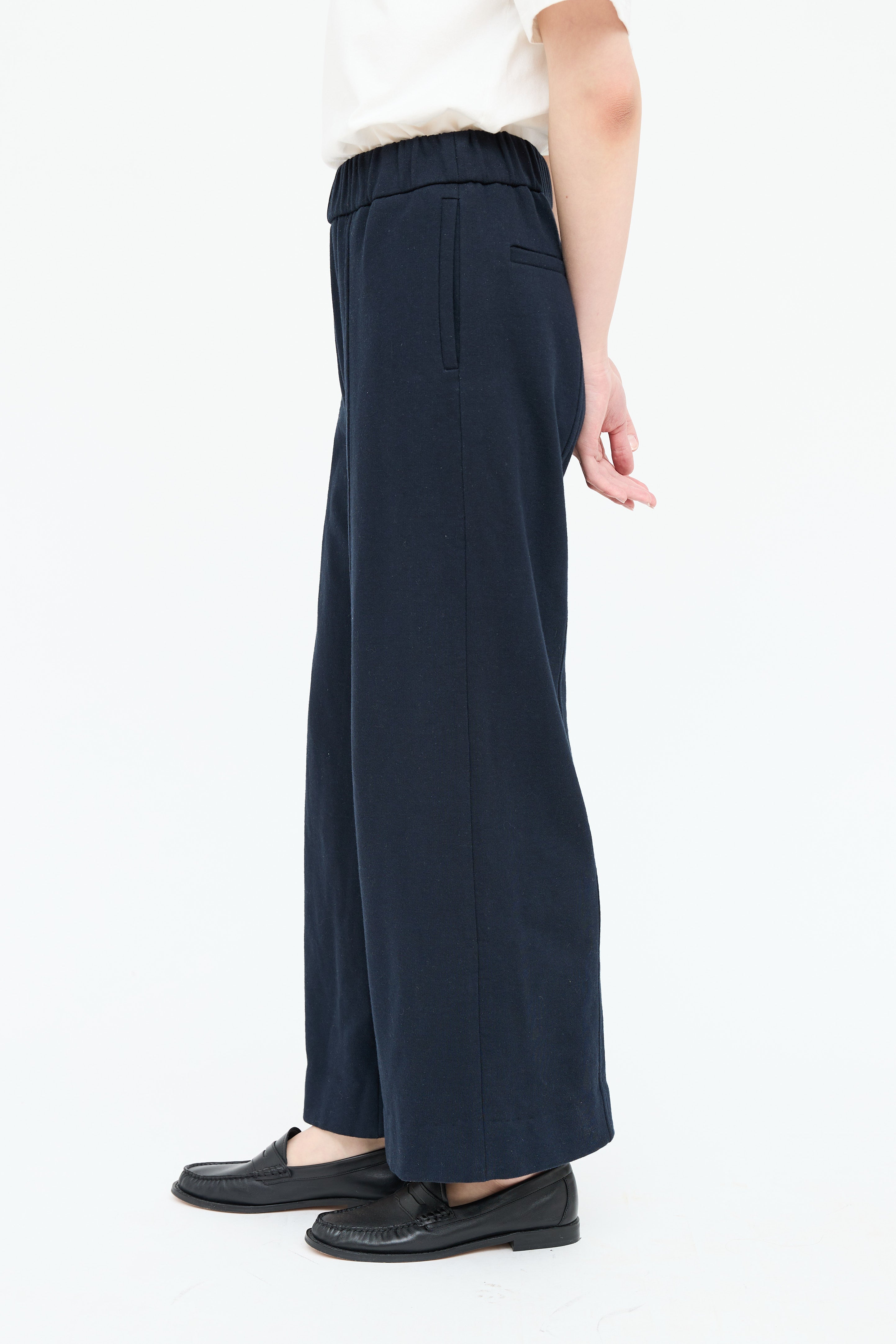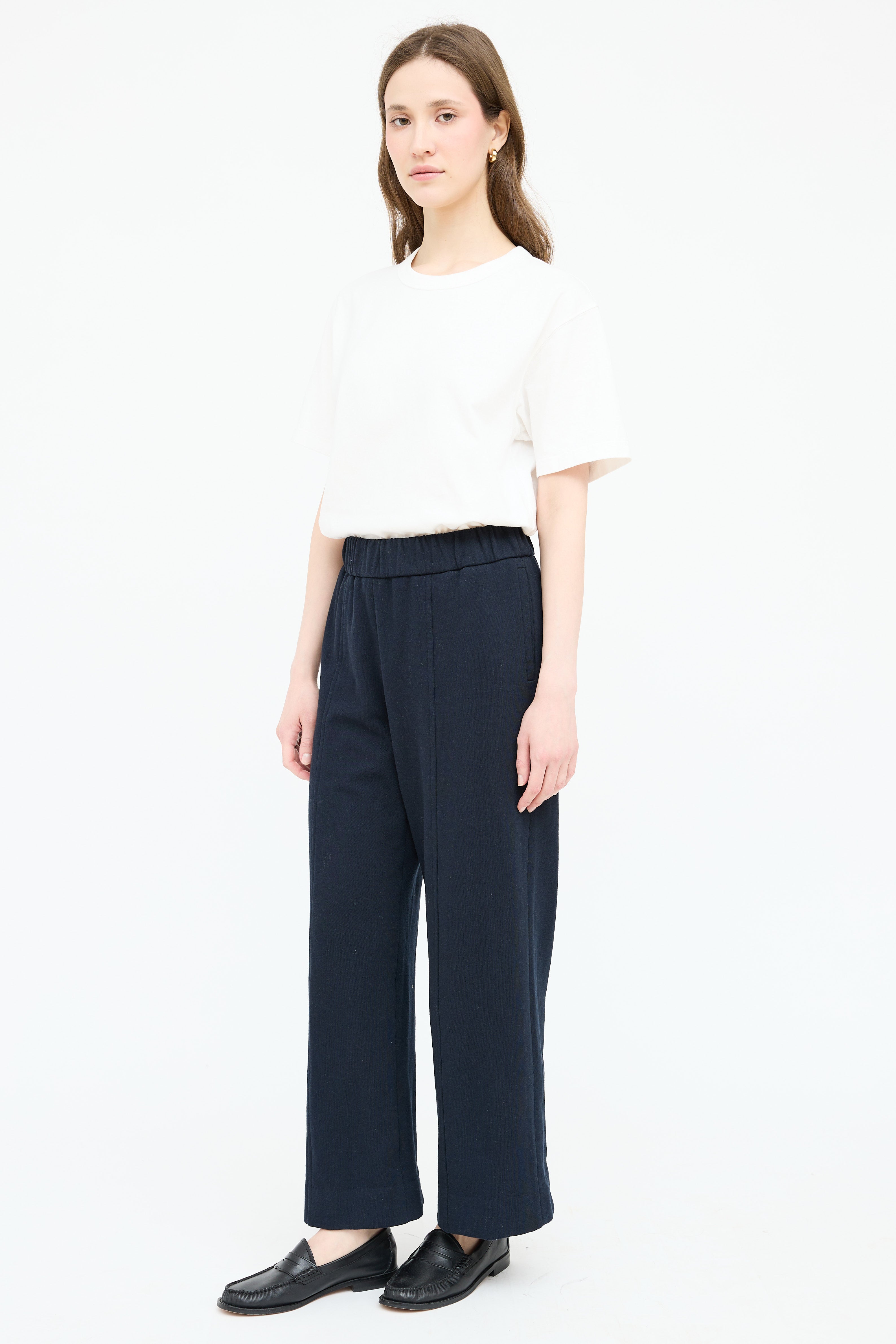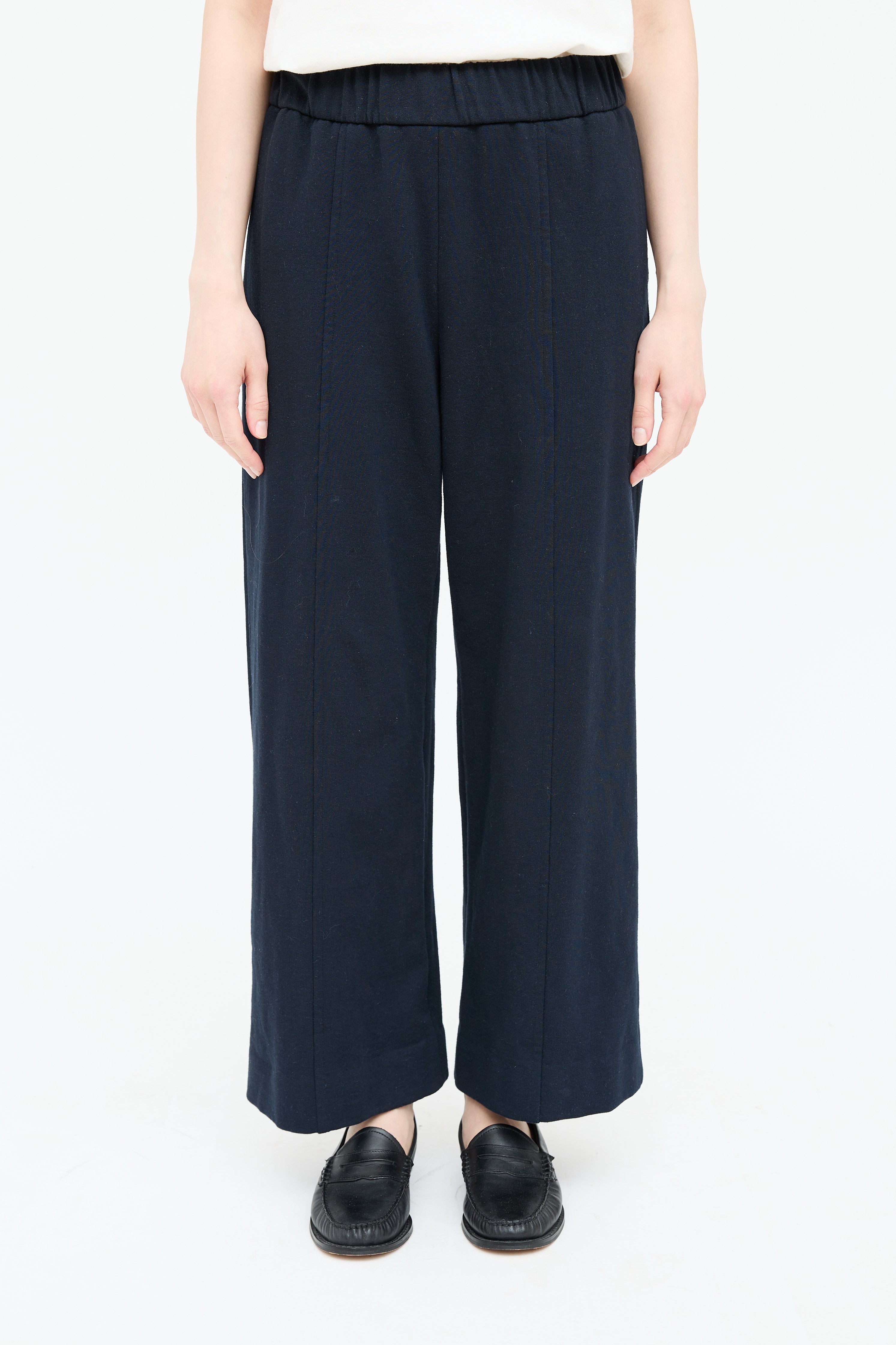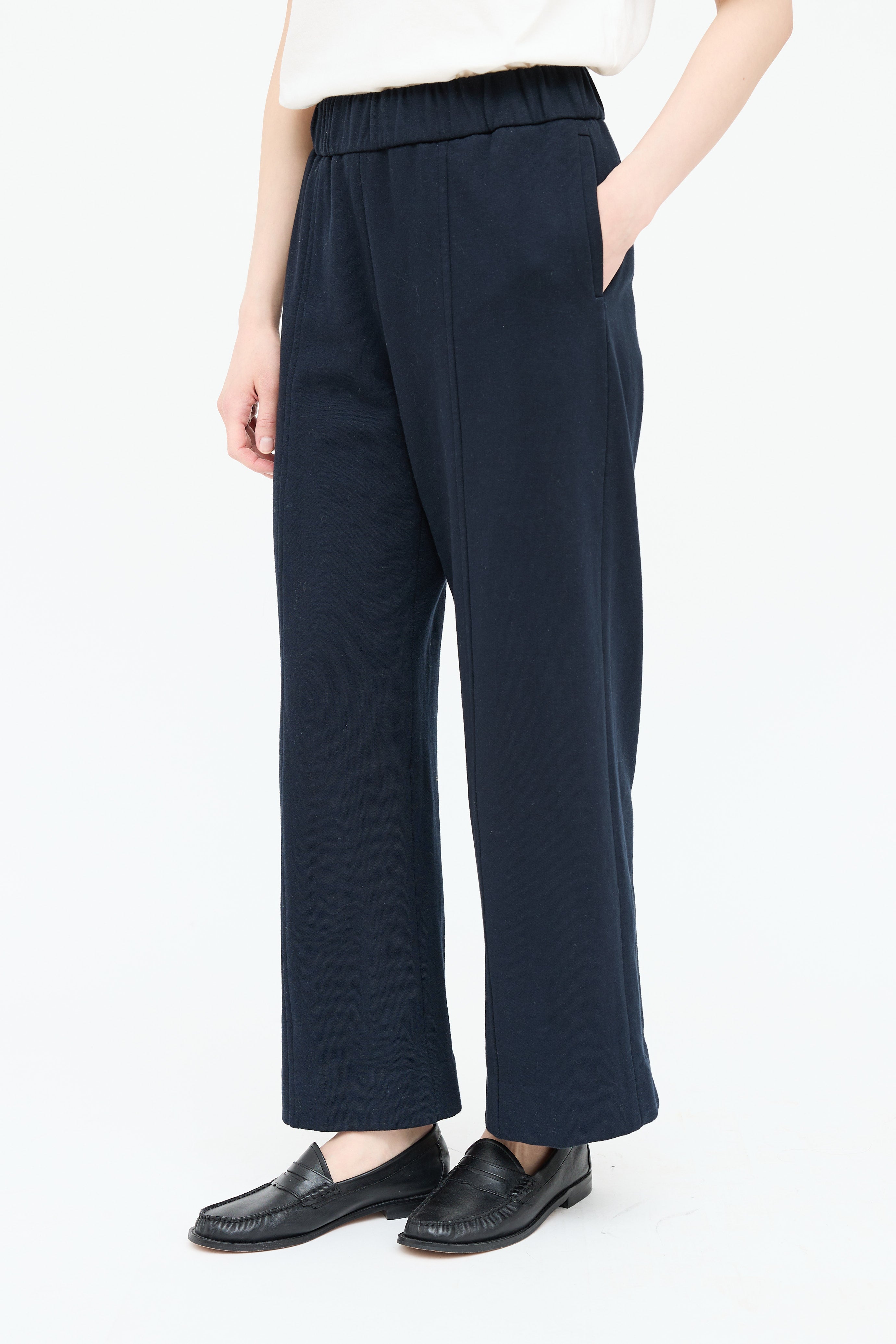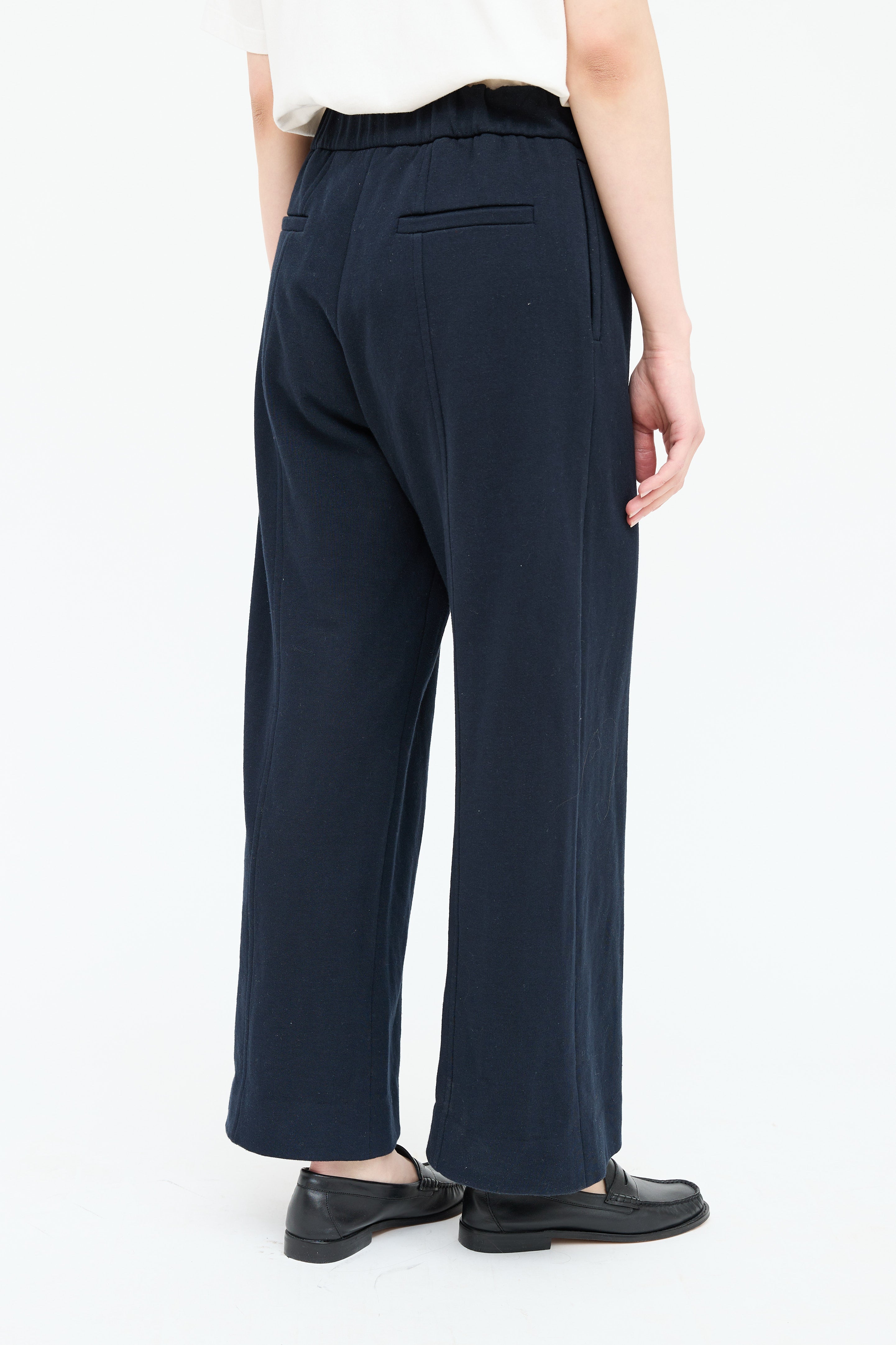 Pre-owned The Row navy lounge pants featuring elastic waistband, stitched centre seam, two on seam pockets, two back pockets and wide leg.