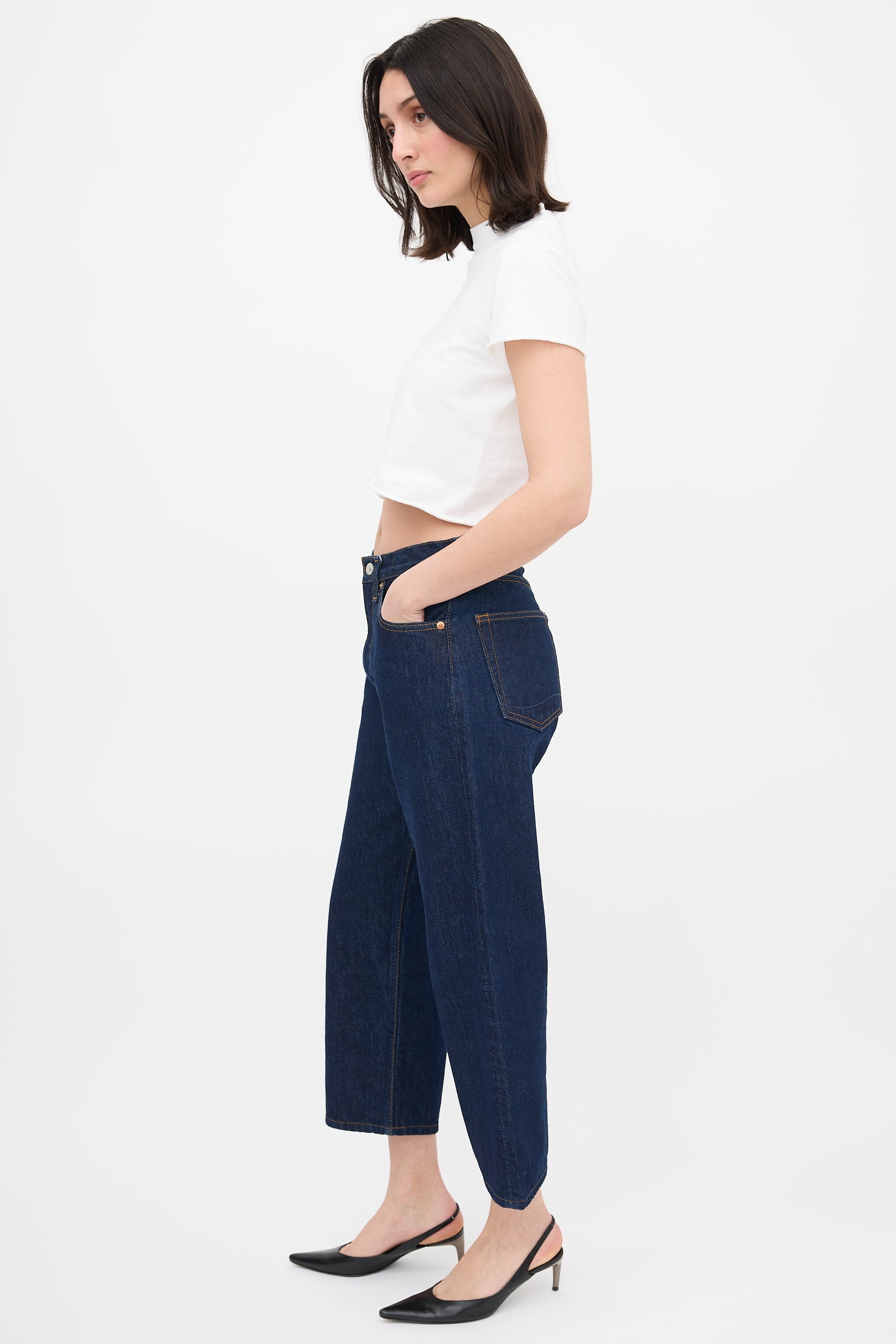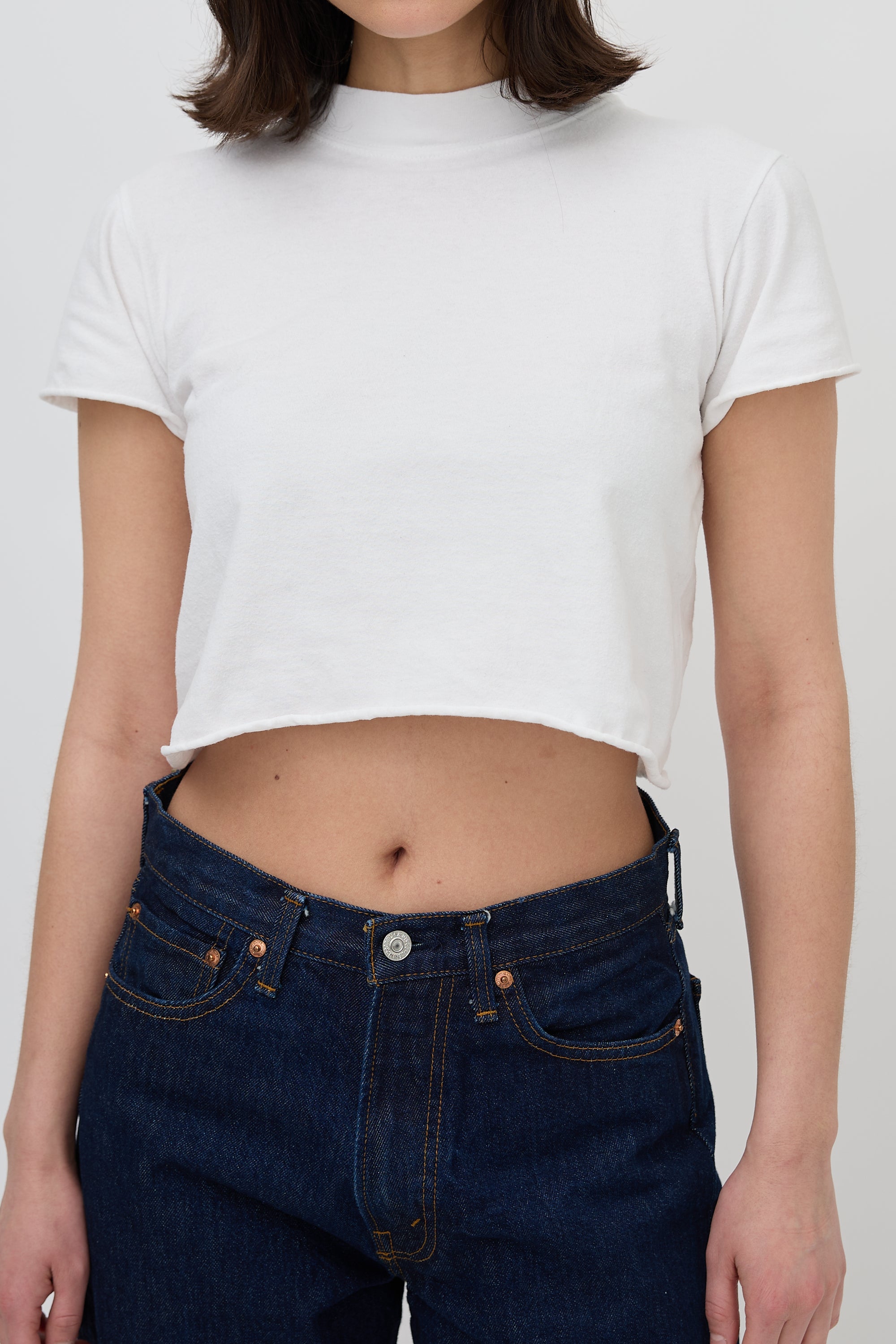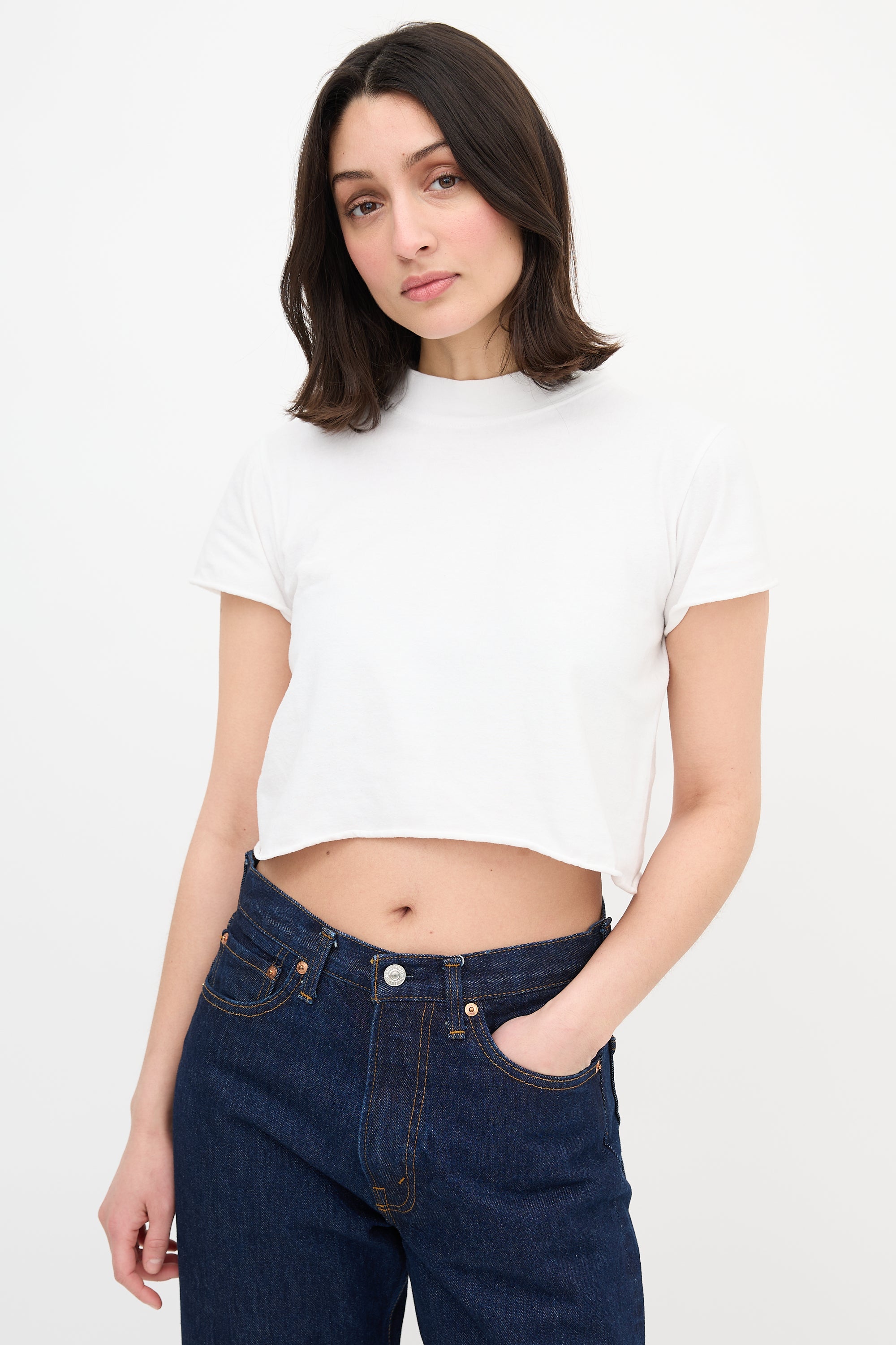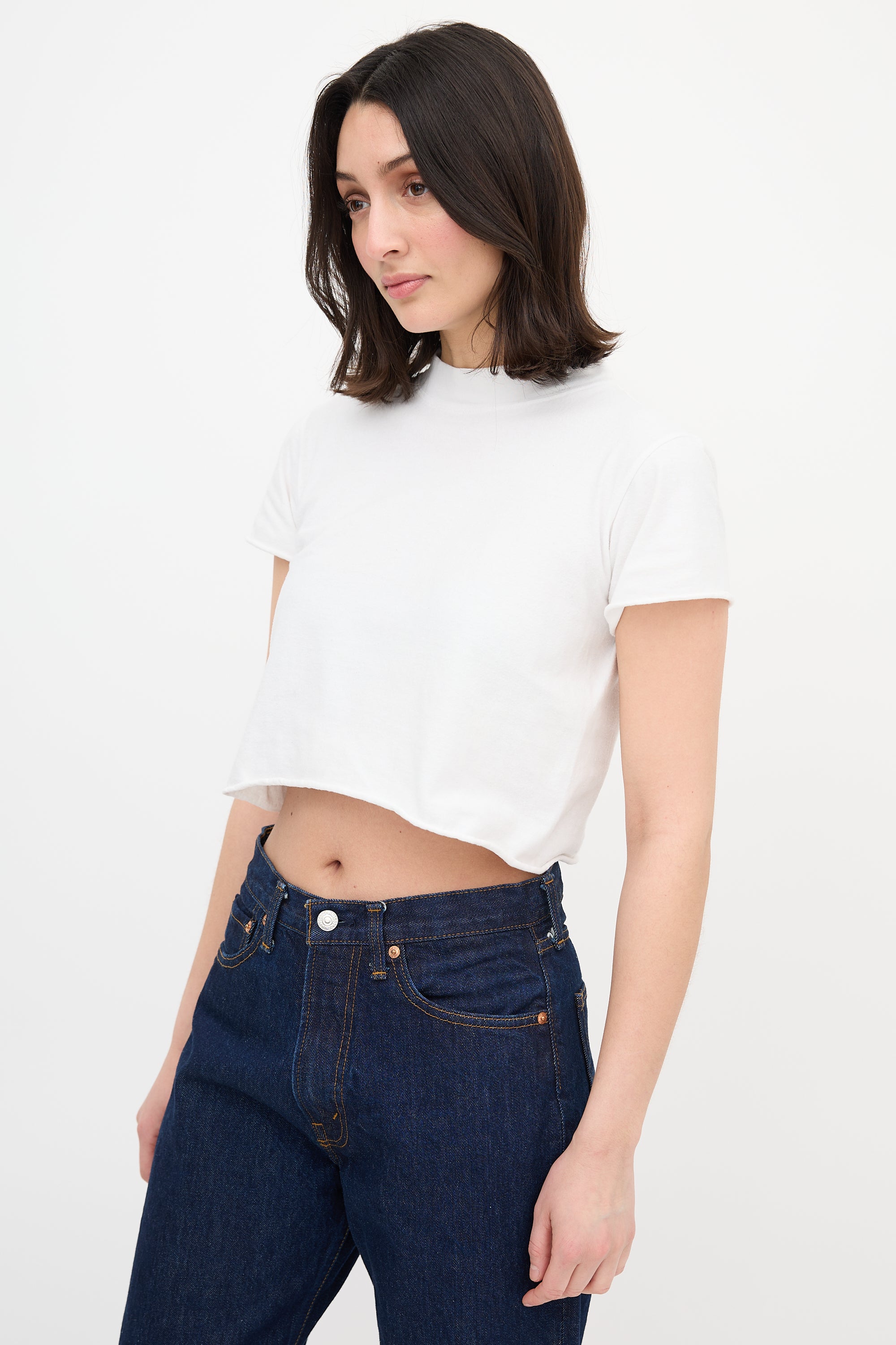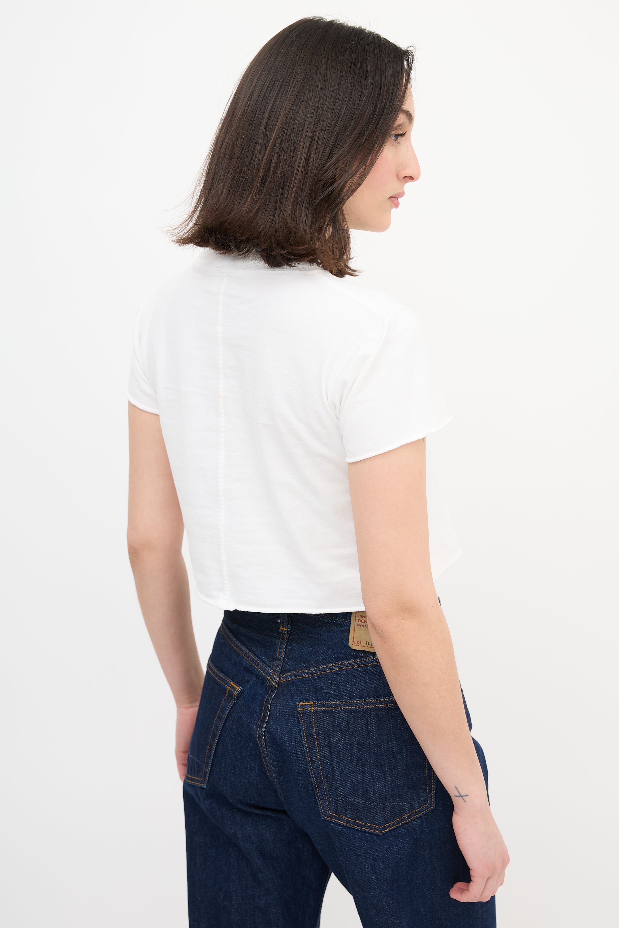 Pre-owned The Row white cropped T-shirt featuring ribbed collar, centre back seam detail, and raw hem and cuffs.