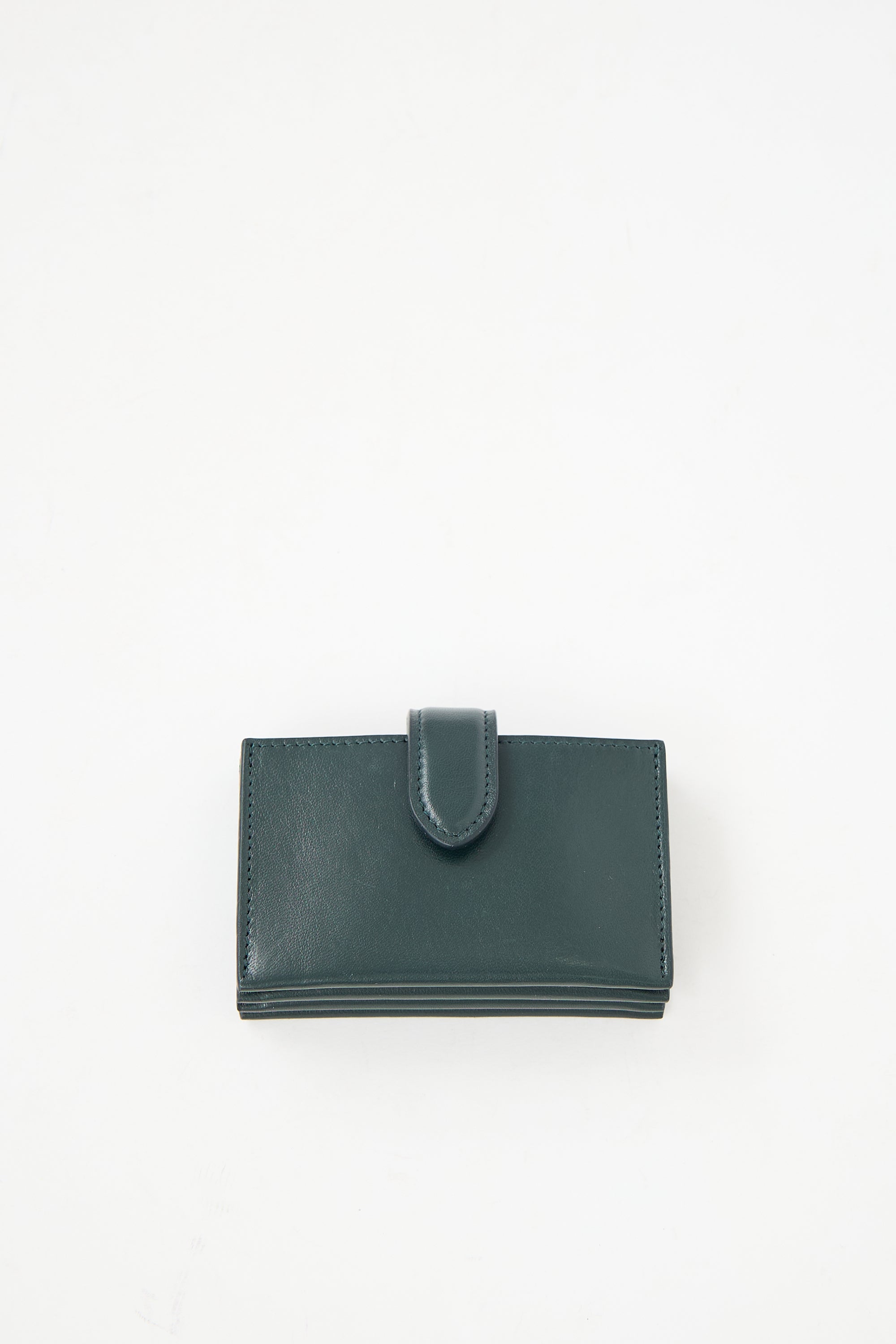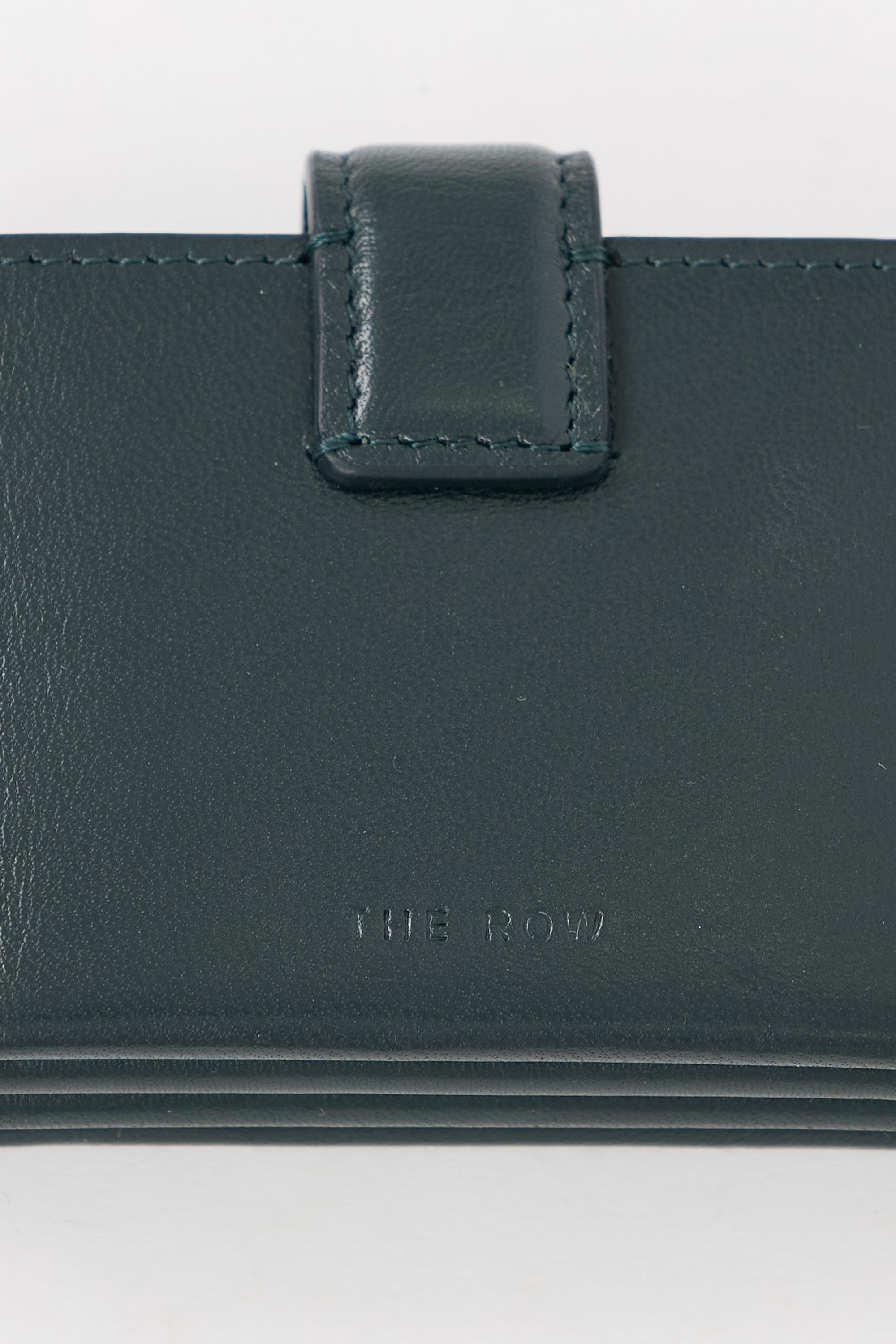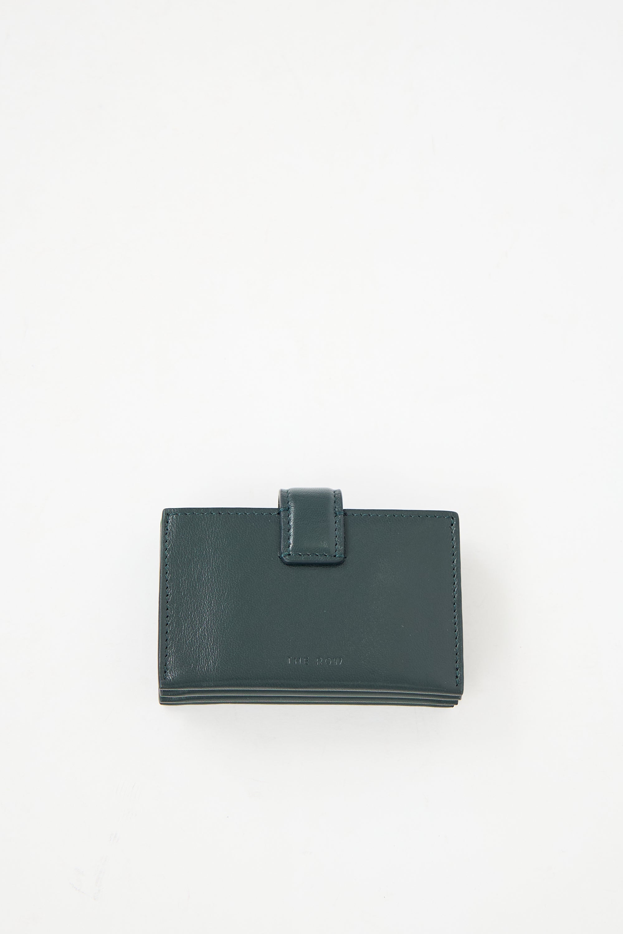 Pre-owned The Row dark green leather card holder featuring a debossed logo at back, snap button closure strap at top, and a brown leather interior with four main compartments.