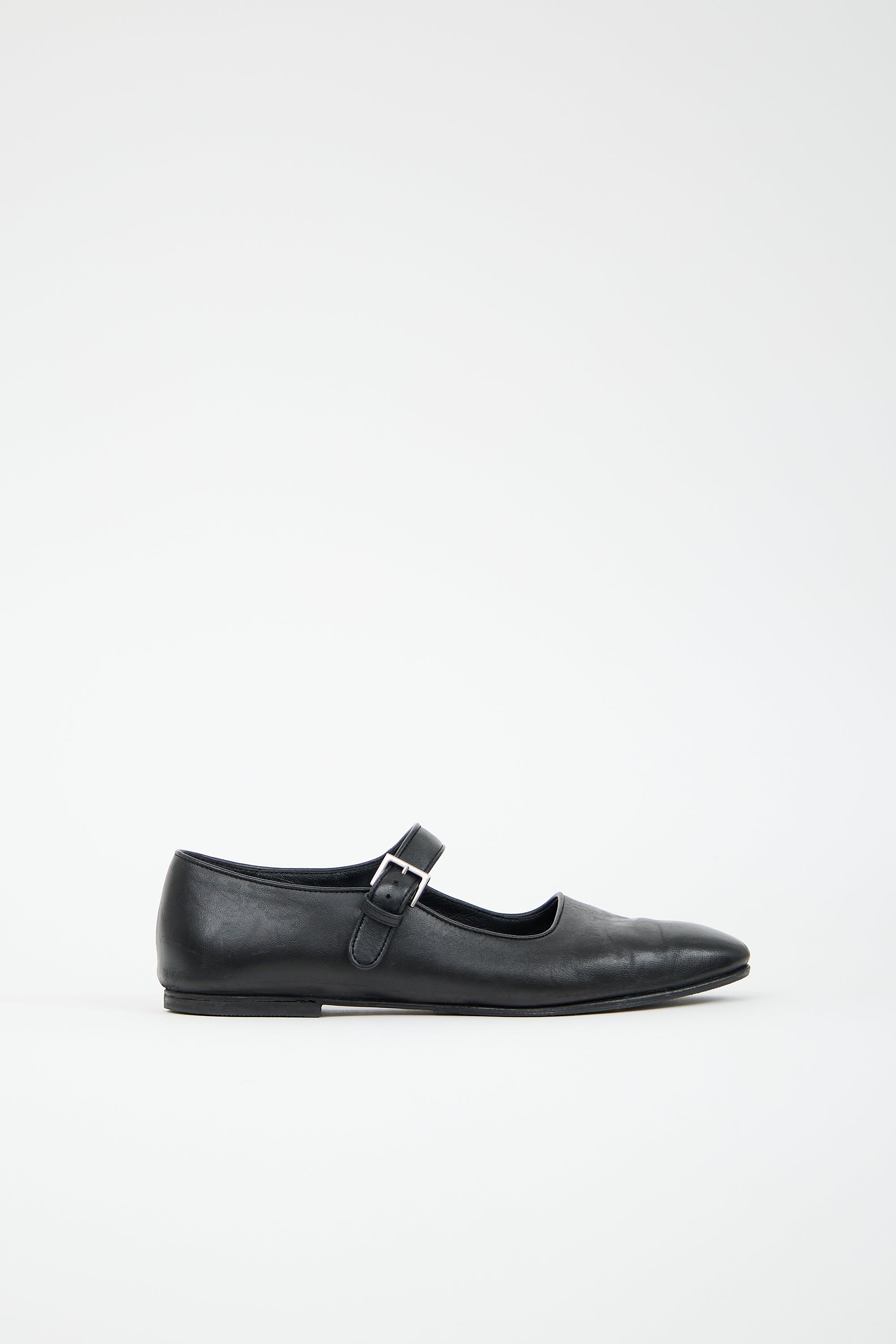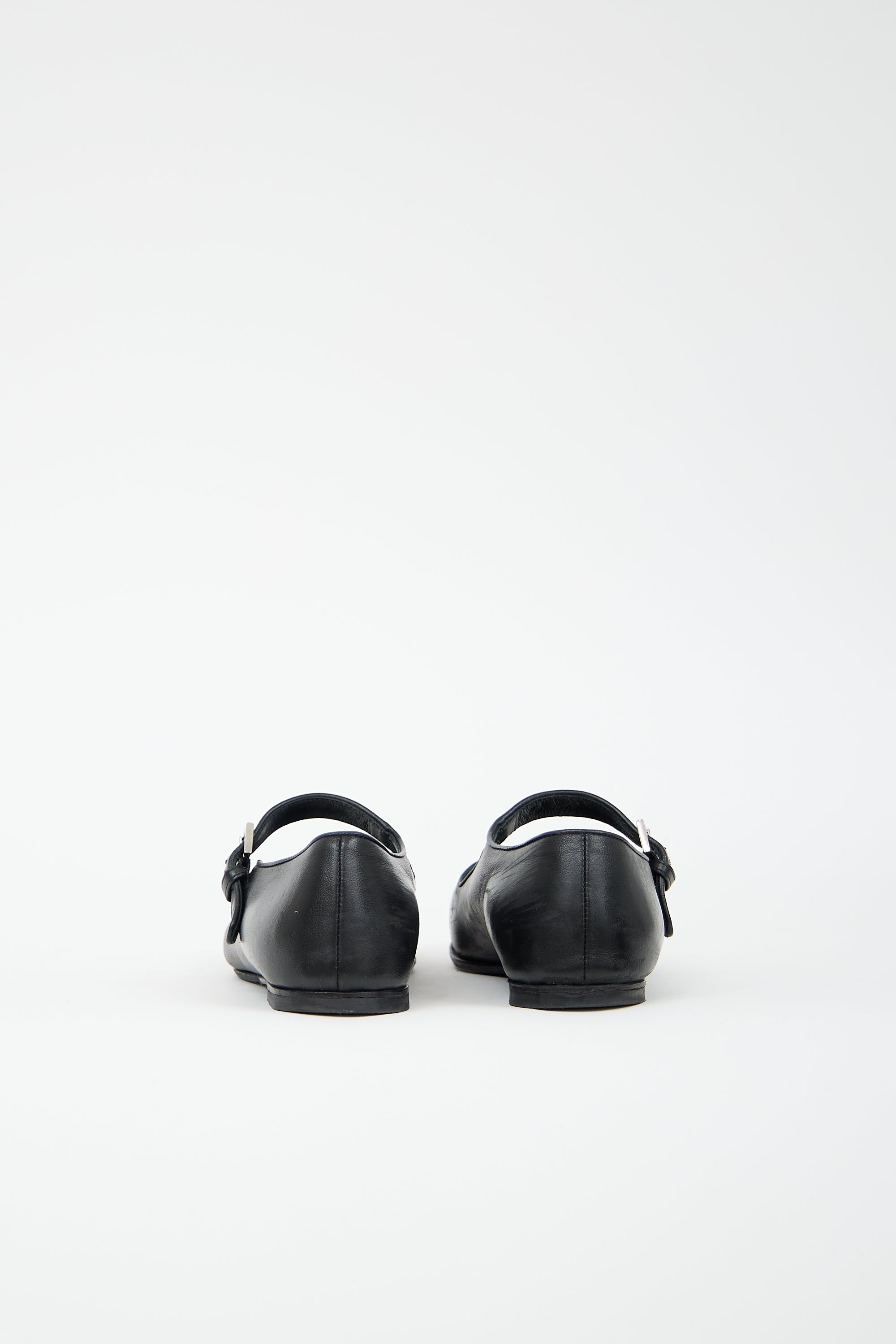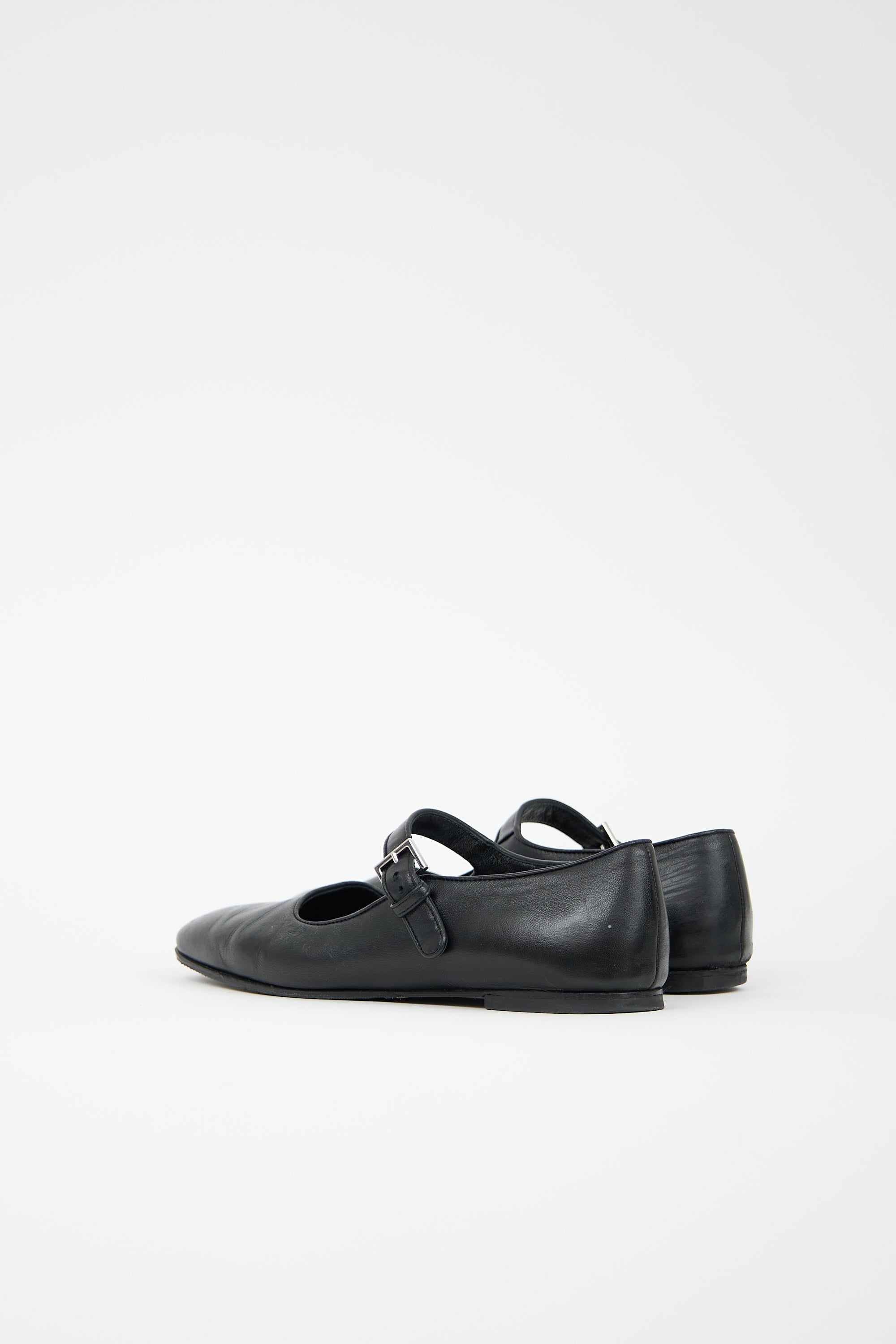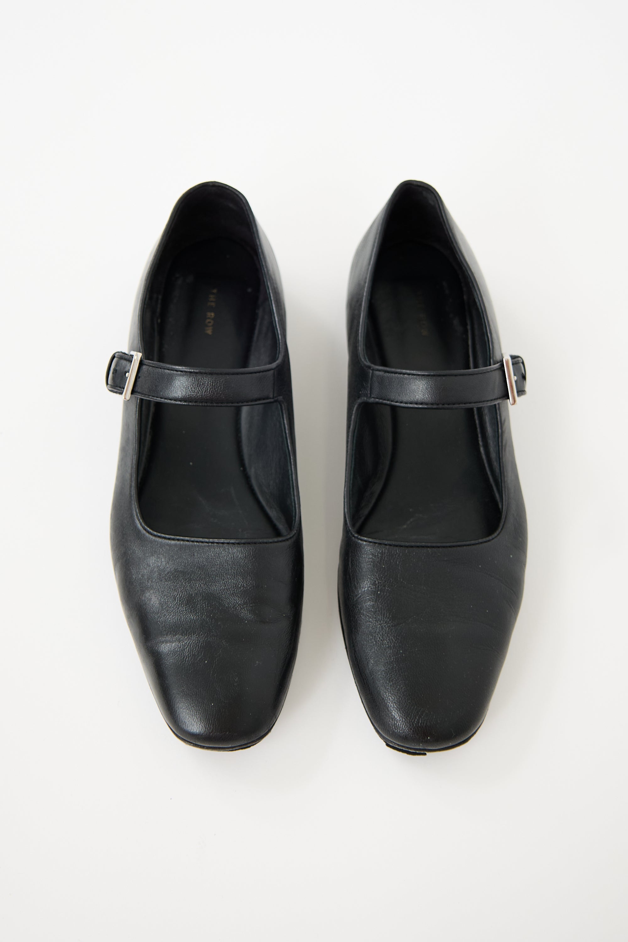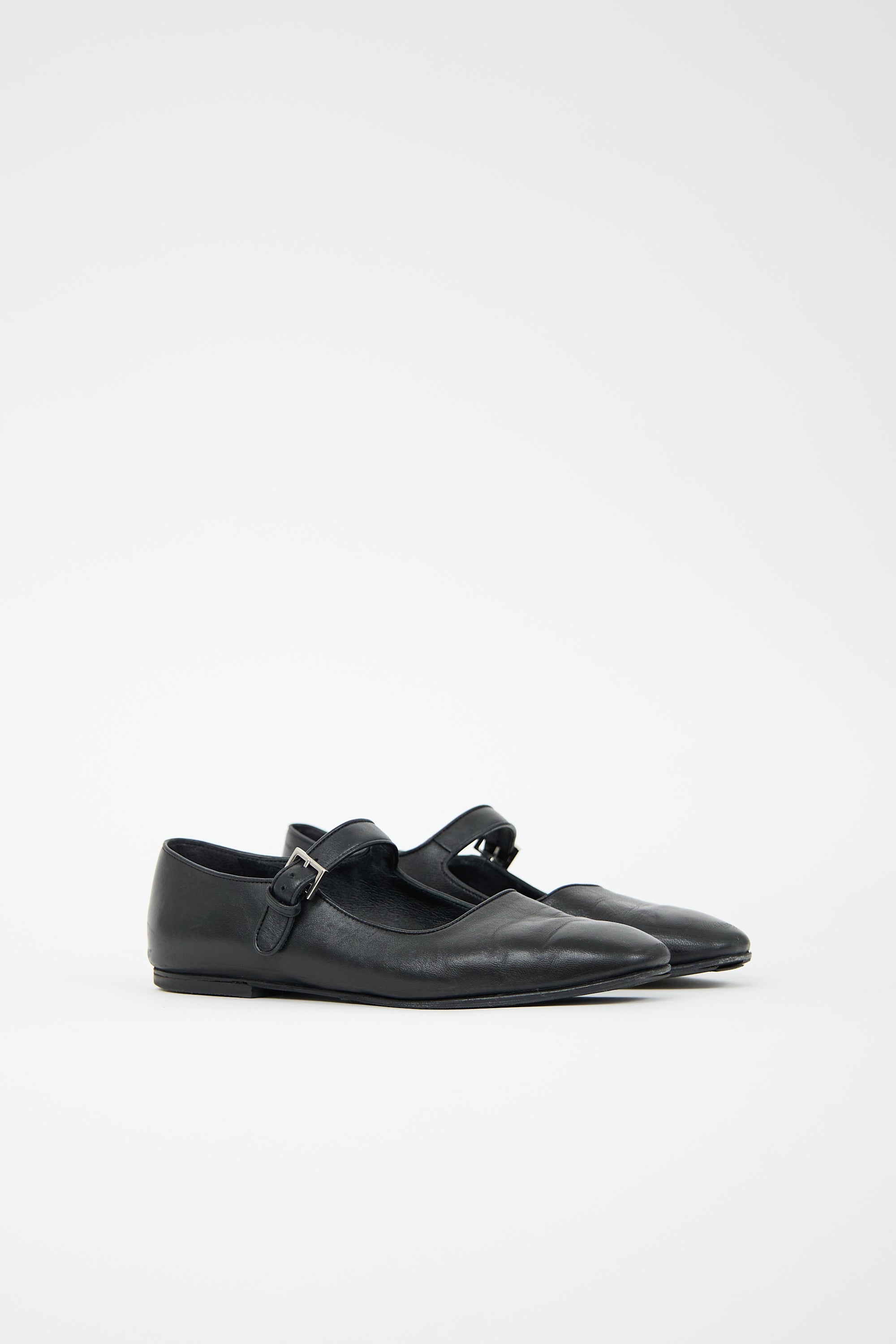 Pre-owned The Row black leather Ava Mary Jane flats featuring tapered square toe, square topline, and buckle strap across vamp.