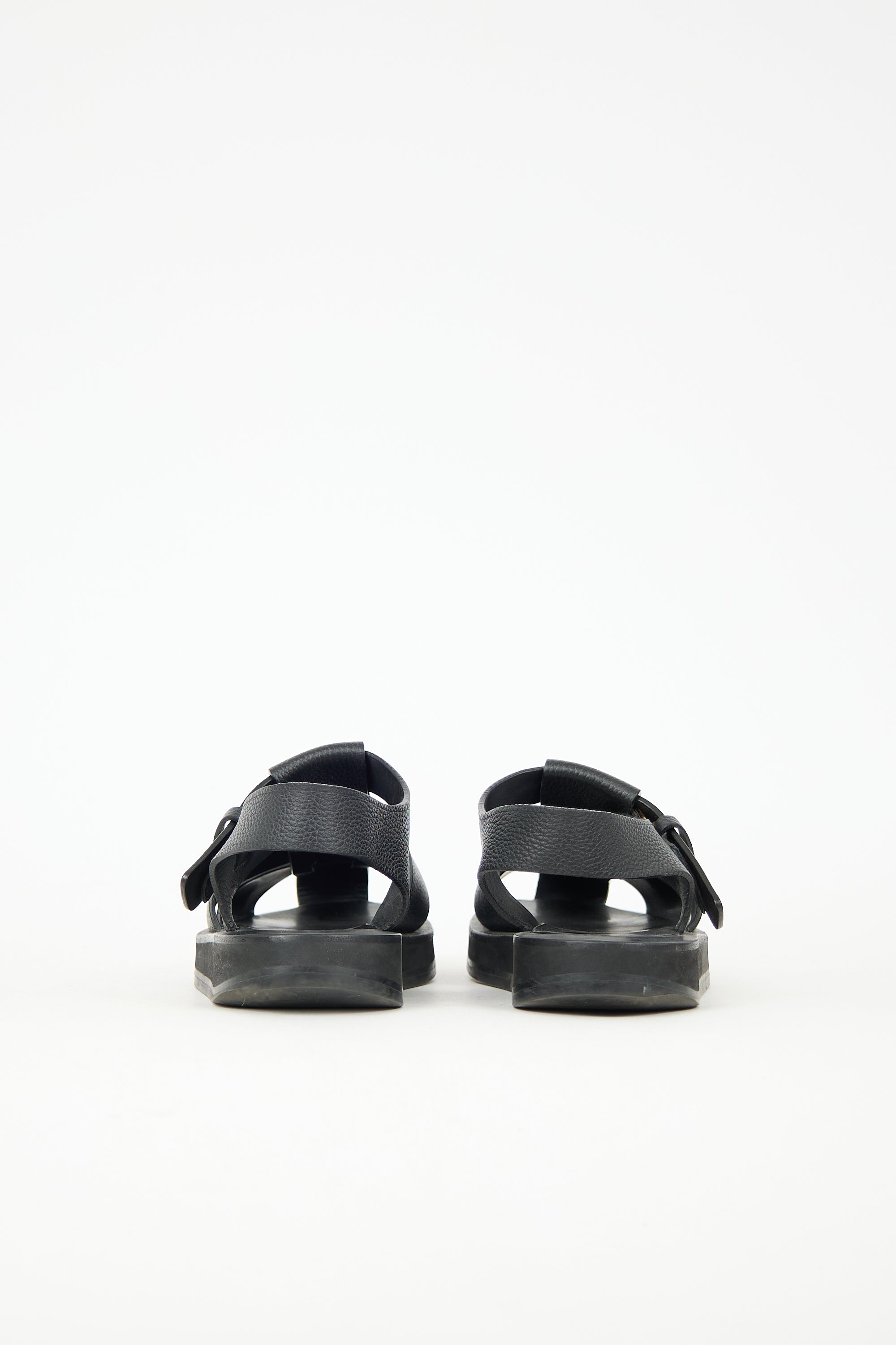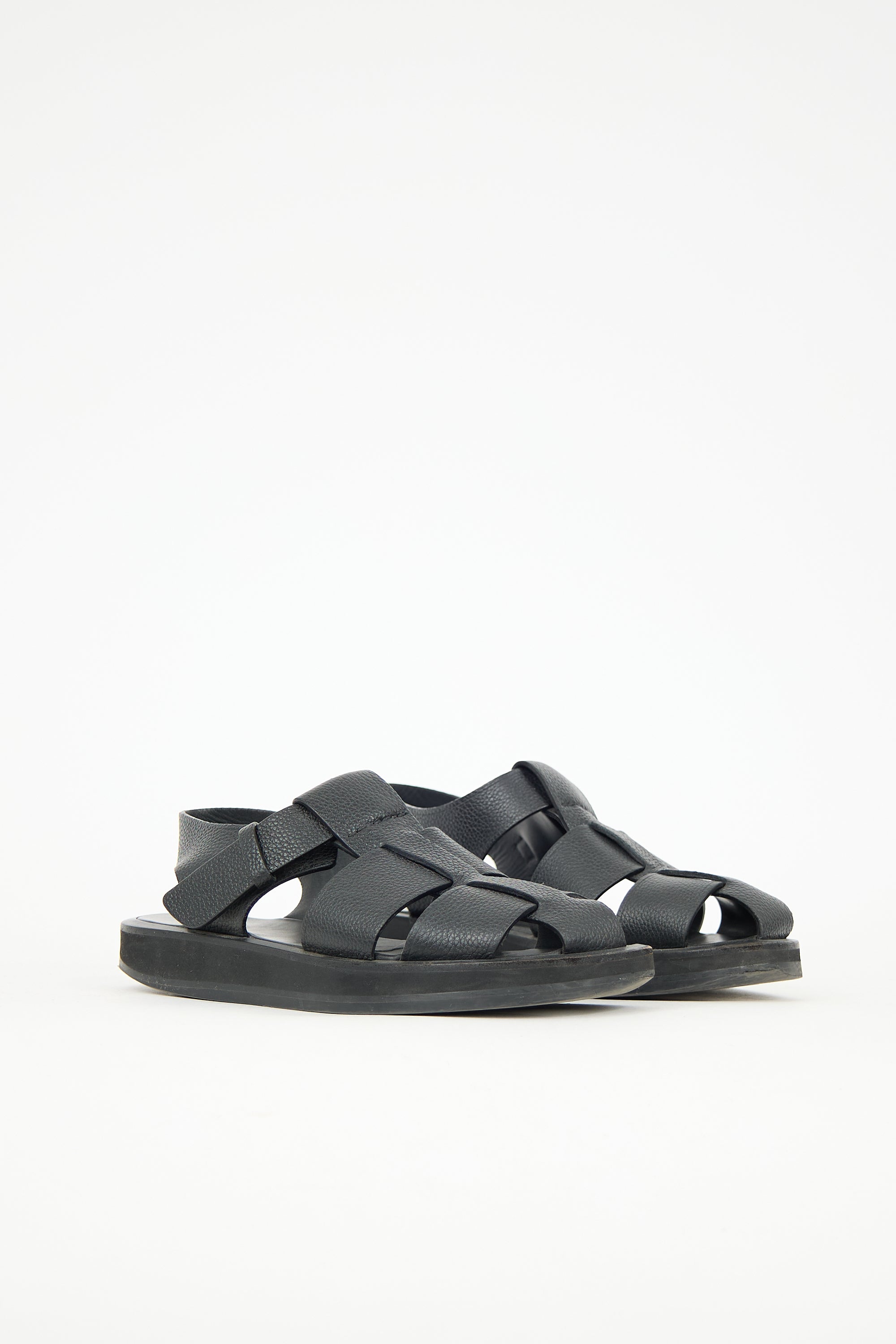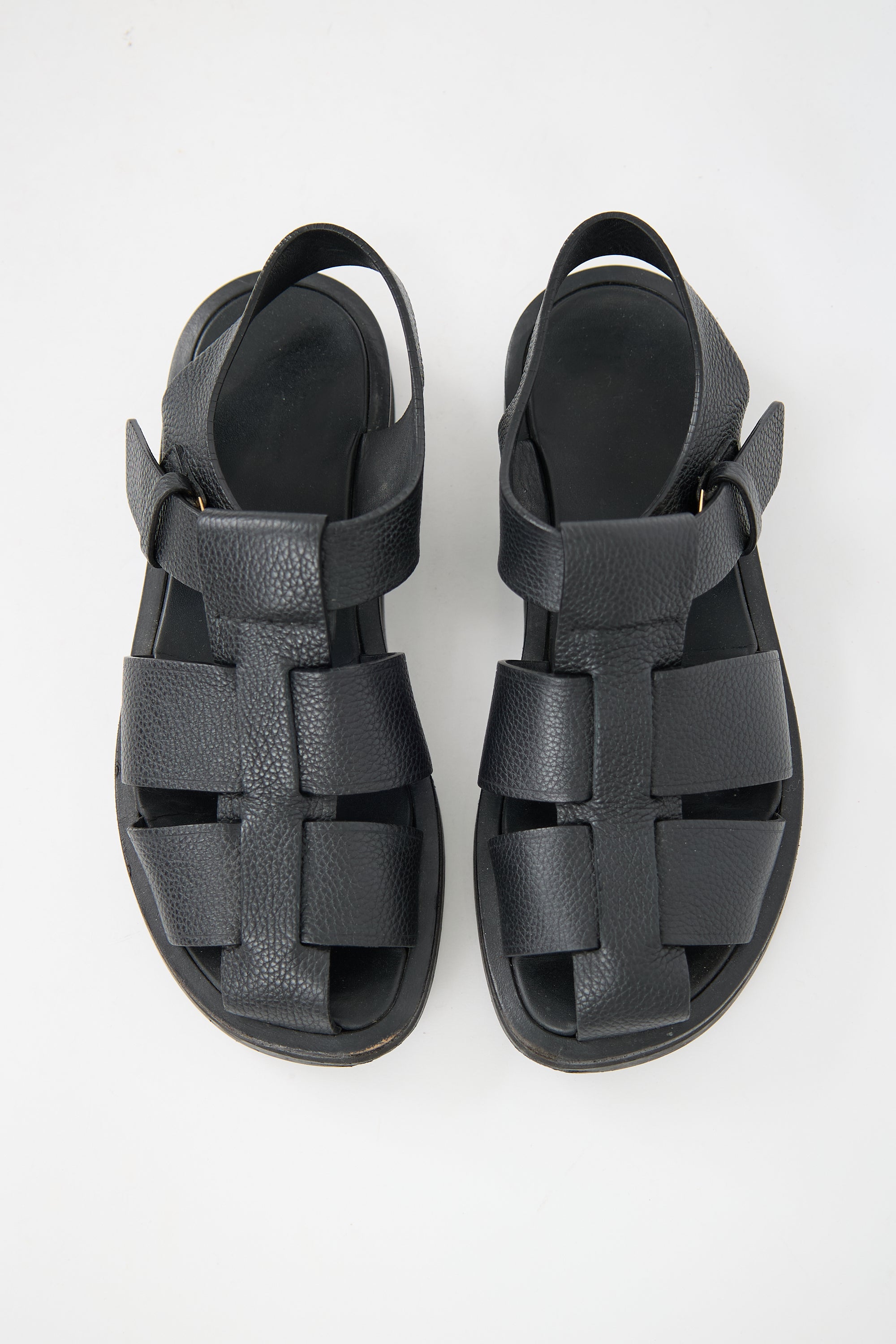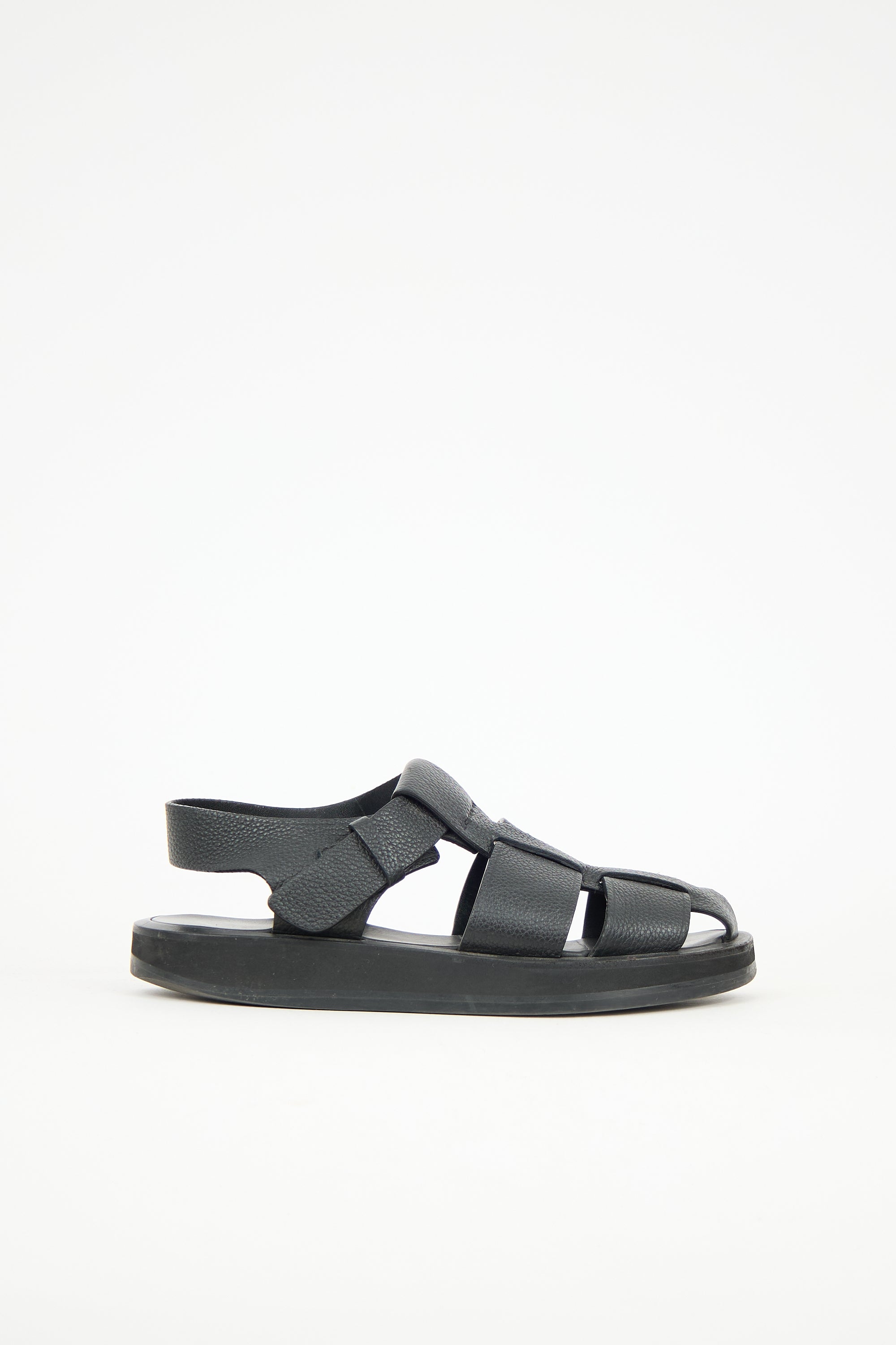 Pre-owned The Row black leather Fisherman sandals featuring rounded toe, woven straps across vamp, adjustable ankle strap with buckle fastening, and rubber platform outsole.