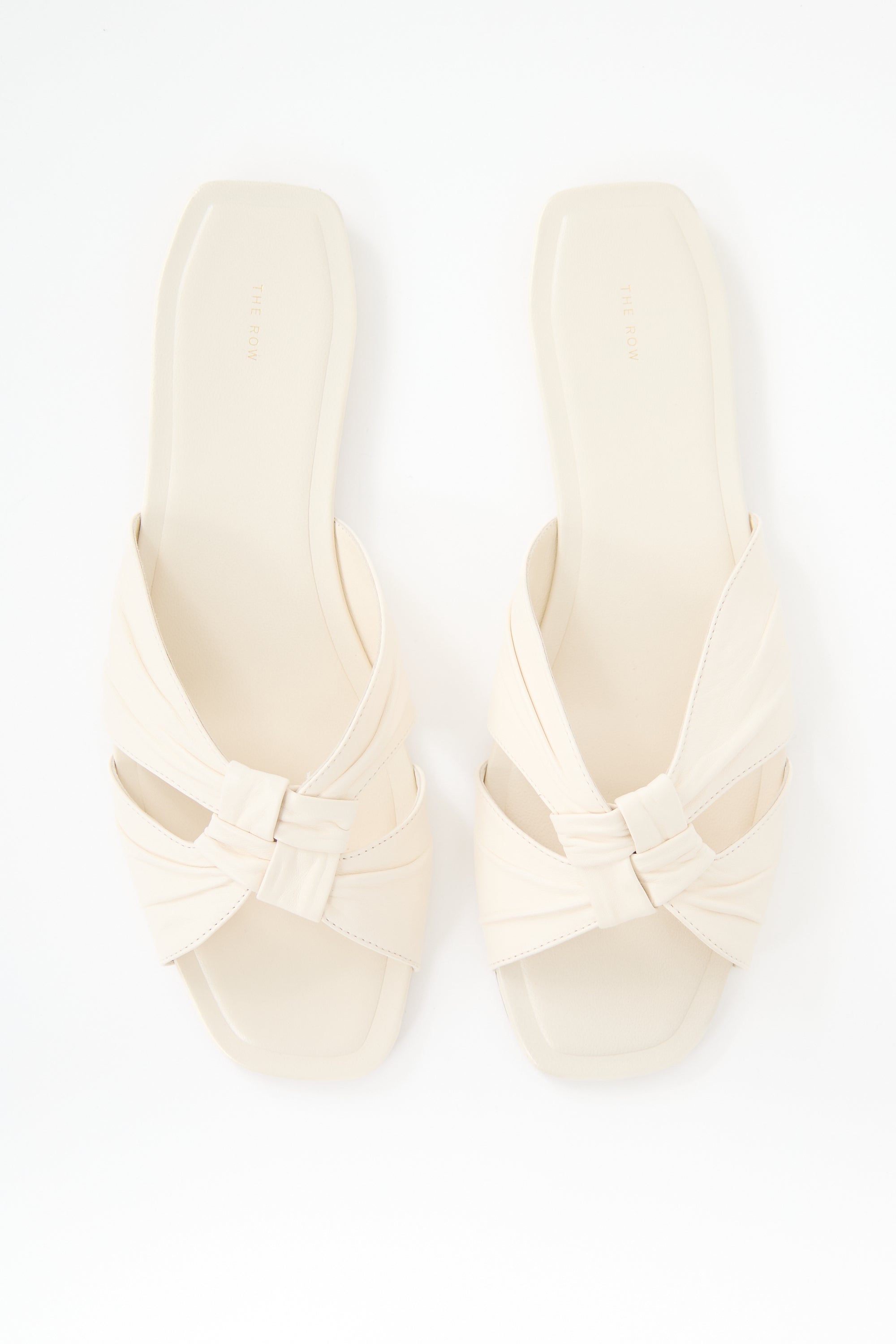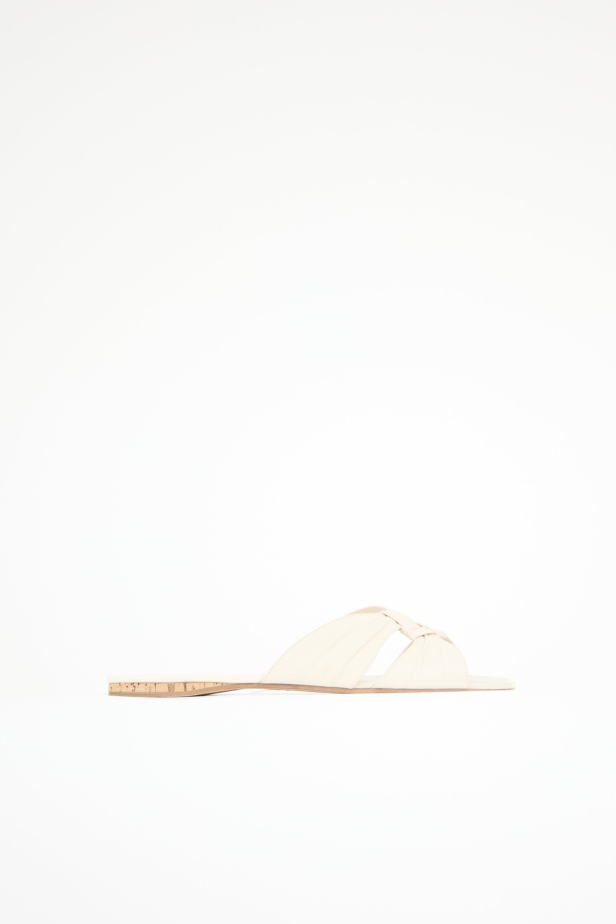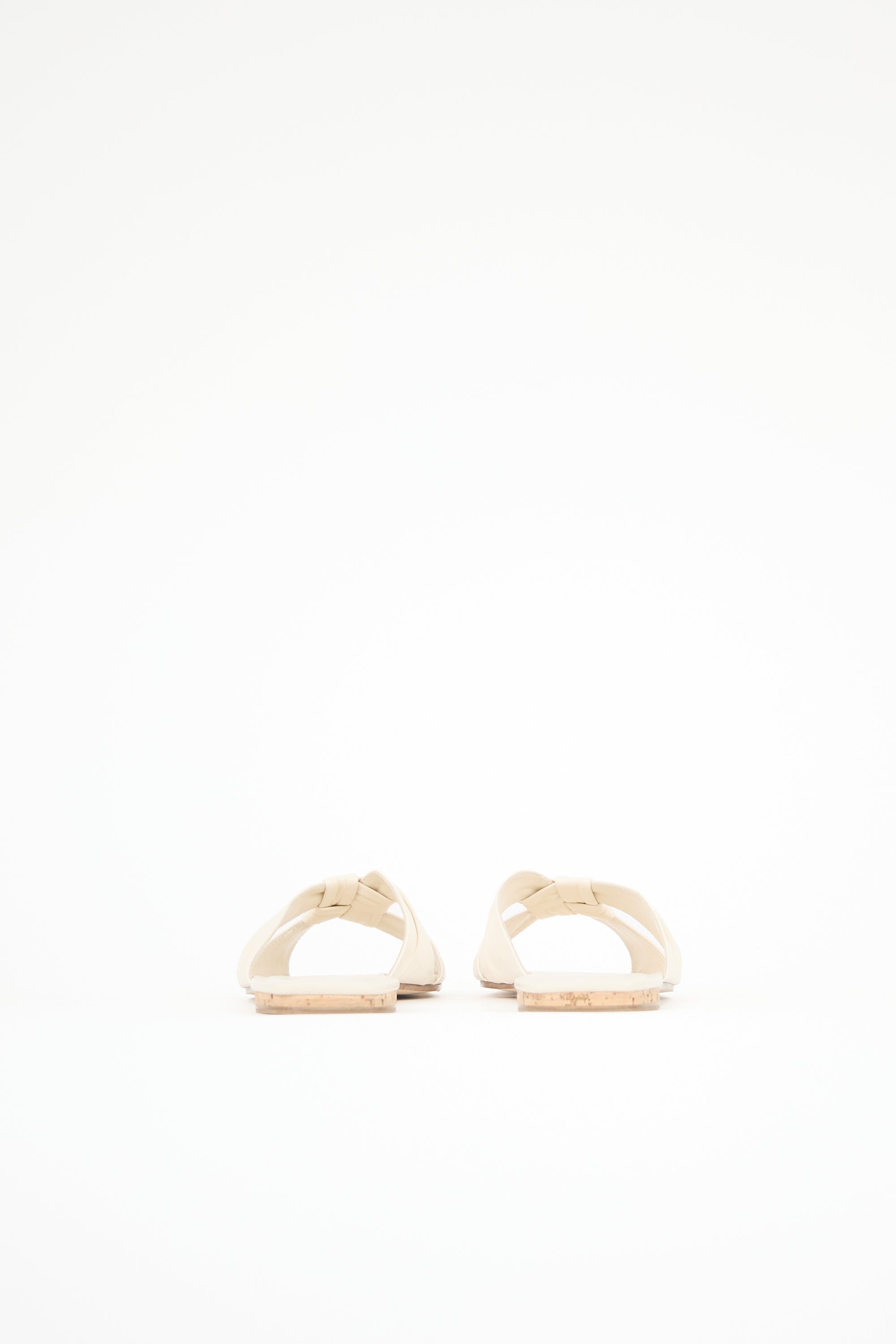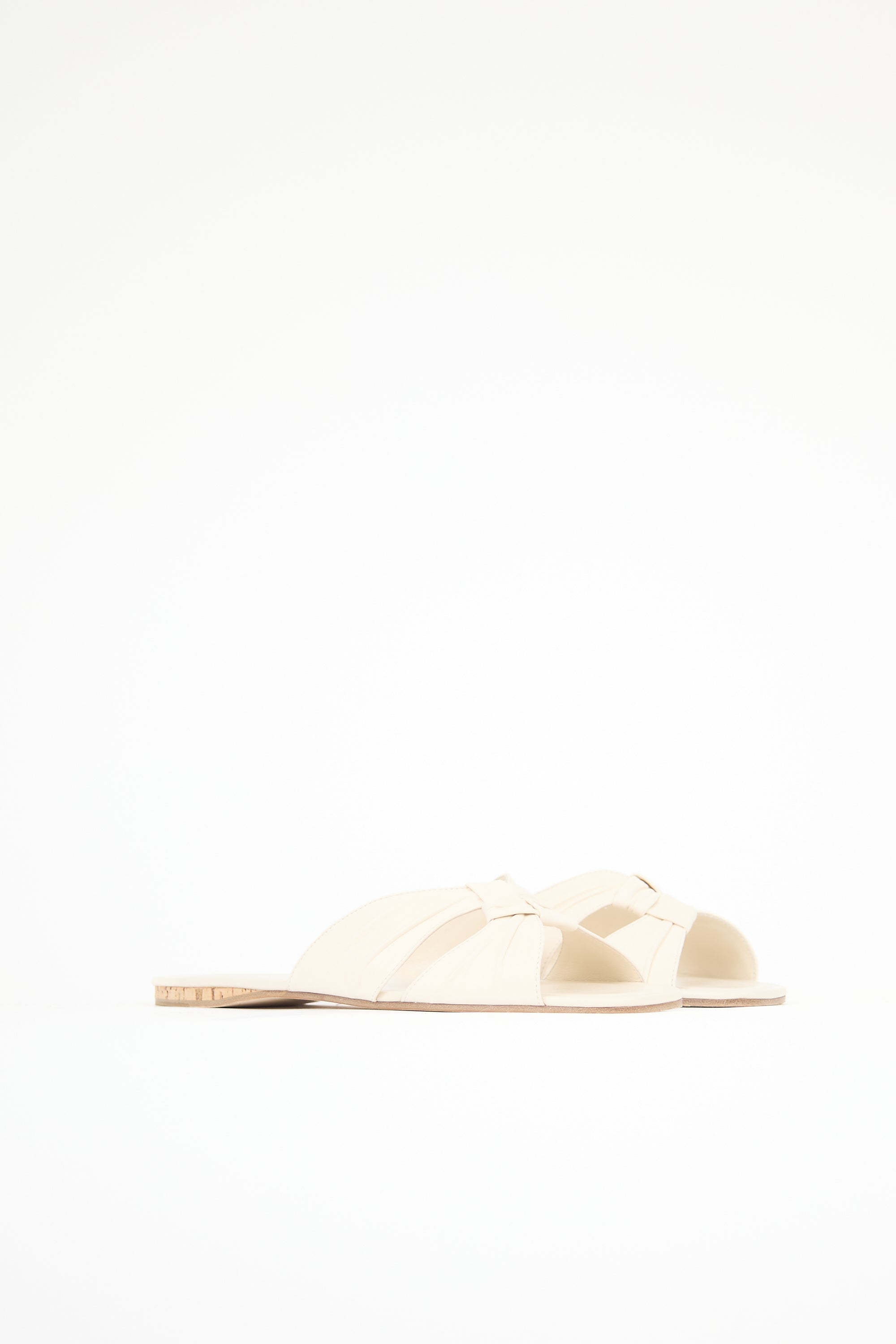 Pre-owned The Row cream leather Soft Knot sandals featuring square toe, woven knot detail at vamp, cork heel insert, and leather insole and outsole. Comes with original box and dust bag.