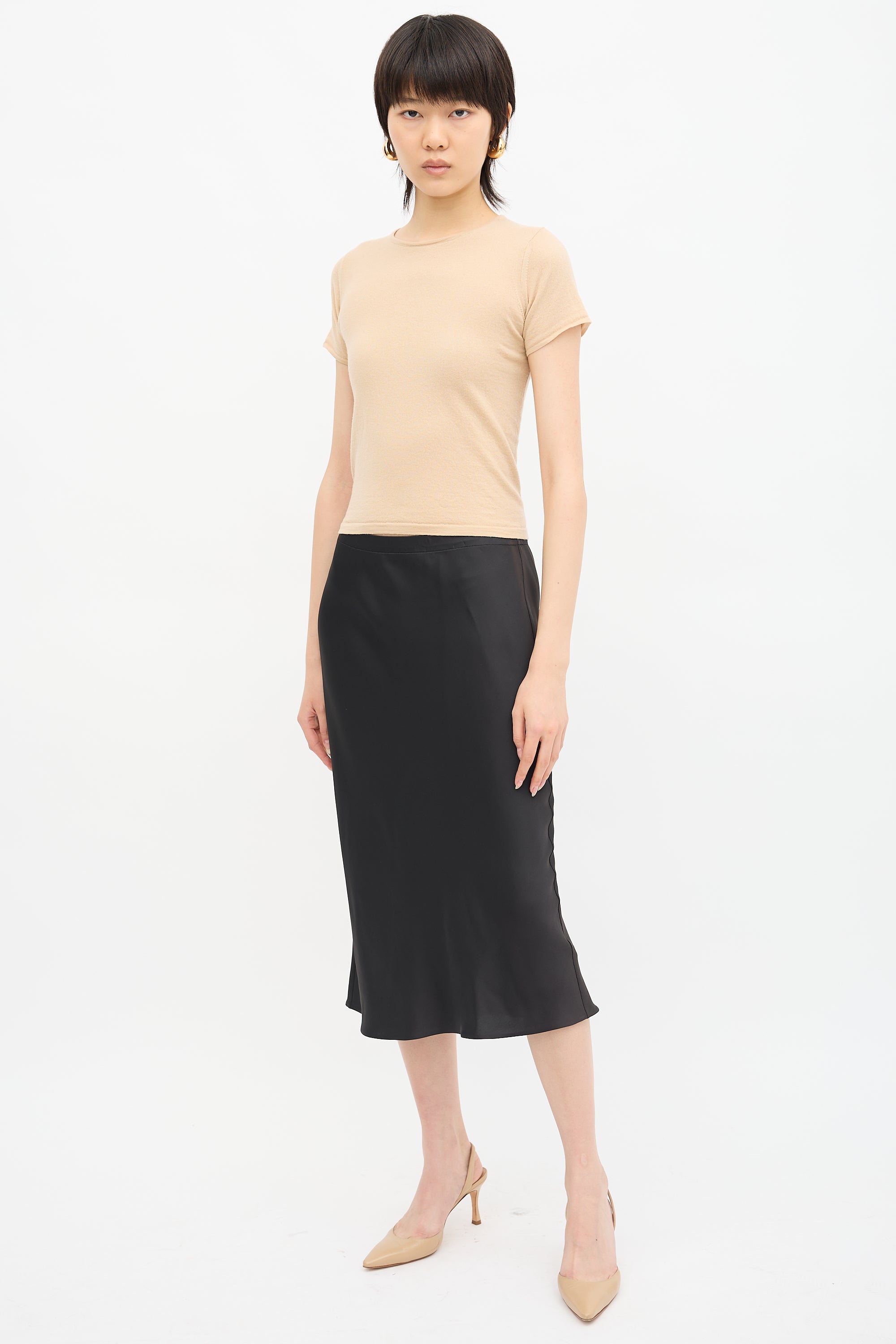 Pre-owned The Row black stretch satin Nosum skirt featuring an elasticized waistband and flounce hem.