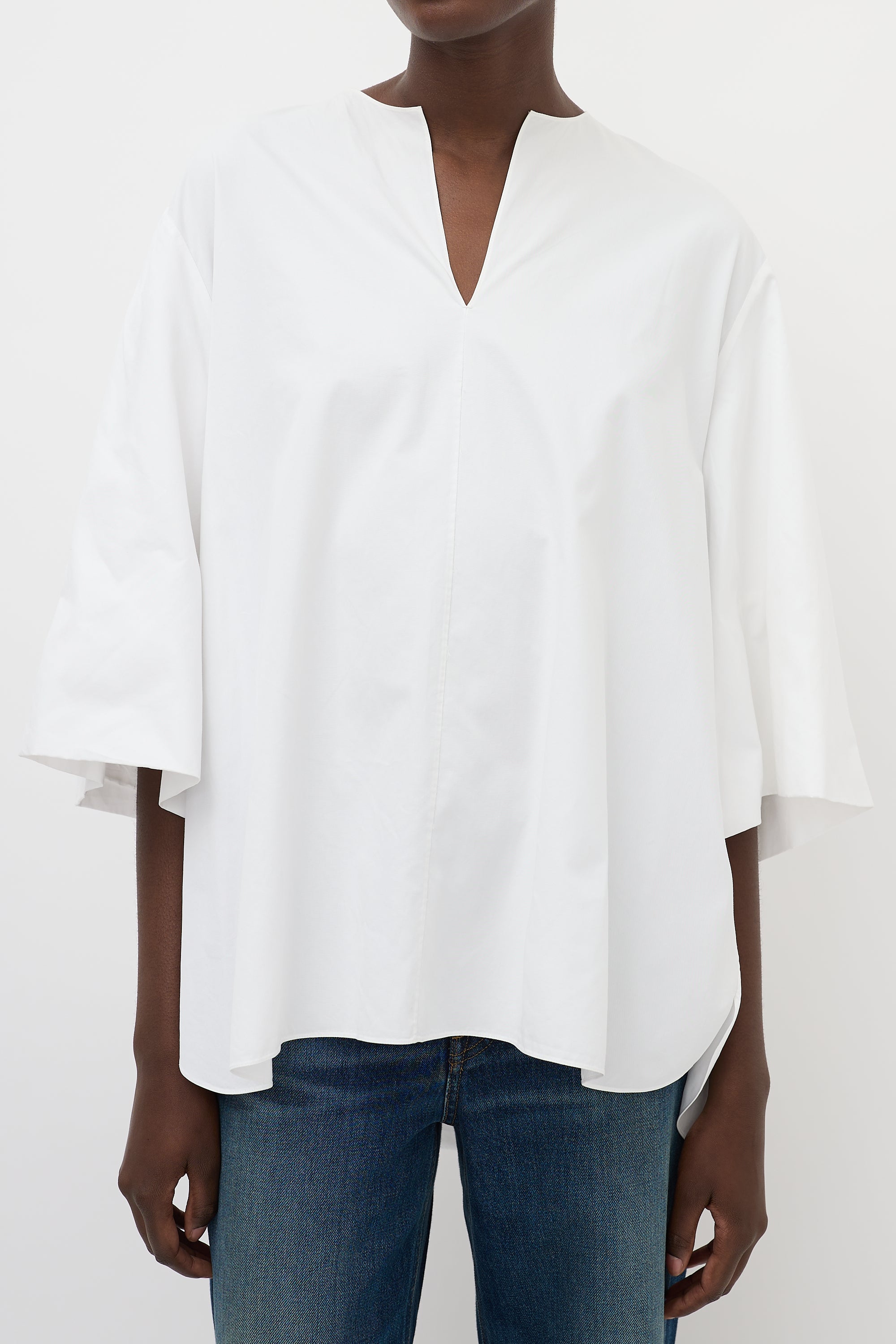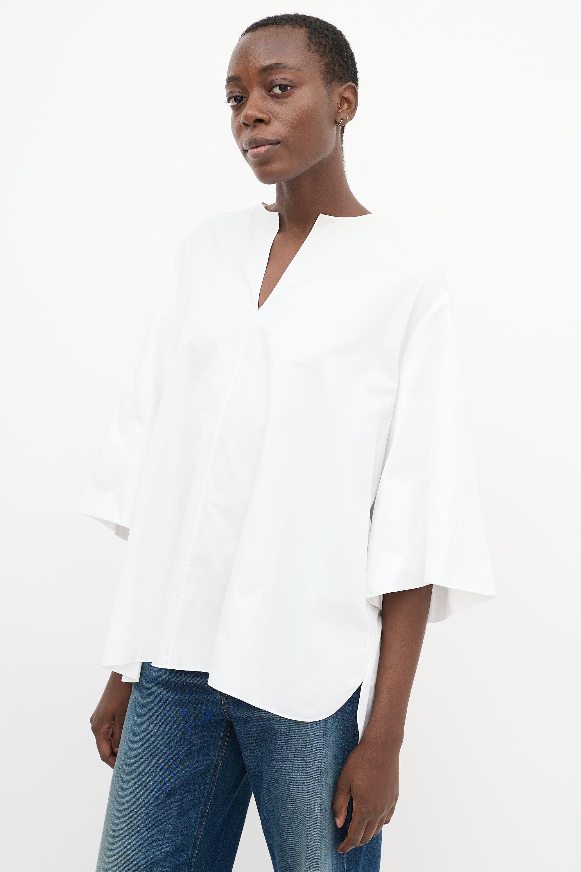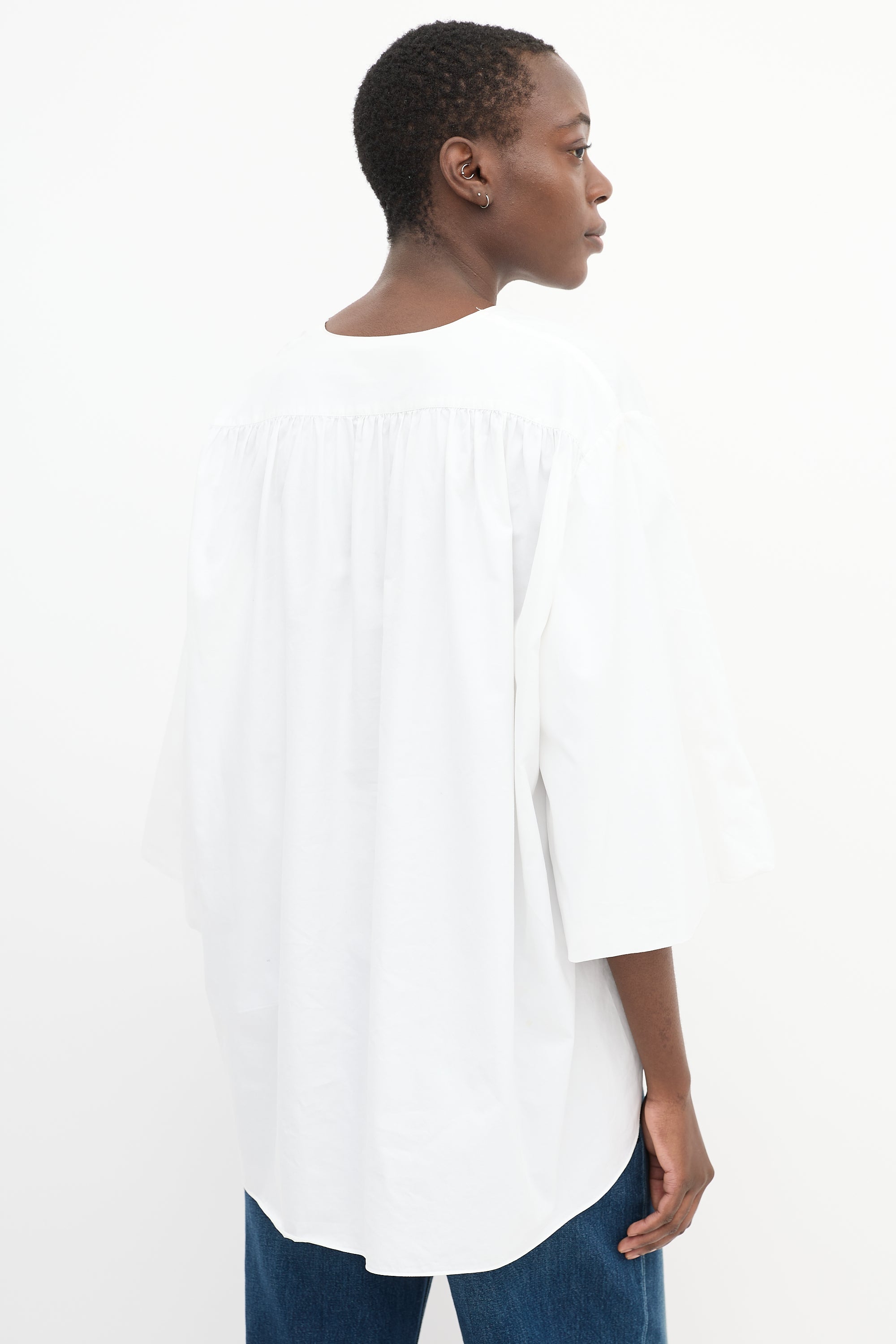Pre-owned The Row white cotton Charise oversized blouse featuring a V-neckline, gathered back yoke, high low hem, and wide three quarter length sleeves with gathering at interior cuff.