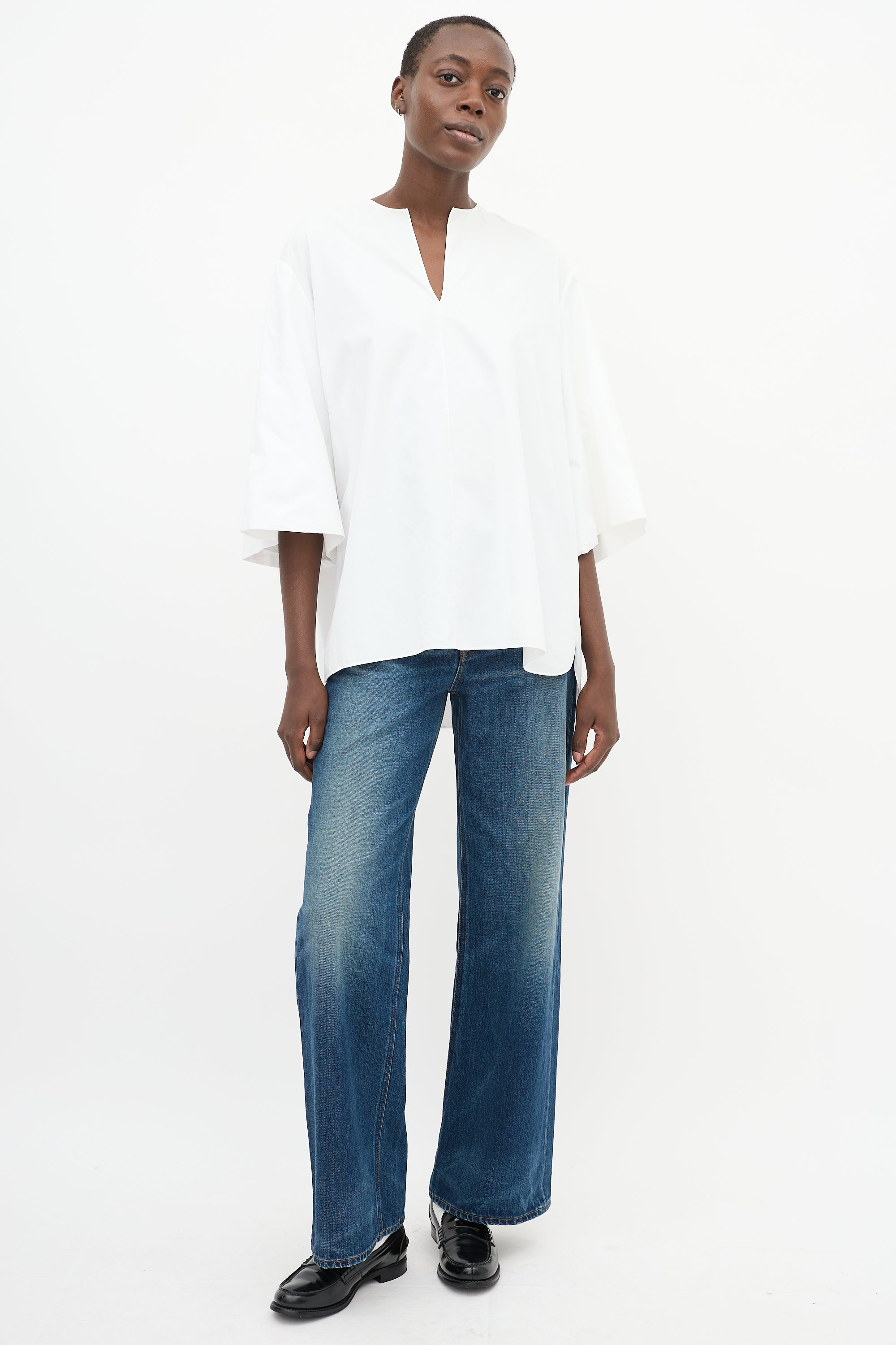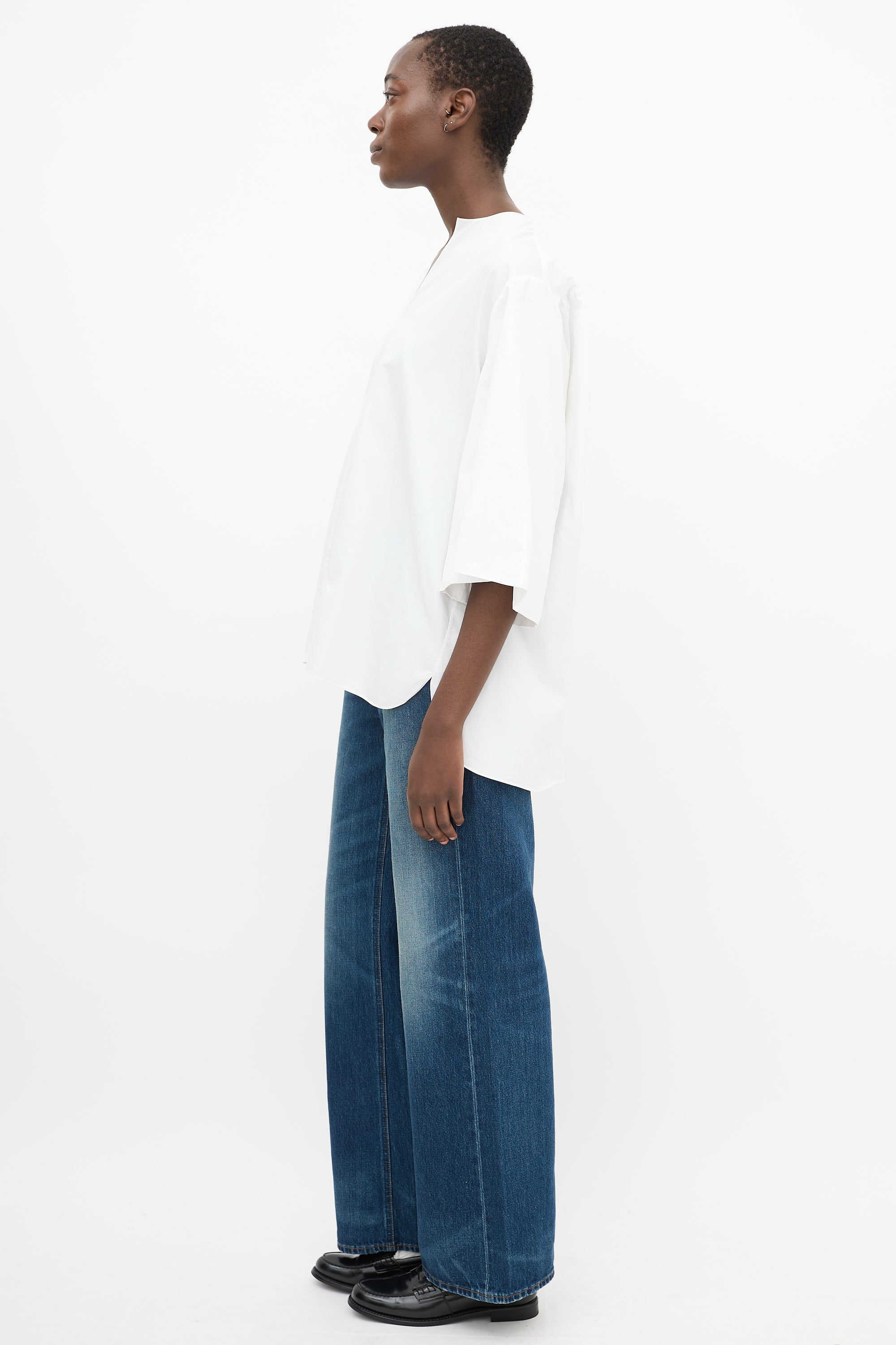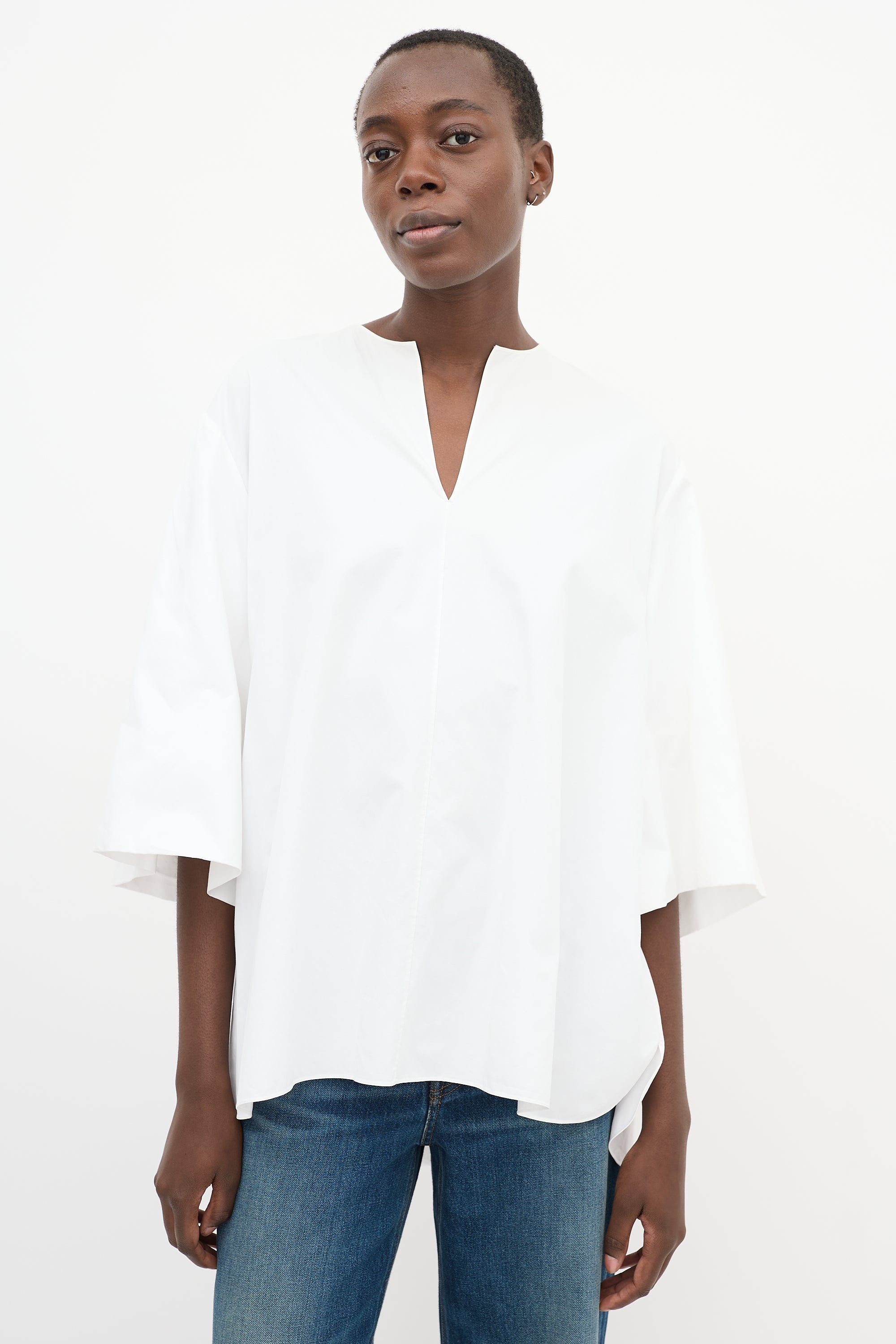Pre-owned The Row white cotton Charise oversized blouse featuring a V-neckline, gathered back yoke, high low hem, and wide three quarter length sleeves with gathering at interior cuff.