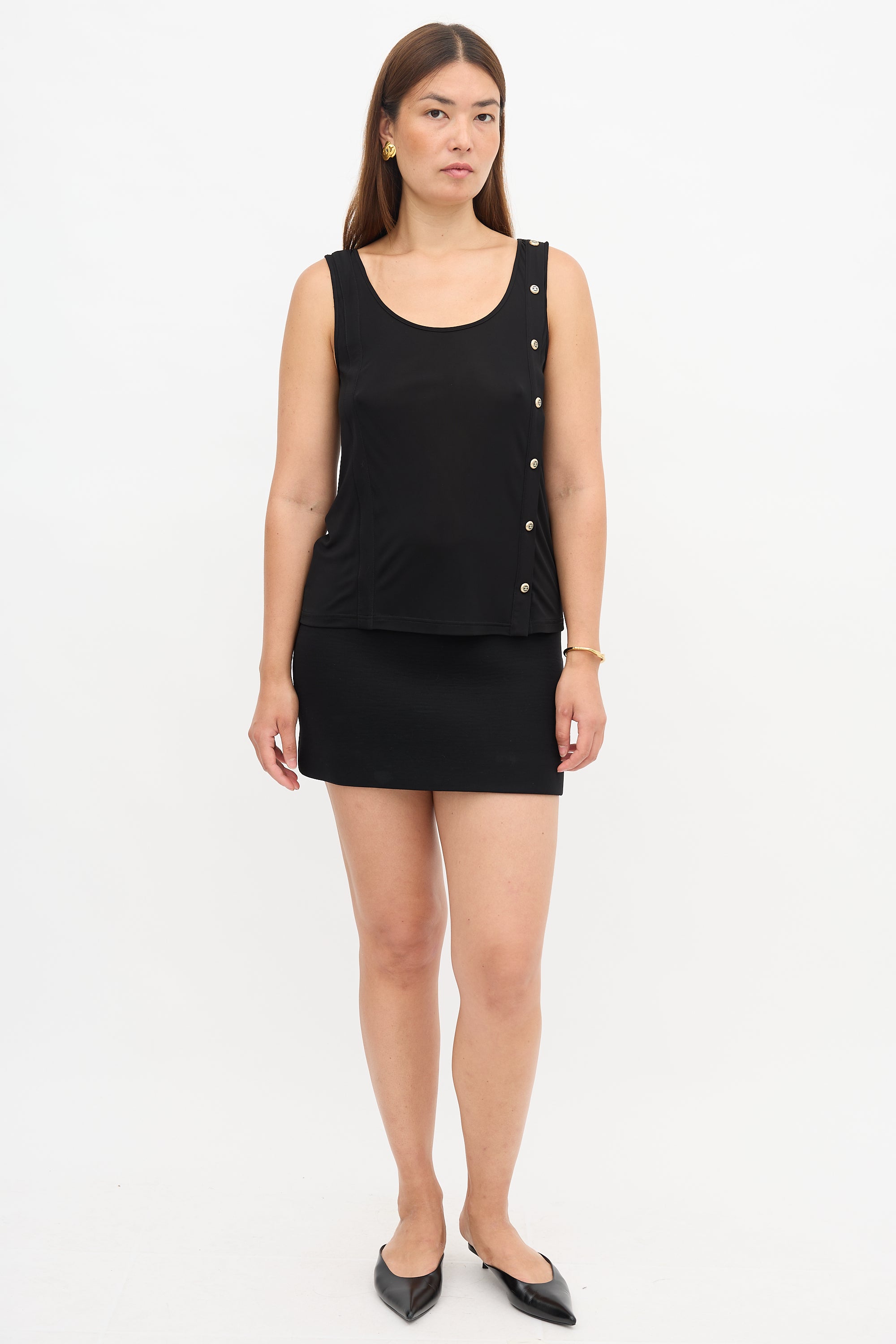 Pre-owned Chanel black knit tank top featuring scoop neckline and silver tone CC crest button details.