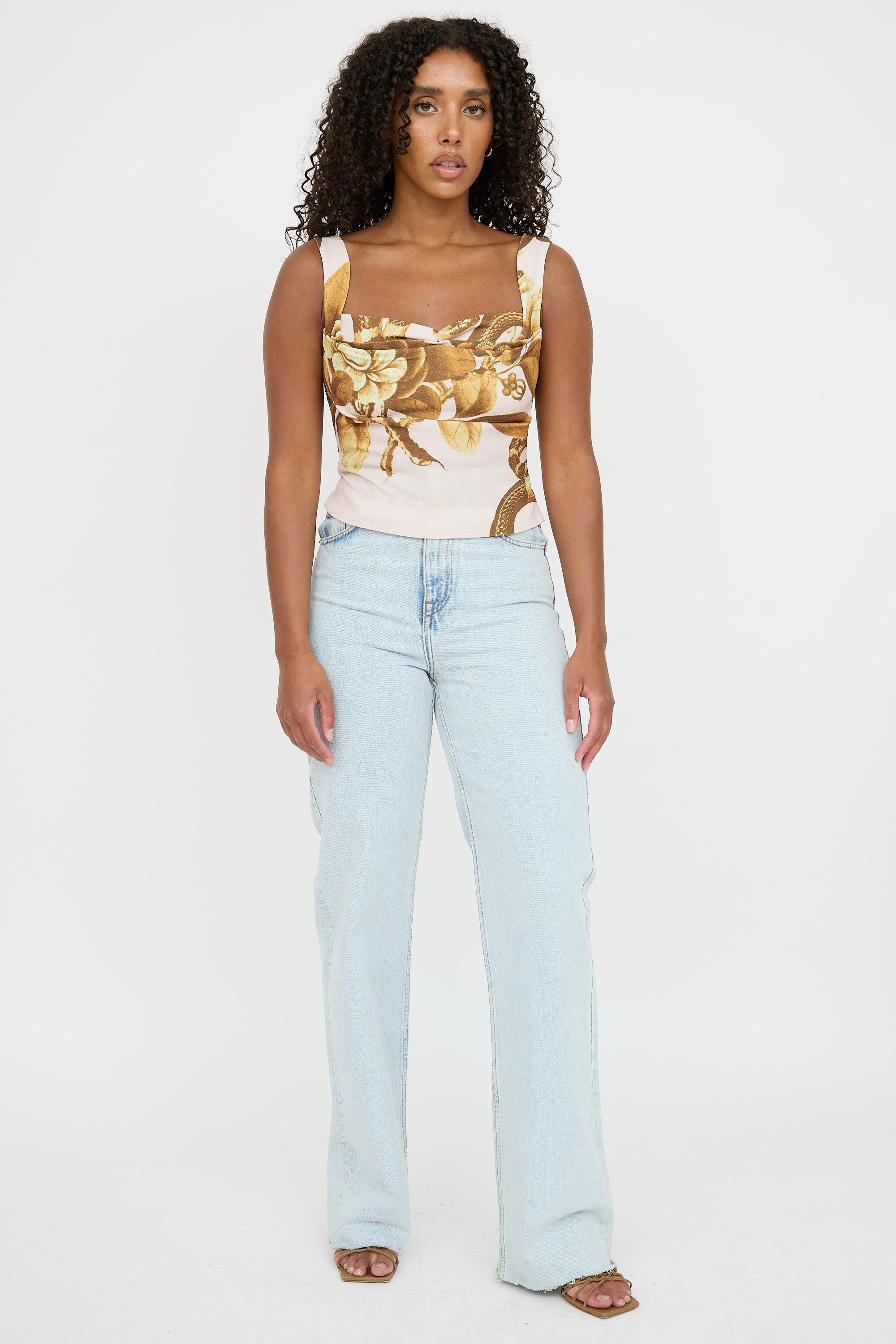 Pre-owned Miaou yellow and cream Imogene sleeveless corset top featuring floral print, square draped neckline and zip at back.