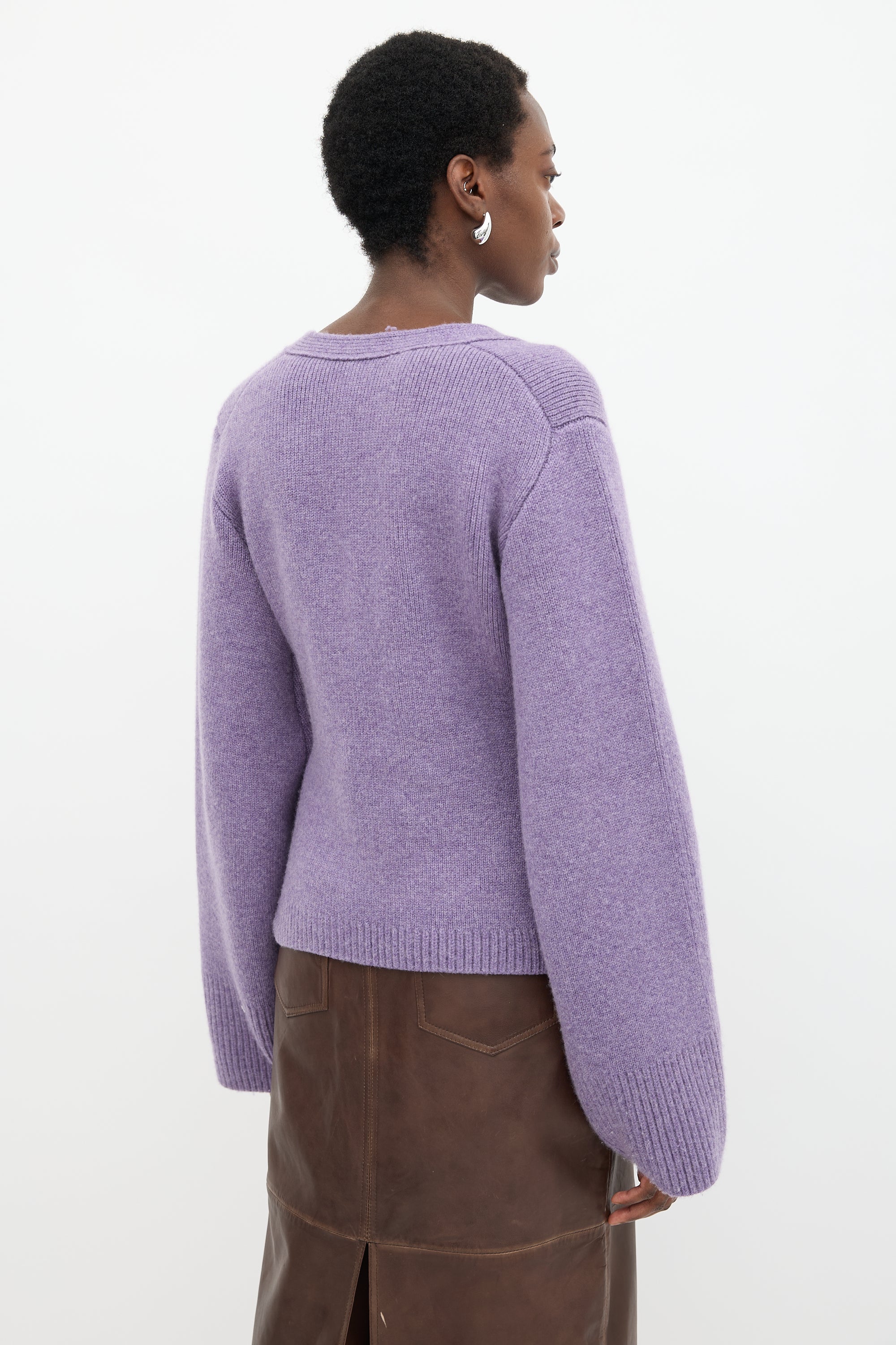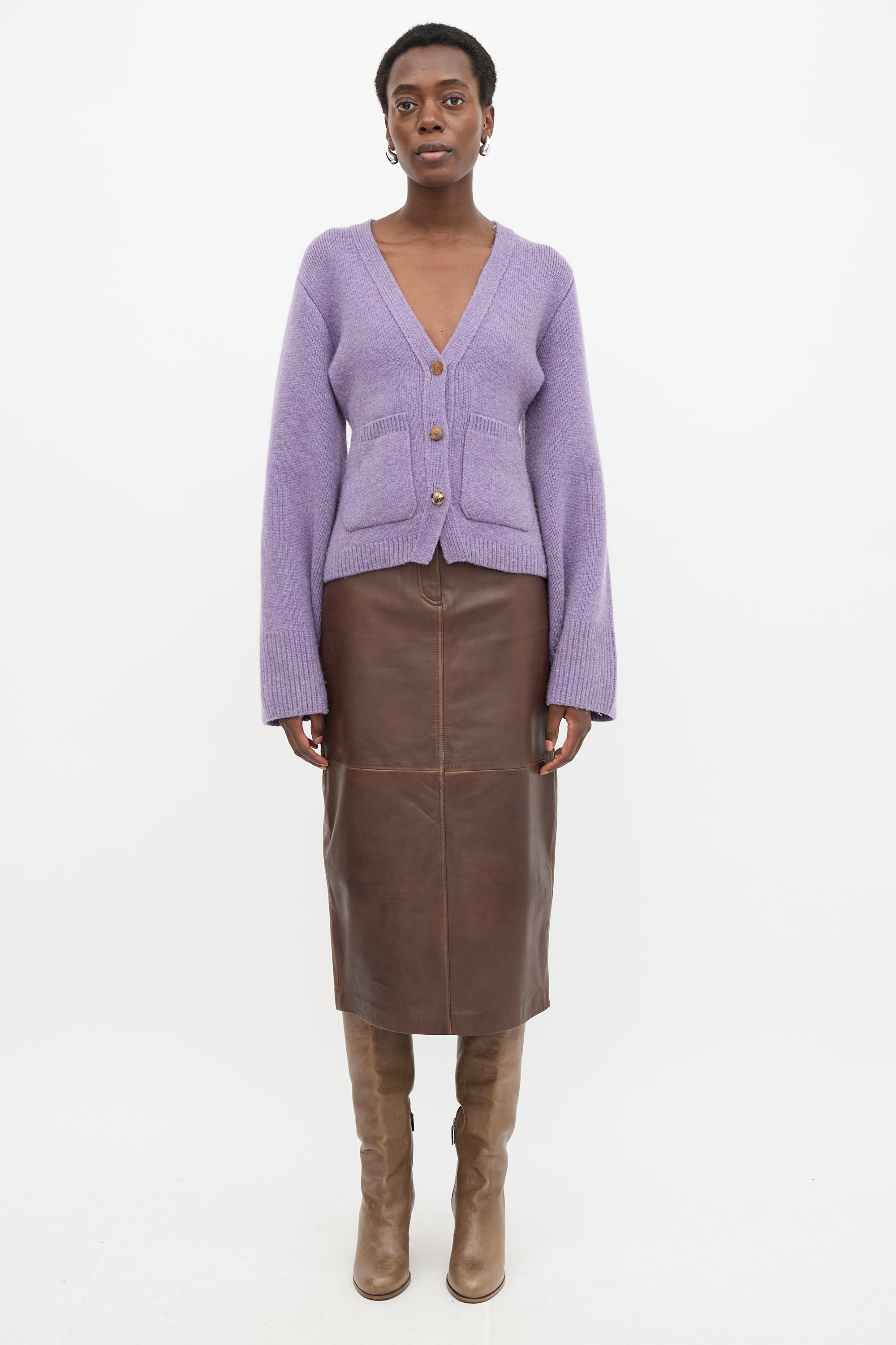 Pre-owned Khaite purple cashmere Scarlet cardigan featuring V-neckline, button front, patch pockets, and lantern sleeves.
