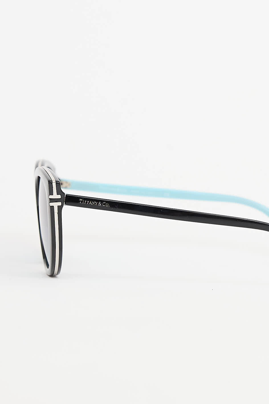 Pre-owned Tiffany & Co black and blue TF 4152 sunglasses featuring black gradient lens, angular square frames, and silver tone logo at temple.