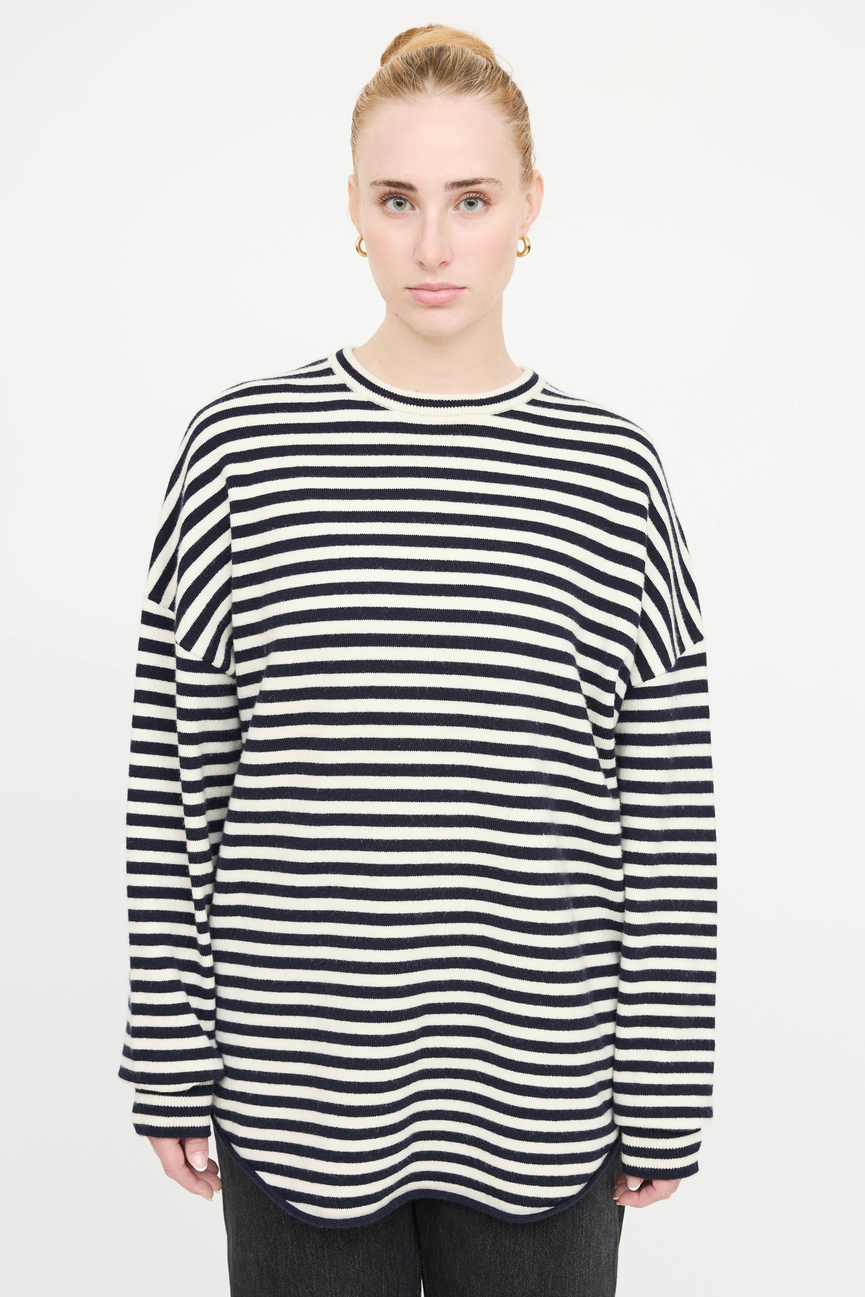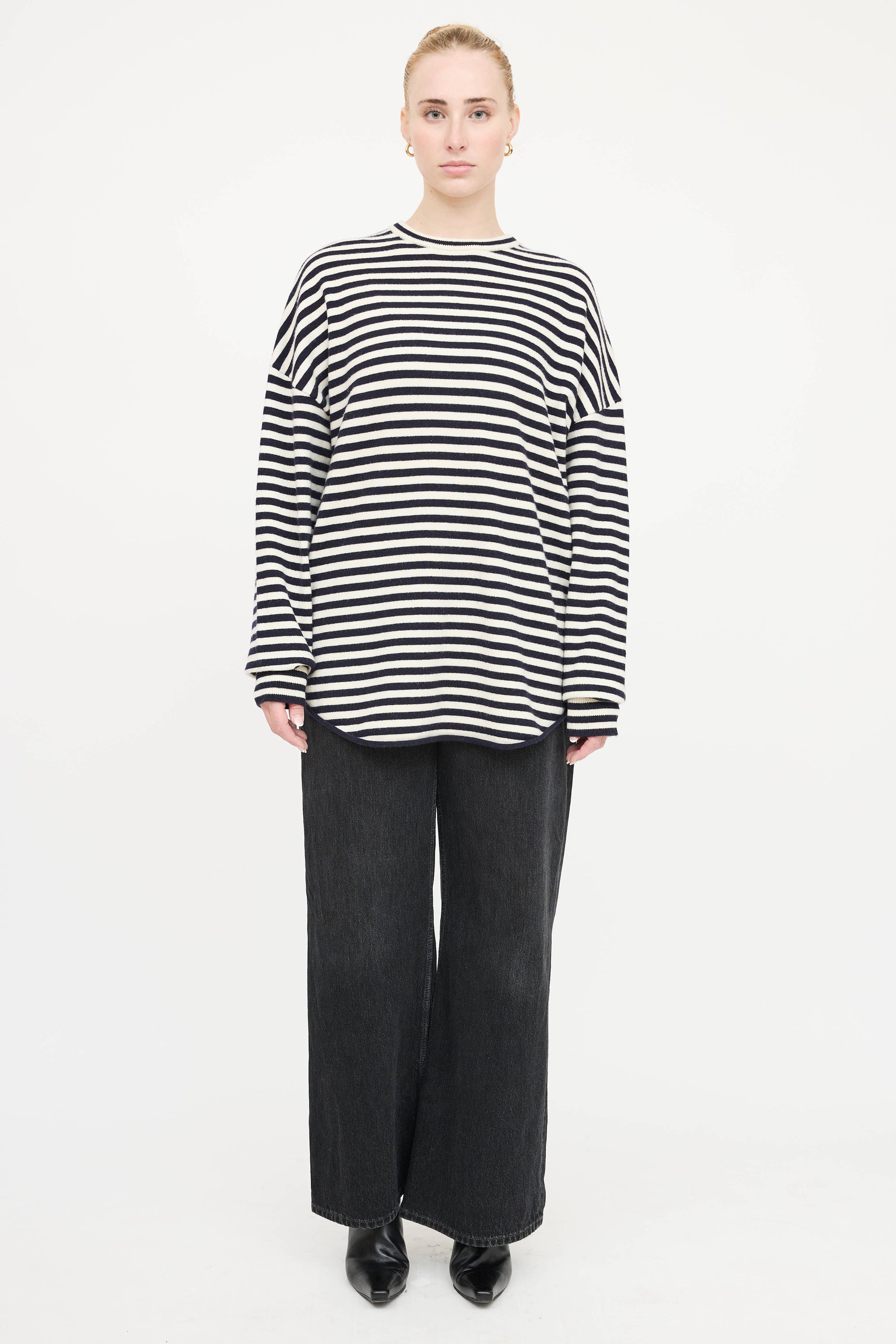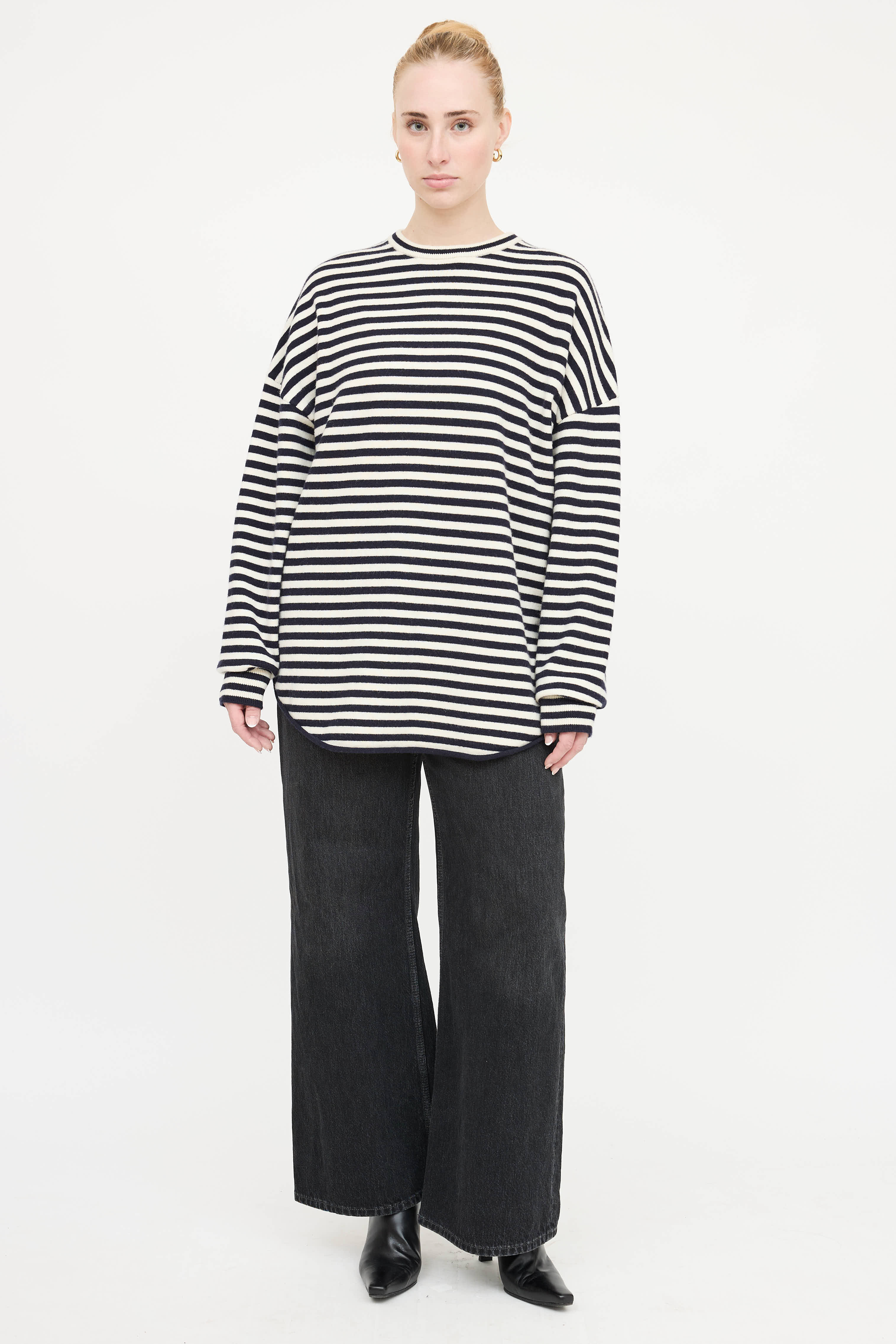 Pre-owned Extreme Cashmere black and white long sleeve sweater featuring round neckline, ribbed trims, and rounded hem.