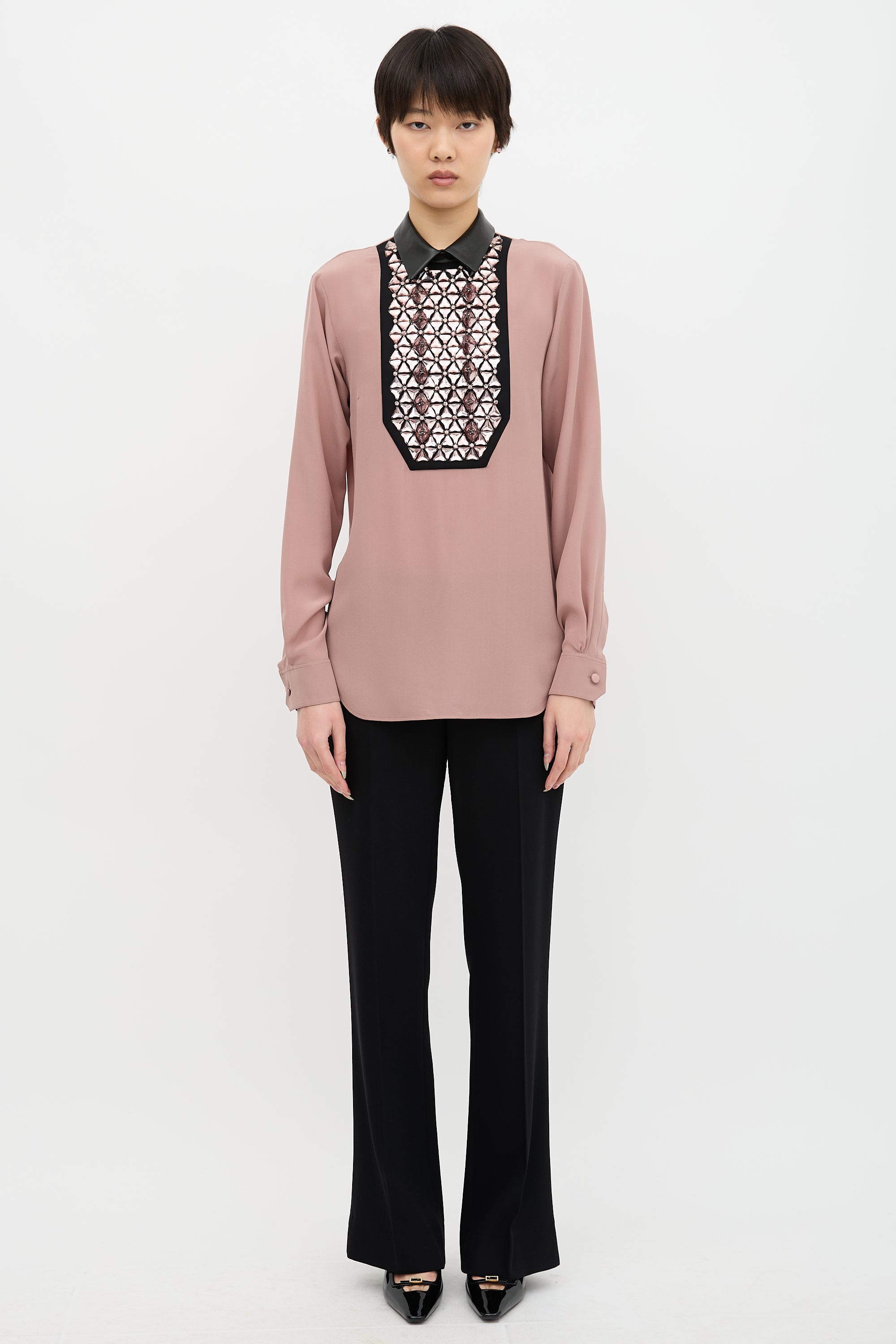 Pre-owned Gucci pink top featuring a black leather spread collar, pink embellished front panel, and button back.