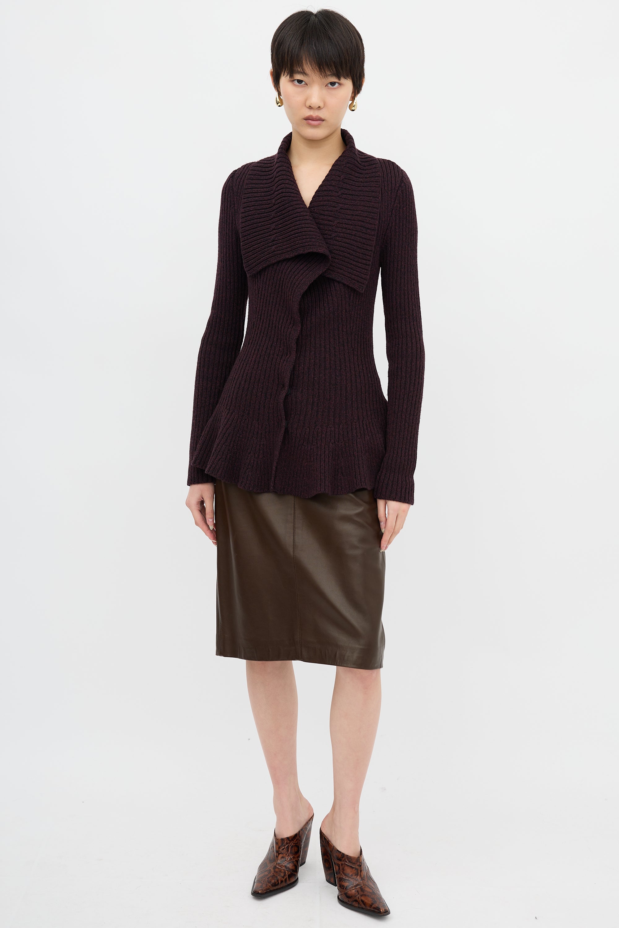 Pre-owned Alexander McQueen purple speckled cardigan featuring wide collar, snap button up front closure, and godet hem.