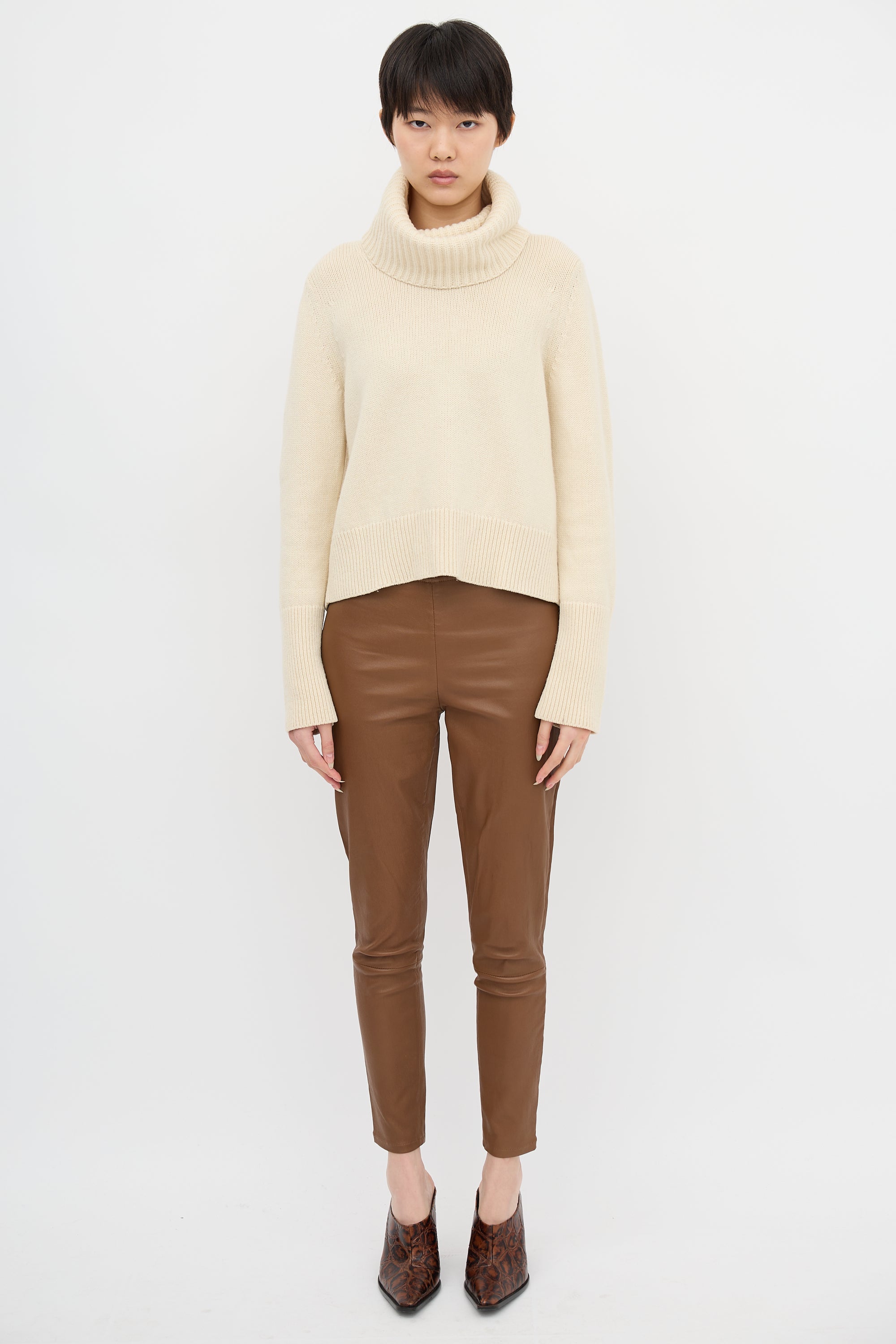 Pre-owned Alexander McQueen cream wool blend sweater featuring turtleneck, split back, and ribbed collar, hem, and cuffs.