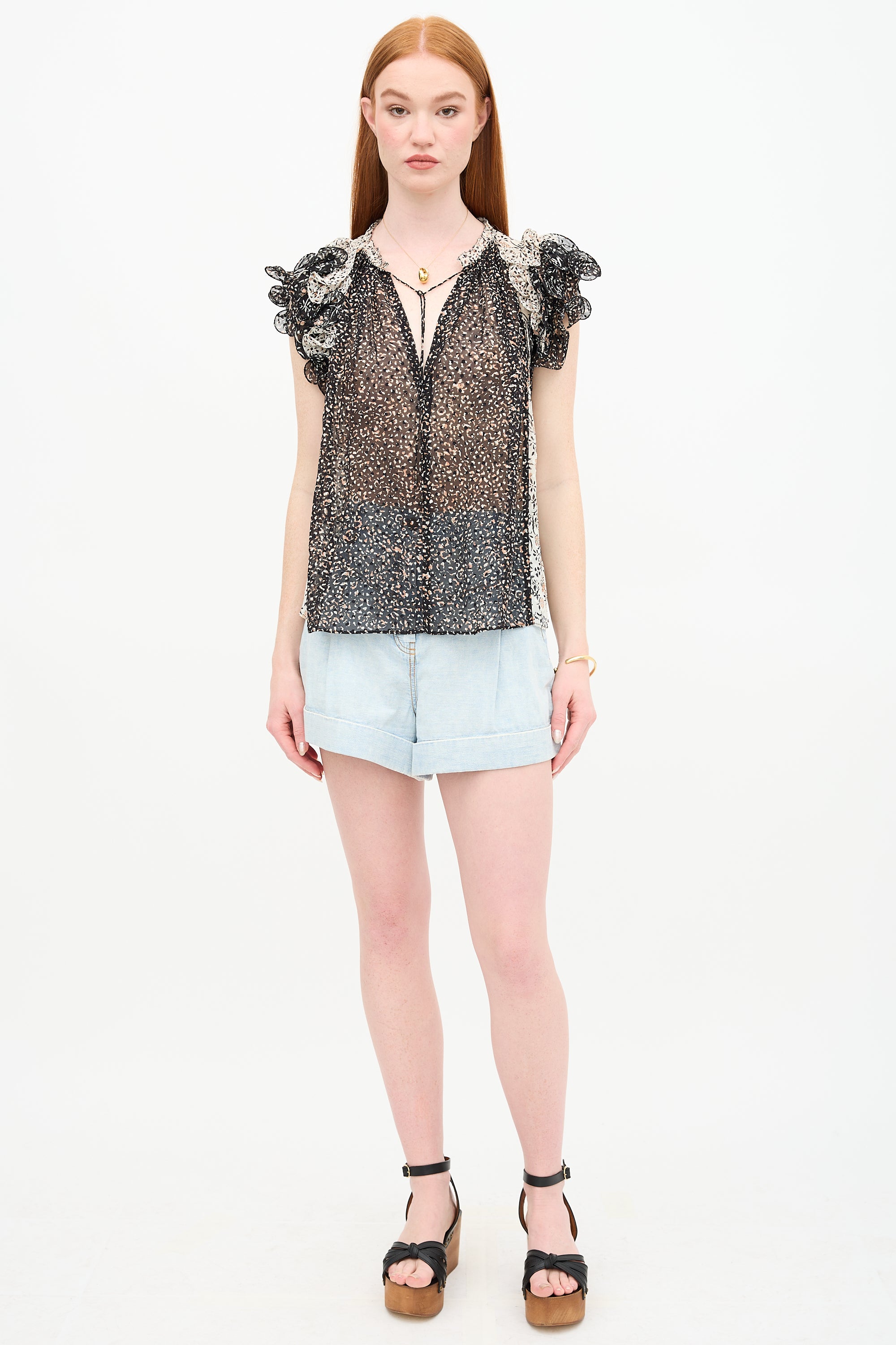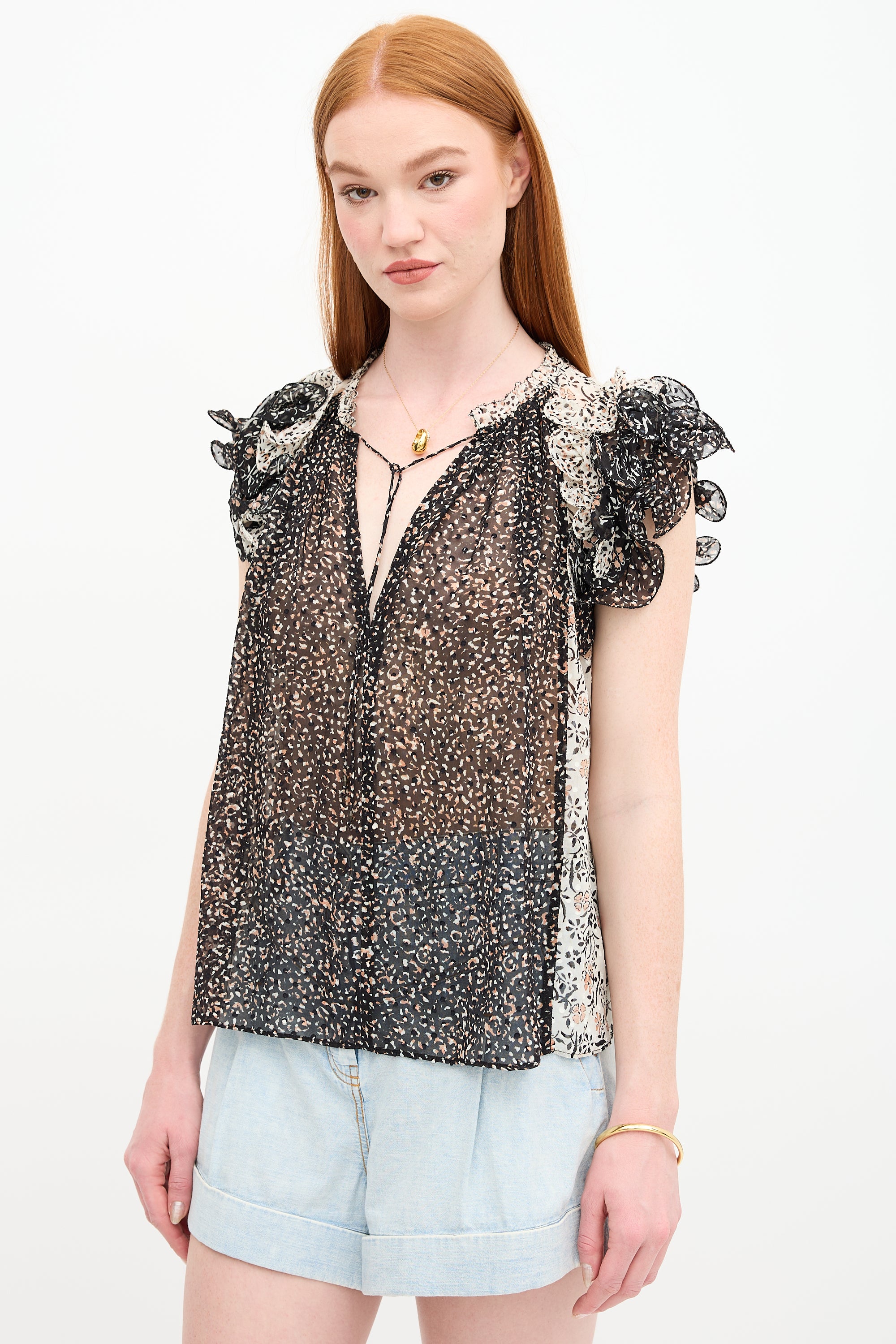 Pre-owned Ulla Johnson black and white silk blend top featuring pink floral pattern, V-neckline, ruffle collar and shoulders, and neck tie. Unlined.
