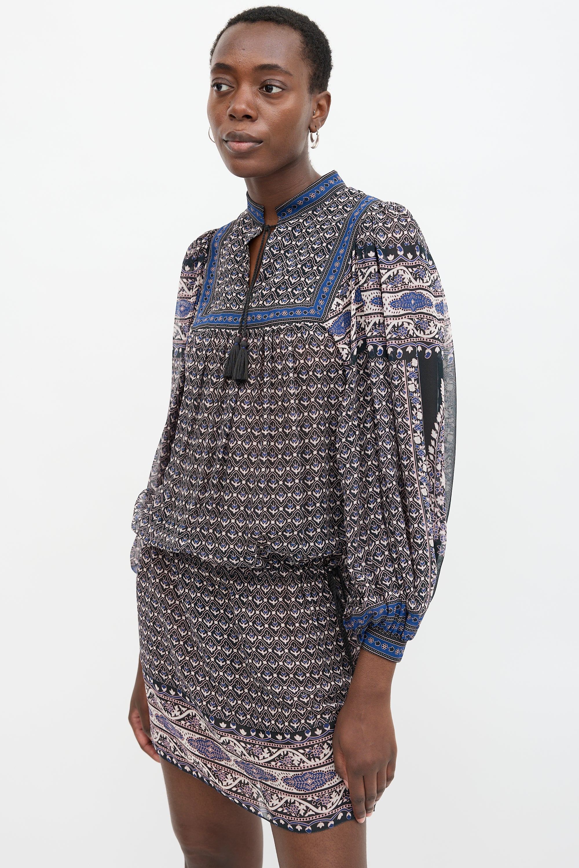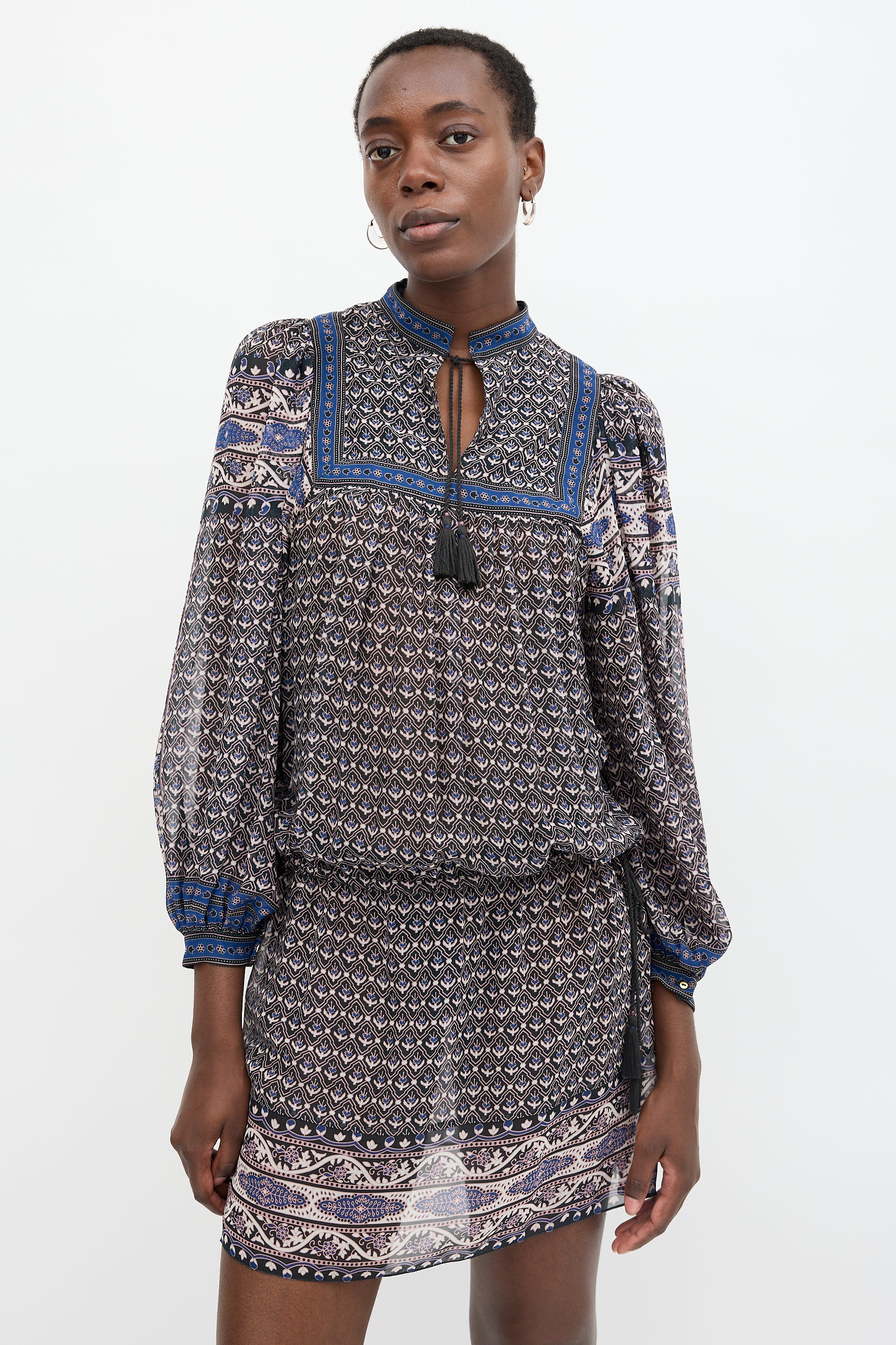 Pre-owned Ulla Johnson black silk sheer Reema dress featuring multicolour filigree print, cutout front with tassel tie collar, lantern sleeves, and tassel drawstring waist. Unlined.