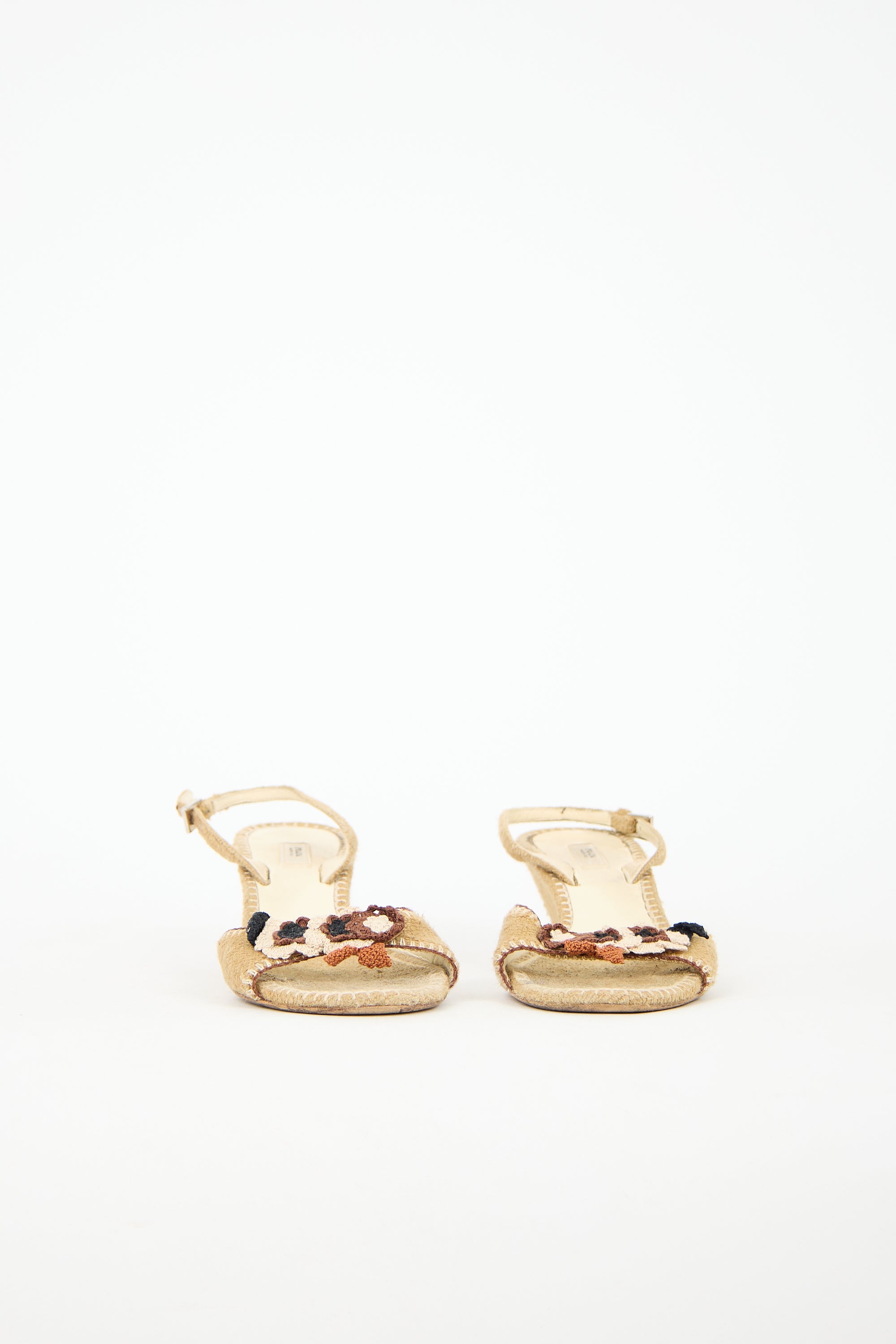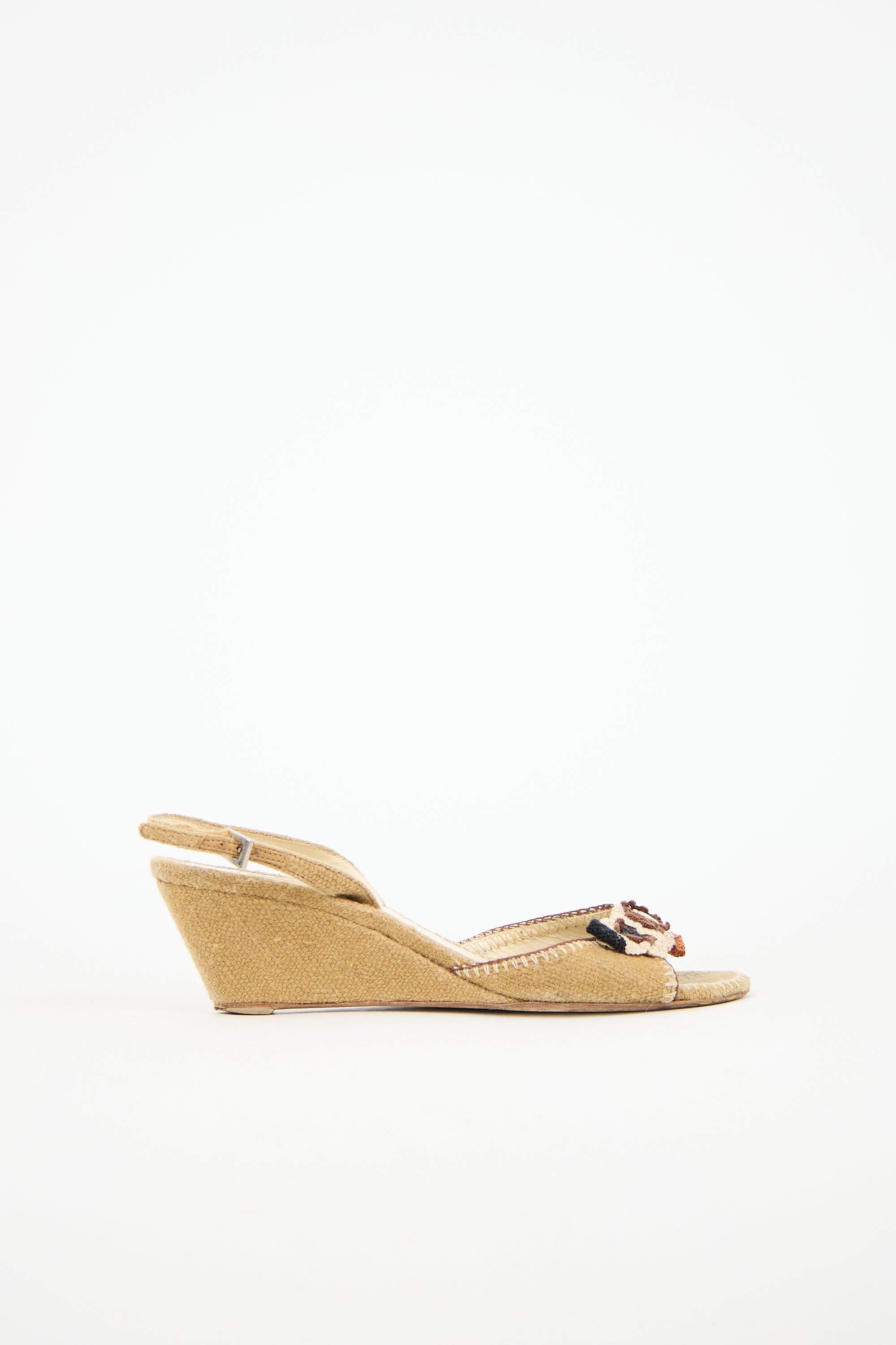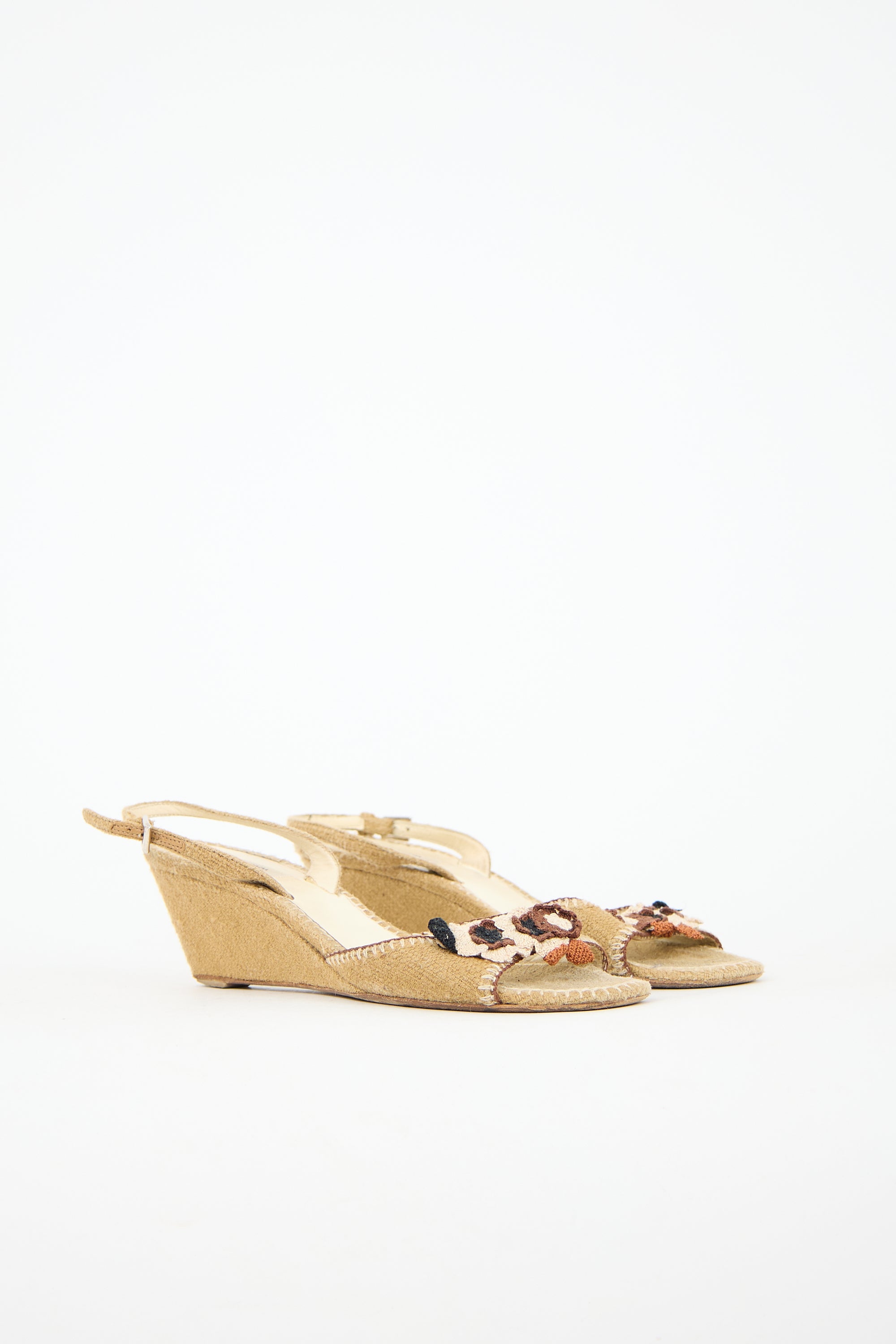 Pre-owned Prada beige canvas sandals featuring rounded toe, beige, brown, and orange crochet flower appliques at vamp, adjustable slingback strap, and covered wedge heel.