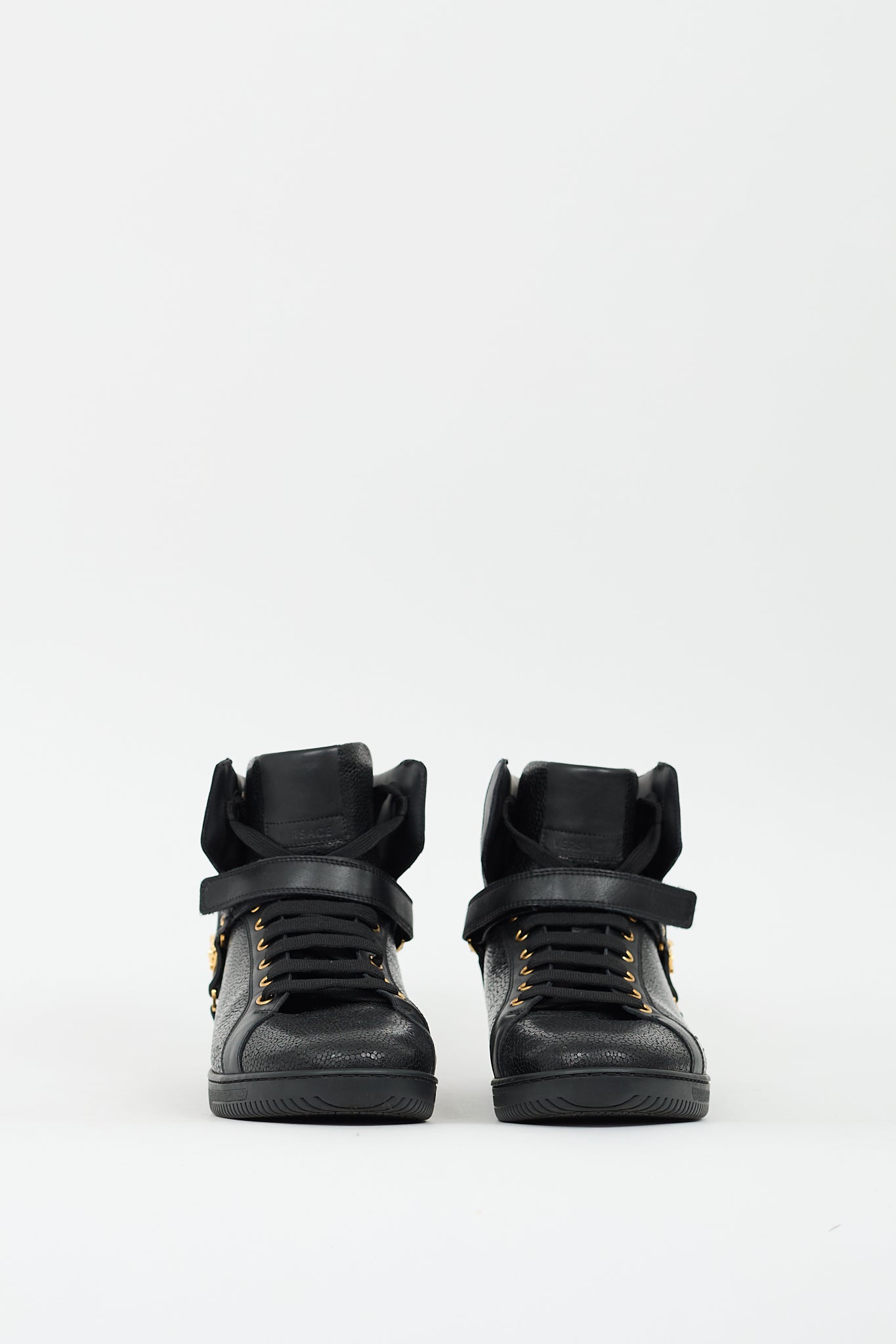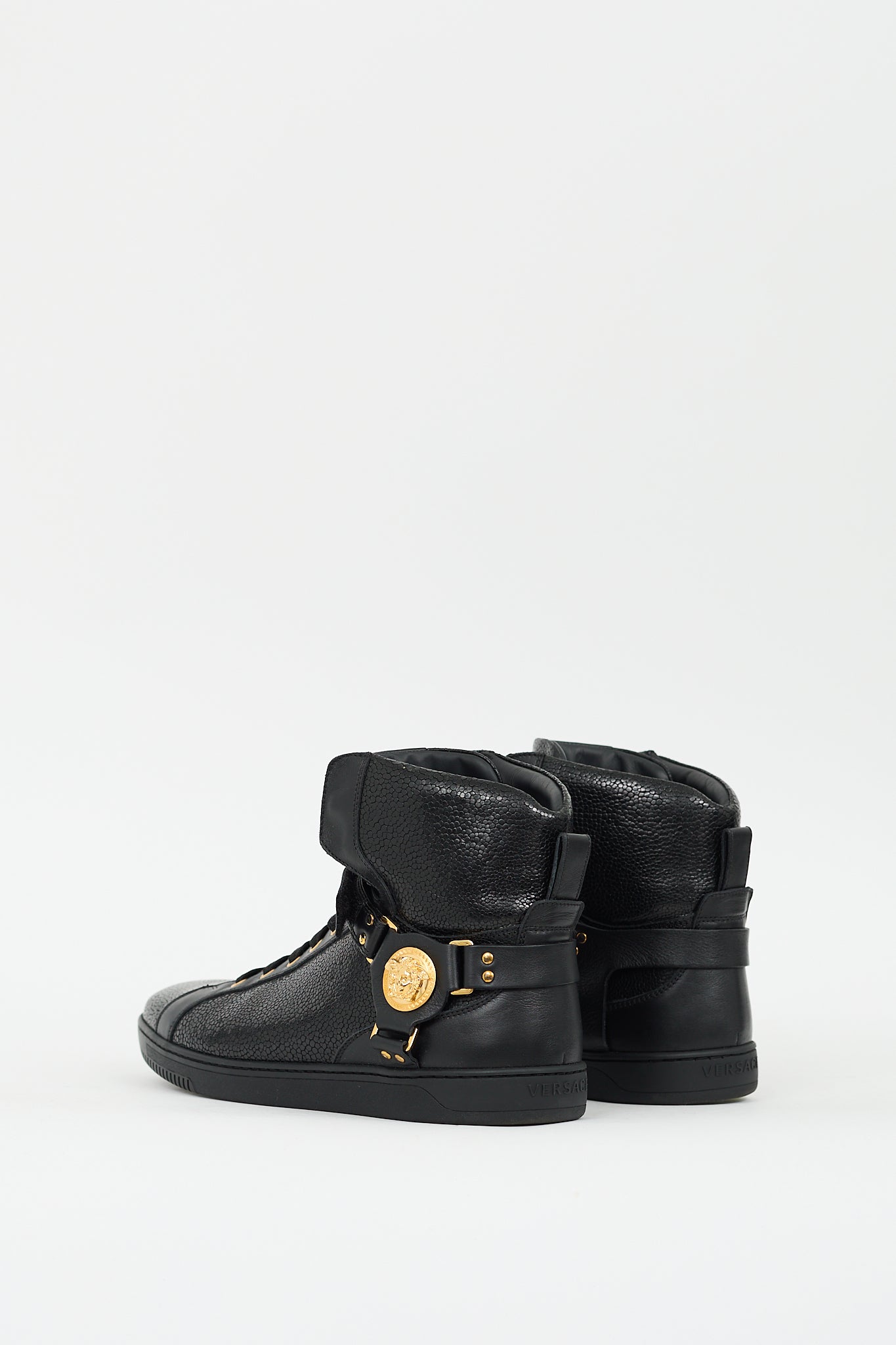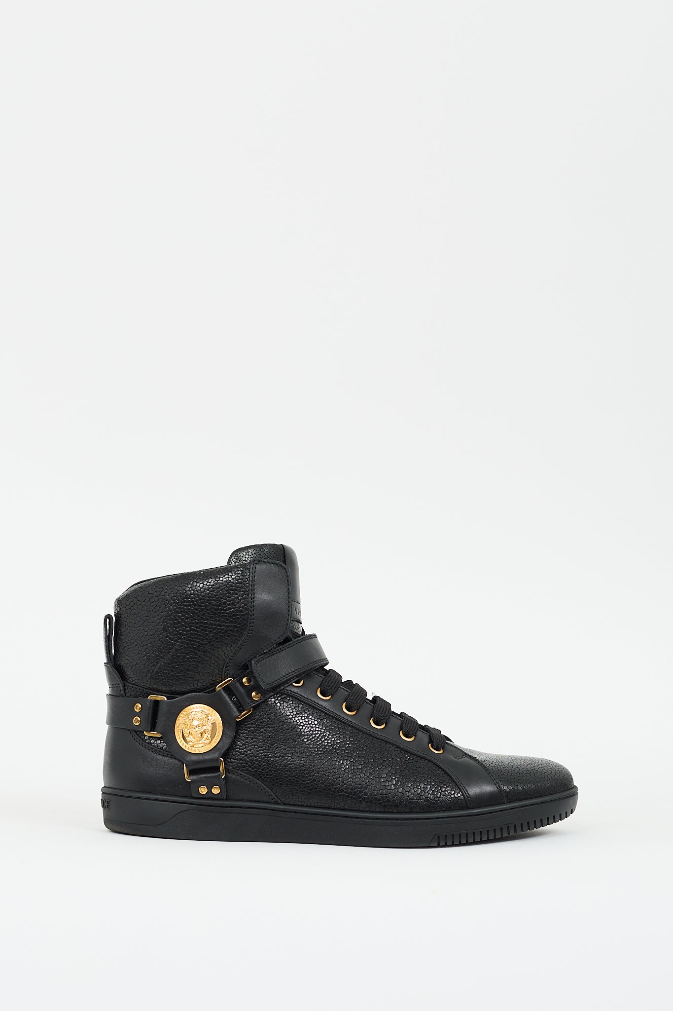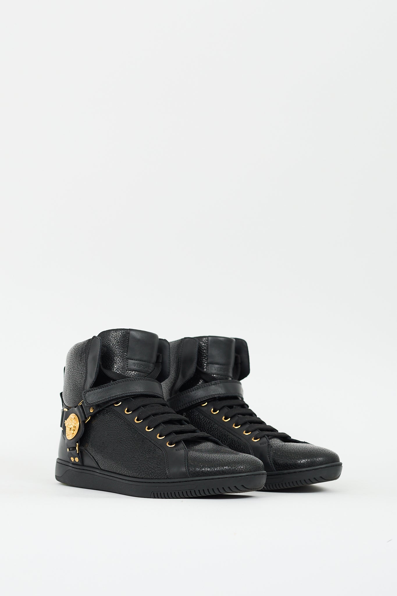 Pre-owned Versace black sneakers featuring rounded toe, pebbled leather upper, lace up vamp, gold tone hardware, Velcro strap across tongue, Medusa Medallion hardware logo harness at side, and rubber sole. Comes with original dust bag.