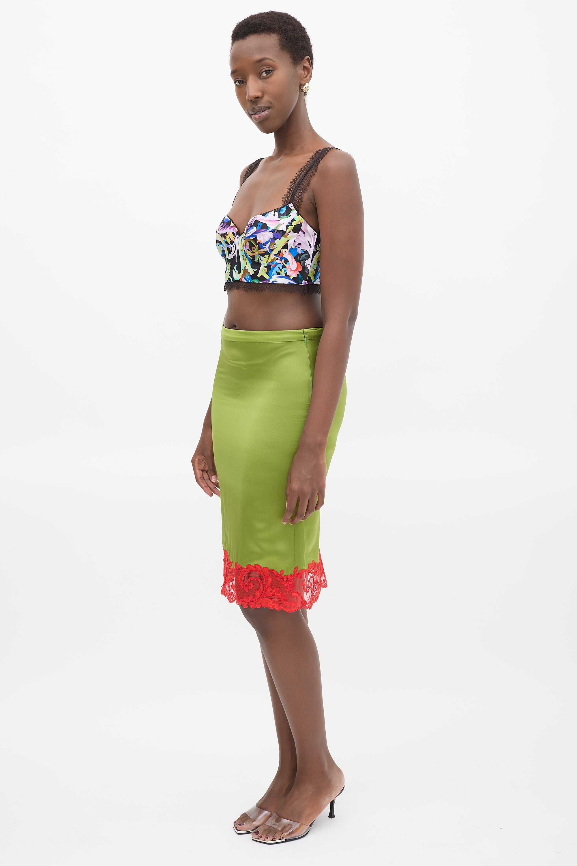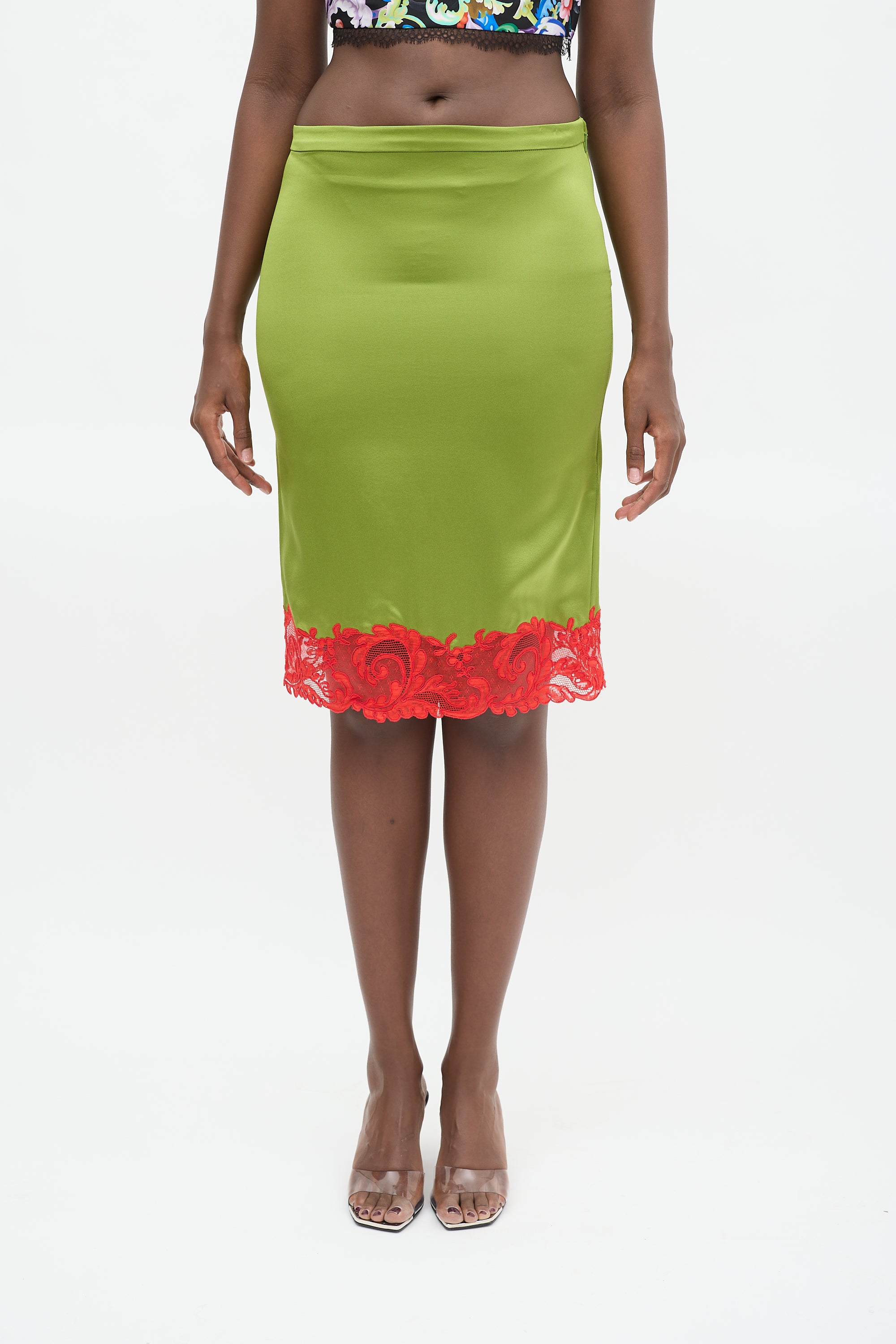 Pre-owned Versace green silk midi skirt featuring red lace hem, darted waist at back, and concealed side zip closure with hook and eye fastening.