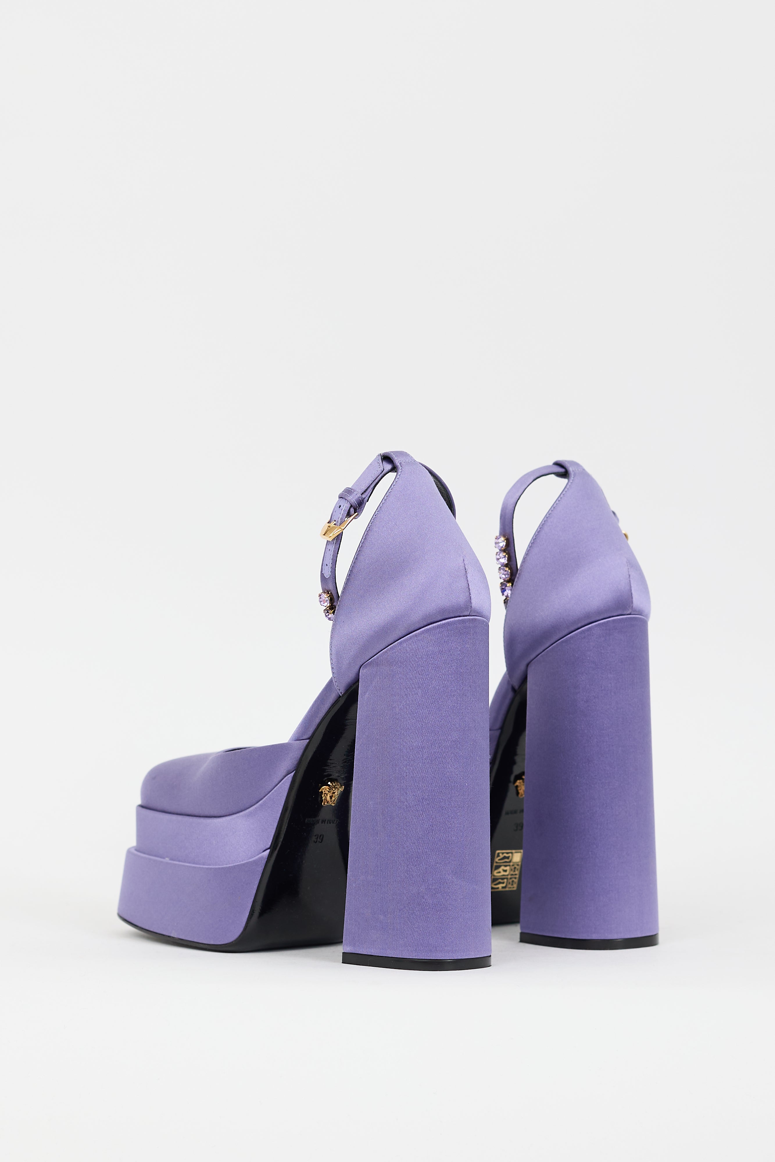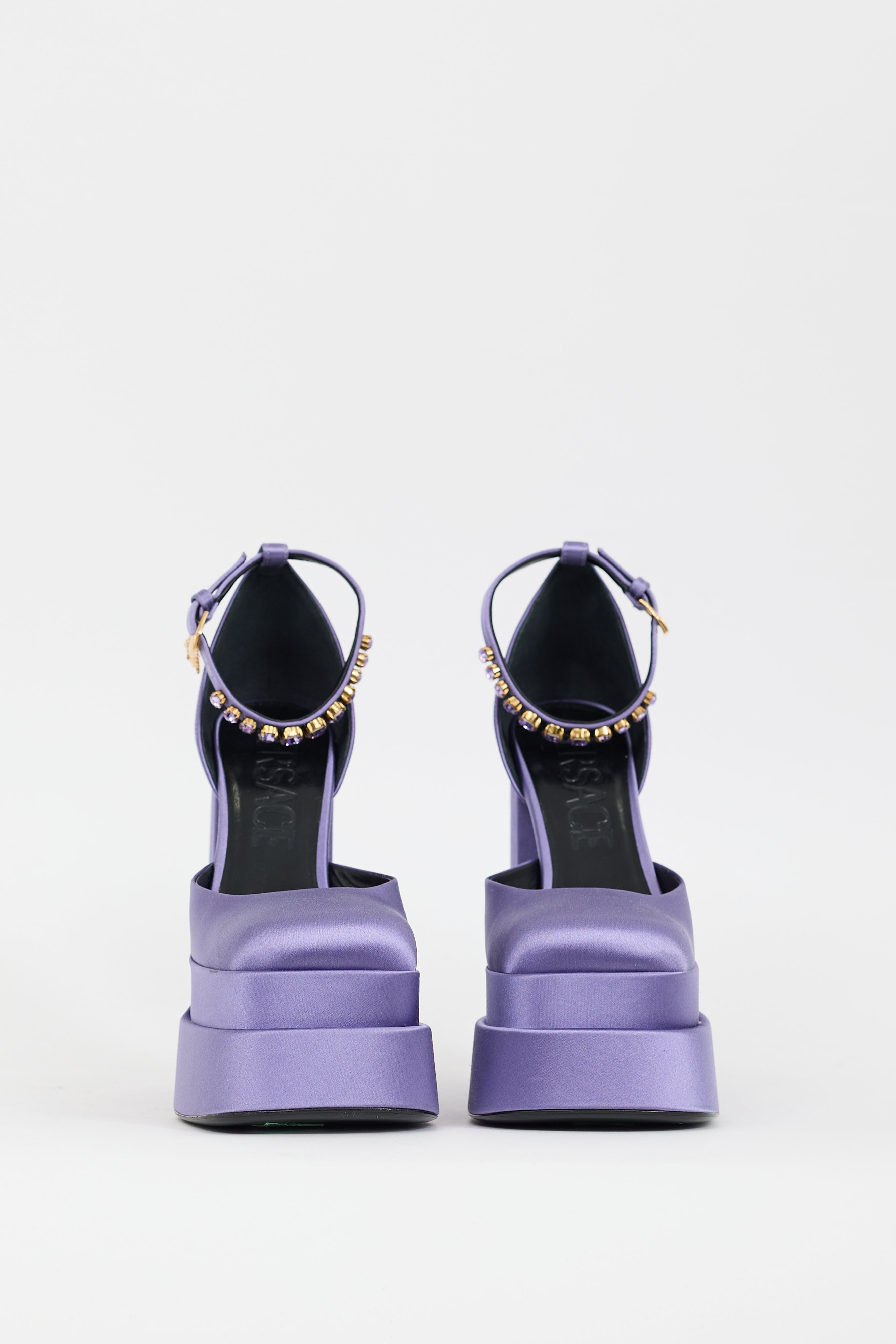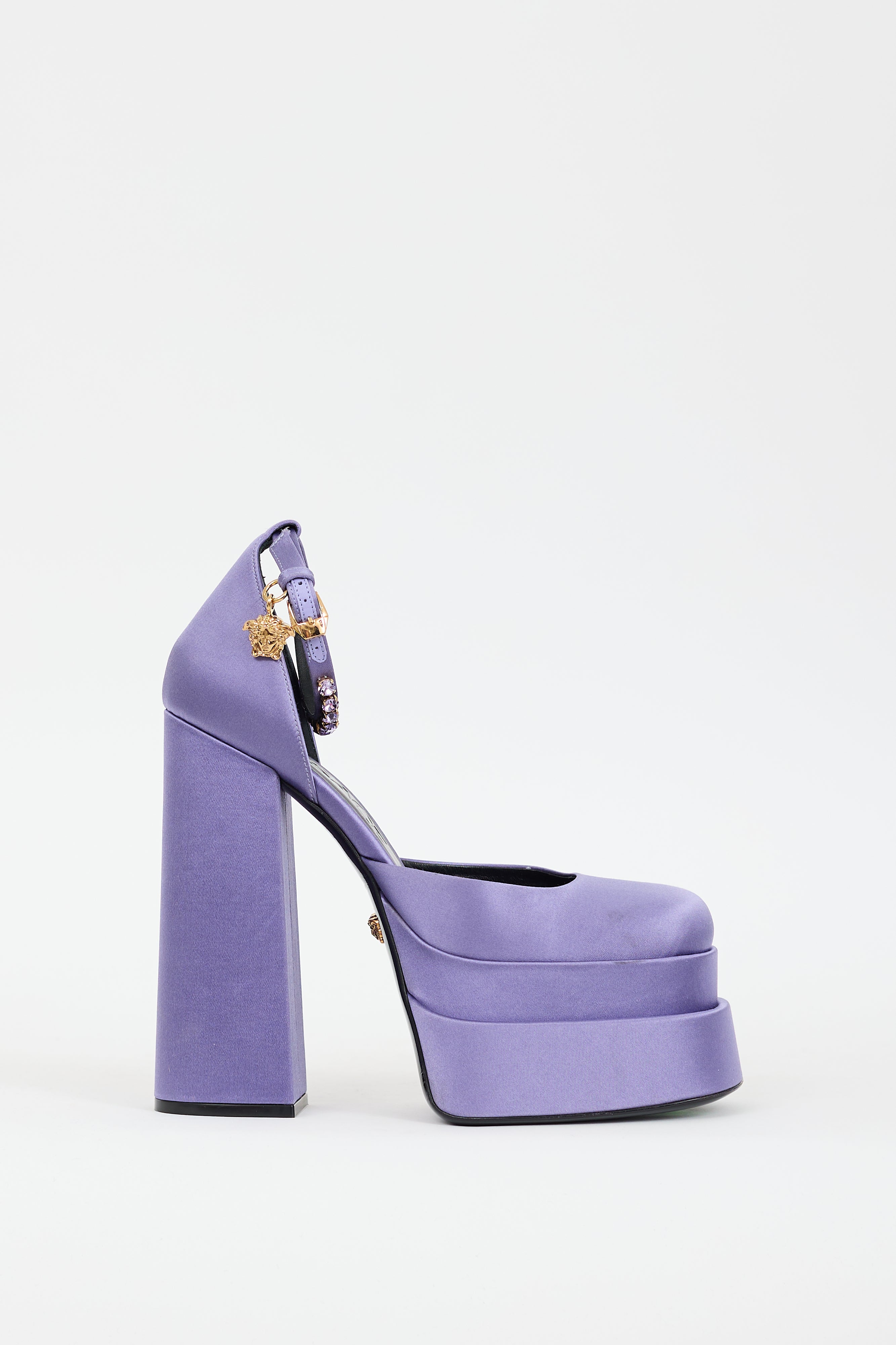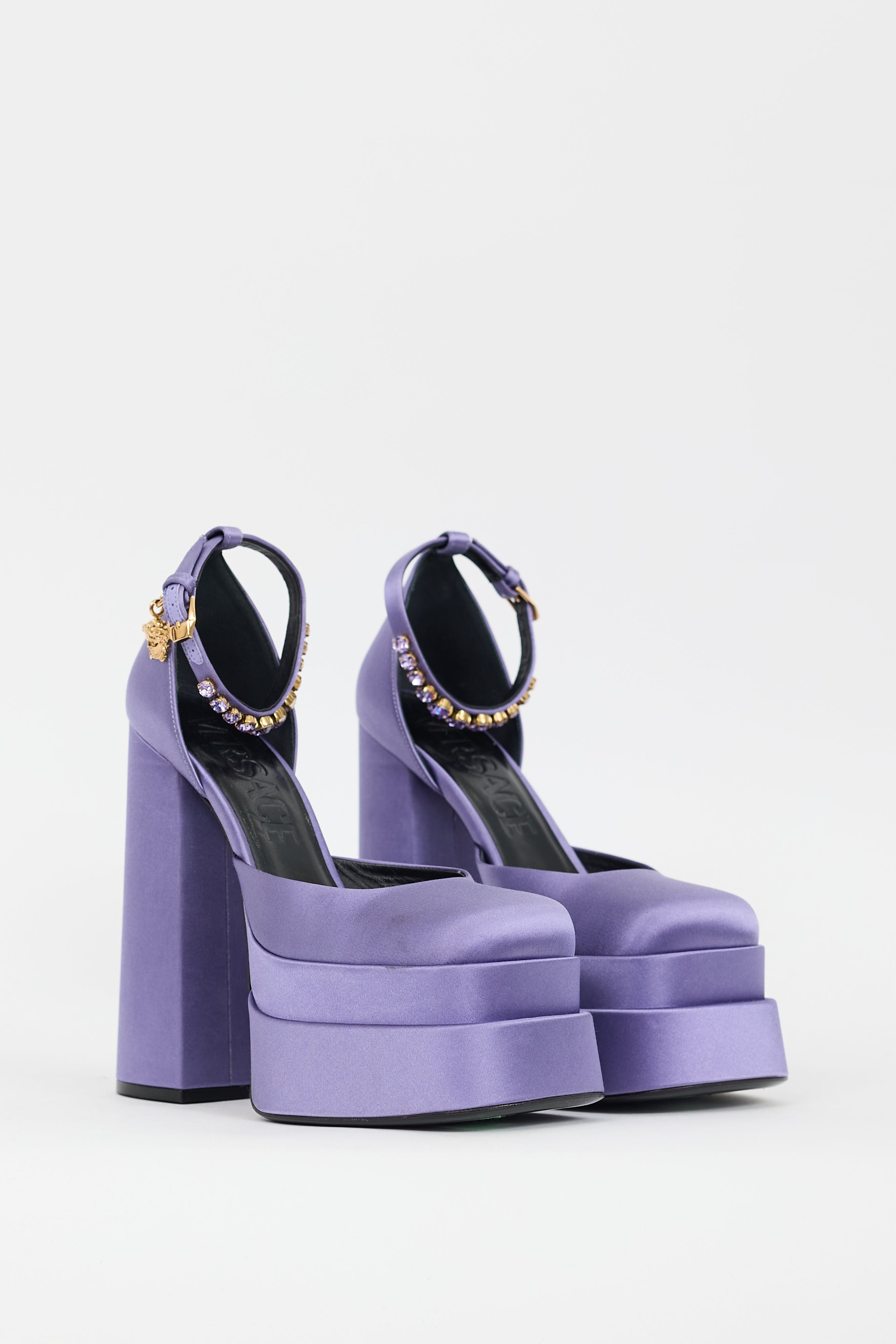 Pre-owned Versace purple satin Medusa Aevitas heels featuring a square toe, crystal embellished adjustable ankle strap with gold tone Medusa head charm, tall covered platform, and covered block heel. Comes with original dust bag.