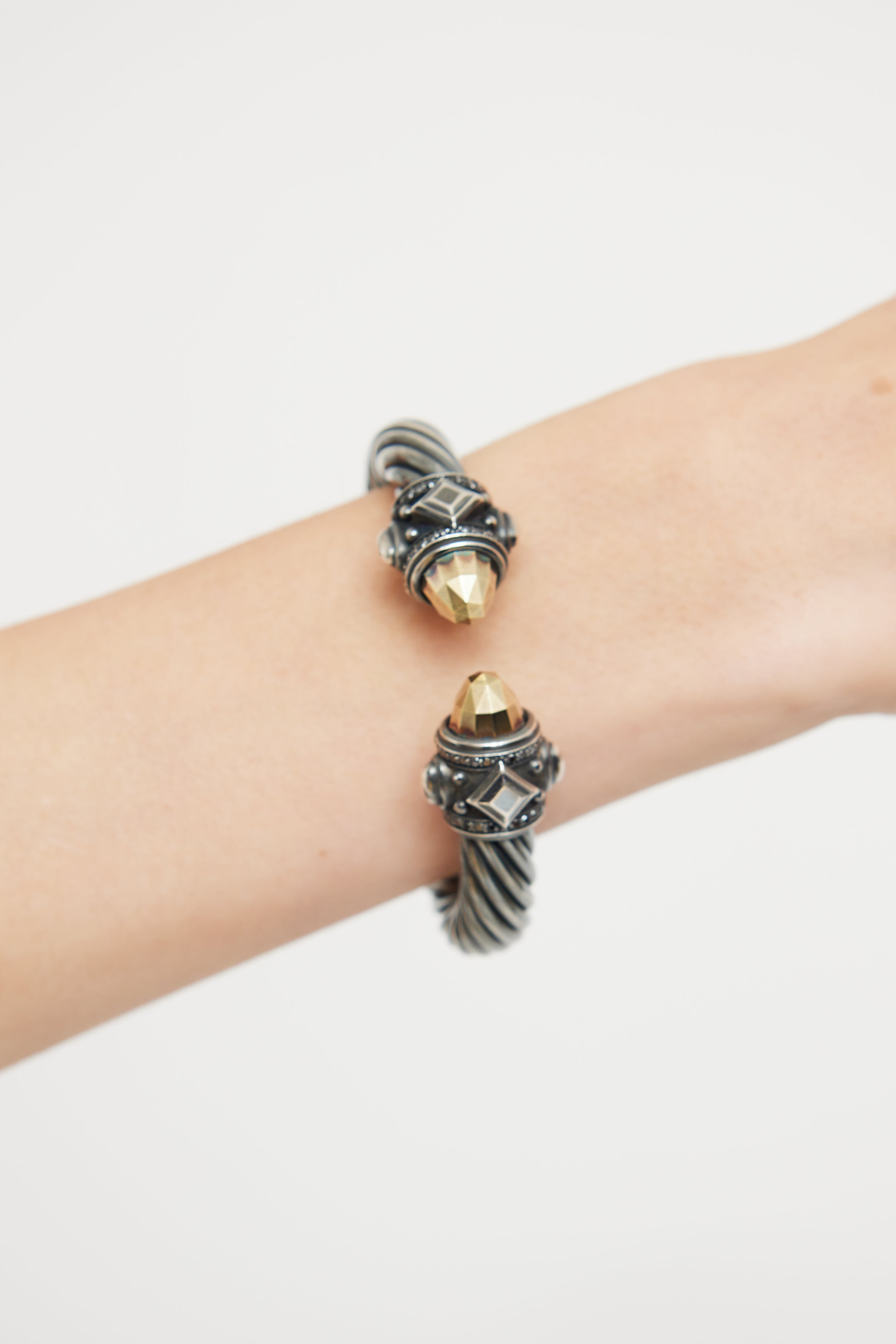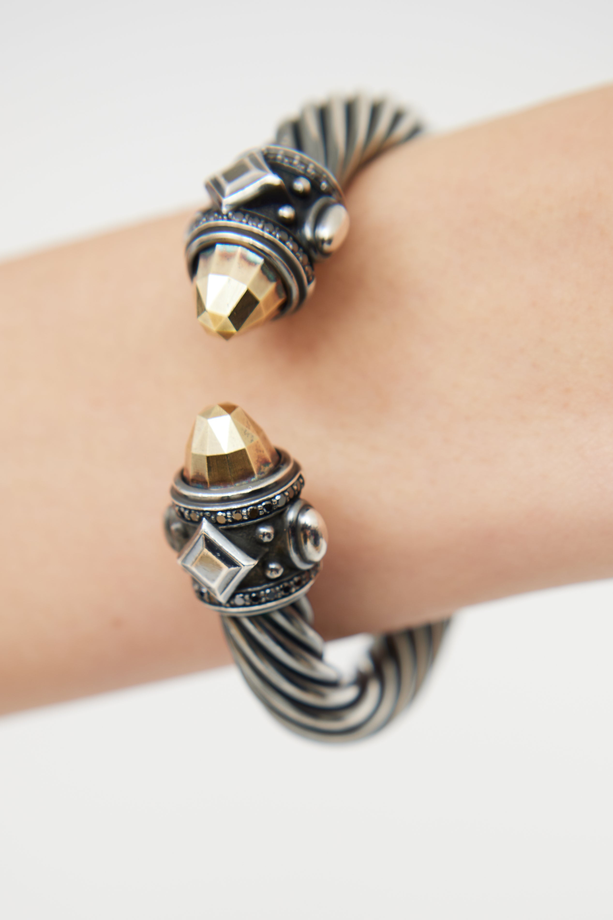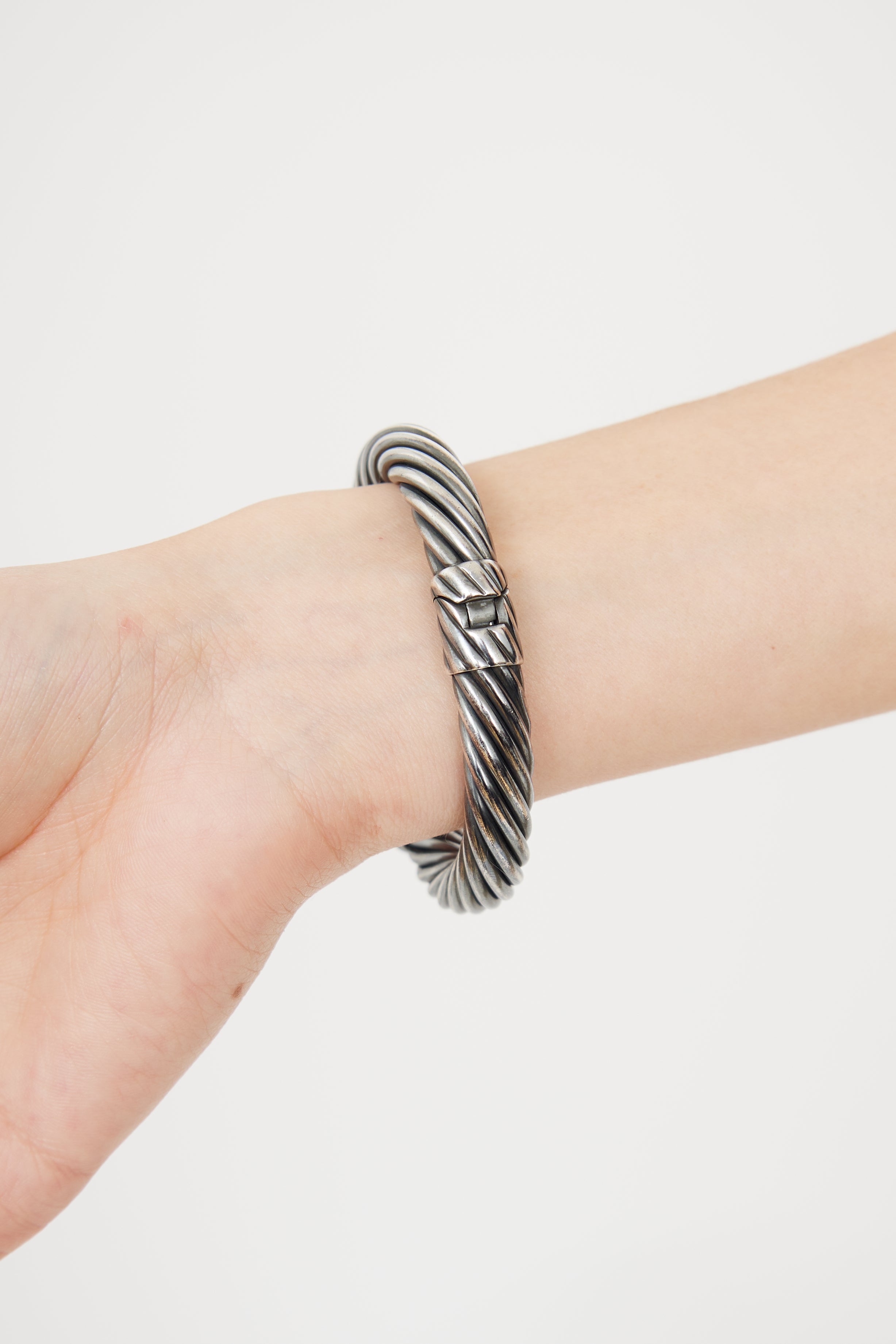 Pre-owned David Yurman Cable Classic open bracelet featuring twisted cable design, hinge opening, and capped ends embellished with pave set black diamonds.