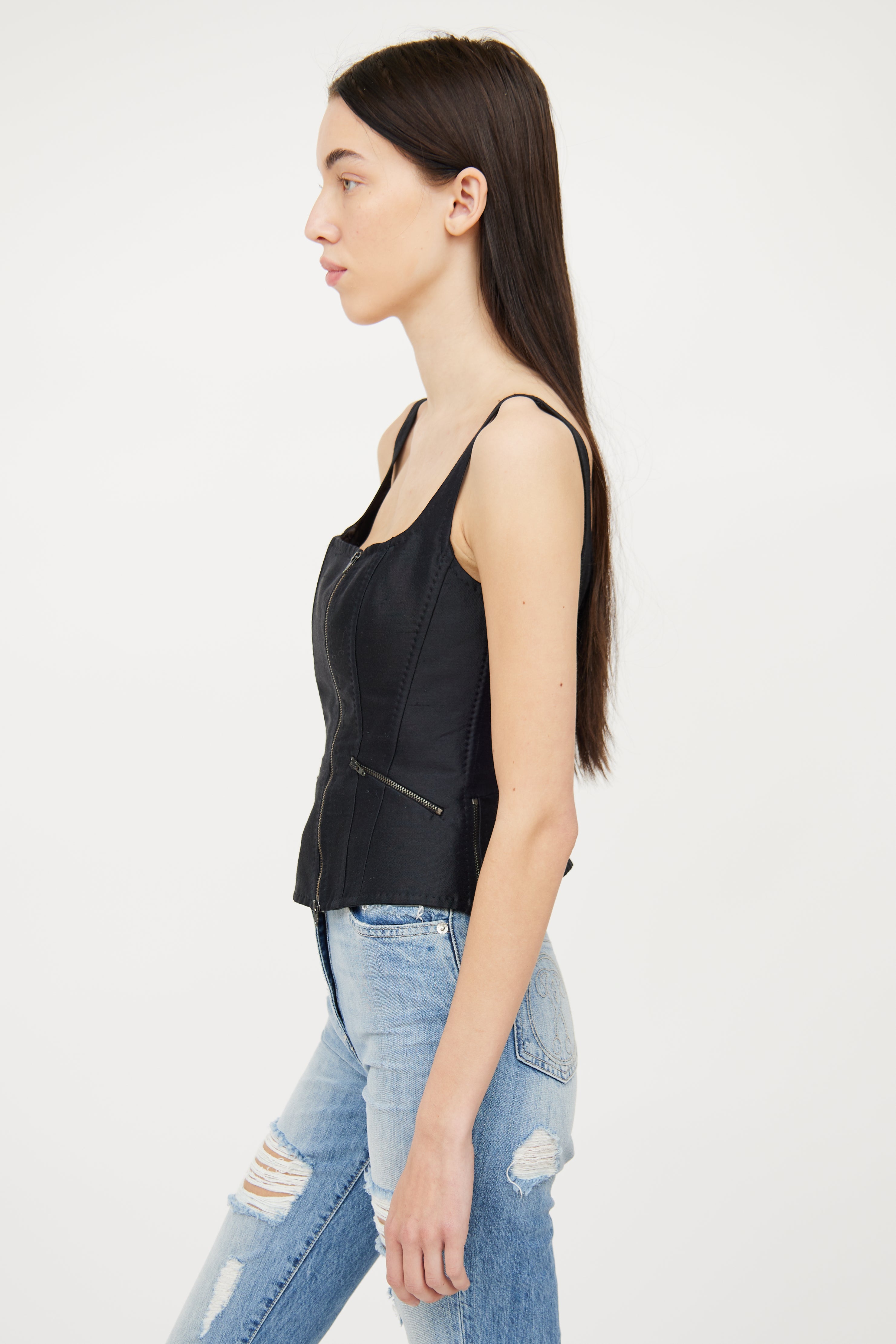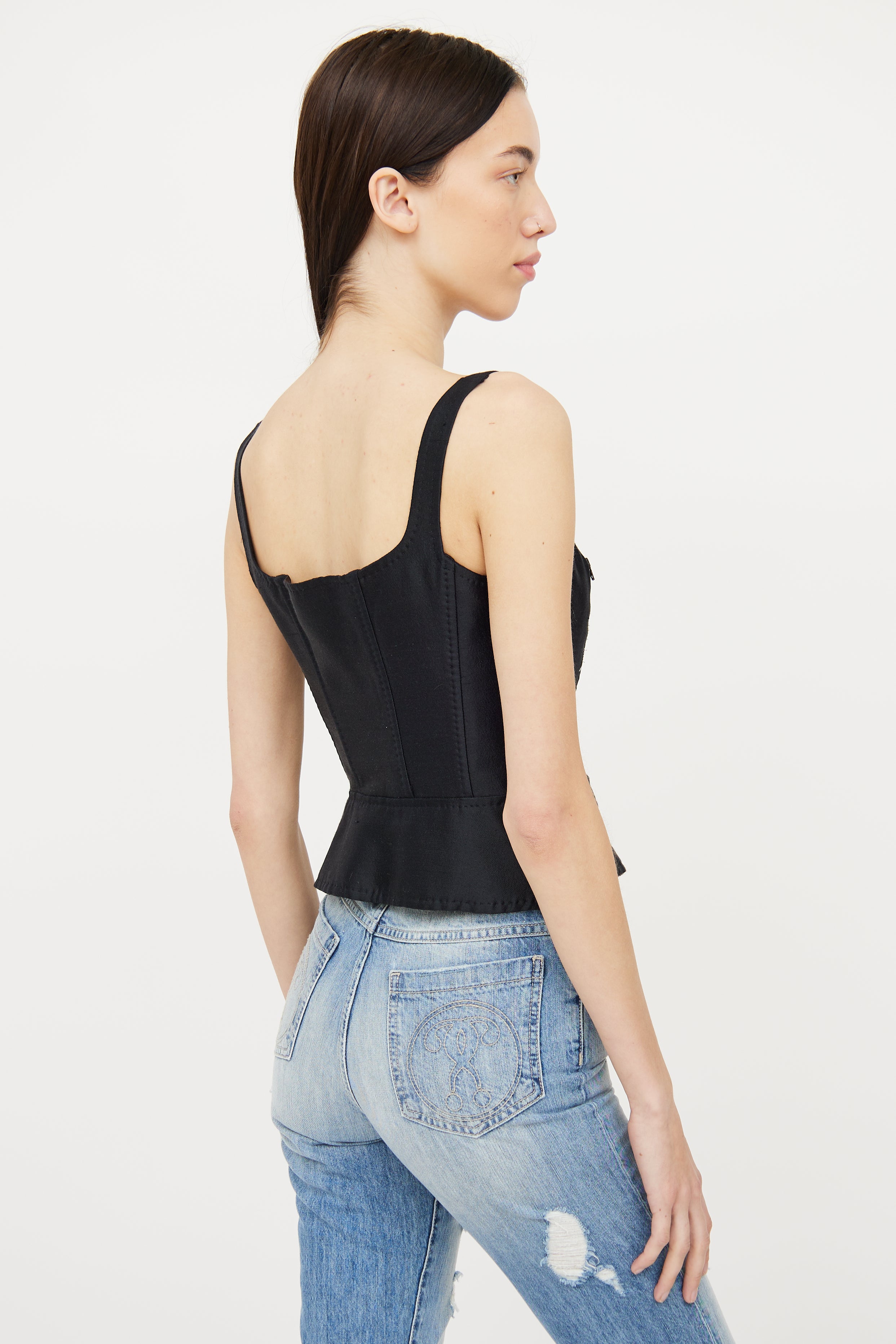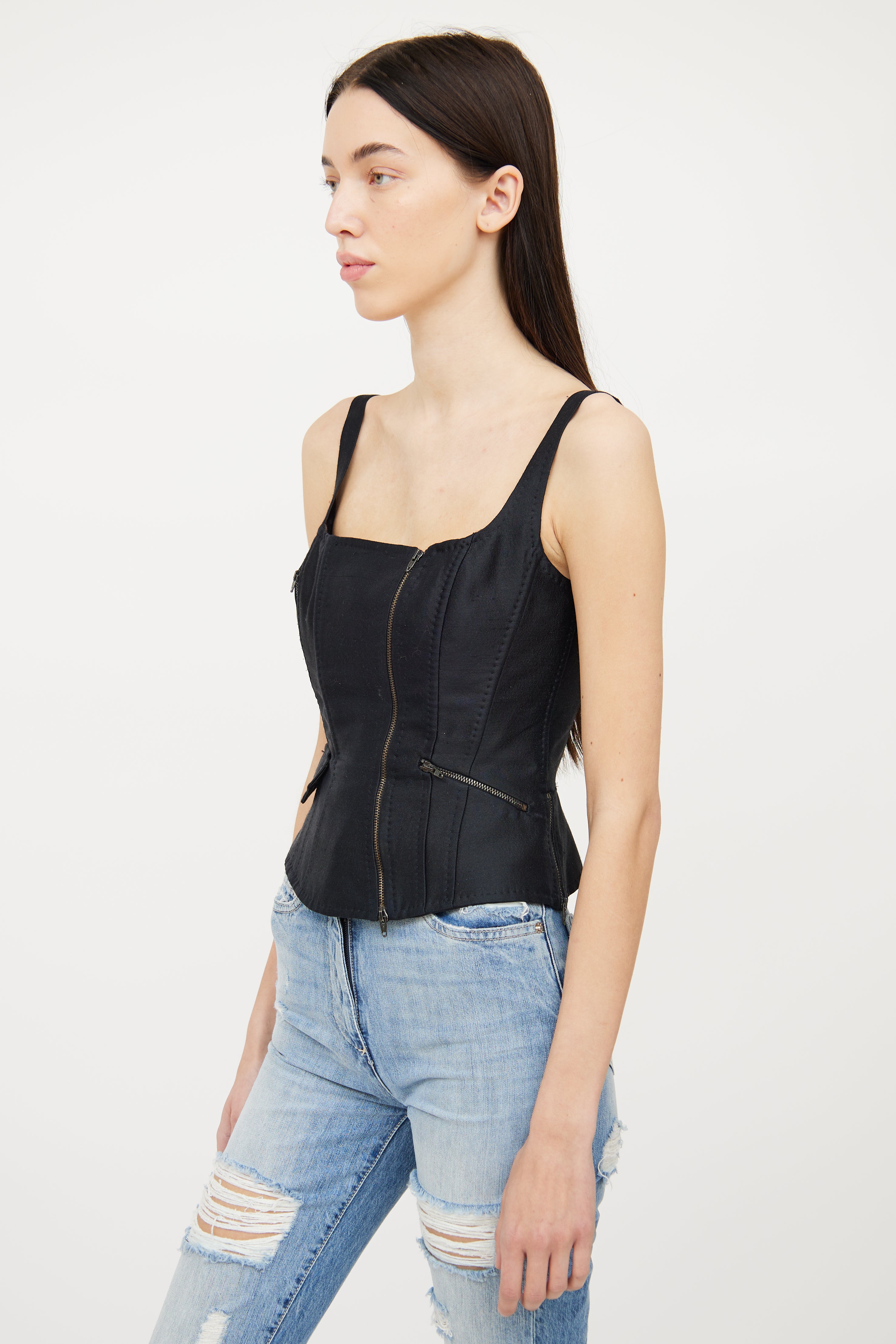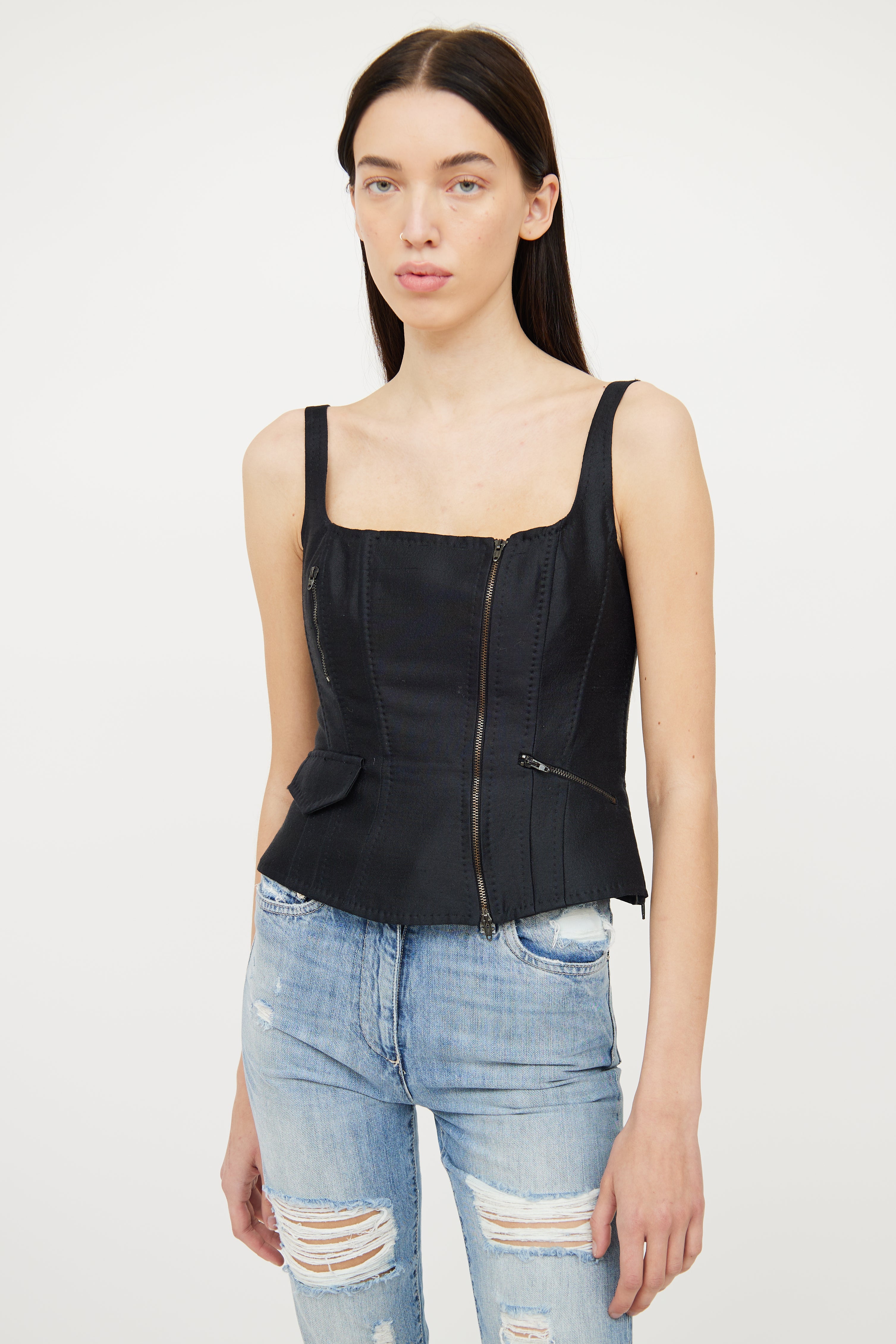 Pre-owned Moschino black corset top featuring square neckline, structured boning, flare hemline with dual zip, asymmetrical zip detailing on front, and single flap pocket on bottom right side.