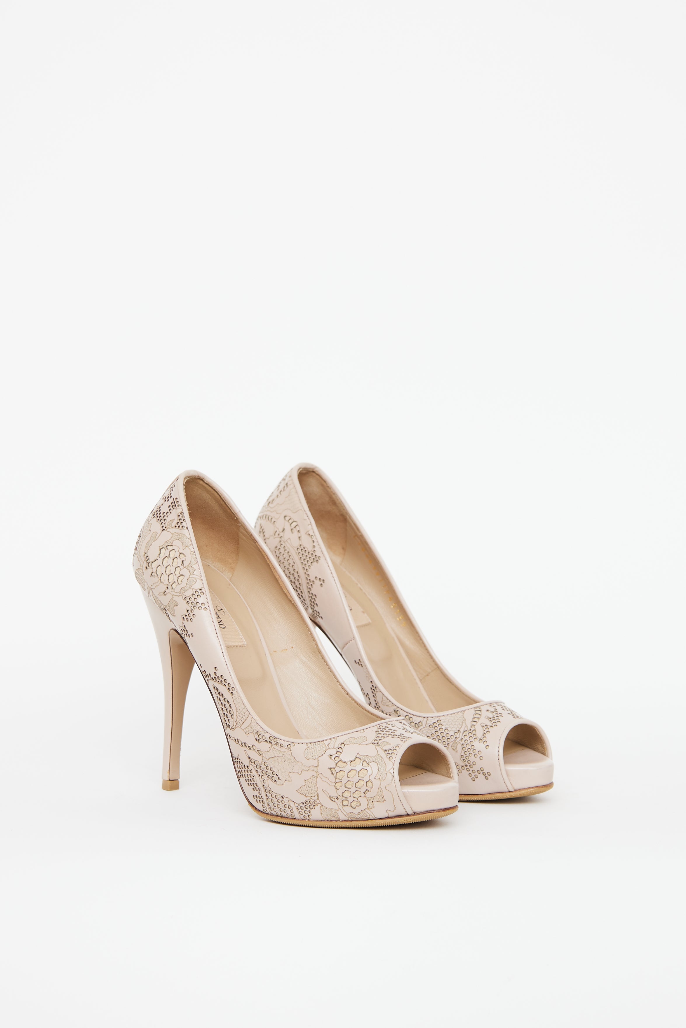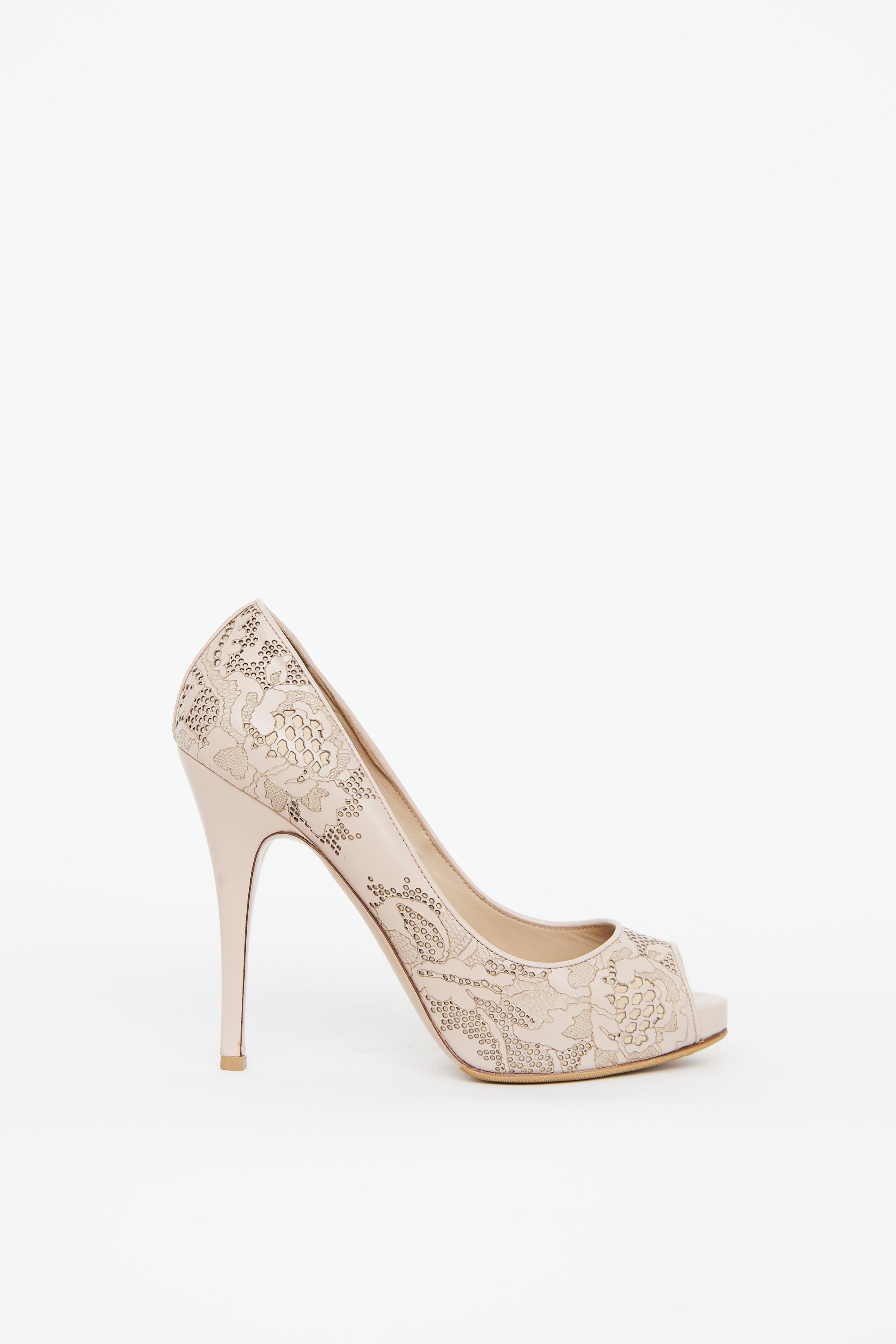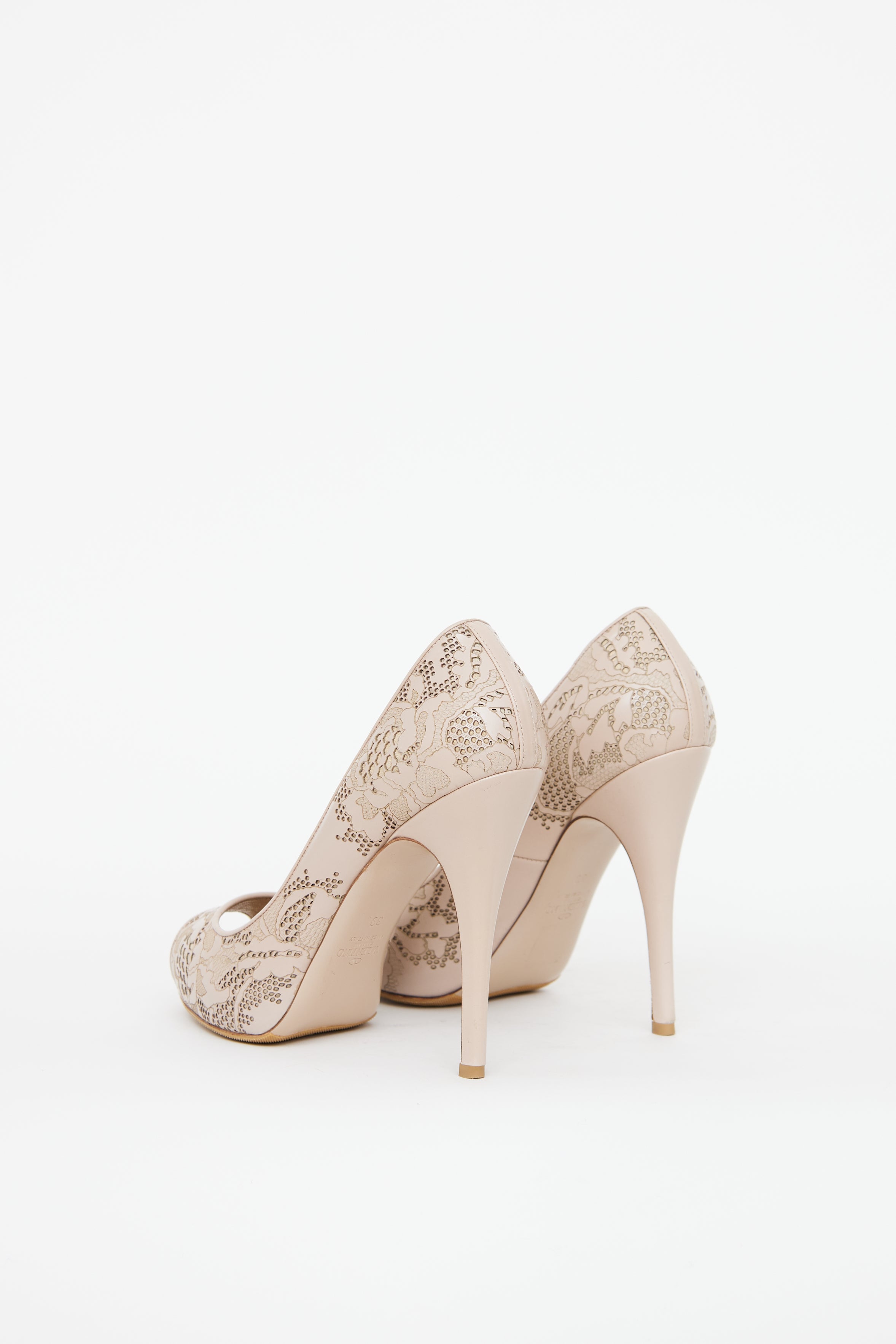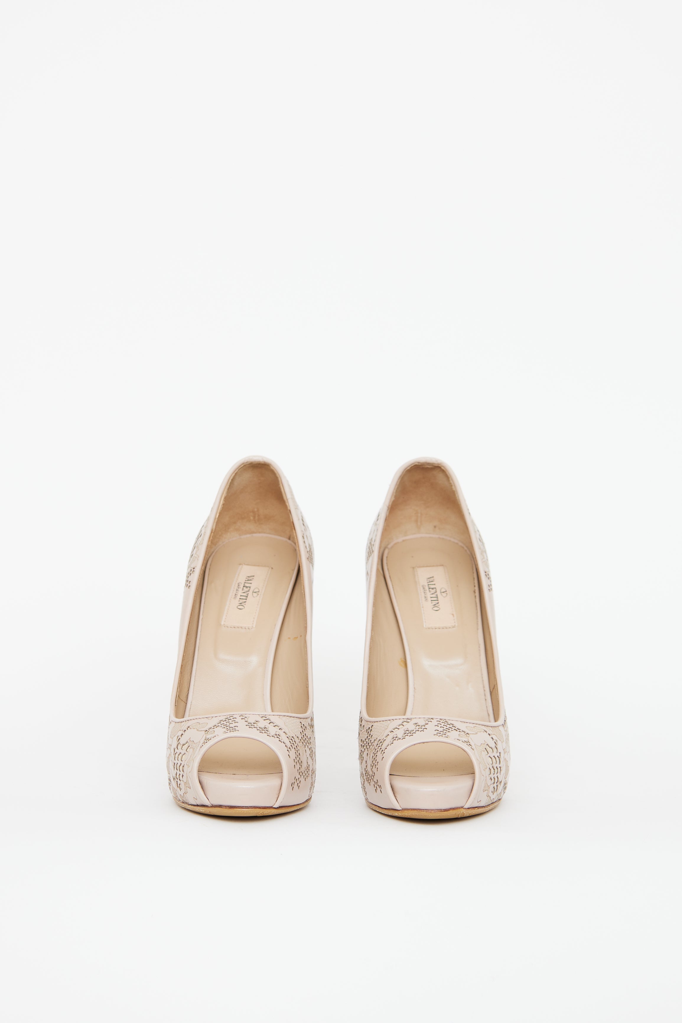 Pre-owned Valentino blush pumps featuring rounded peep toe, laser cut lace-like detailing throughout, rolled leather trim, slip on entry, covered stiletto heel and leather outsole.