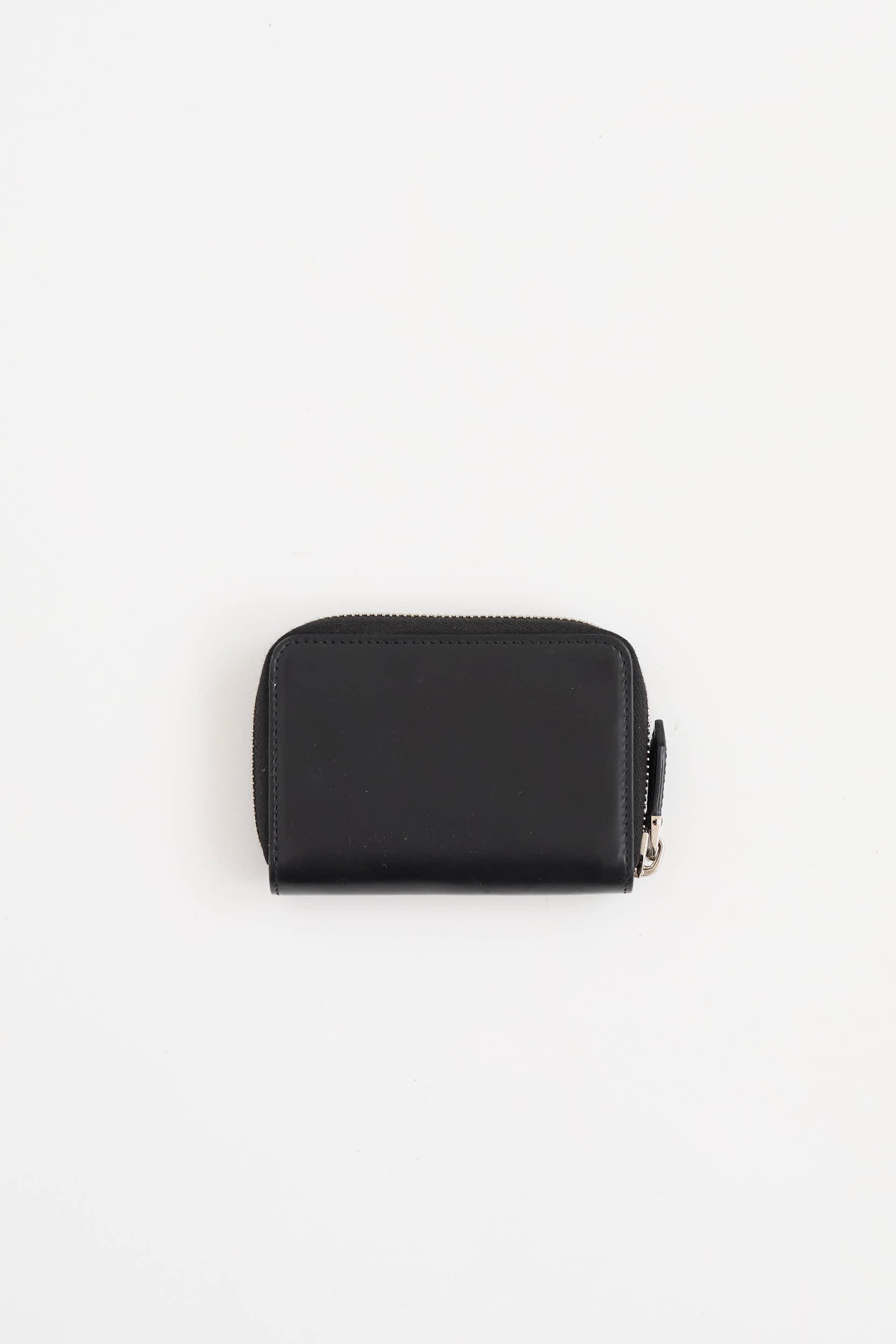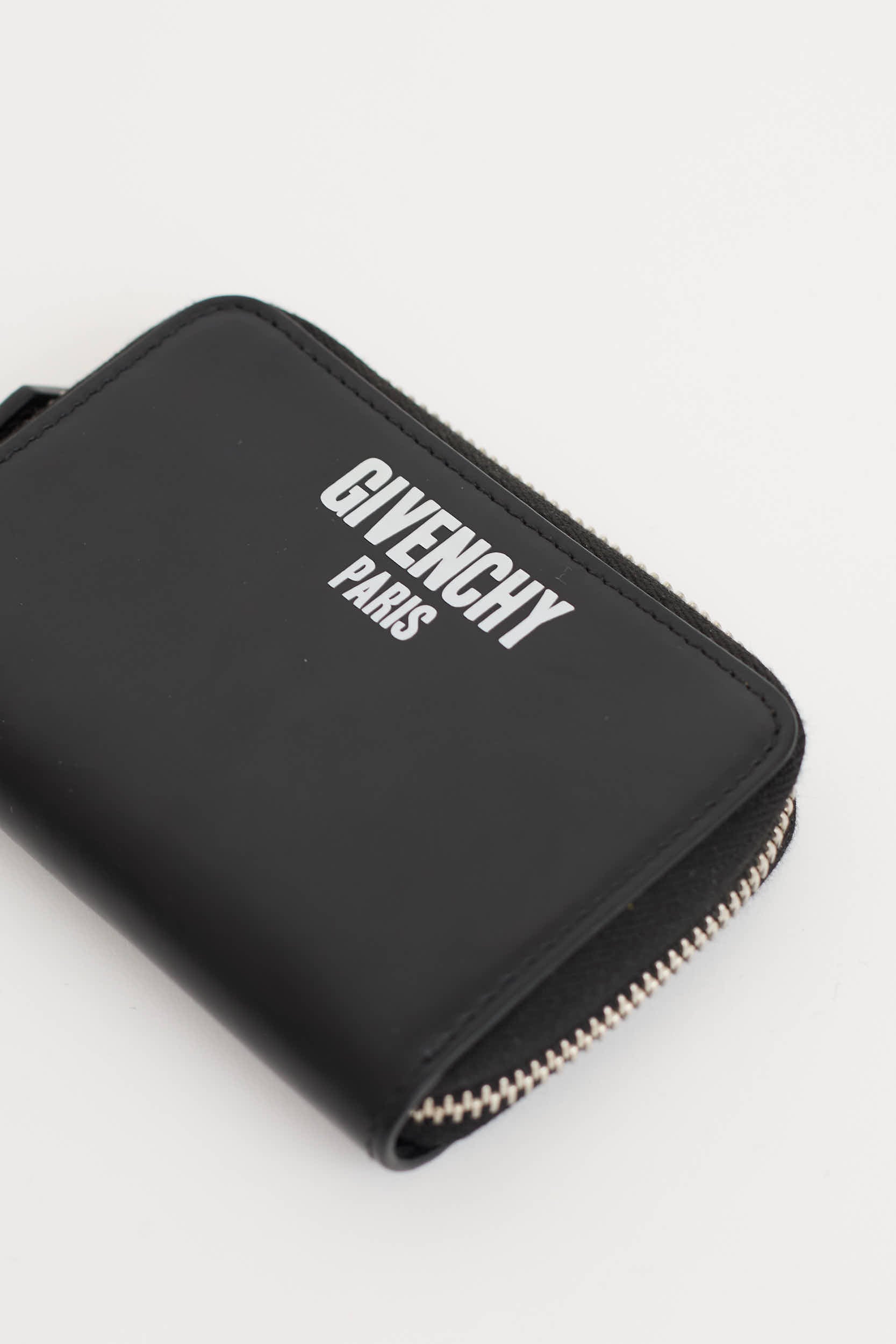Pre-owned Givenchy black and white Compact wallet featuring black leather body, white printed logo text at face, two main comparments, four card slots, and top zip closure with leather pull tab.