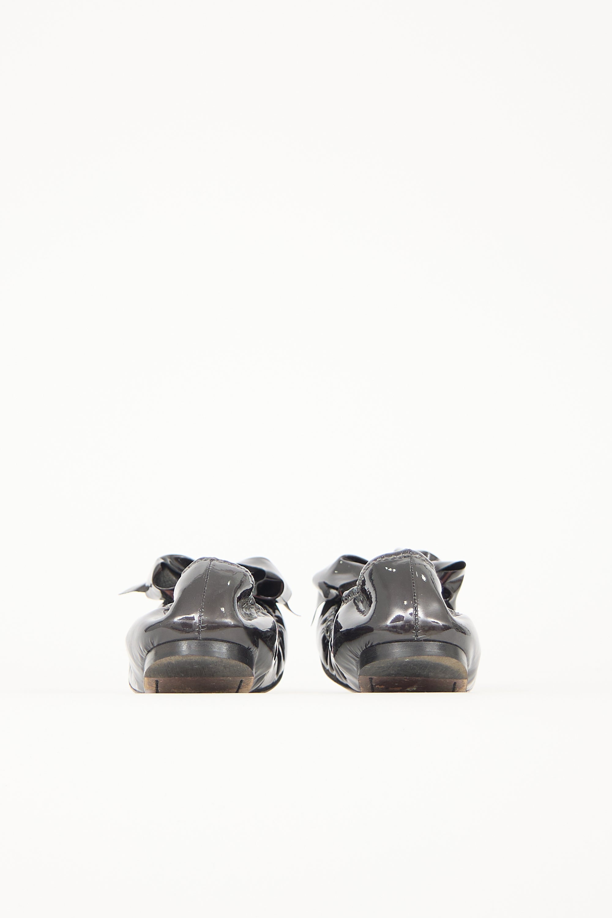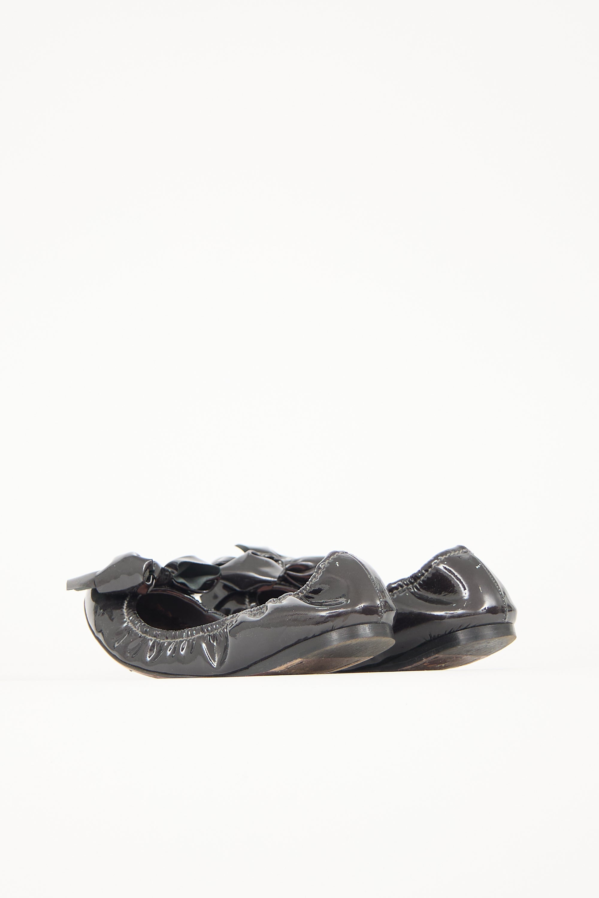 Pre-owned Miu Miu black patent leather ballet flats featuring a rounded toe, bow detail at toe box, elastcized collar, and slip on entry.