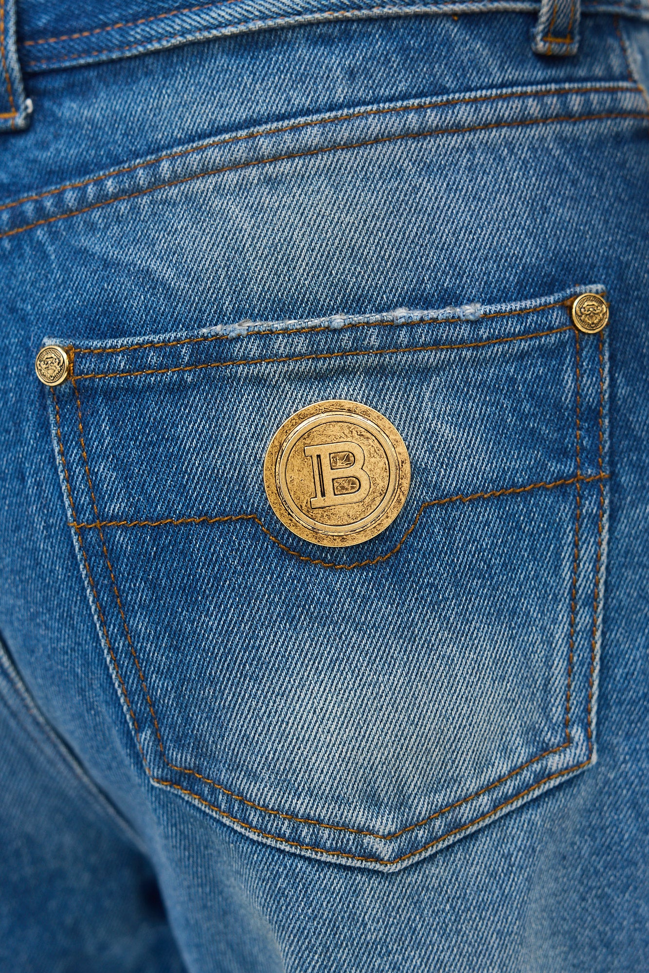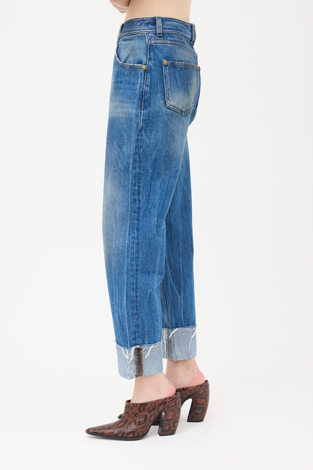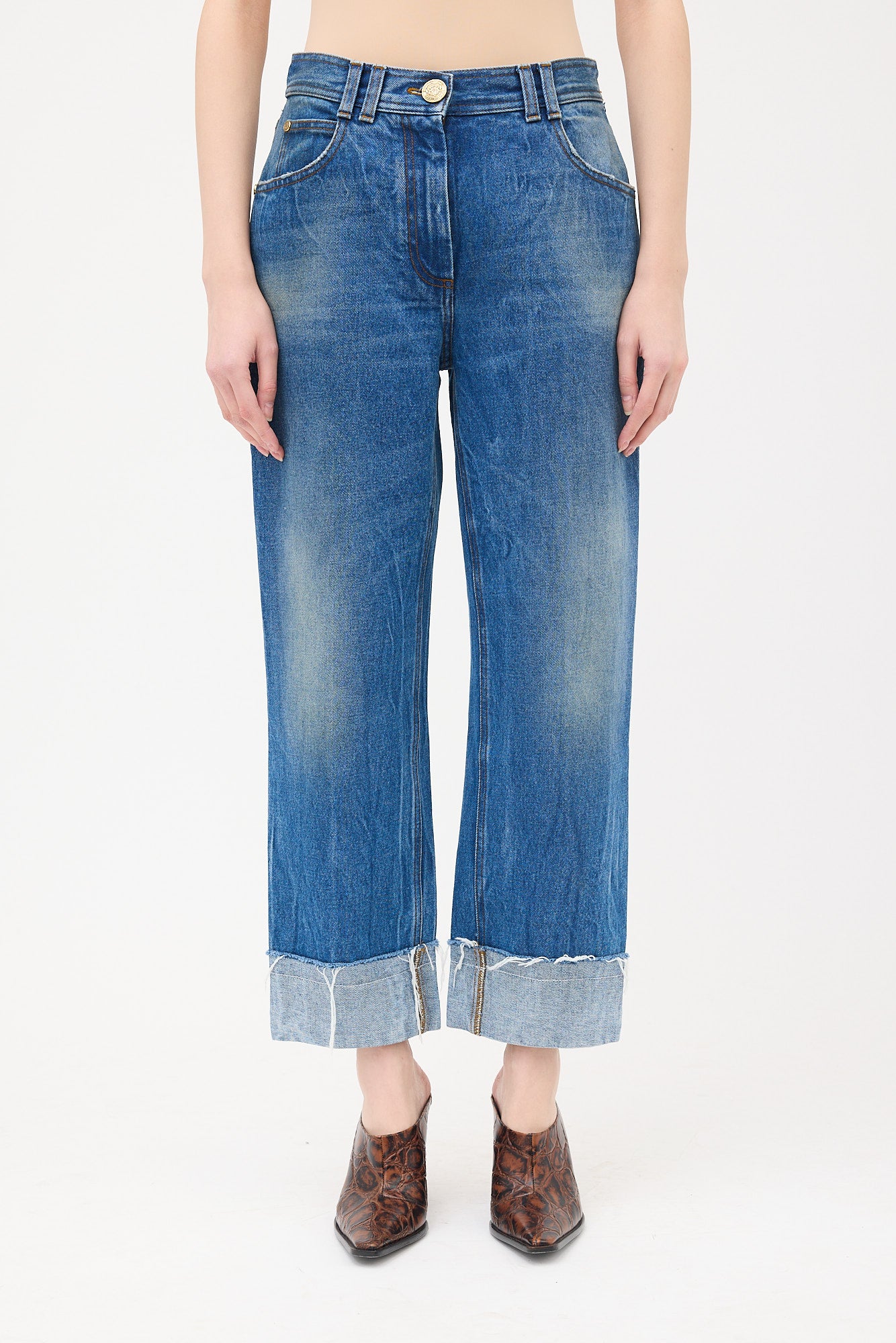 Pre-owned Balmain medium wash jeans featuring high waist, straight leg, fold over hem cuffs with raw edge, five pocket styling, gold tone hardware embellishment at back right pocket, and zip fly.