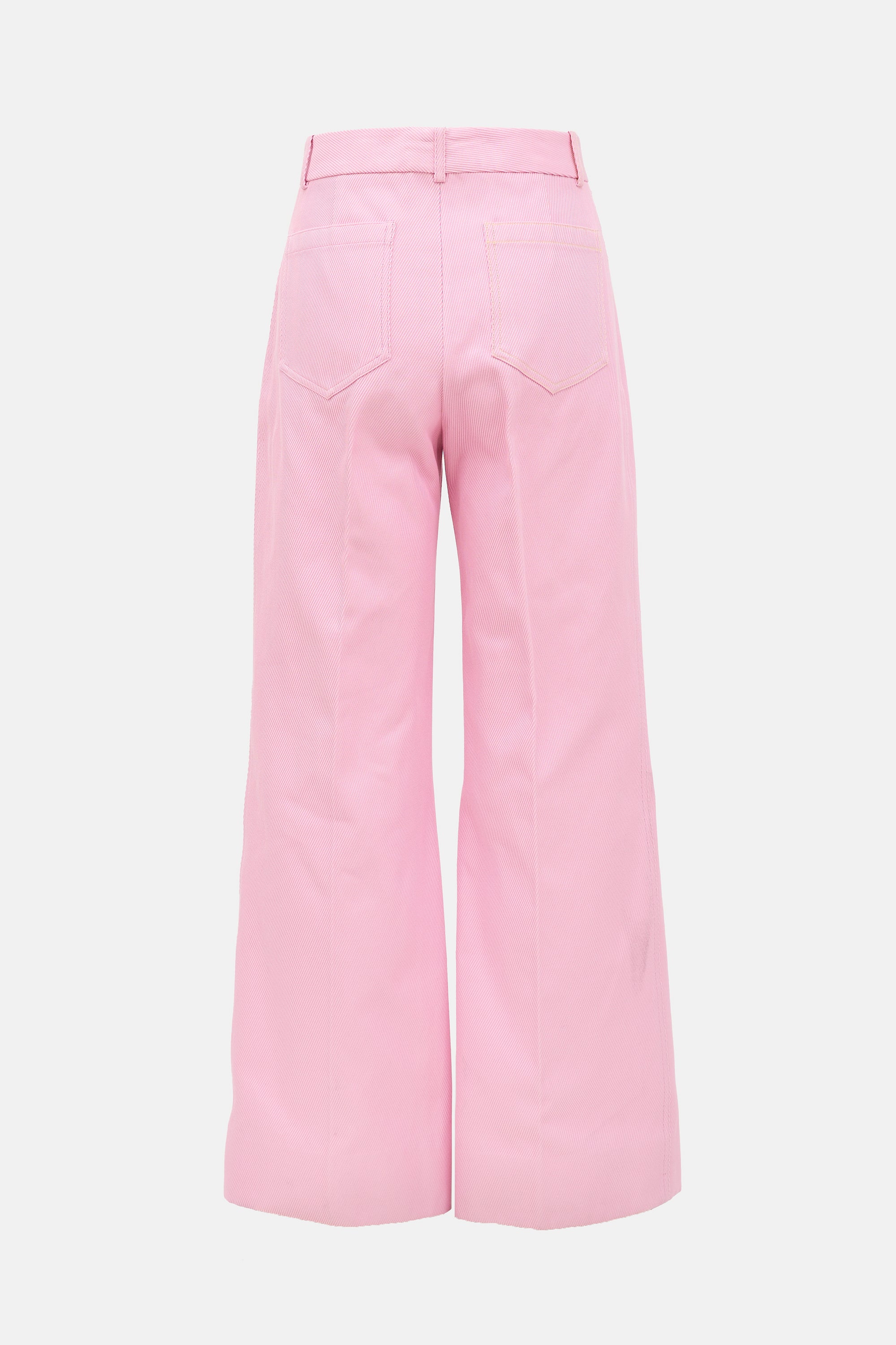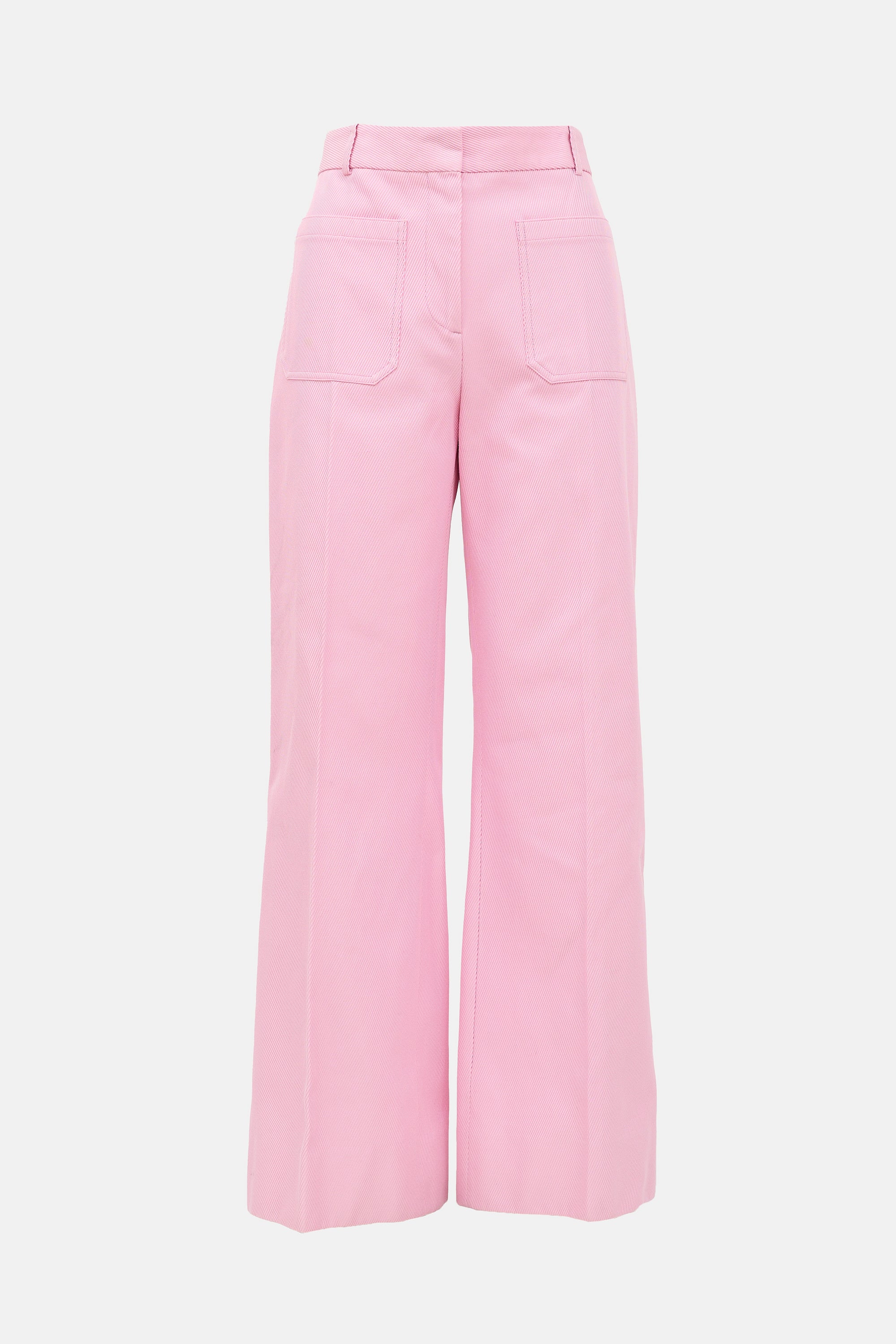 Pre-owned Victoria Beckham pink twill pants featuring a high rise, zip fly with hook and eye fastening, four pocket styling, and wide leg.