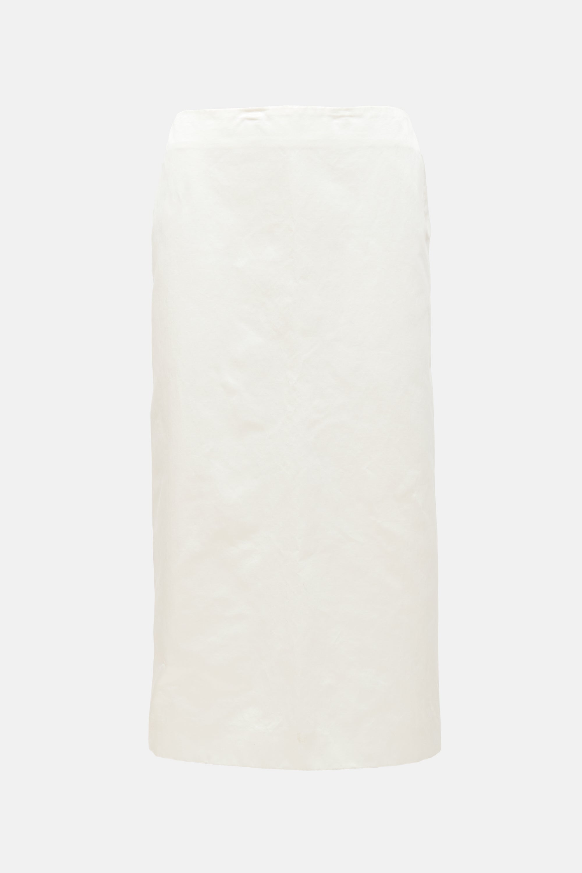 Sportmax white satin Cellula midi skirt featuring a back zip closure, low rise styling, signature crystal embellishment at right waist, and high cut vent at back. Lined.