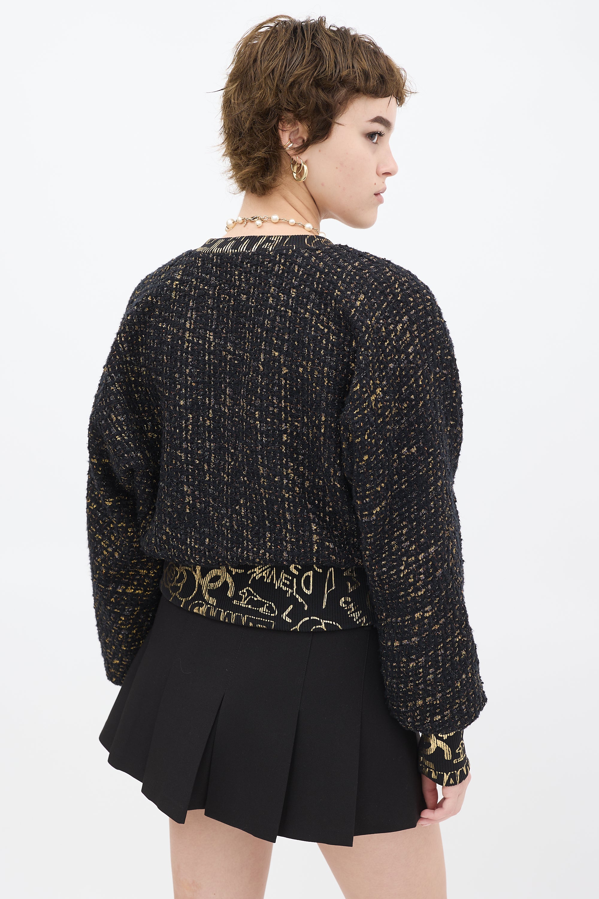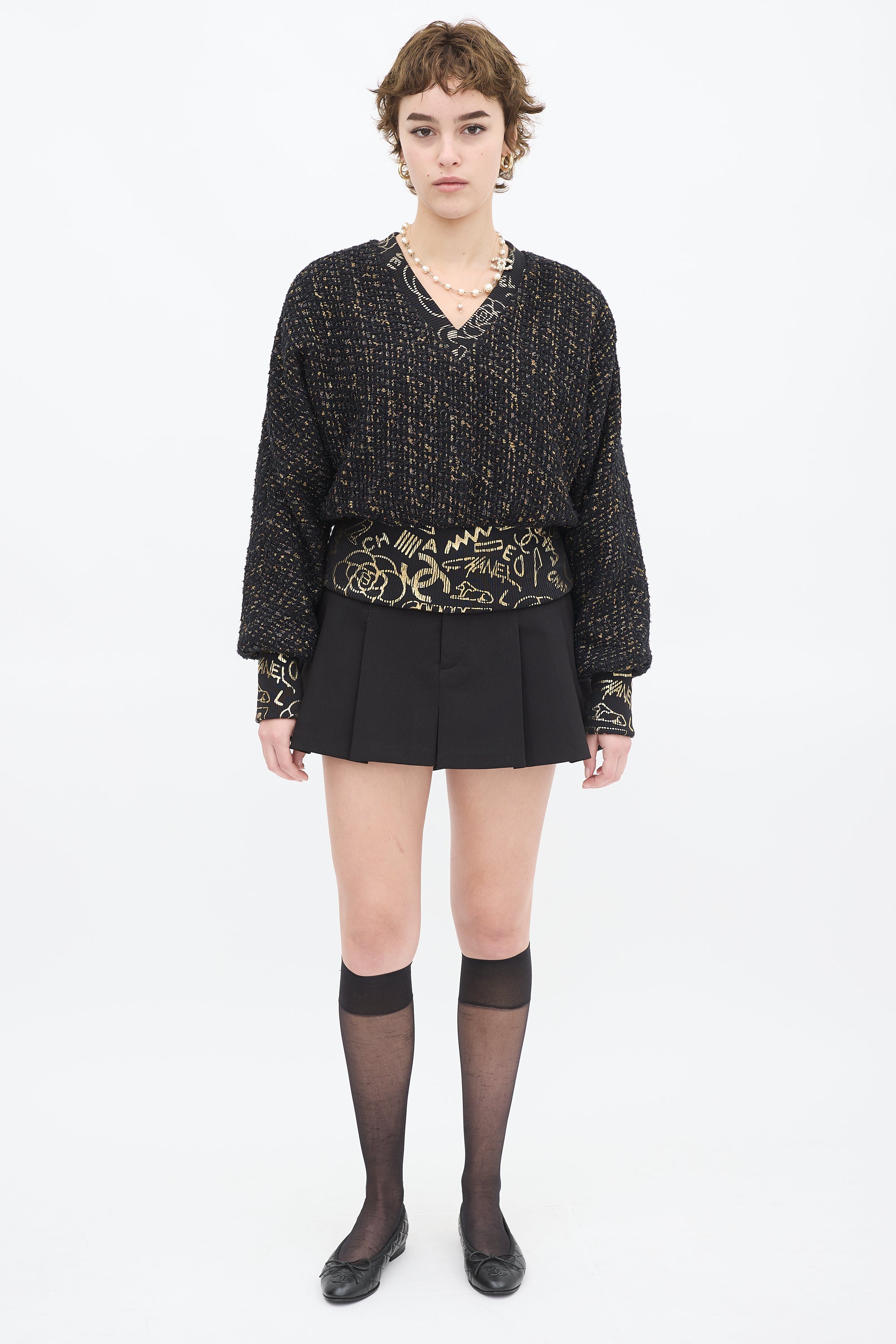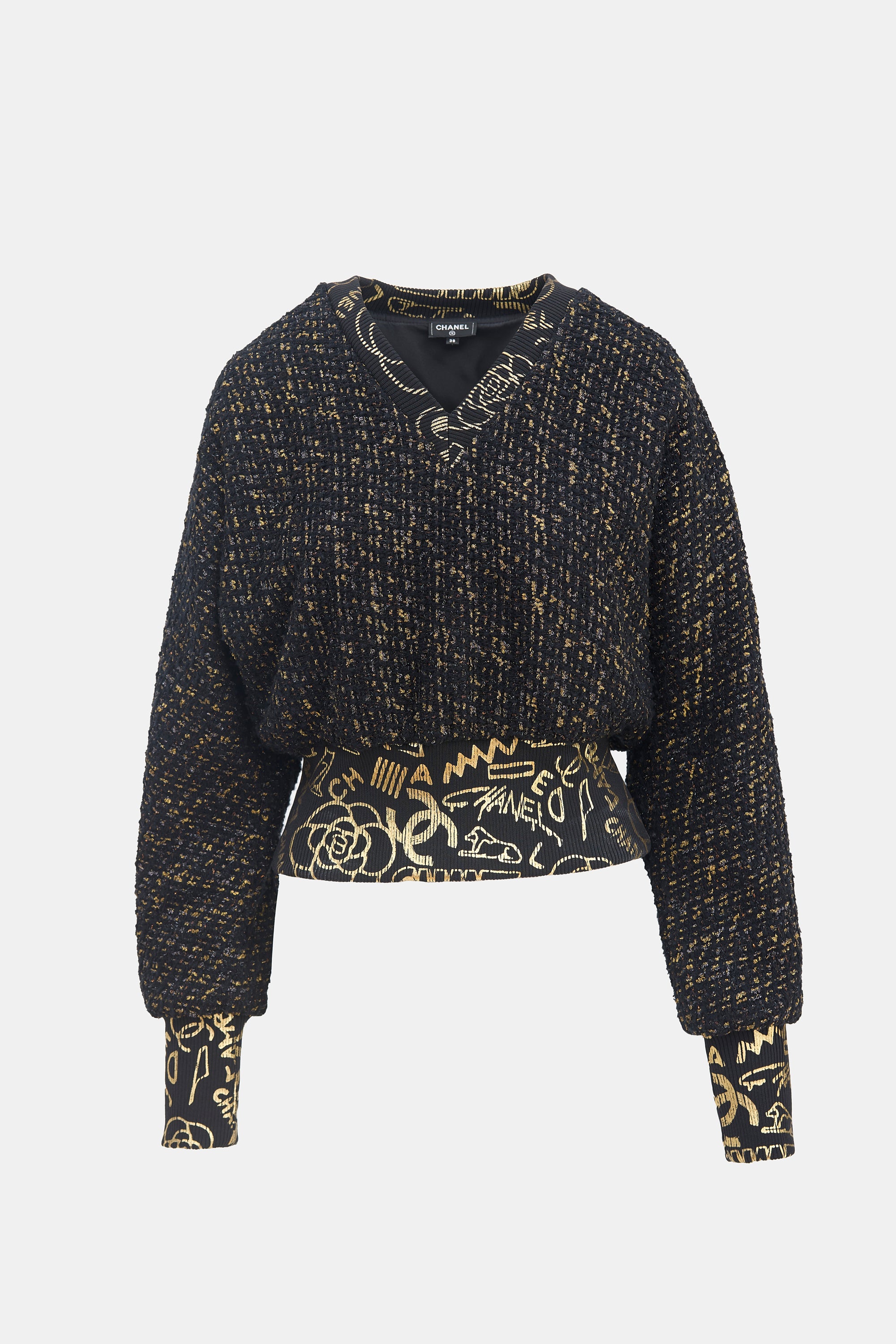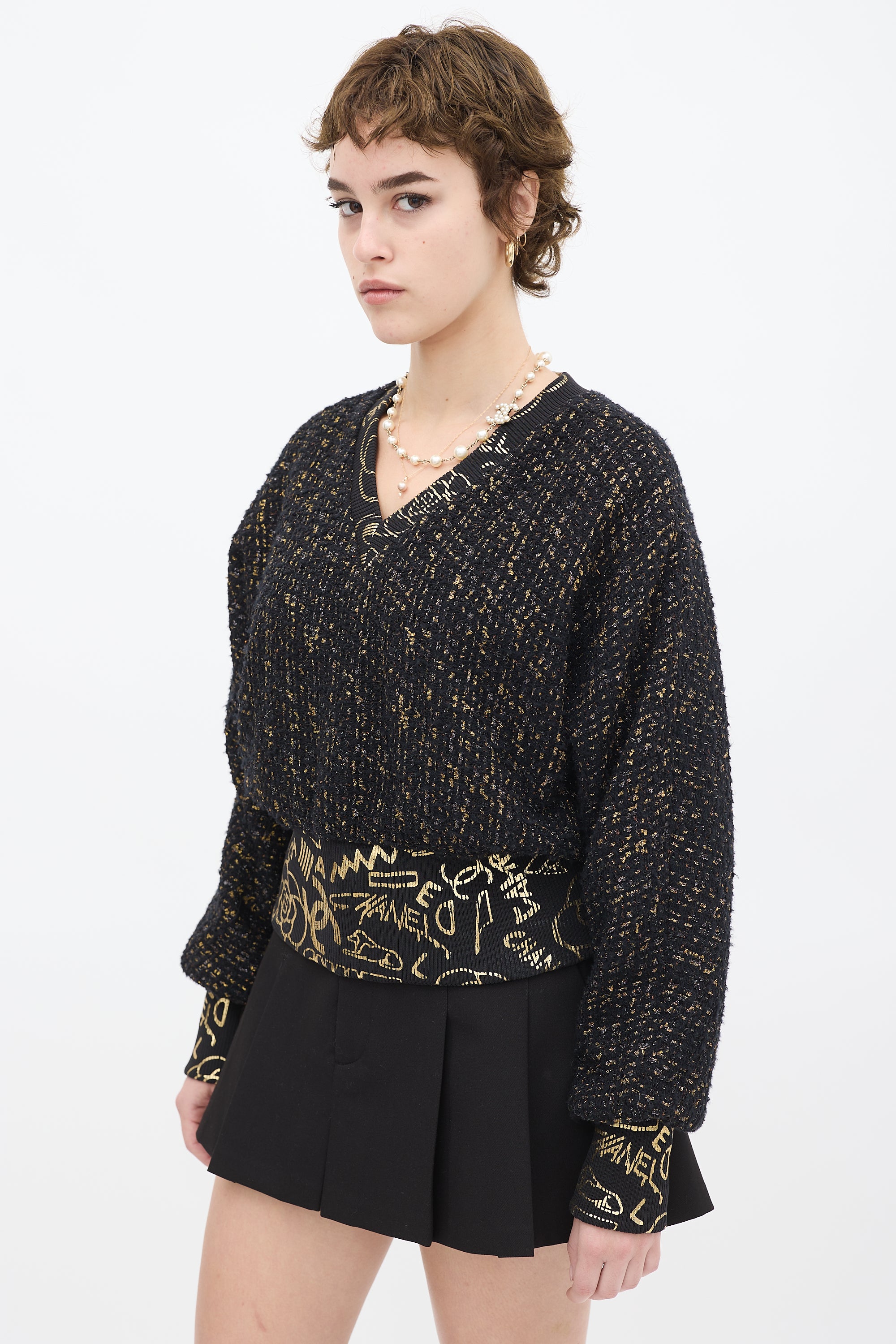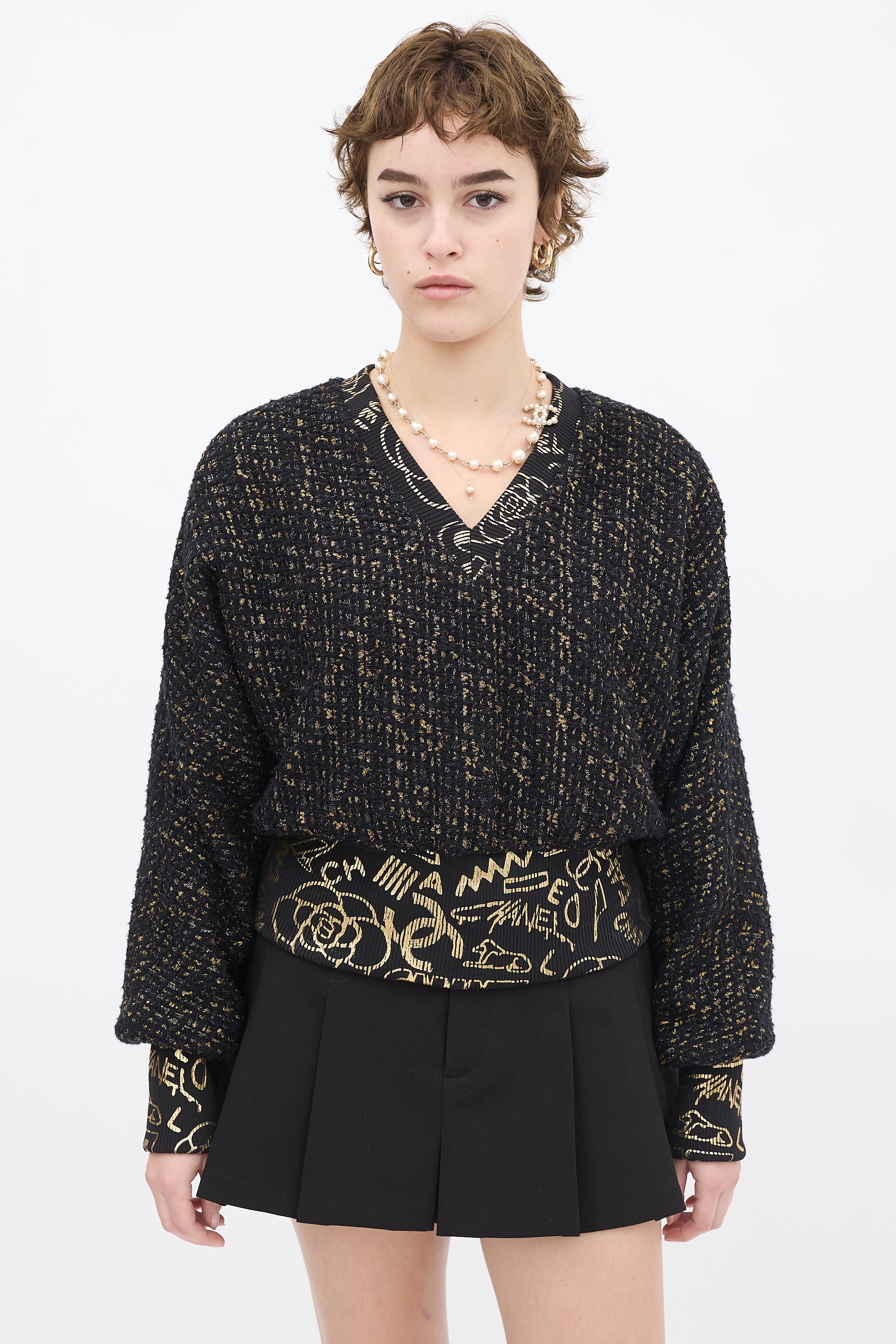 Pre-owned Chanel Pre-Fall 2019 black and gold wool blend tweed sweater featuring a V-neckline, long sleeves, metallic threading throughout, and ribbing with graffiti inspired logo print at neck, hem, and cuffs. Lined.