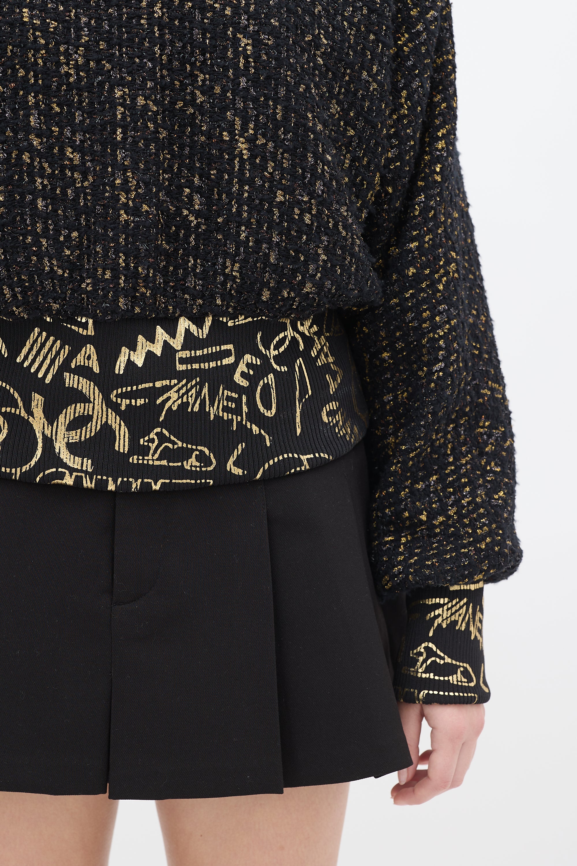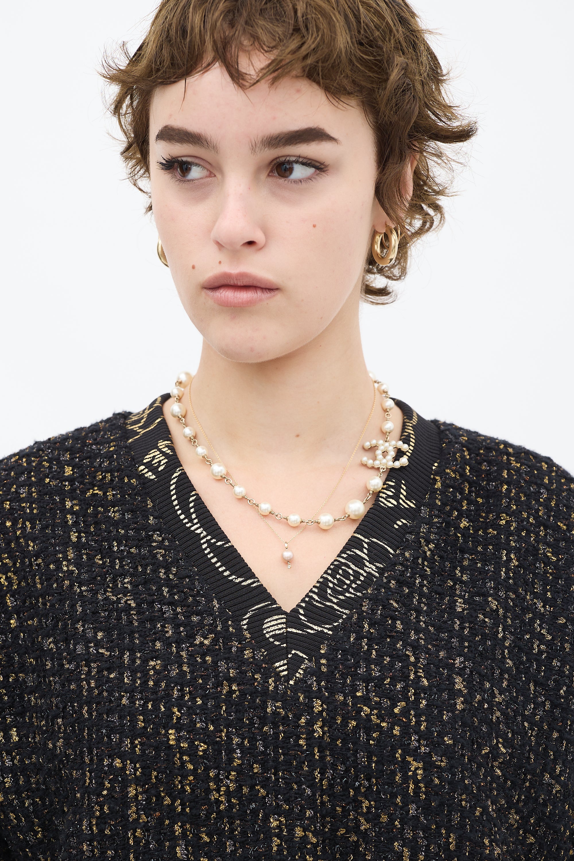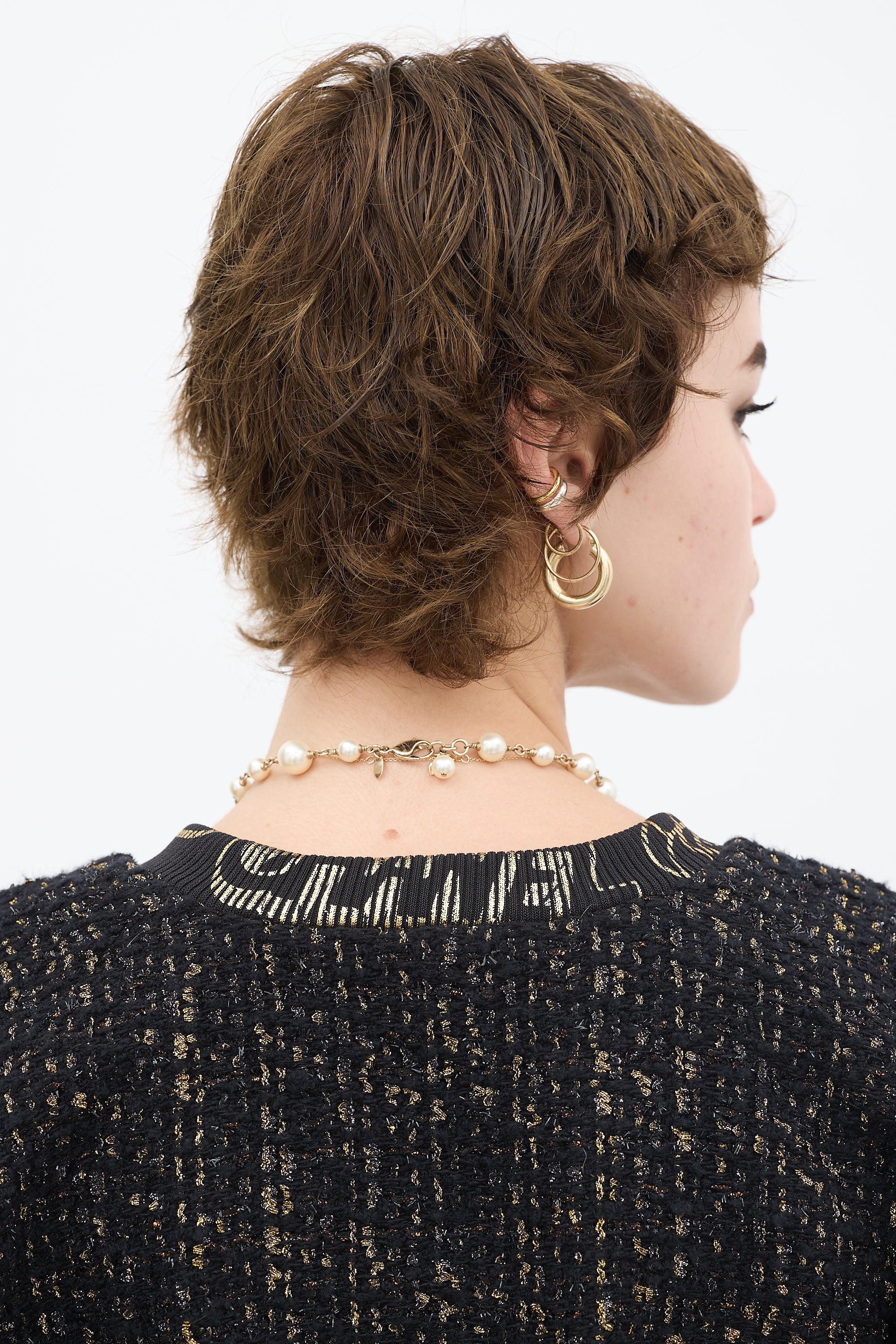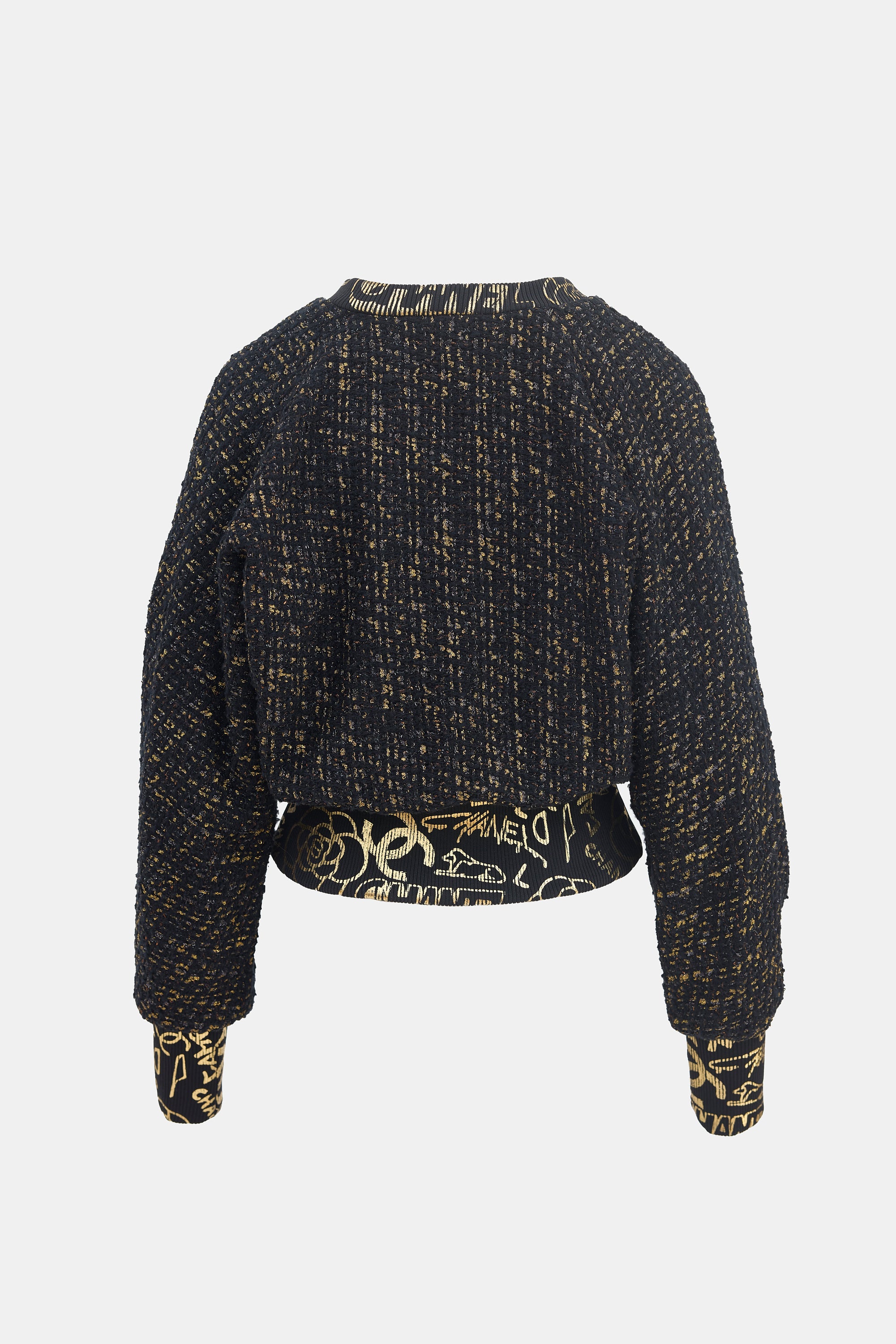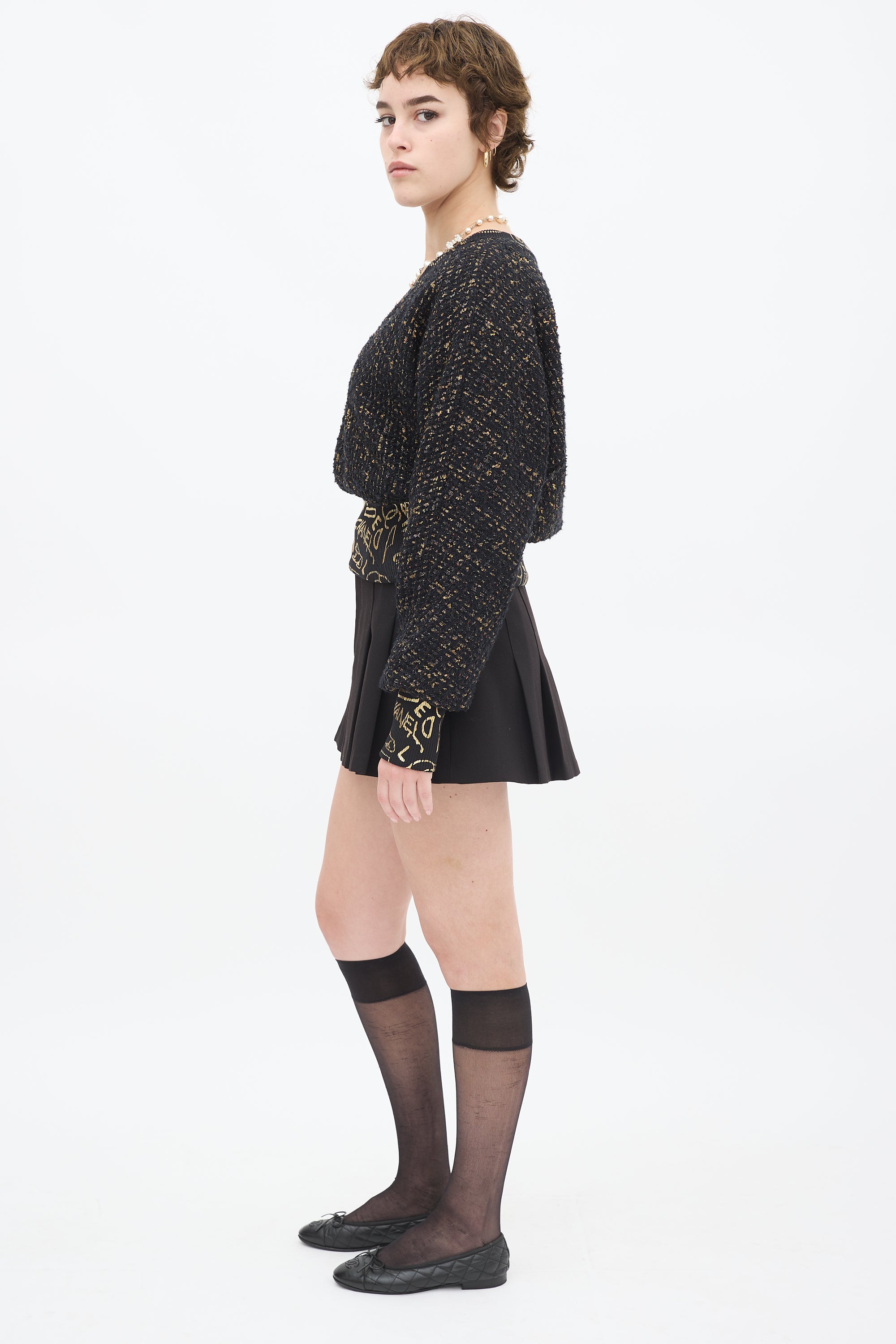 Pre-owned Chanel Pre-Fall 2019 black and gold wool blend tweed sweater featuring a V-neckline, long sleeves, metallic threading throughout, and ribbing with graffiti inspired logo print at neck, hem, and cuffs. Lined.