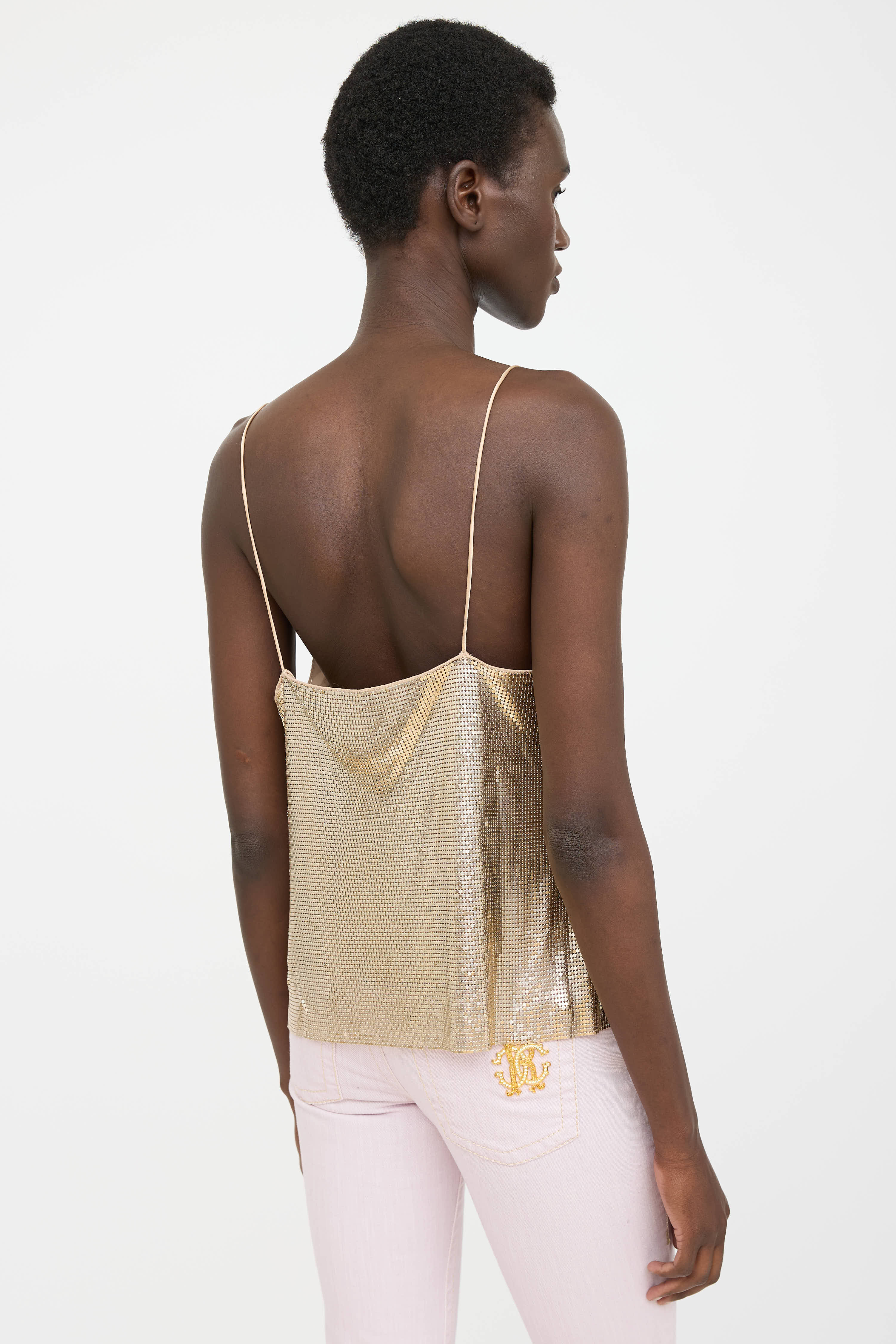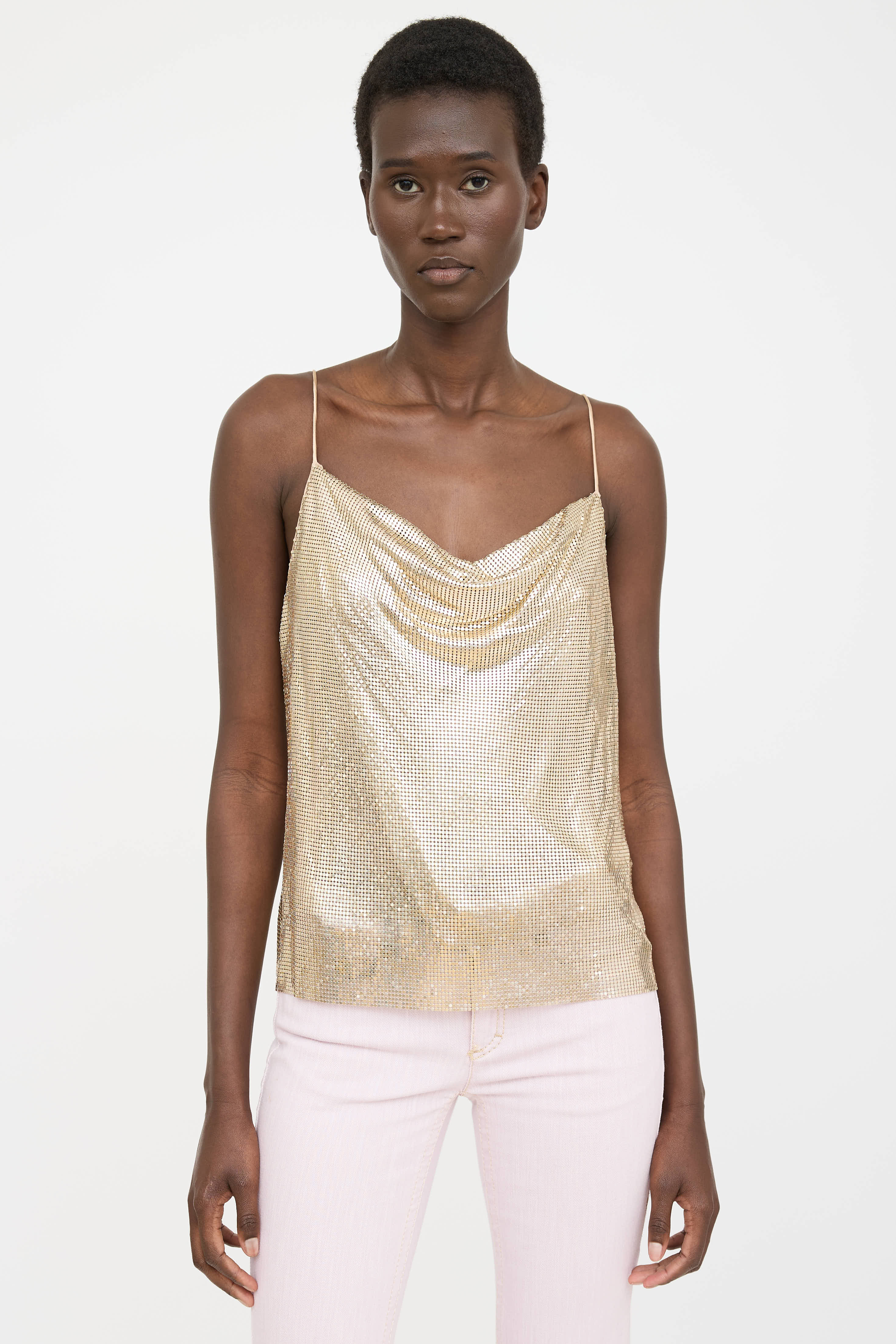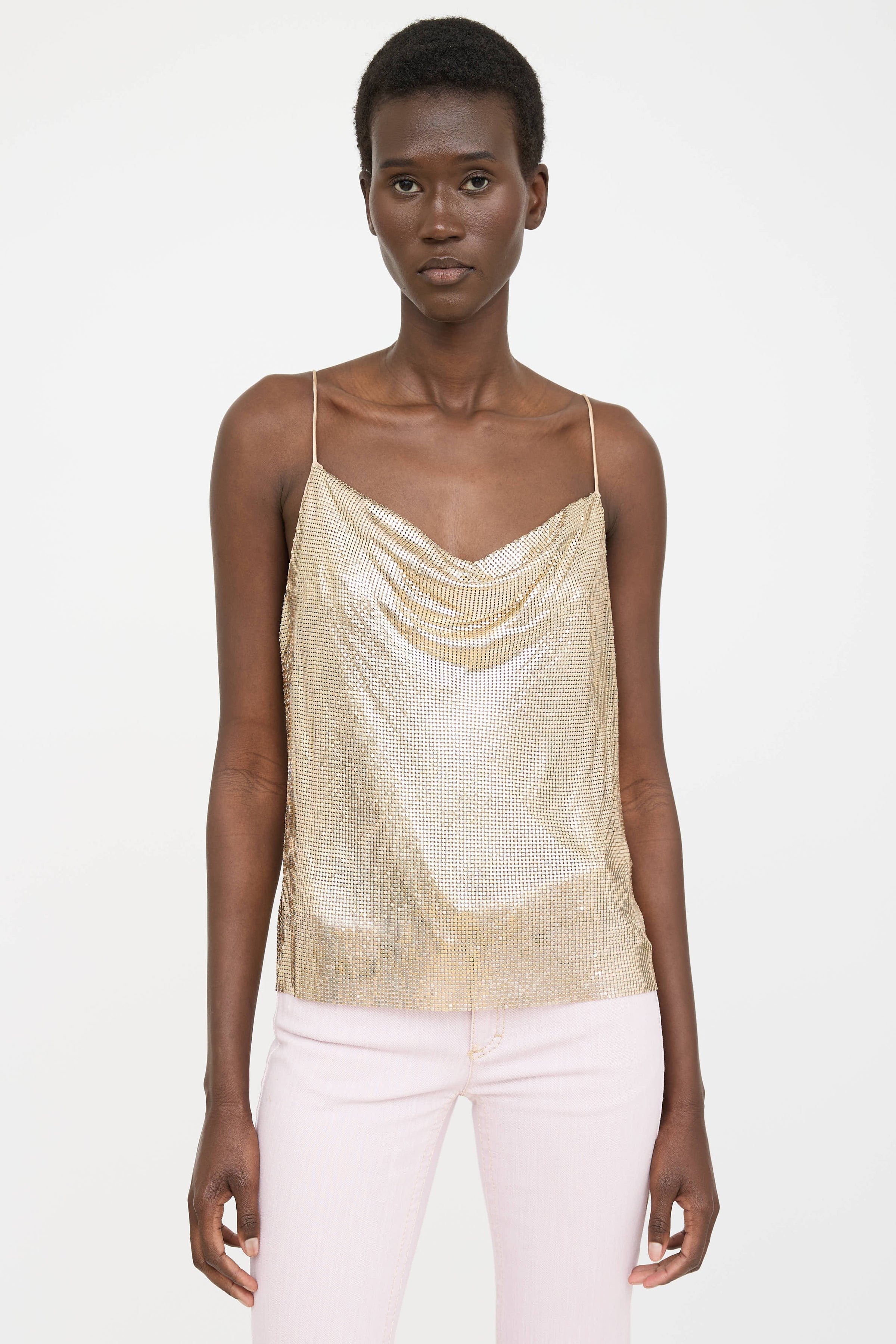 Pre-owned Alice + Olivia gold chainmail sleeveless top featuring cowl neckline and chainmail throughout. Lined.