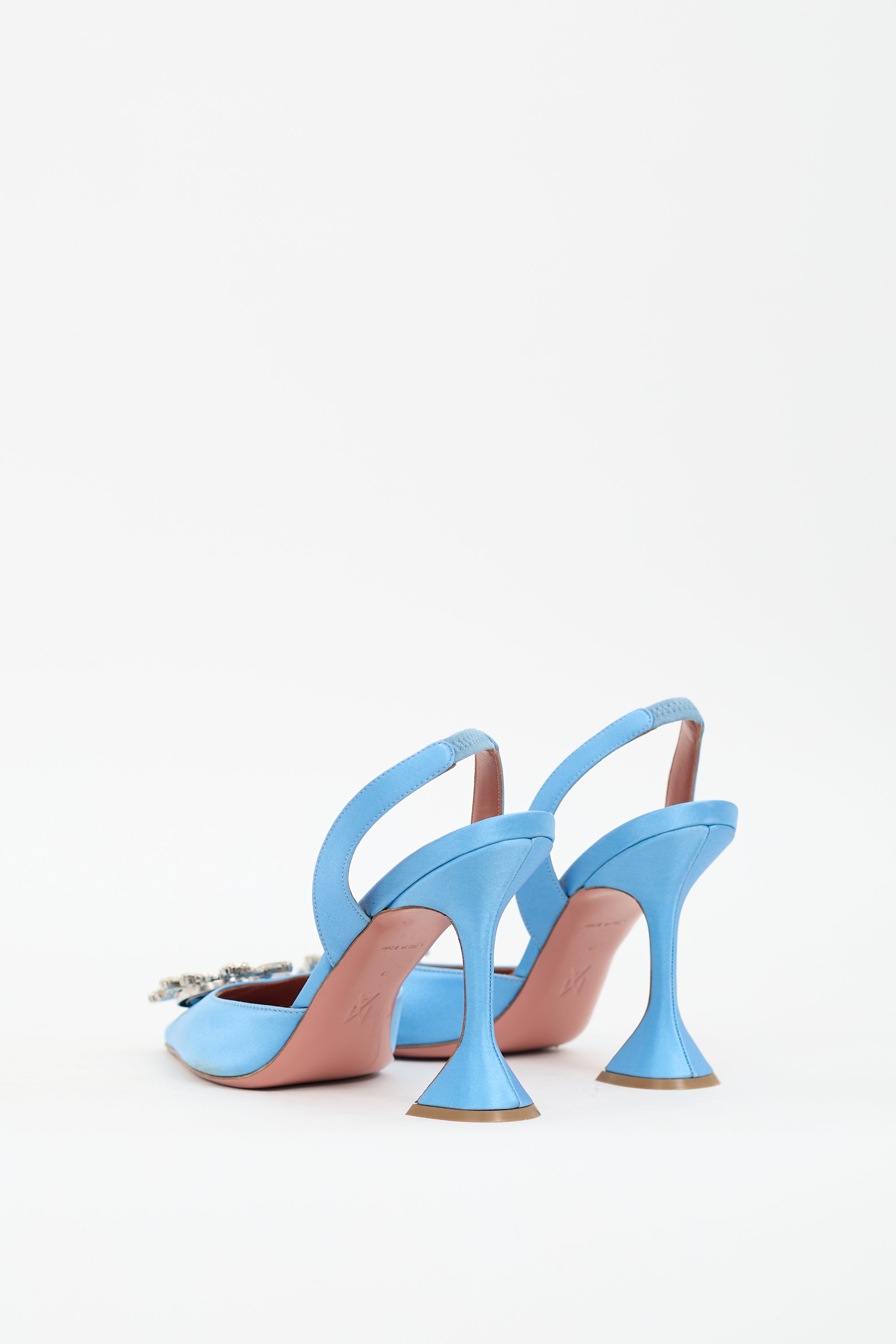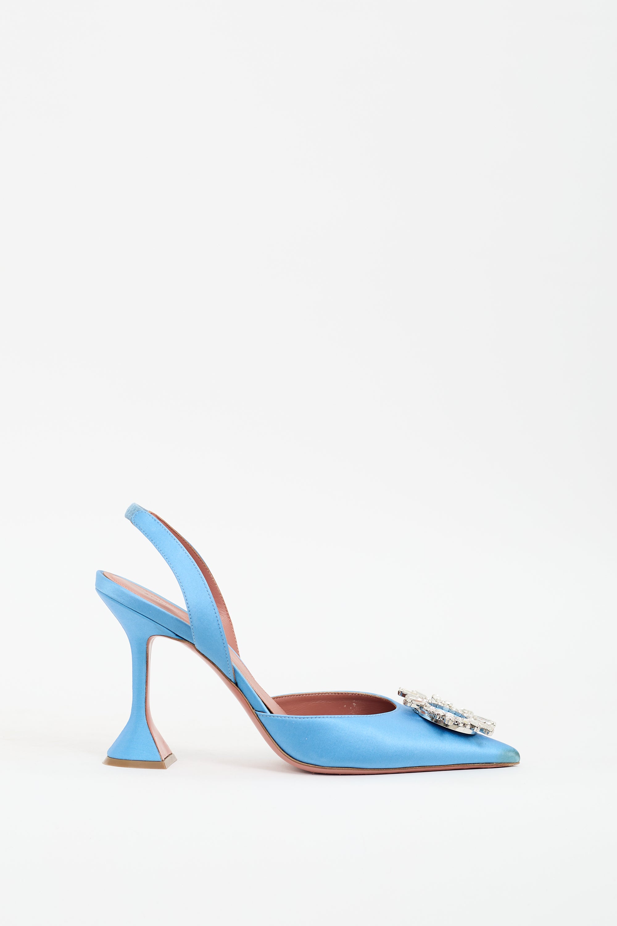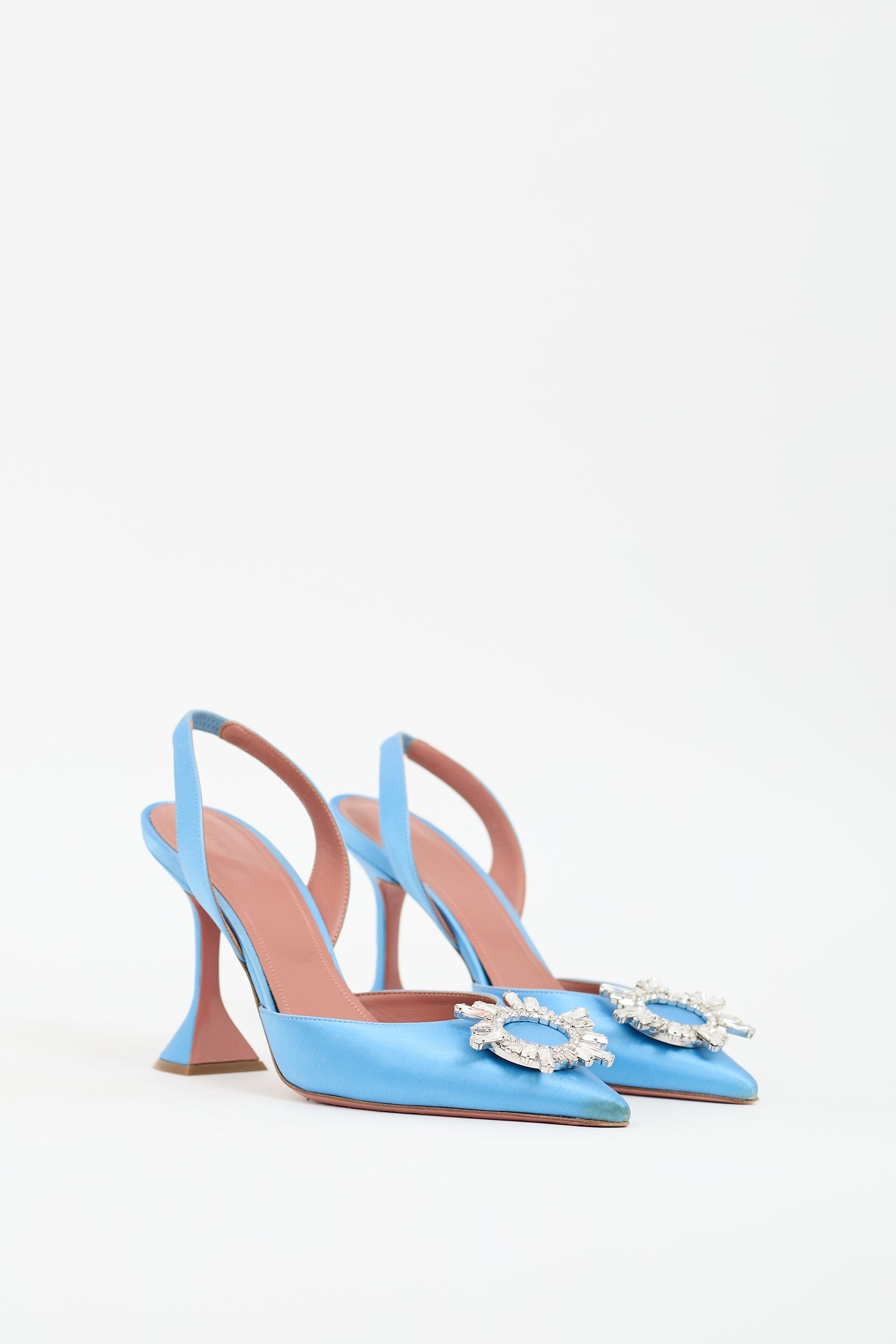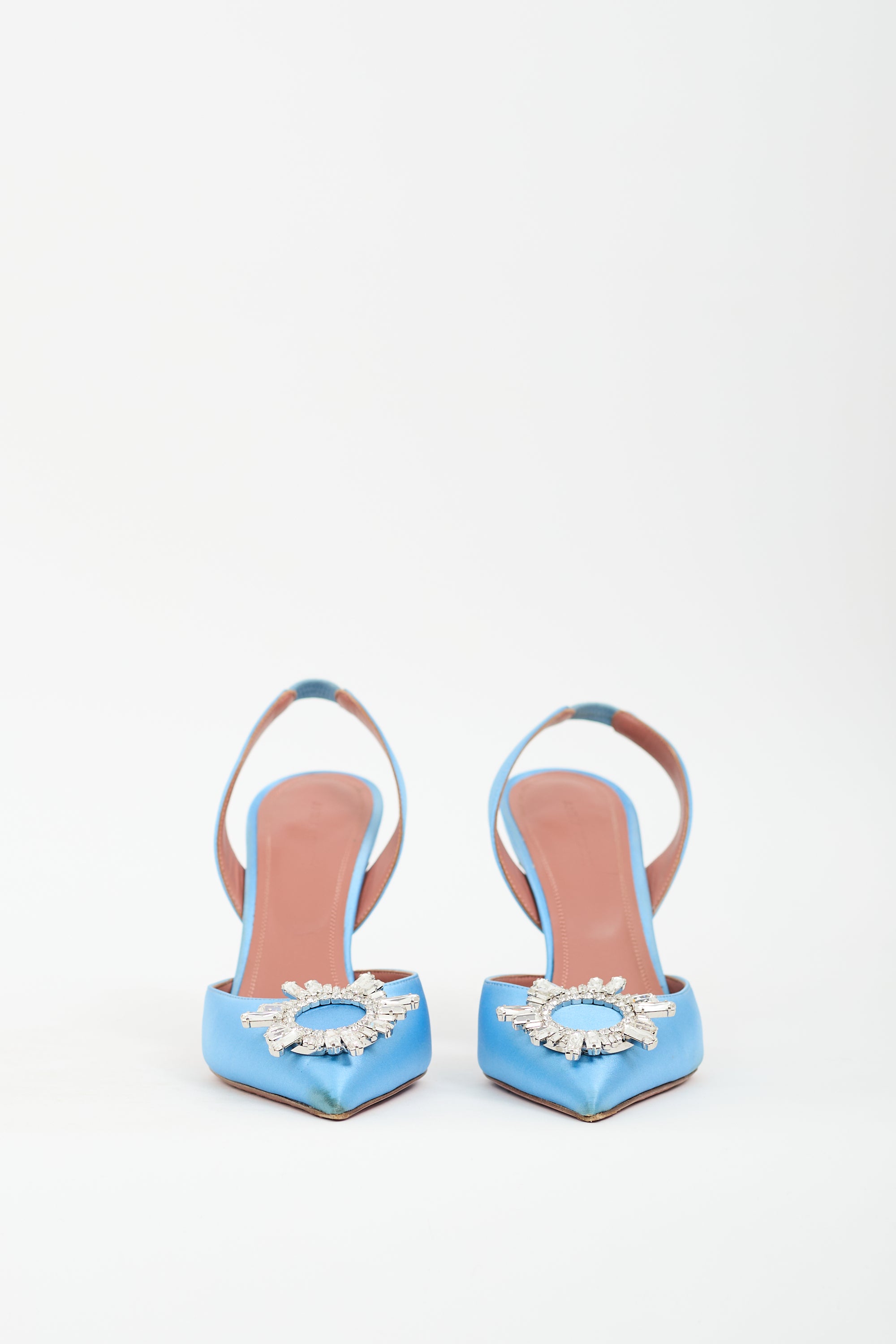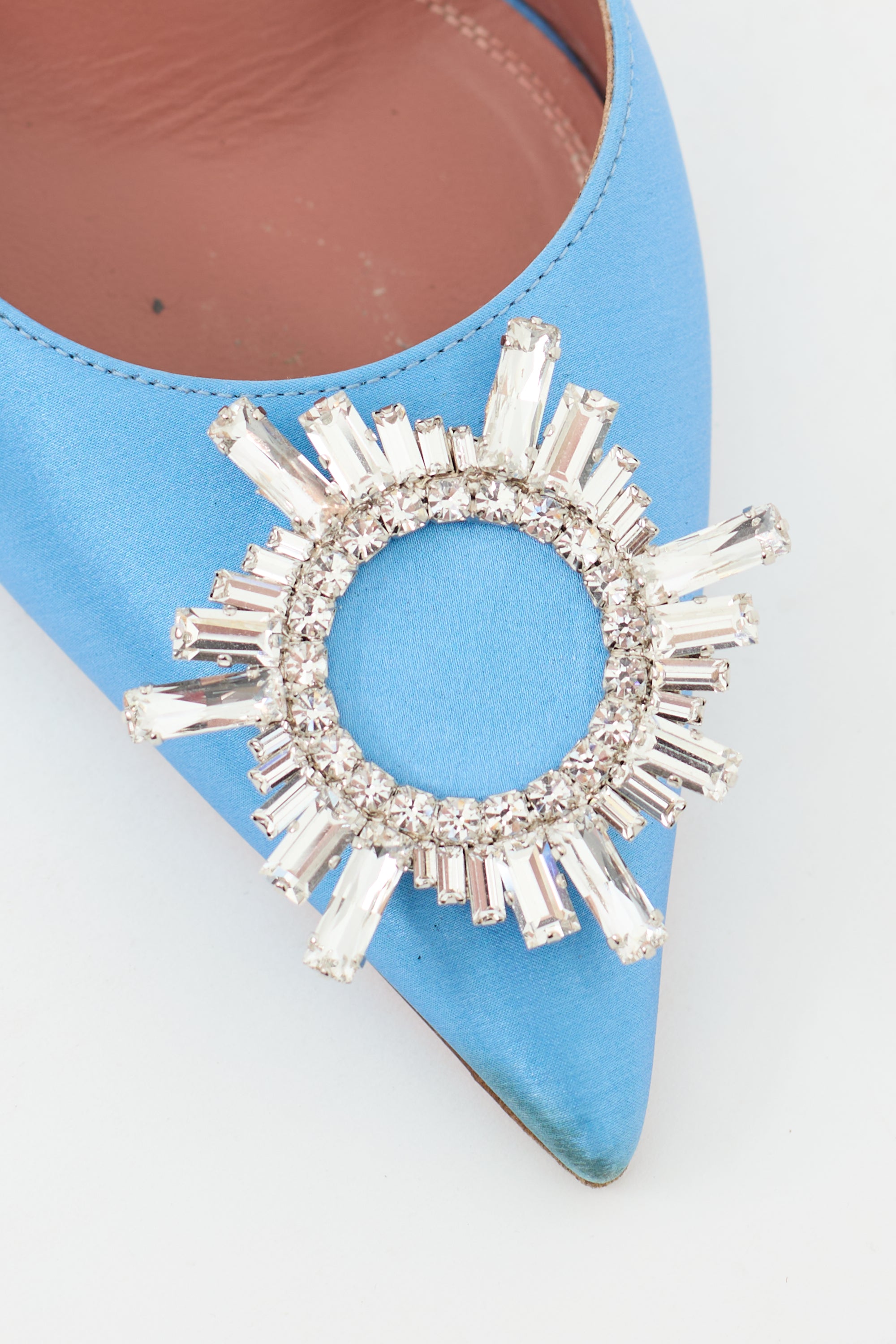 Pre-owned Amina Muaddi blue satin Begum pumps featuring pointed toe, Starbust embellished brooch, slingback strap, and covered fluted heel. Comes with original box and dust bag.