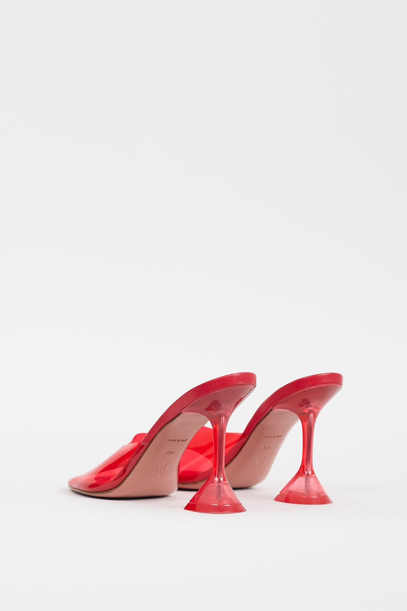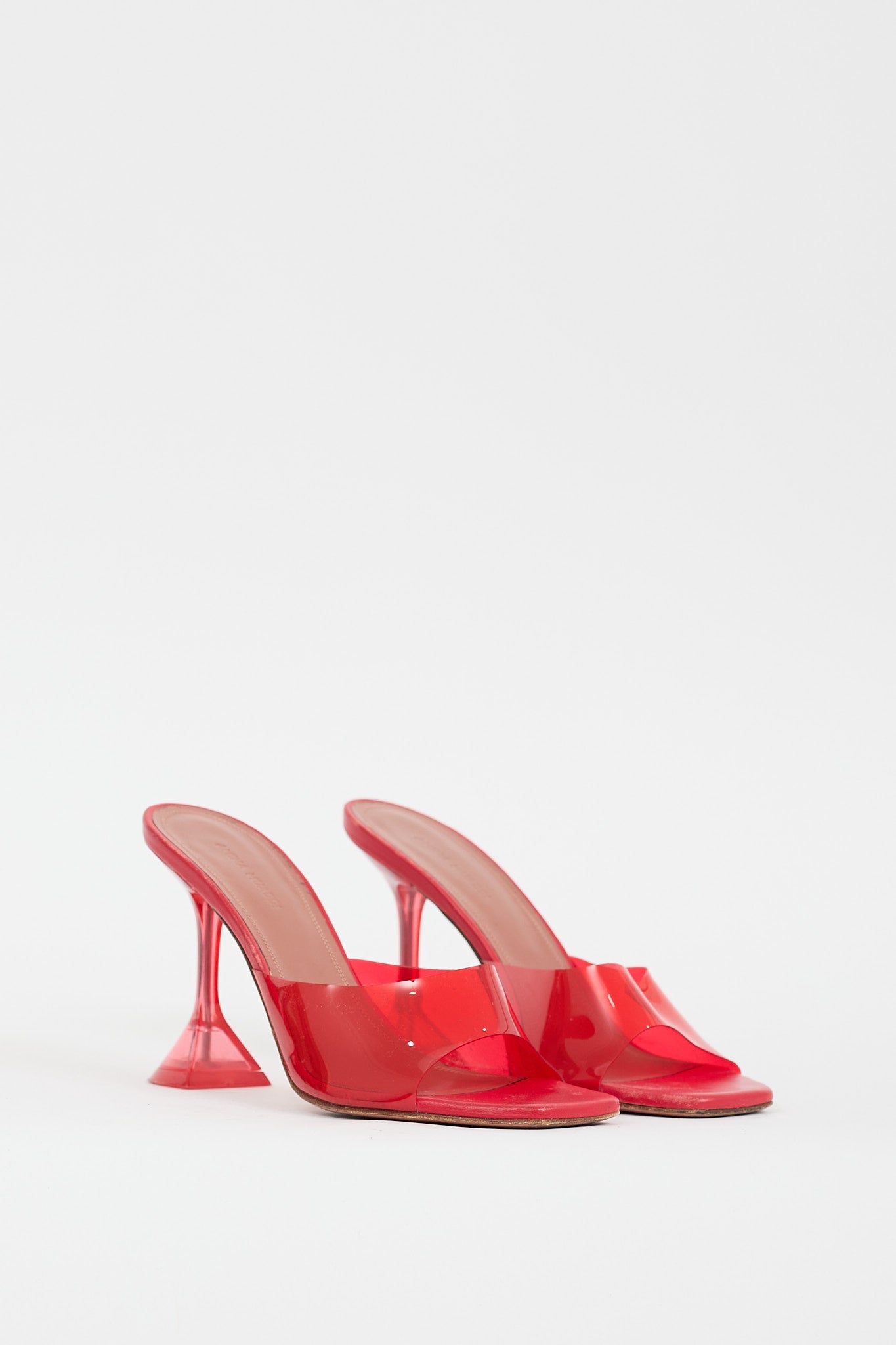 Pre-owned Amina Muaddi red transparent Lupita sandals featuring an open squared toe, single strap across vamp, leather footbed, and transparent fluted heel. Comes with original dust bag.