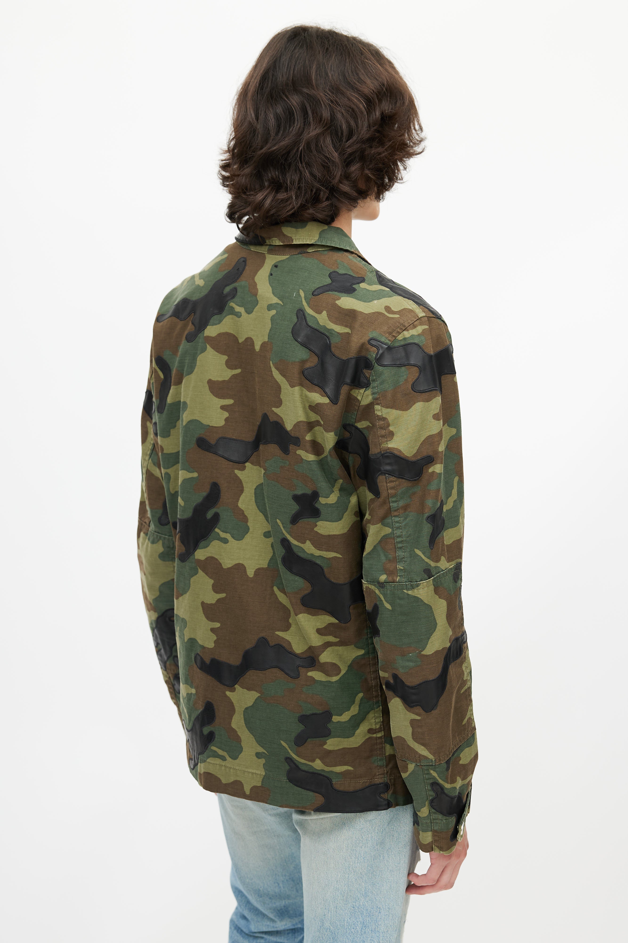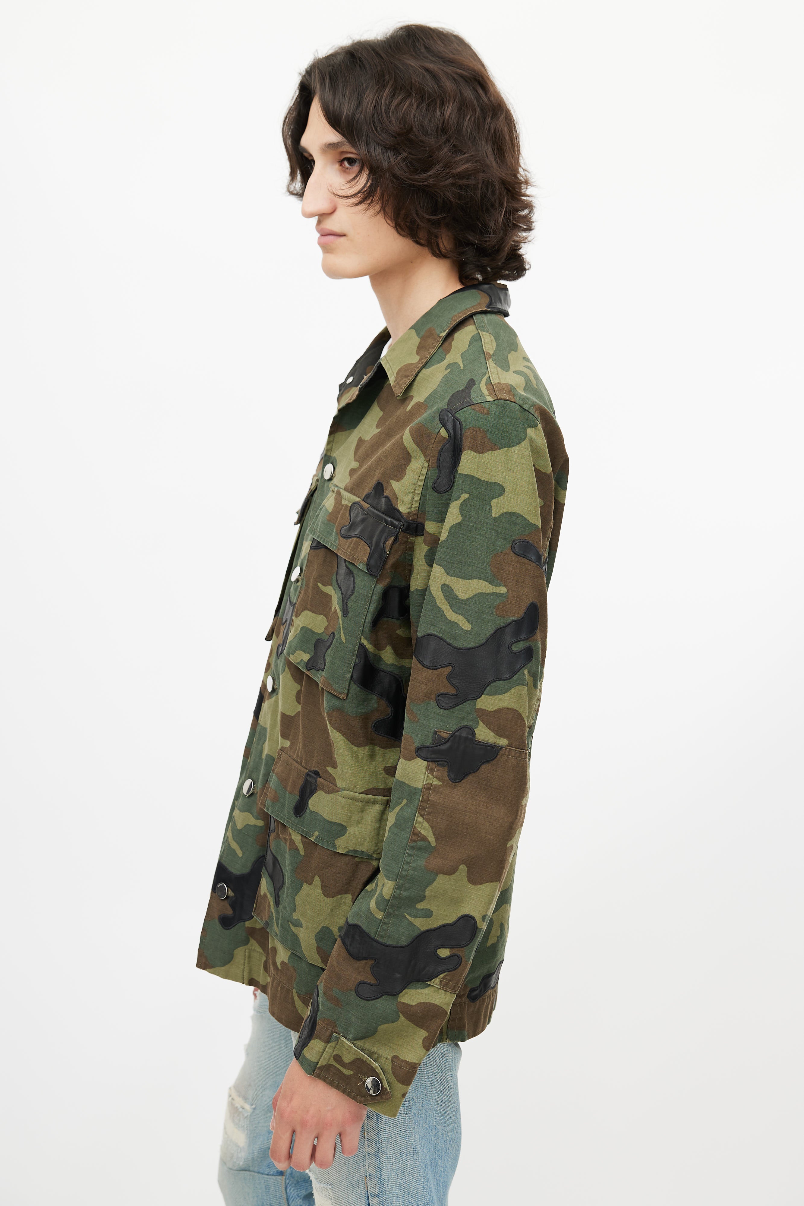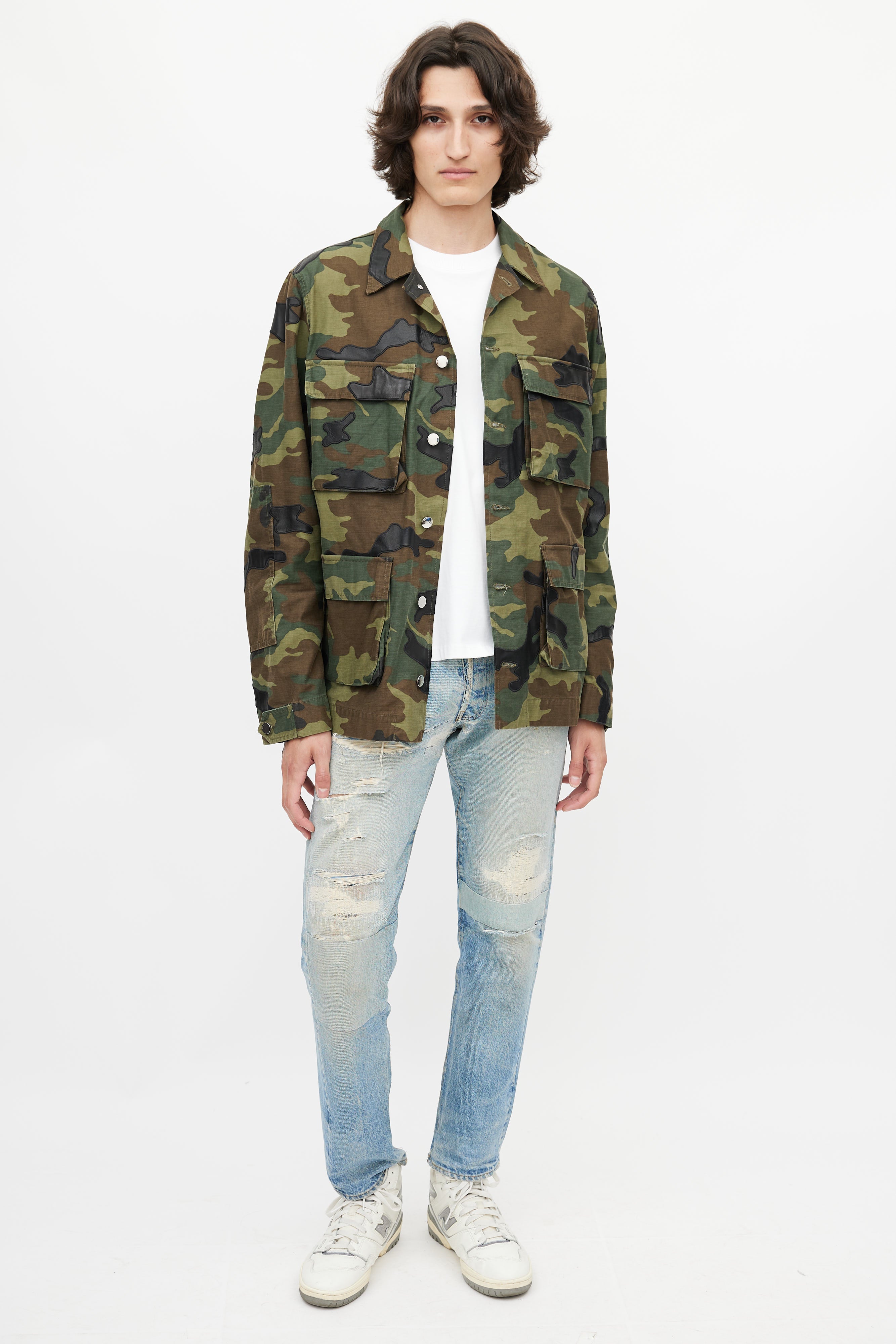 Pre-owned Amiri green utility jacket featuring a multicolour camo print throughout, pointed collar, four patch pockets at chest, long sleeves with buttoned cuffs, and button up front.